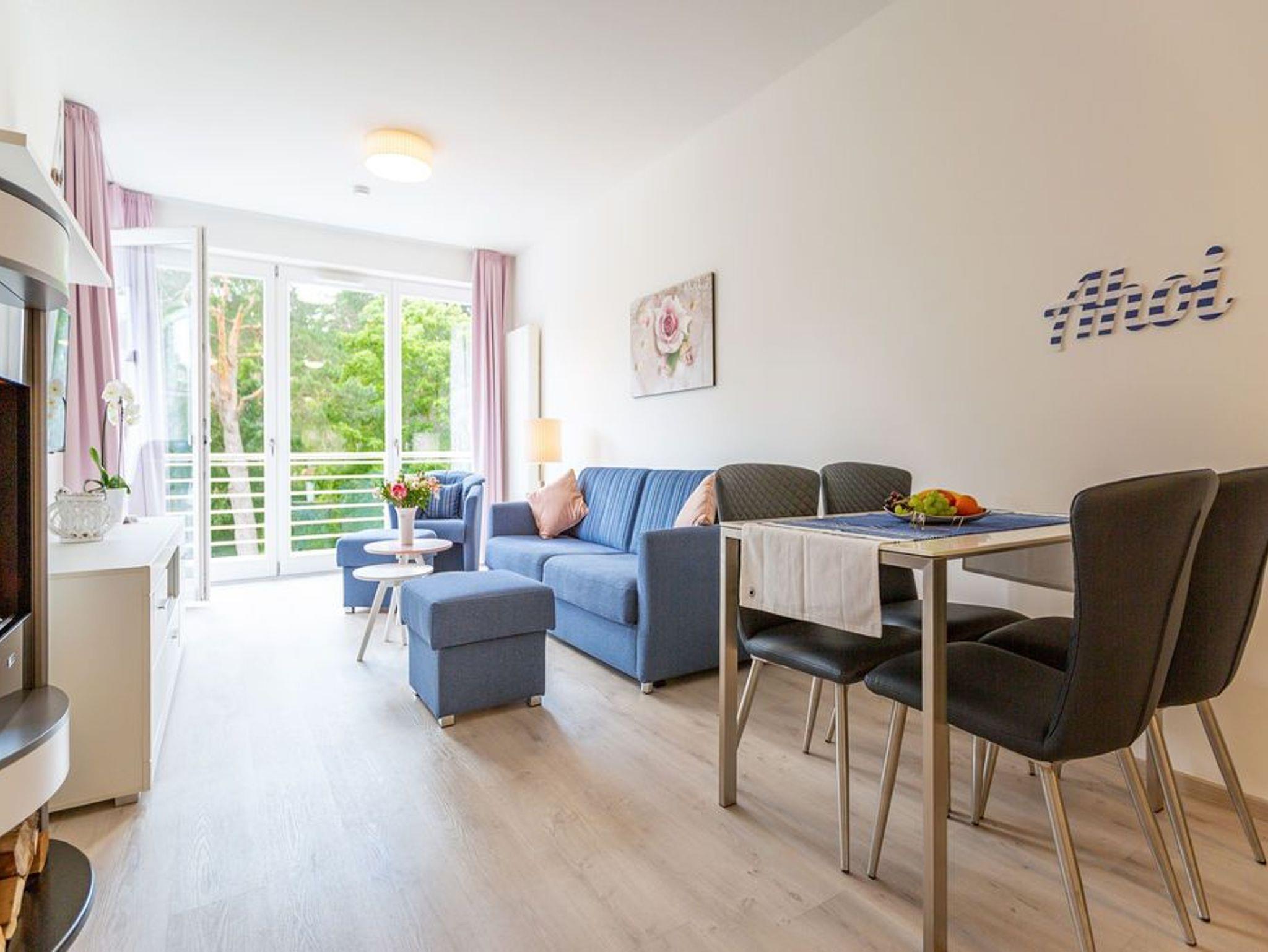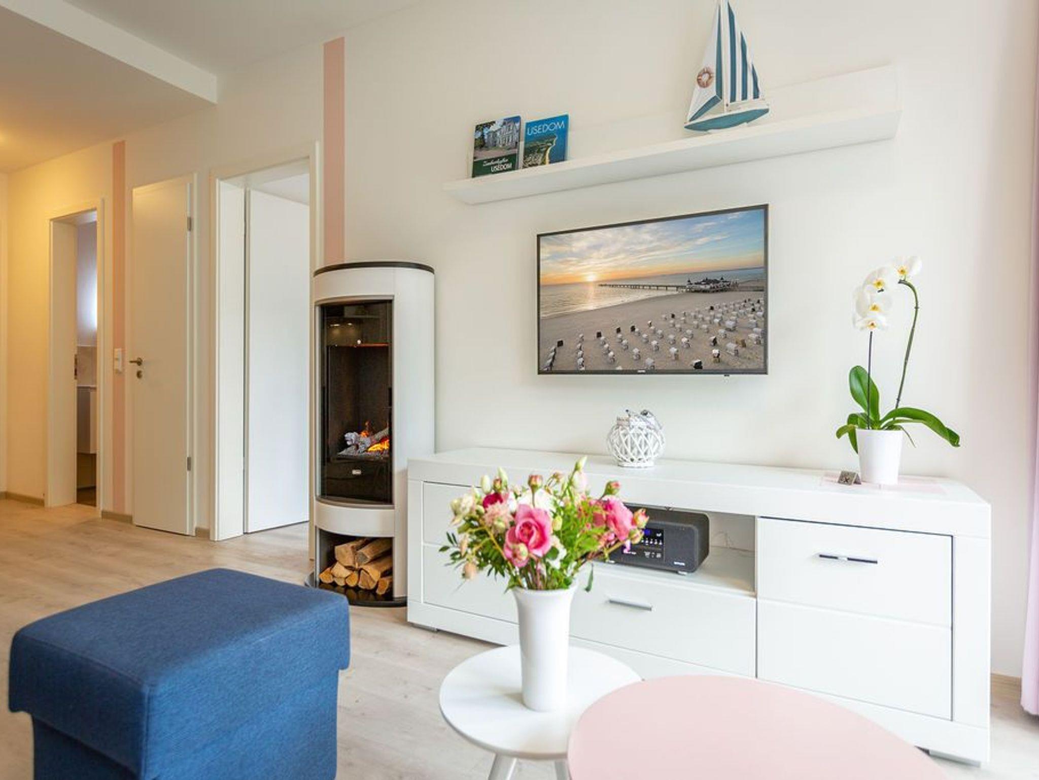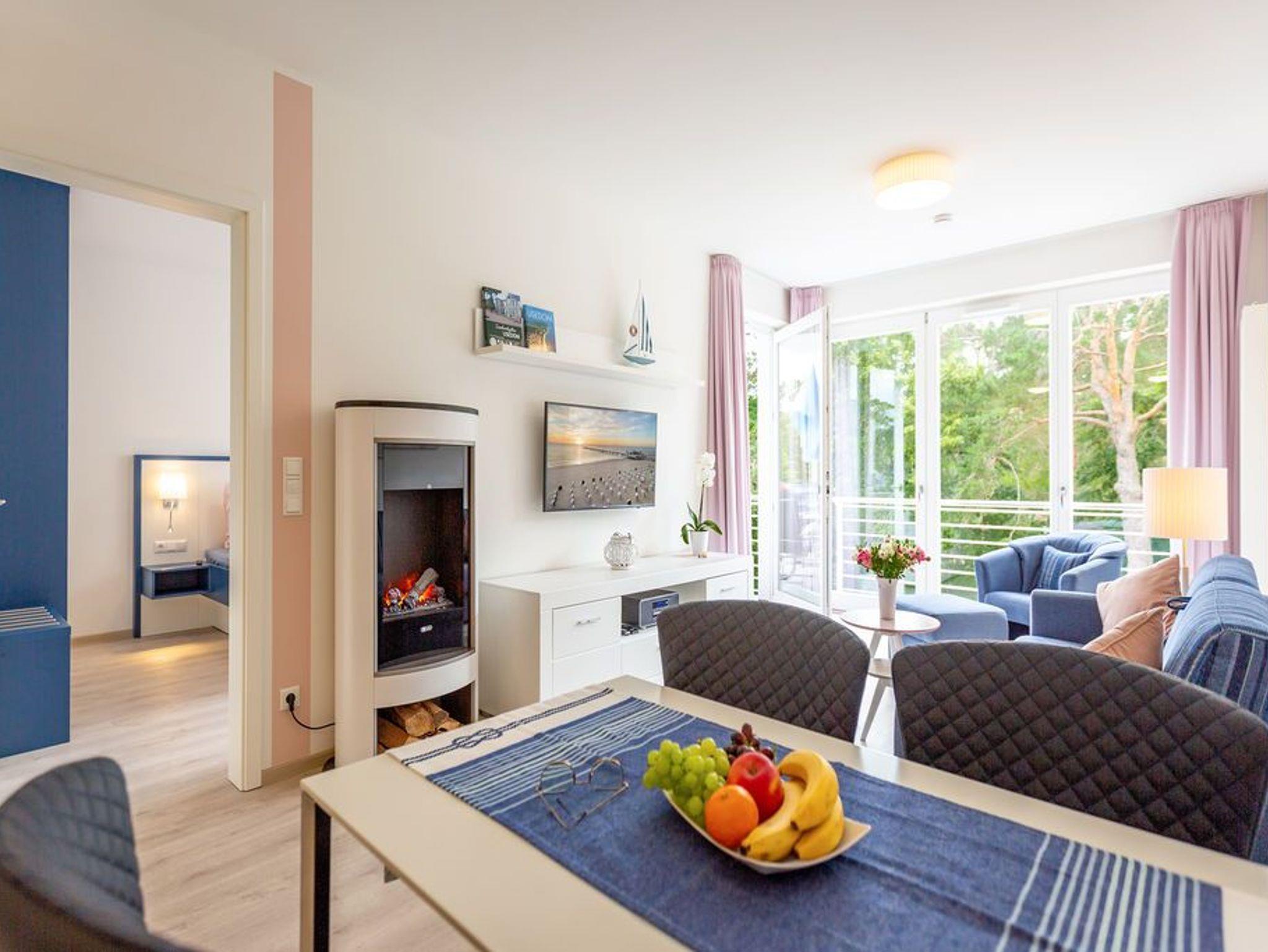 Der Ostsee ganz nah: In diesem schönen Zwei-Zimmer-Appartement in der 2. Etage können zwei Personen eine wunderbar entspannte Auszeit in absoluter Strandnähe genießen. 52 Quadratmeter ist das kleine und kuschlig maritim eingerichtete Urlaubsdomizil groß. Maritim ist auch die Farbgestaltung aus Meerblau und viel Weiß. Hell und geräumig ist das Wohn-Ess-Zimmer mit Zugang zum sonnenüberfluteten Süd-Balkon (6 Quadratmeter). Hier zu frühstücken oder abends ein kühles Getränk in der Hand, in die Weite schauen, lässt die Seele auftanken. Es sich gut gehen lassen, dafür ist das Appartement ideal. Ein Elektro-Kamin im Wohnzimmer zaubert mit Licht und Wasserdampf ein authentisches, dreidimensionales Flammenspiel - Romantik pur - und der große Flat-TV so manch spannenden Film. Wenn der Hunger kommt, bietet die offene Wohnküche alles, was Sie für die Zubereitung einer anständigen Mahlzeit benötigen. Hochwertige Markengeräte wie Herd, Spülmaschine, Kaffeemaschine oder Backofen erleichtern das Kochen und Saubermachen. Im Schlafzimmer, das ebenfalls einen Zugang zum Balkon hat, wartet ein bequemes Doppelbett (1,80 m x 2,00 m) auf die Zeit des Zubettgehens. Denn in ihm schläft es sich herrlich. Auch hier gibt es einen Flat-TV. Ein großer Schrank offeriert viele Ablageflächen für Ihre Kleidung. Auf Wunsch stellen wir für unsere kleinen Gäste ein Kinderreisebett (ohne zusätzliche Matratze [&] Bettzeug) und einen Kinderhochstuhl (gegen einen Aufpreis) zur Verfügung. Das innenliegende Bad verfügt über eine geräumige Dusche, Waschtisch und WC. Im Doppelparker (Fahrzeughöhe max. 1,90 m) in der Tiefgarage ist der Stellplatz 2.8 für Sie reserviert. Die Nutzung des WLAN-Netzes ist kostenfrei. Handtücher liegen für Sie bei Anreise bereit und auch das Bett ist bezogen.