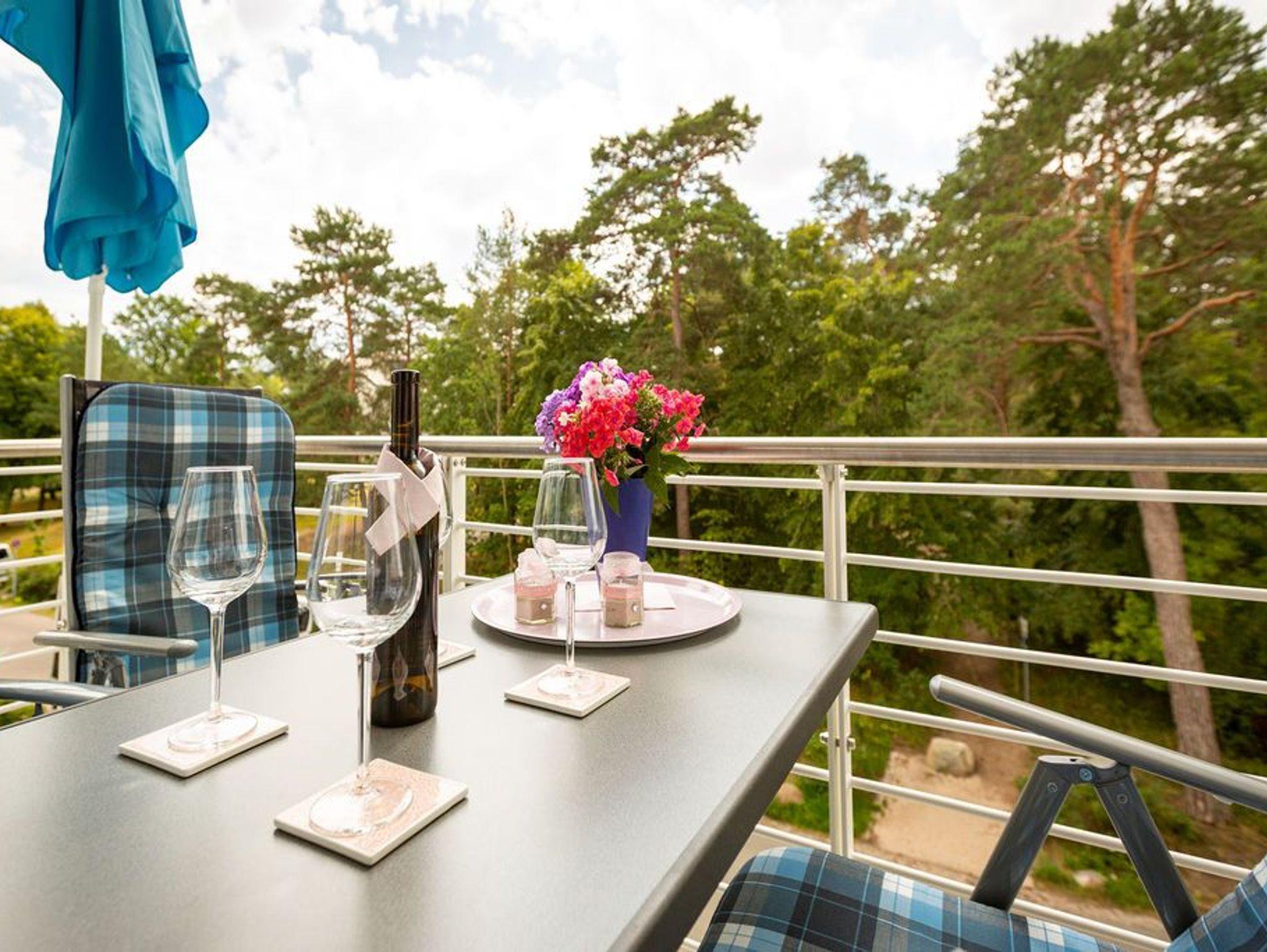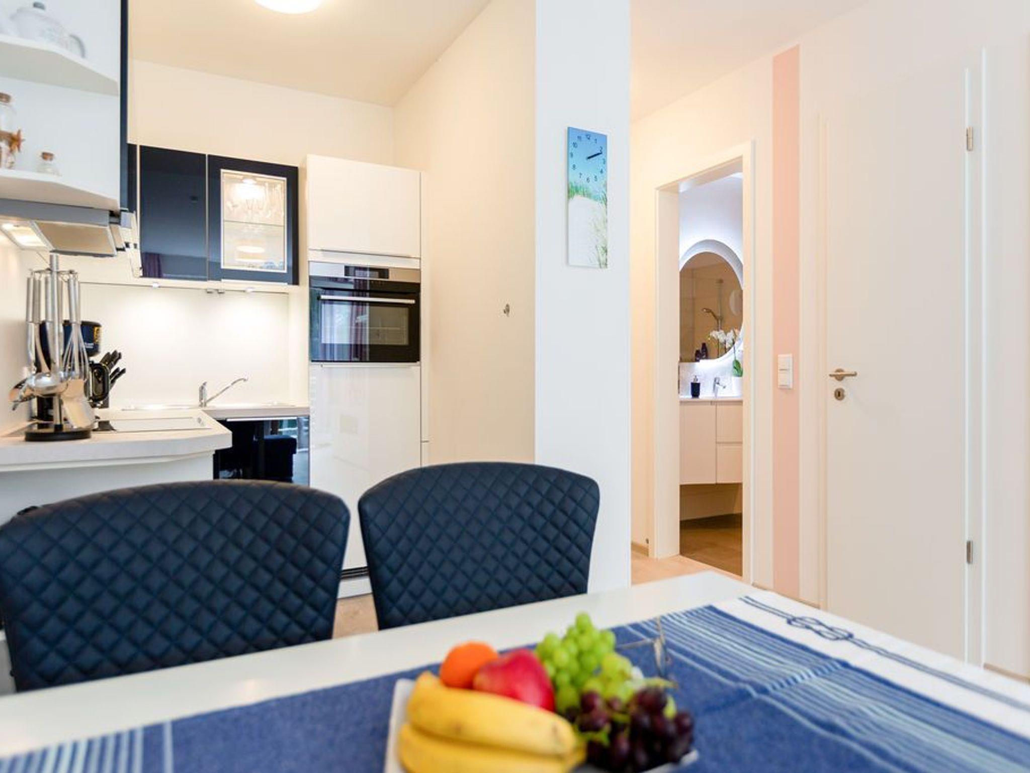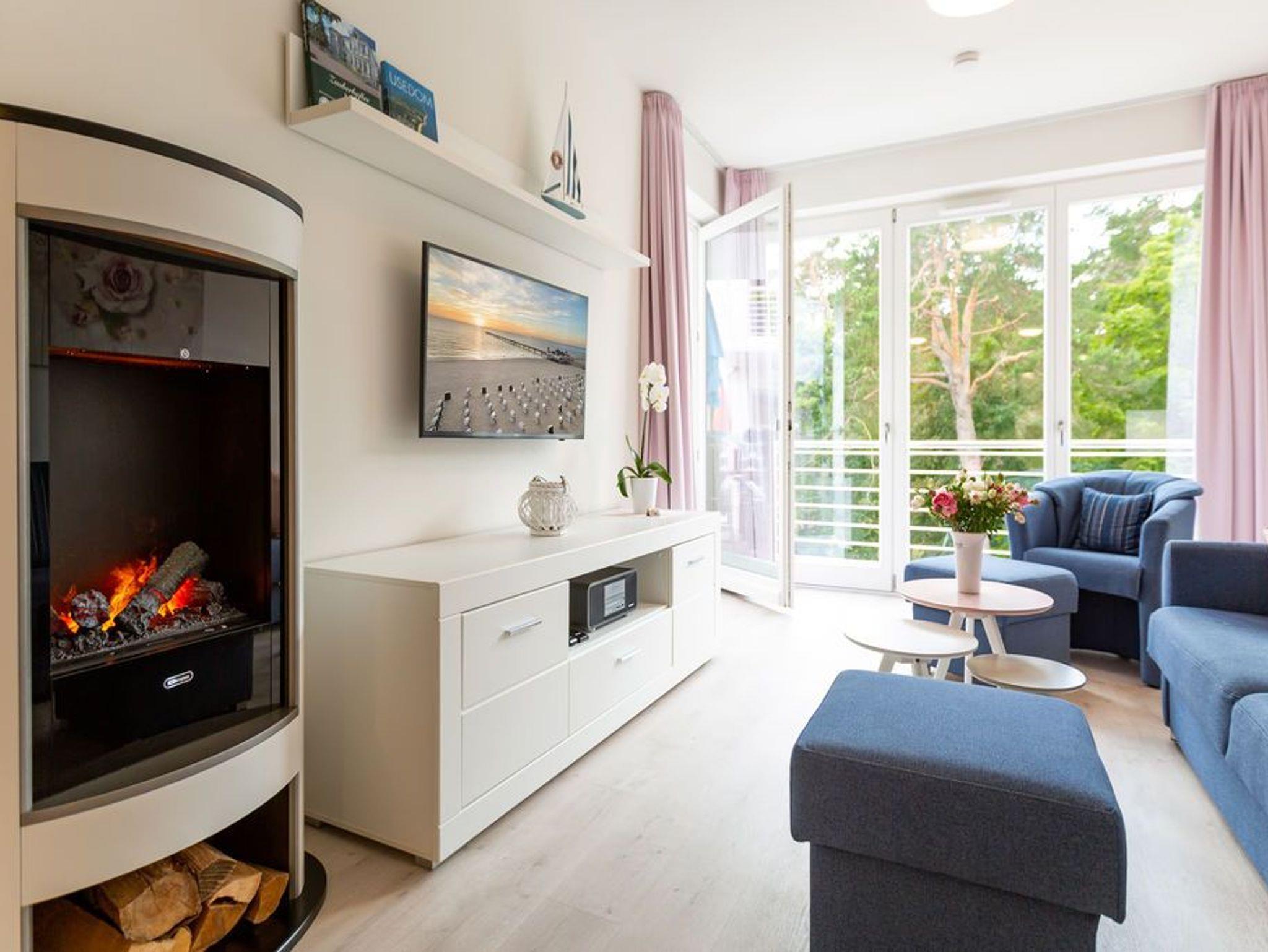 Der Ostsee ganz nah: In diesem schönen Zwei-Zimmer-Appartement in der 2. Etage können zwei Personen eine wunderbar entspannte Auszeit in absoluter Strandnähe genießen. 52 Quadratmeter ist das kleine und kuschlig maritim eingerichtete Urlaubsdomizil groß. Maritim ist auch die Farbgestaltung aus Meerblau und viel Weiß. Hell und geräumig ist das Wohn-Ess-Zimmer mit Zugang zum sonnenüberfluteten Süd-Balkon (6 Quadratmeter). Hier zu frühstücken oder abends ein kühles Getränk in der Hand, in die Weite schauen, lässt die Seele auftanken. Es sich gut gehen lassen, dafür ist das Appartement ideal. Ein Elektro-Kamin im Wohnzimmer zaubert mit Licht und Wasserdampf ein authentisches, dreidimensionales Flammenspiel - Romantik pur - und der große Flat-TV so manch spannenden Film. Wenn der Hunger kommt, bietet die offene Wohnküche alles, was Sie für die Zubereitung einer anständigen Mahlzeit benötigen. Hochwertige Markengeräte wie Herd, Spülmaschine, Kaffeemaschine oder Backofen erleichtern das Kochen und Saubermachen. Im Schlafzimmer, das ebenfalls einen Zugang zum Balkon hat, wartet ein bequemes Doppelbett (1,80 m x 2,00 m) auf die Zeit des Zubettgehens. Denn in ihm schläft es sich herrlich. Auch hier gibt es einen Flat-TV. Ein großer Schrank offeriert viele Ablageflächen für Ihre Kleidung. Auf Wunsch stellen wir für unsere kleinen Gäste ein Kinderreisebett (ohne zusätzliche Matratze [&] Bettzeug) und einen Kinderhochstuhl (gegen einen Aufpreis) zur Verfügung. Das innenliegende Bad verfügt über eine geräumige Dusche, Waschtisch und WC. Im Doppelparker (Fahrzeughöhe max. 1,90 m) in der Tiefgarage ist der Stellplatz 2.8 für Sie reserviert. Die Nutzung des WLAN-Netzes ist kostenfrei. Handtücher liegen für Sie bei Anreise bereit und auch das Bett ist bezogen.
