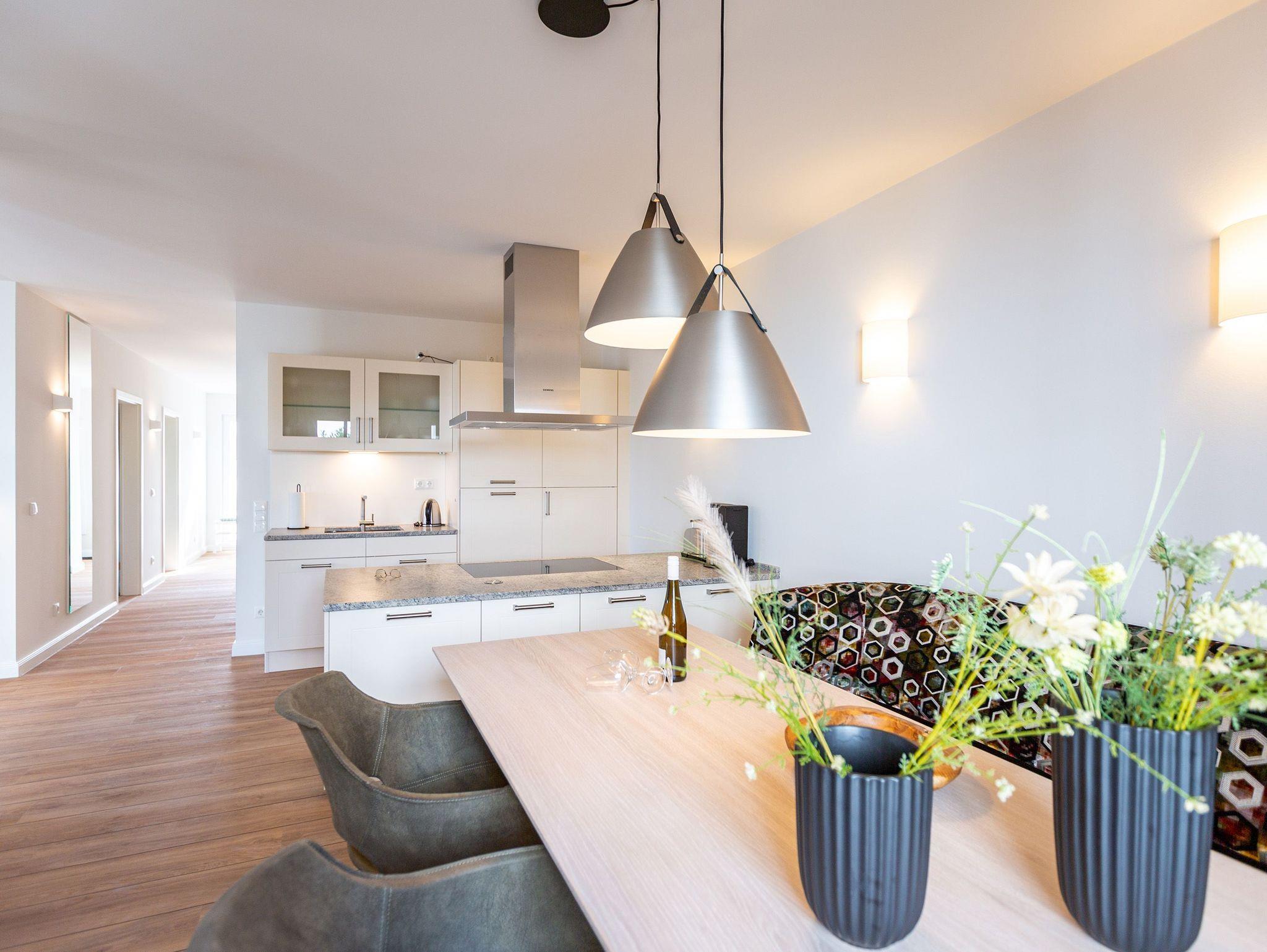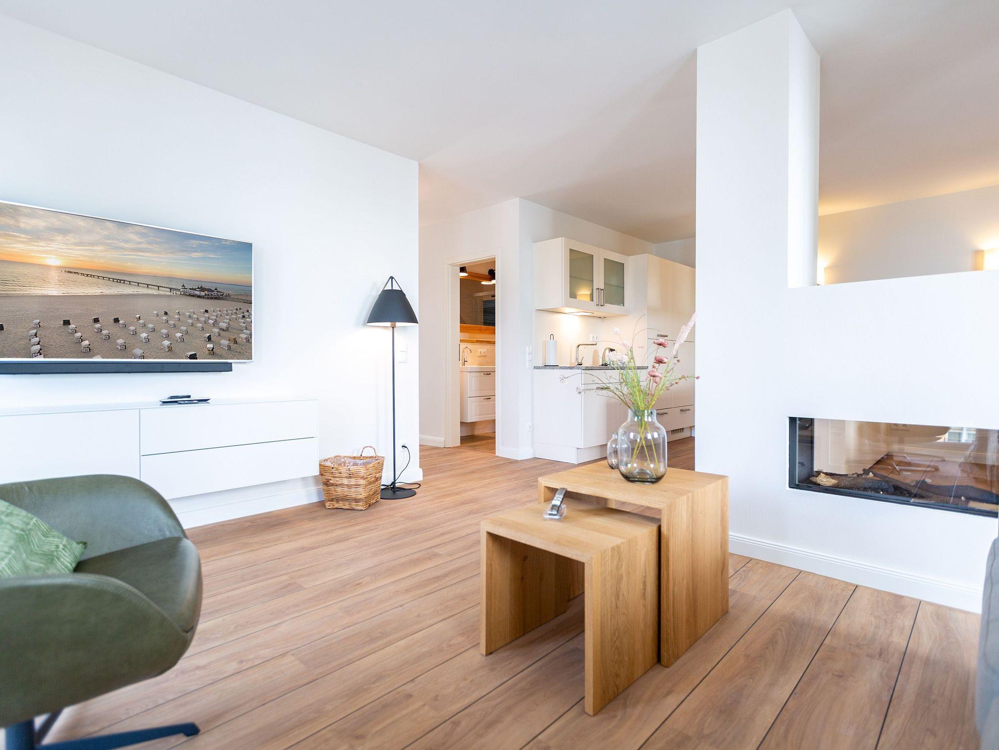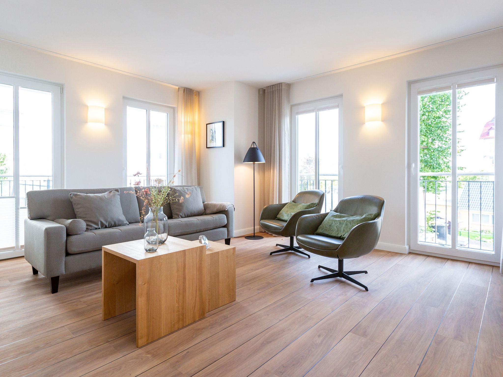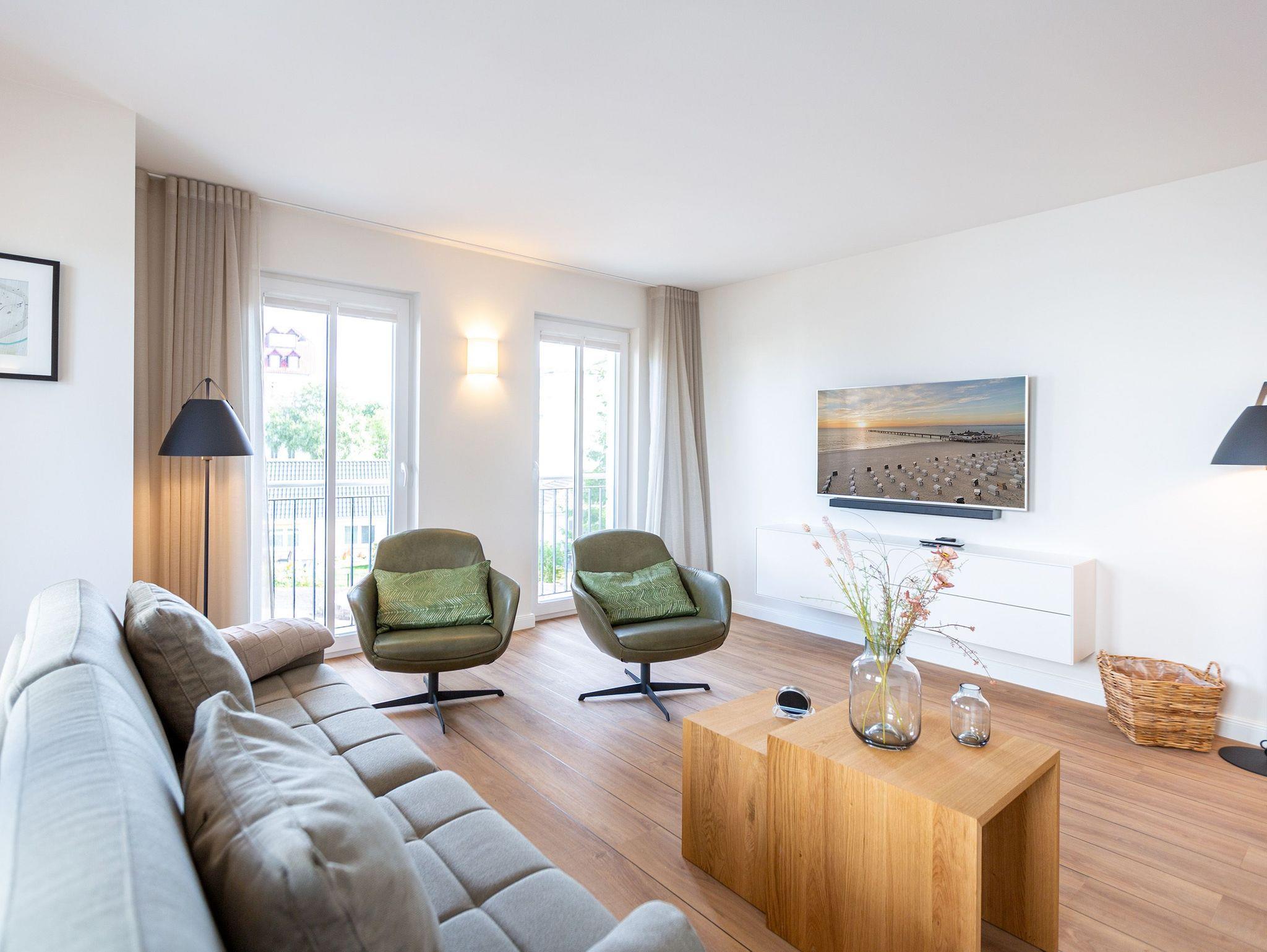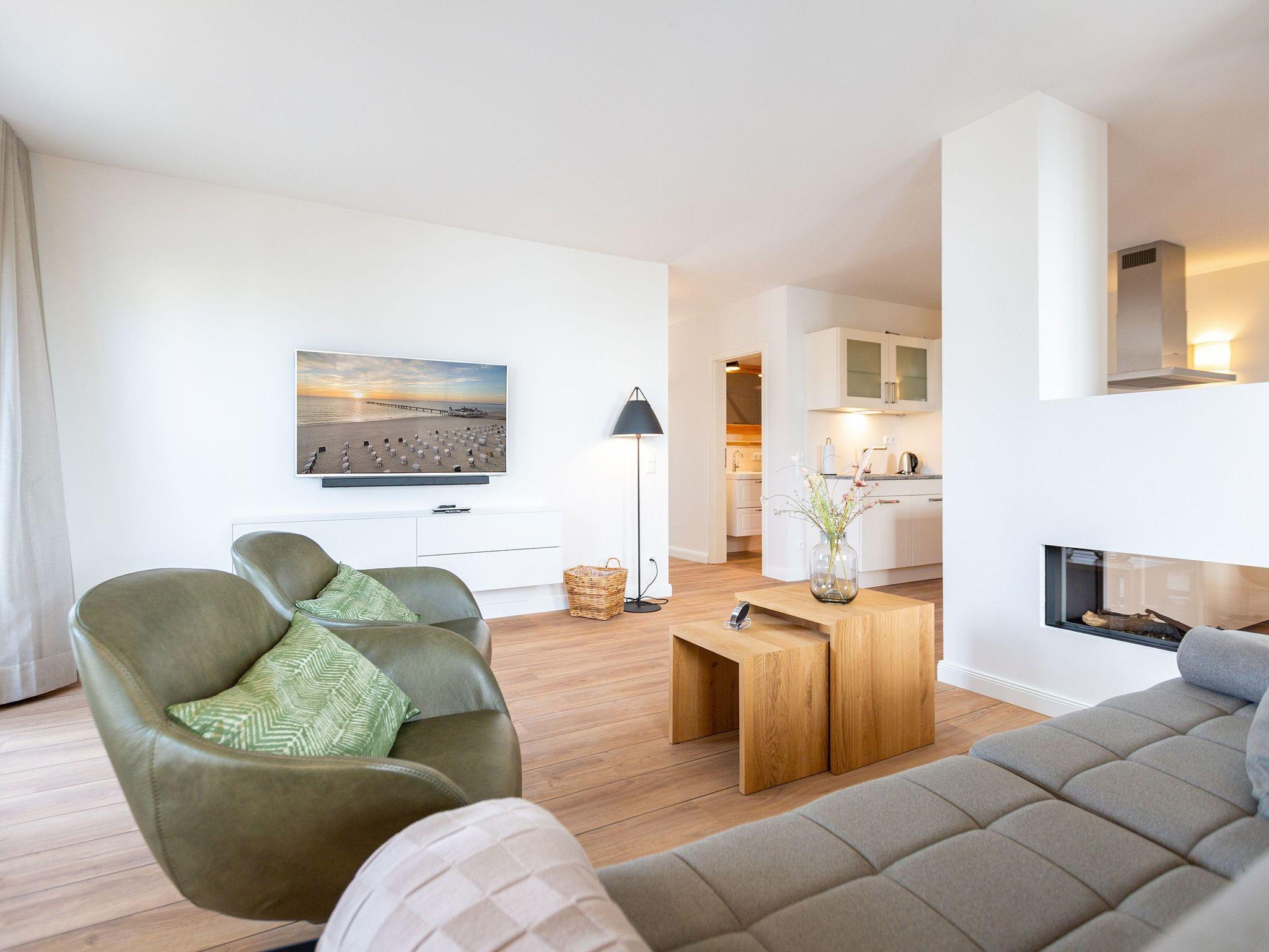 Helle Räume, modernes Interieur und harmonisch abgestimmte Farben und Formen laden Sie in diesem 3-Zimmer-Appartement mit 85 qm ein, Ihren Traumurlaub zu verbringen. Das Haus ist in einen Hang gebaut, sodass sich die Wohnung 3 im Erdgeschoss gelegen, zu einer Seite wie in der 1. Etage anfühlt. Die Wohnung ist vom Flur aus auch nur über eine Etage im Treppenhaus oder mit dem Aufzug erreichbar. Ob zu zweit oder zu viert - genießen Sie neben der Nähe zum feinen Ostseestrand die zentrale und doch ruhige Lage dieses Appartements. Ob nach einem Bummel auf der Promenade oder einem ausgiebigen Strandspaziergang, lassen Sie den Abend auf dem Sofa oder den stylischen Ledersesseln ausklingen oder genießen Sie noch eine Brise Meeresluft vom West-Balkon Ihres Wohnzimmers aus. Neben einem Flat-TV mit Soundsystem ist der Wohnbereich mit einem Gaskamin ausgestattet, der auch vom offenen Essbereich aus für entsprechende Gemütlichkeit sorgt. Die offen gestaltete Küche lässt dem Hobby- oder Profikoch keine Wünsche offen. Hochwertige Geräte und Materialien sowie eine Kochinsel sorgen für angenehmen Komfort bei der Zubereitung Ihrer Speisen. Gönnen Sie Ihrem Körper anschließend in einem der beiden Schlafzimmer mit komfortablen Doppelbetten (1,80m x 2,00m) und Flat-TV eine Auszeit. Die angrenzenden Balkone (1x Nord-Ost , 1x nach Westen ausgerichtet) laden zum Verweilen am Morgen ein. Für ausreichend Stauraum und die Sicherheit Ihrer Wertgegenständige sorgt der dezente Einbauschrank inklusive Tresor. Freuen Sie sich besonders auf eines der beiden Badezimmer, das neben Regendusche und einer Finnischen Sauna zum rundum Wohlfühlprogramm beiträgt. Eine barrierefreie Dusche, Waschtisch und WC gehören selbstverständlich ebenso zum Komfort Ihres Urlaubes. Kostenfreies W-Lan und ein Stellplatz in der hauseigenen Tiefgarage runden Ihren perfekten Urlaub auf der Insel Usedom ab.