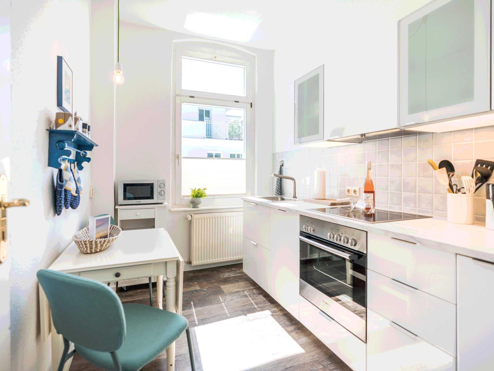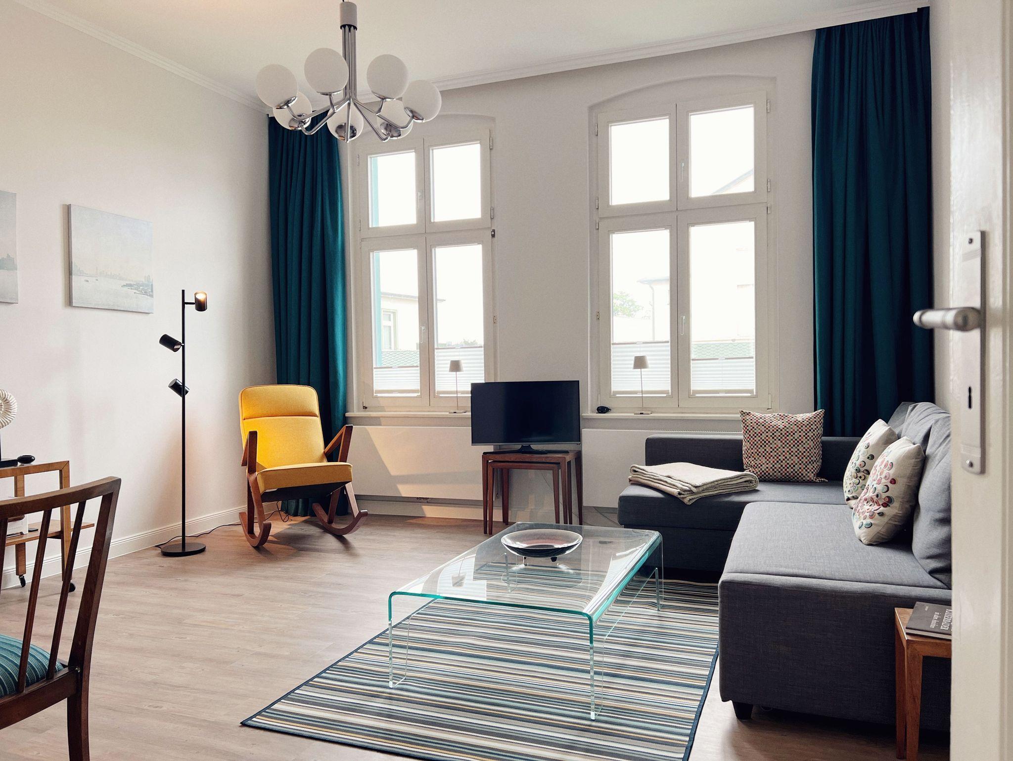 Die 46 qm große Ferienwohnung 4 für maximal 4 Personen befindet sich im 1. Stockwerk und bietet überhohe Decken im Altbaustil kombiniert mit einem individuellen Mix aus echten Antiquitäten und modernen Designmöbeln. Die großen Fenster im Wohnzimmer blicken auf die Seestraße; die Küche mit moderner Küchenzeile sowie das Schlafzimmer liegen zum Innenhof. Aufgrund des historischen Zuschnitts befindet sich im Schlafzimmer ein französisches Doppelbett (140 cm). Vervollständigt wird die Ausstattung im Wohnzimmer um das ausziehbare Eckschlafsofa (140 cm) nebst gemütlichem Lesesessel und Full-HD-TV.