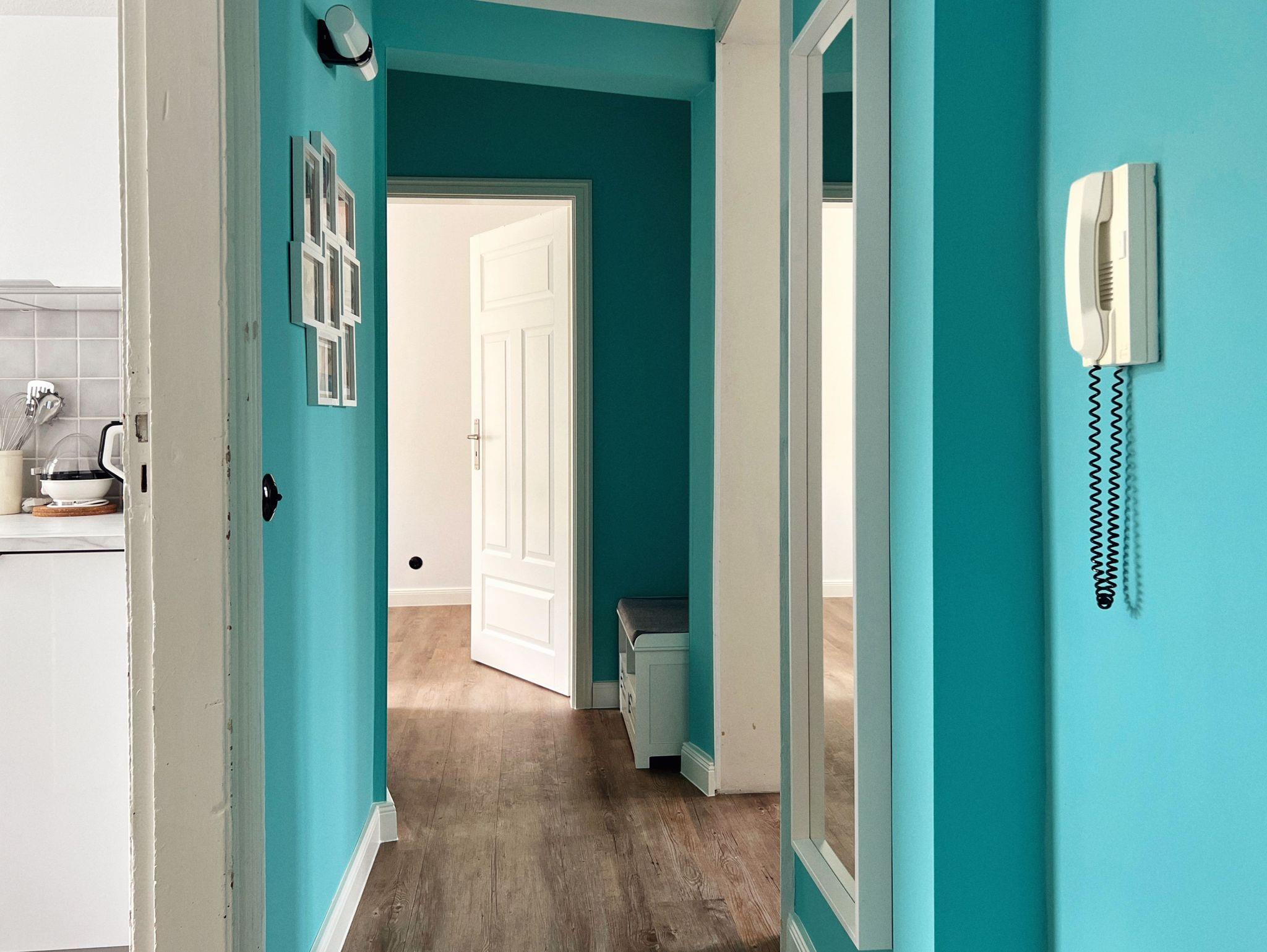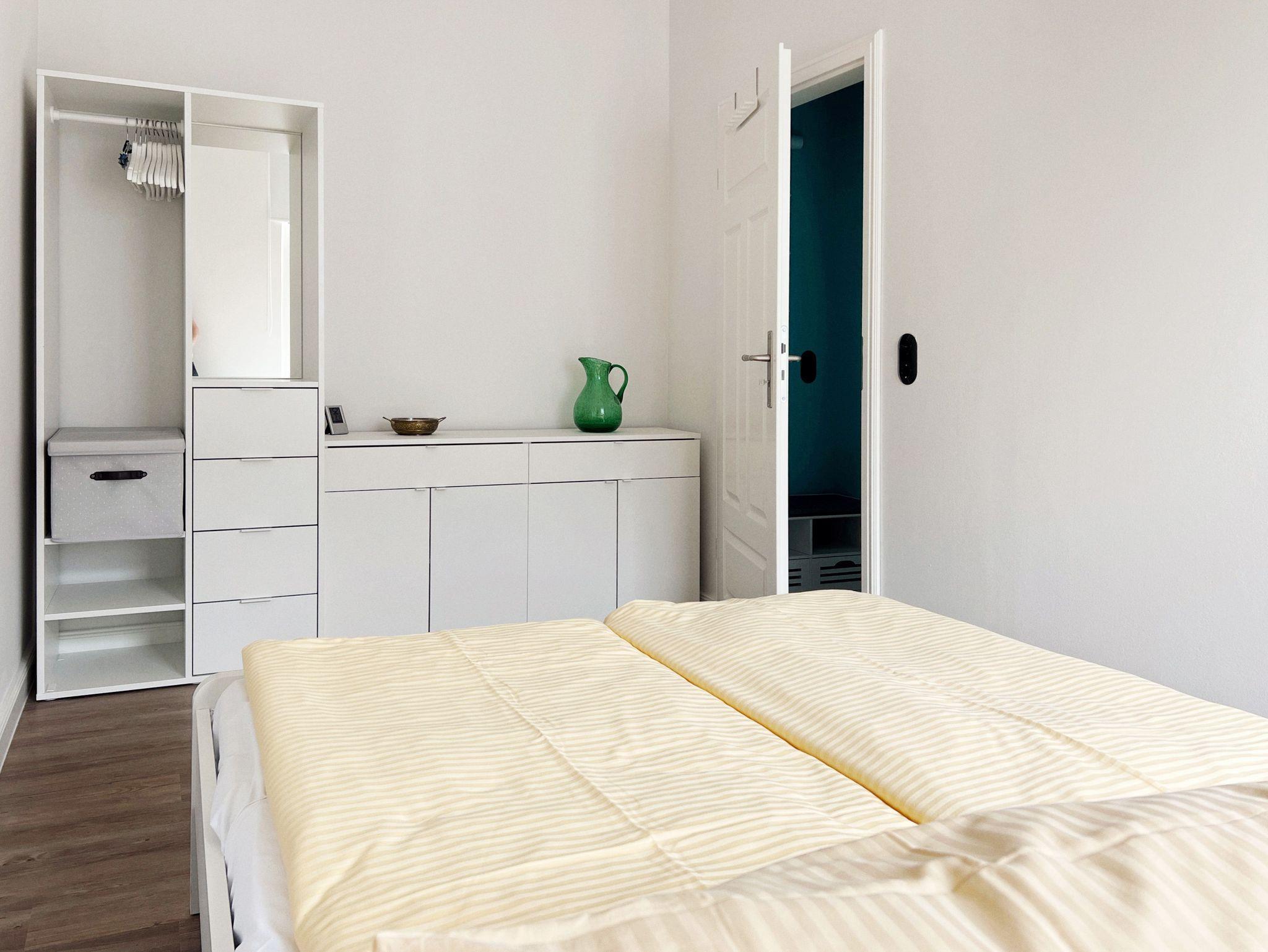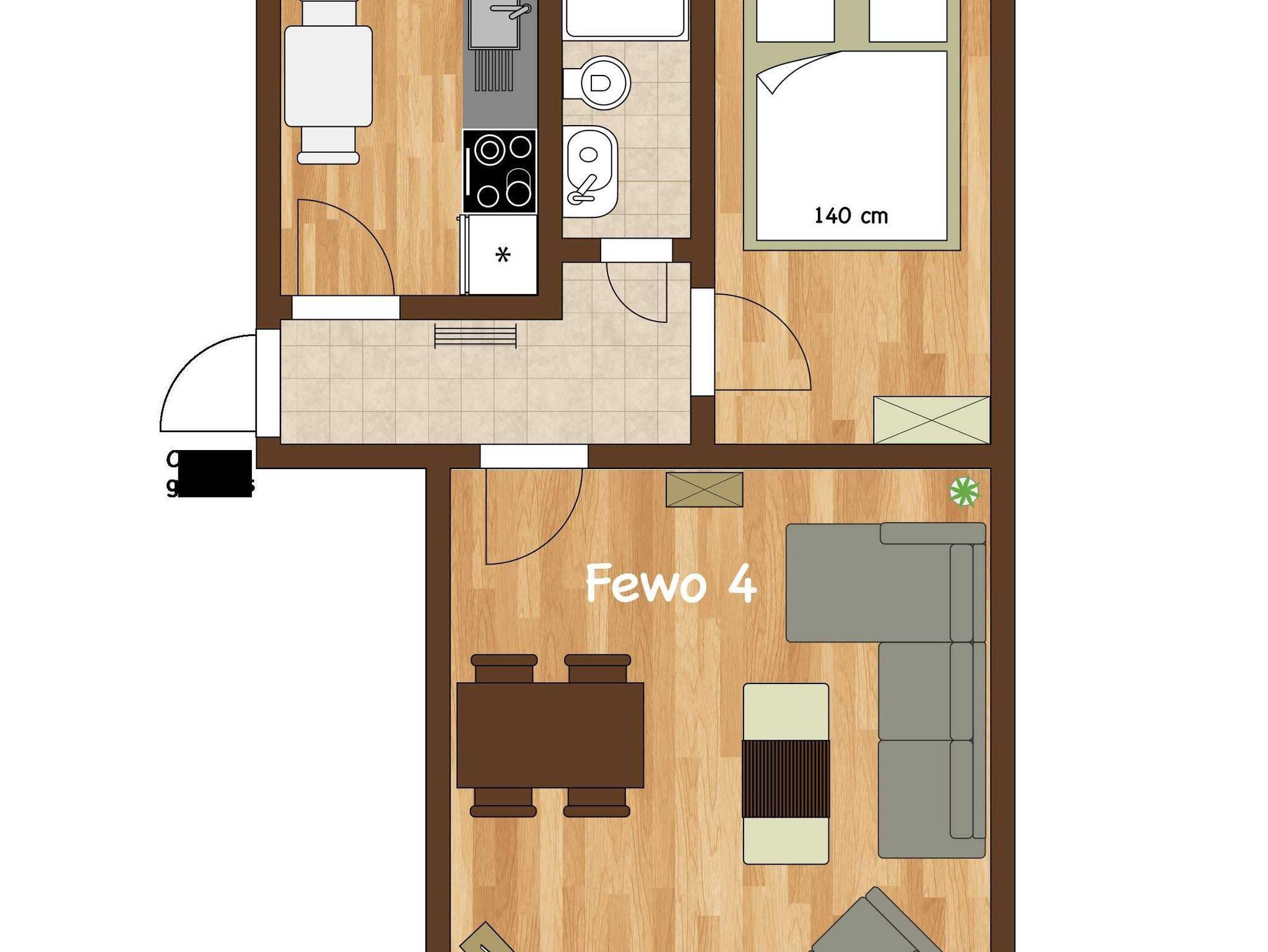 Die 46 qm große Ferienwohnung 4 für maximal 4 Personen befindet sich im 1. Stockwerk und bietet überhohe Decken im Altbaustil kombiniert mit einem individuellen Mix aus echten Antiquitäten und modernen Designmöbeln. Die großen Fenster im Wohnzimmer blicken auf die Seestraße; die Küche mit moderner Küchenzeile sowie das Schlafzimmer liegen zum Innenhof. Aufgrund des historischen Zuschnitts befindet sich im Schlafzimmer ein französisches Doppelbett (140 cm) und ein kleiner Wäscheschrank mit Spiegel. Vervollständigt wird die Ausstattung im Wohnzimmer um das ausziehbare Eckschlafsofa (140 cm) nebst gemütlichem Lesesessel und Full-HD-TV.