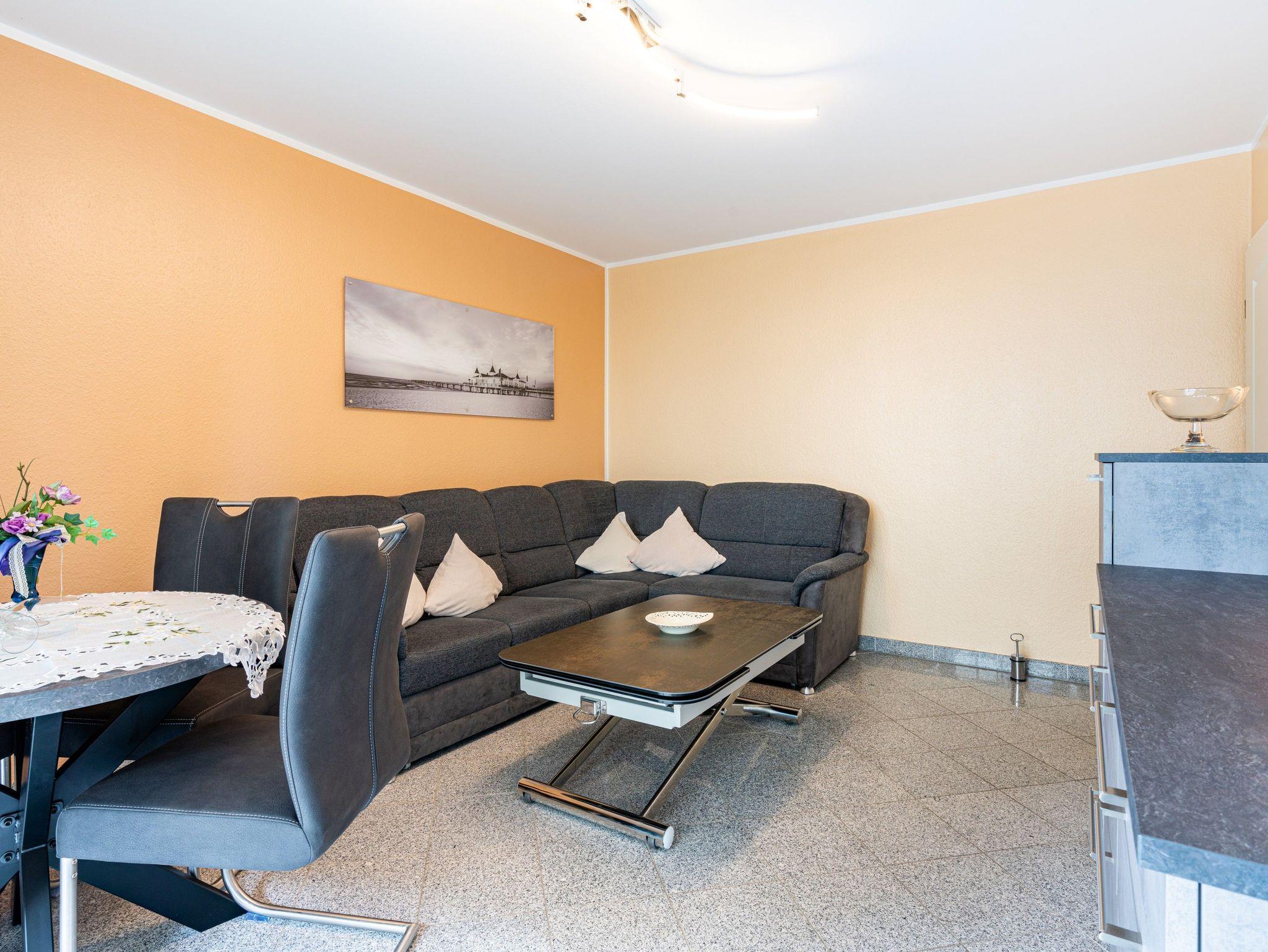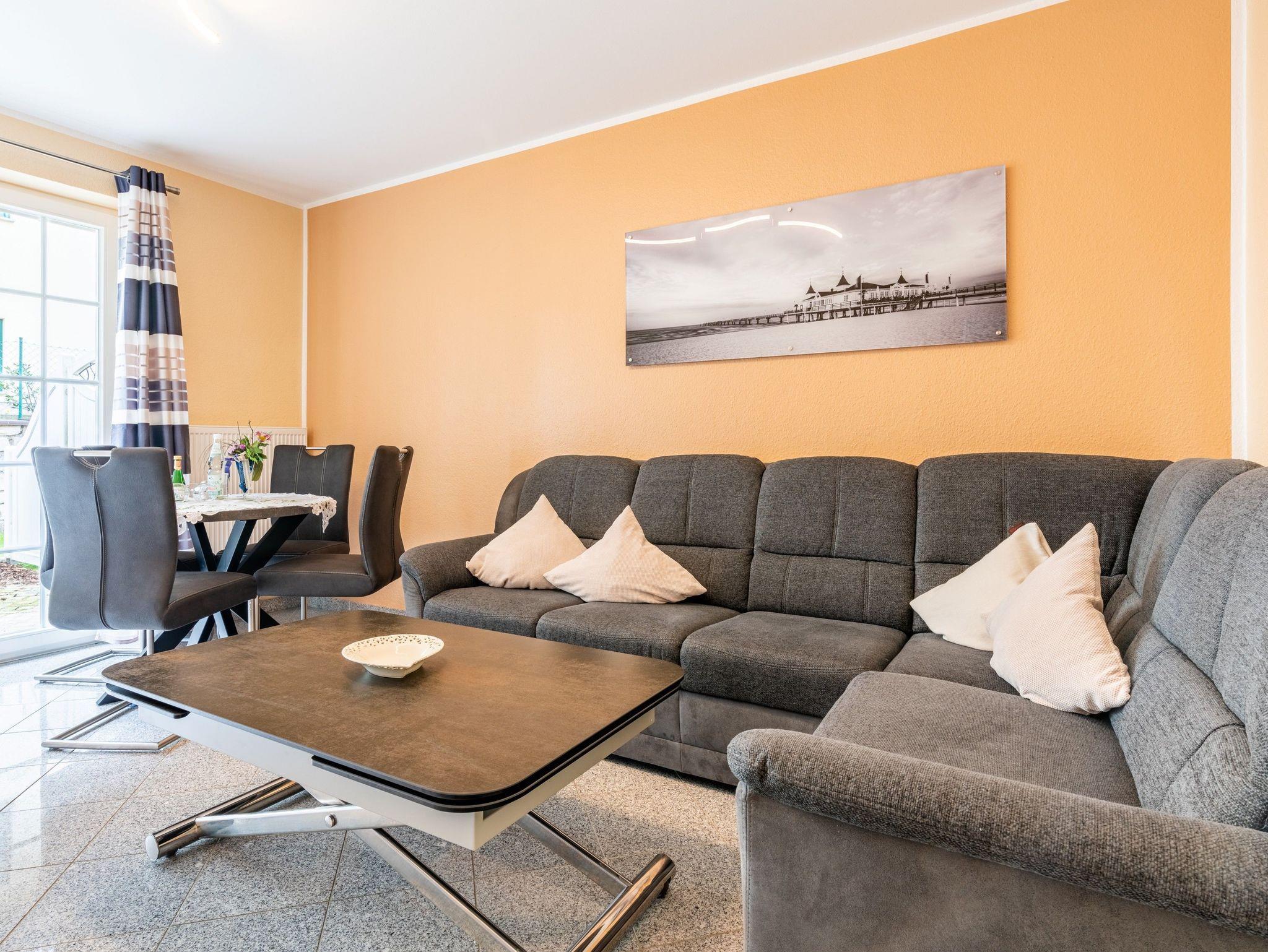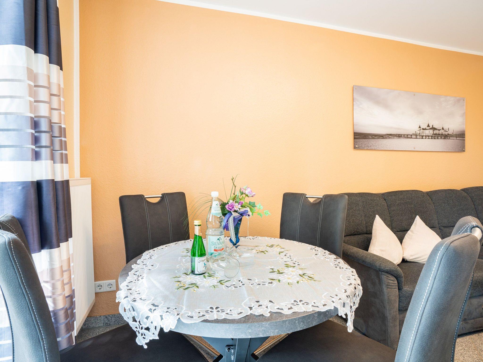 Eine möblierte Terrasse lädt an der Unterkunft zum Verweilen ein. Von hier aus kann man entspannt Tagesausflüge planen oder den Tag einfach am 500 Meter entfernten Ahlbecker Strand genießen.