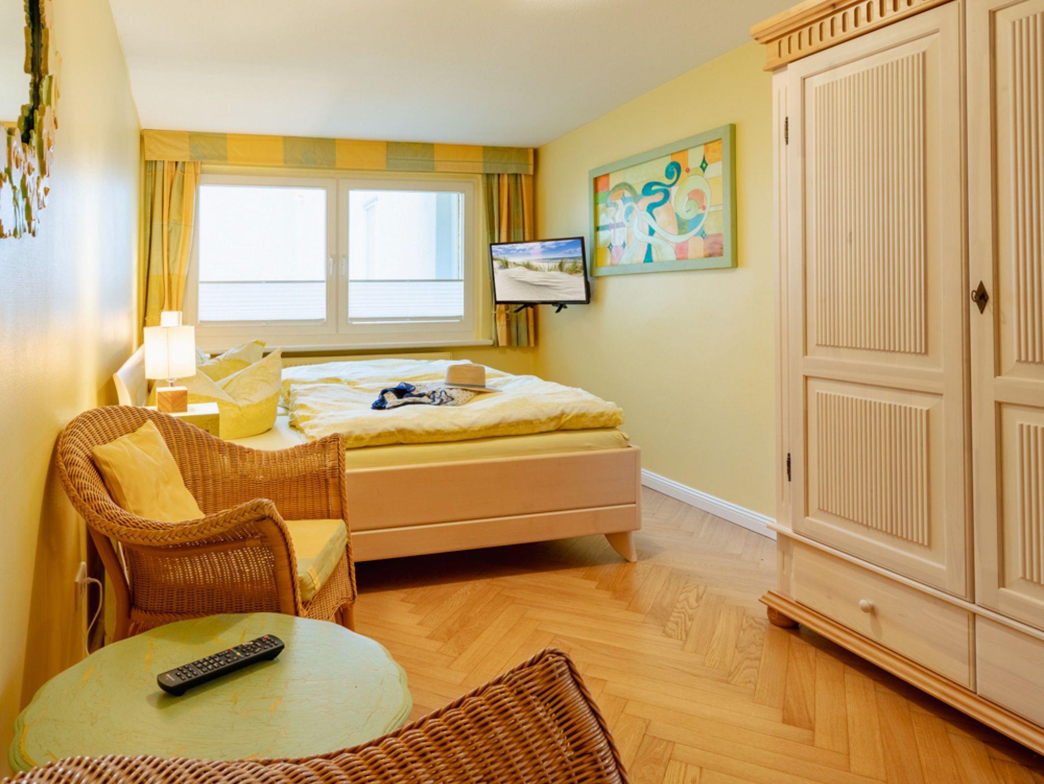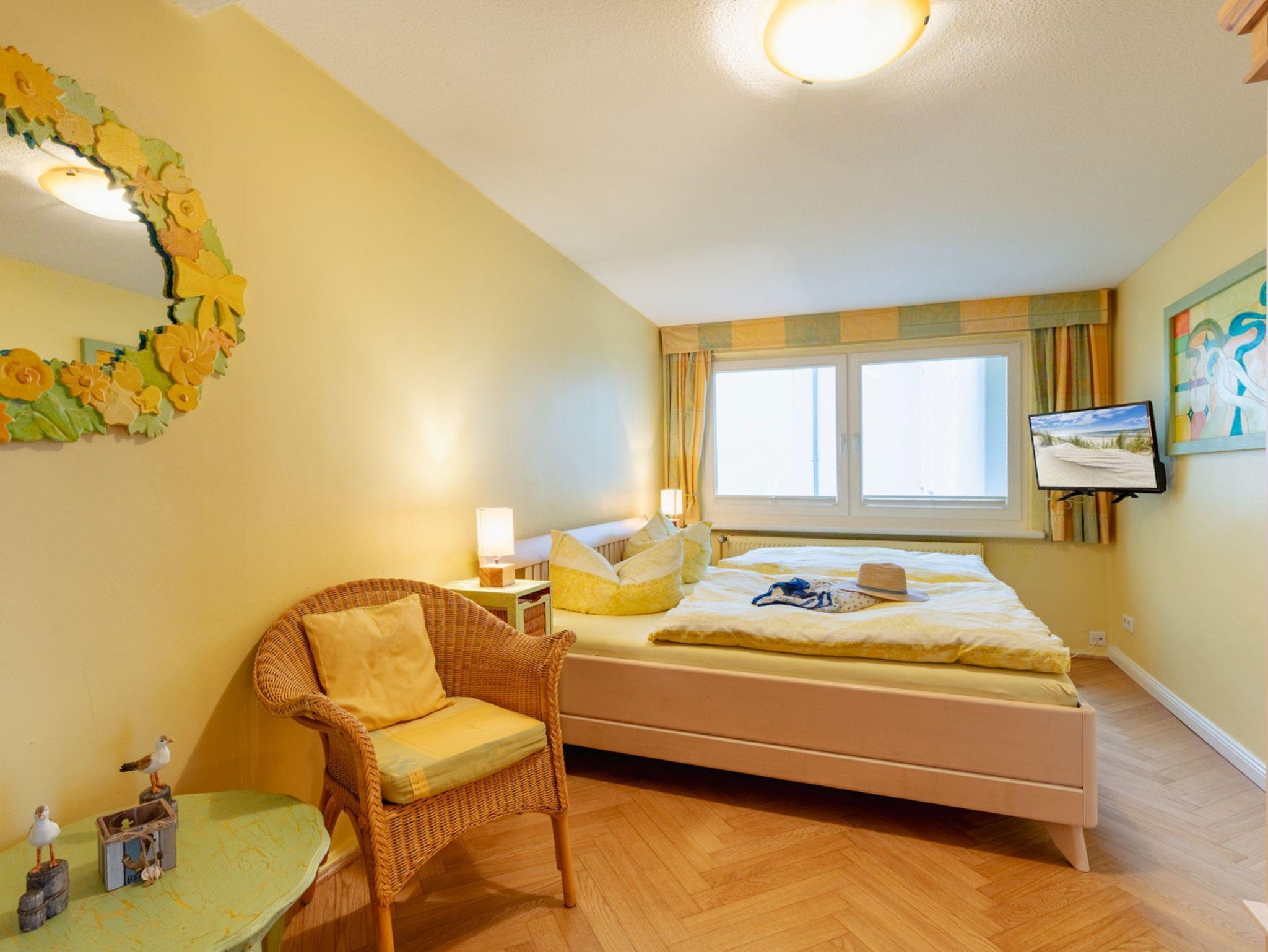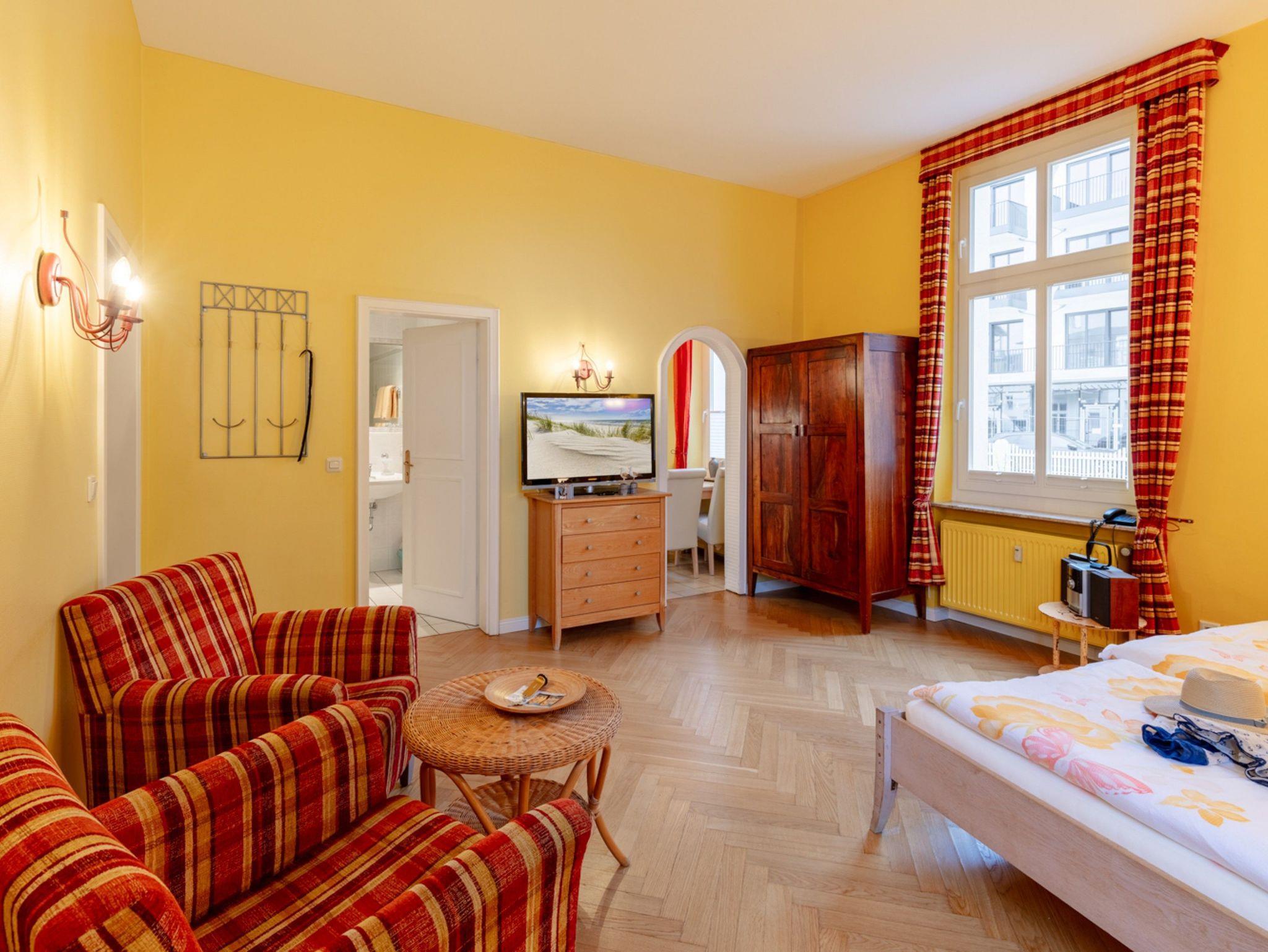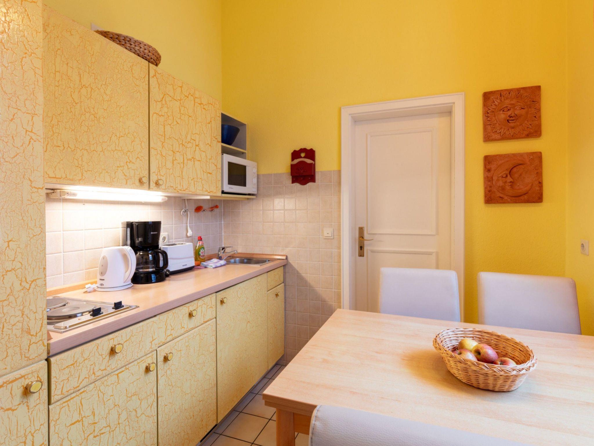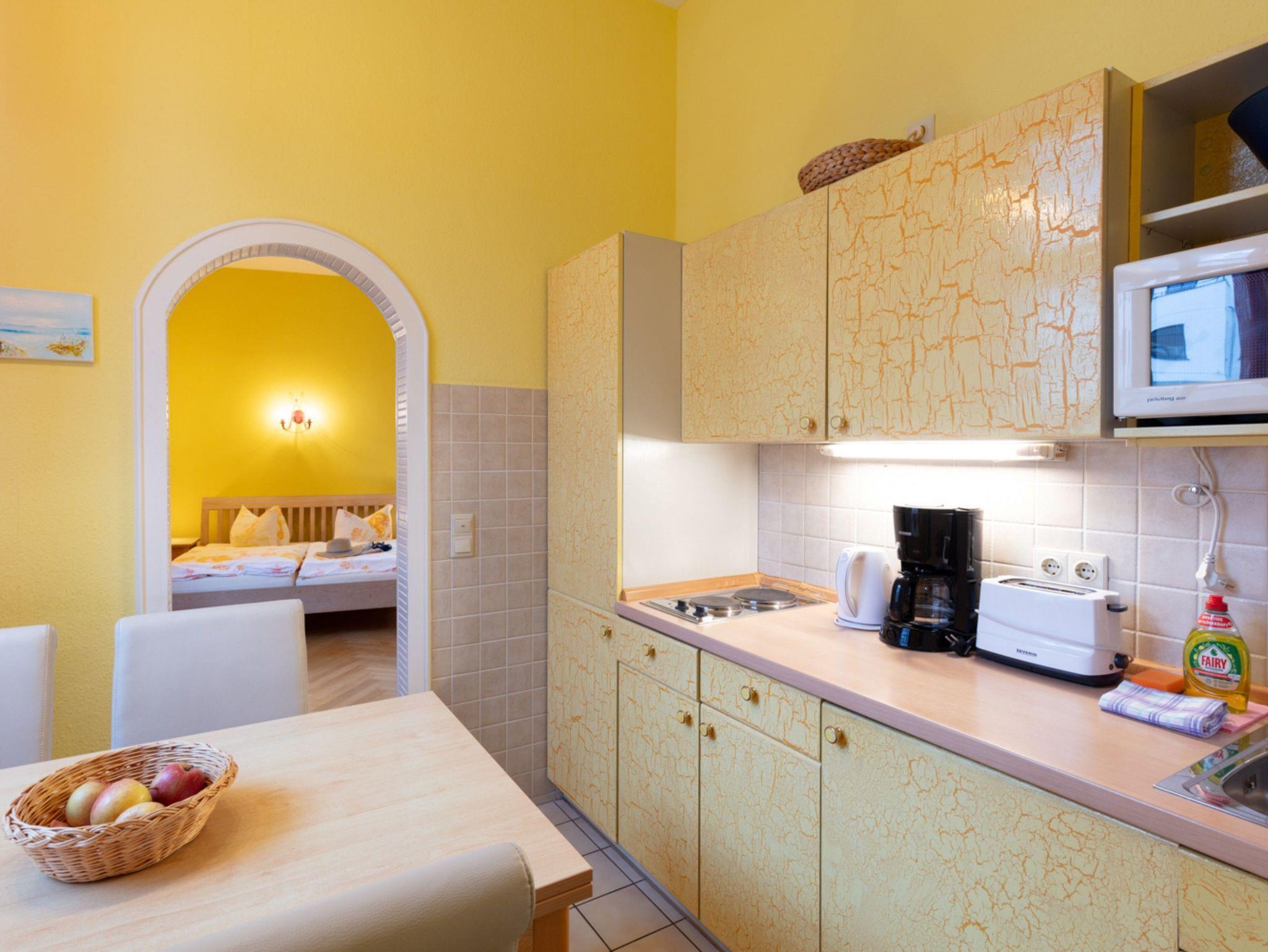 Die ca. 60 qm große behindertengerechte Wohnung befindet sich im Erdgeschoss im Vorderhaus und verfügt über zwei separate Eingänge. Das Appartement ist mit zwei Wohn-/Schlafräumen ausgestattet, die jeweils über ein Doppelbett (davon ein erhöhtes Bett zum besseren Ein- und Ausstieg) eine Sitzecke, Sat-TV, Radiowecker, Telefon und Schranktresor verfügen. Die gemütliche Küche mit Essplatz ist mit einem 2-Platten-Herd, Mikrowelle, Kaffeemaschine, Wasserkocher, Toast u.v.m. ausgestattet.