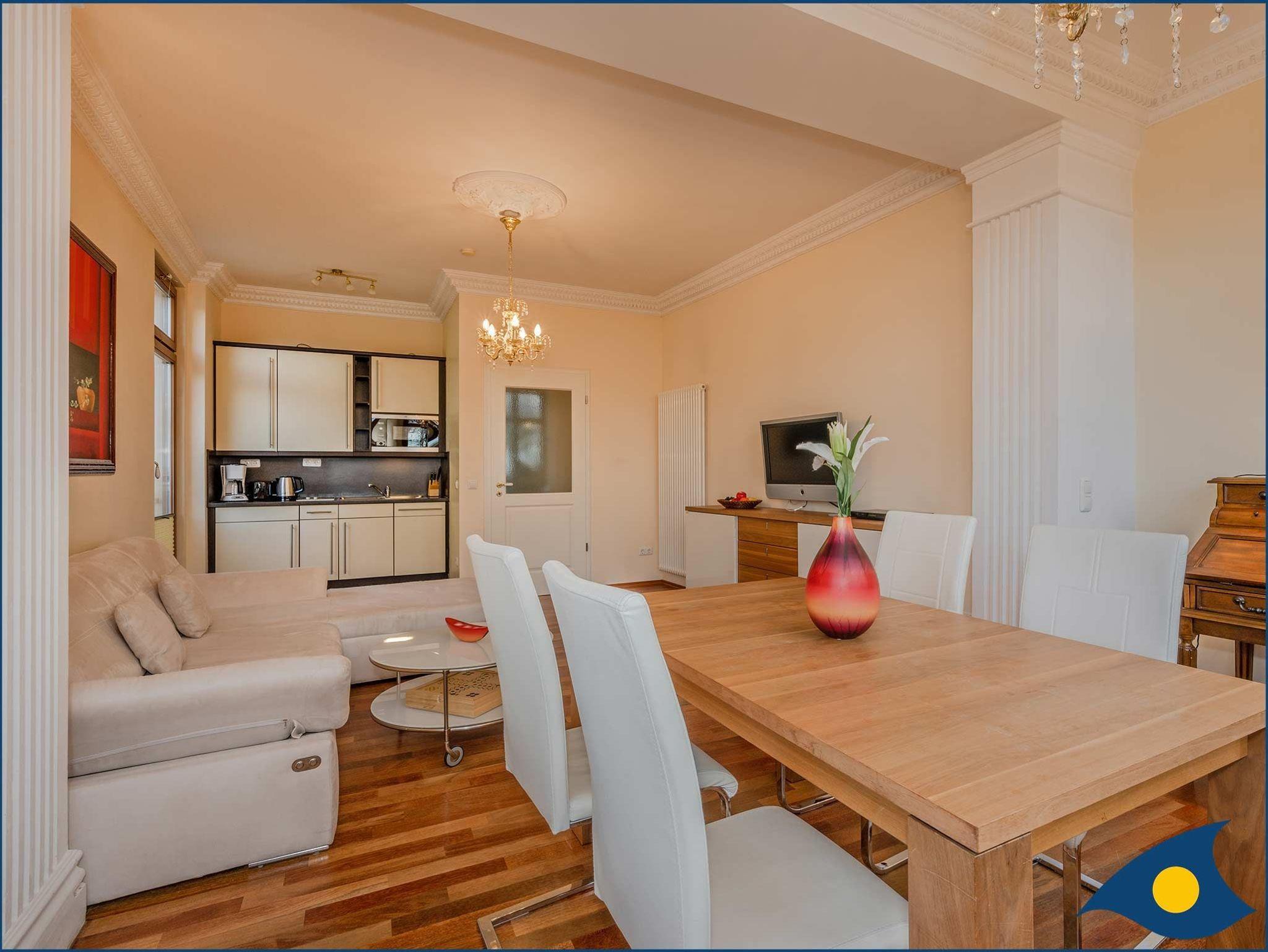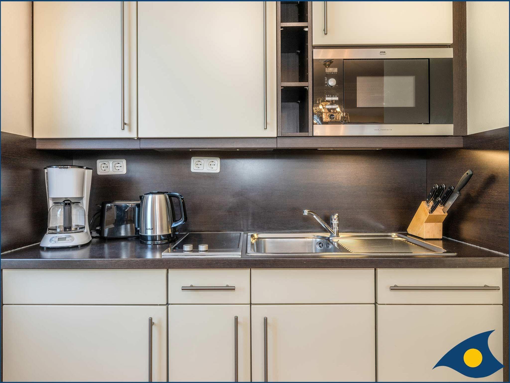 Die helle Wohnung verfügt über einen großzügigen Wohn-/Essbereich mit Zugang zur Terrasse, auf der Sie gemütlich dem bunten Treiben auf der Promenade zuschauen können. Die Aufbettung der 3. Person findet auf der Schlafcouch Platz. Die offene Küche ist mit einer Spülmaschine, einer Mikrowelle, einem 2 Platten-Ceranfeld und Kühlschrank ausgestattet.