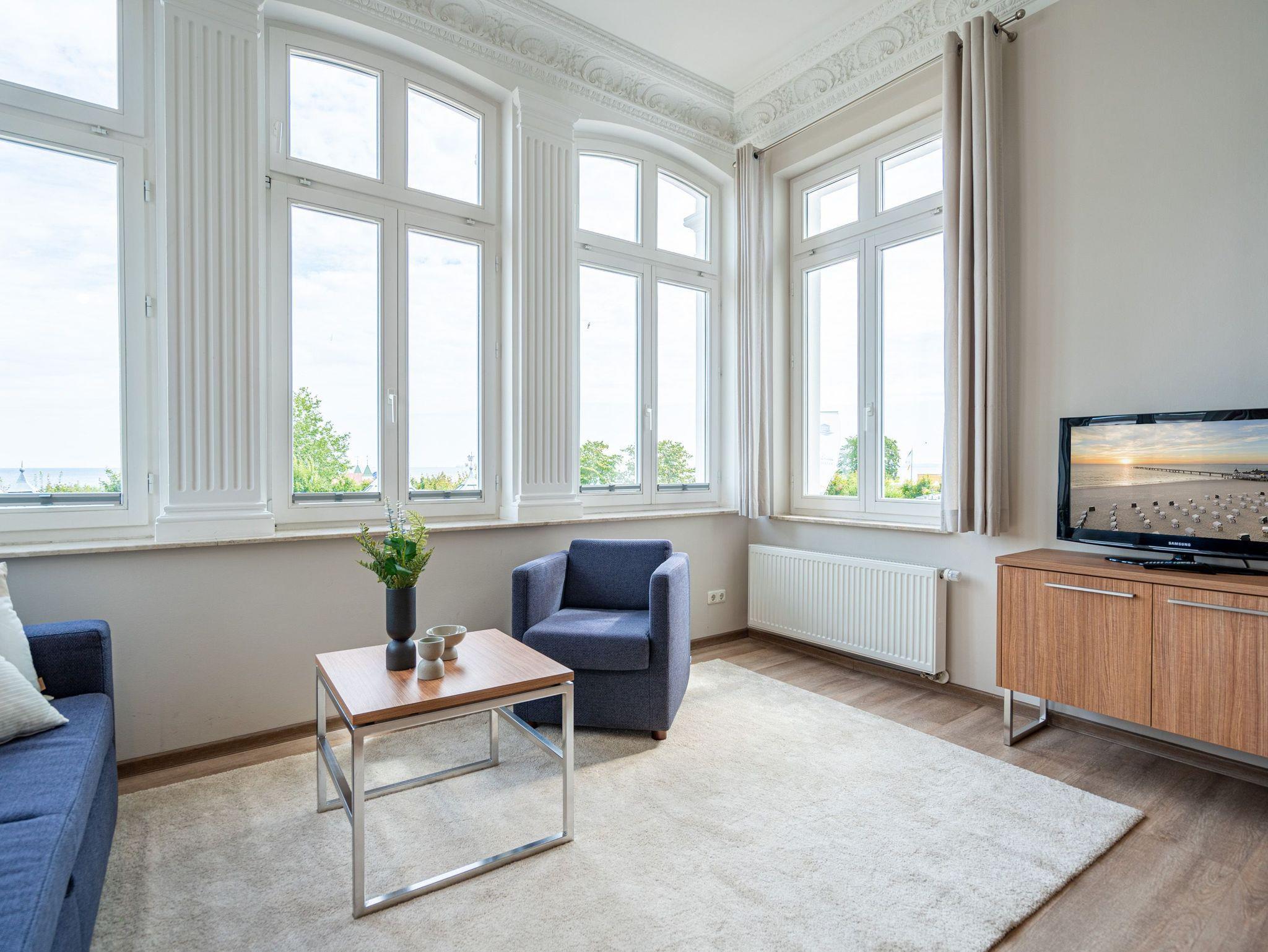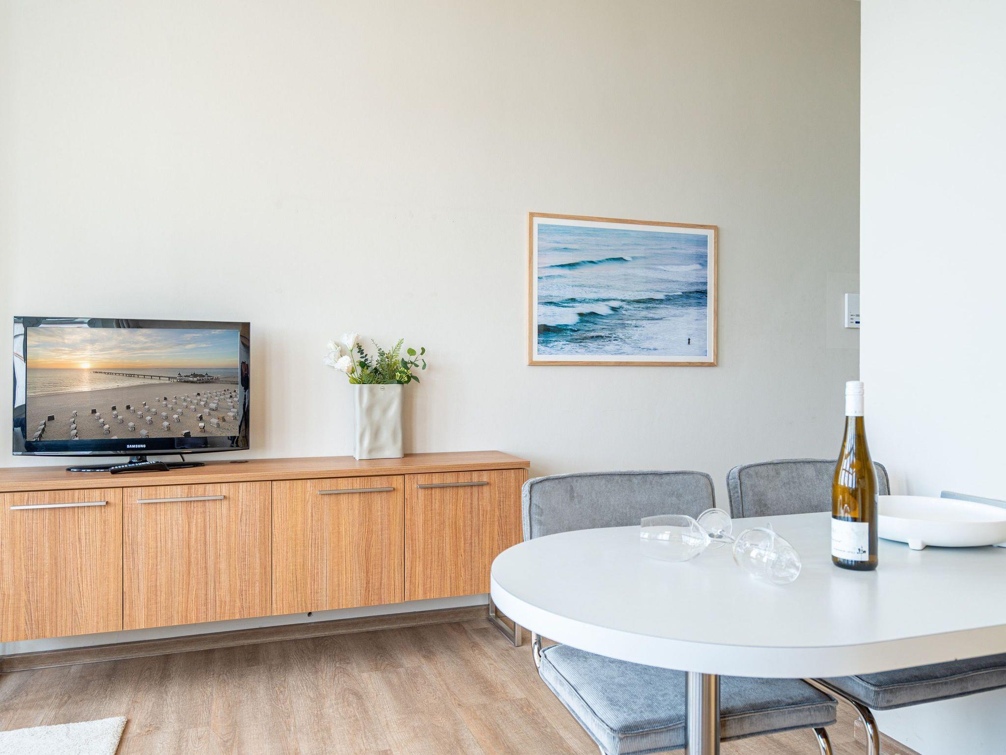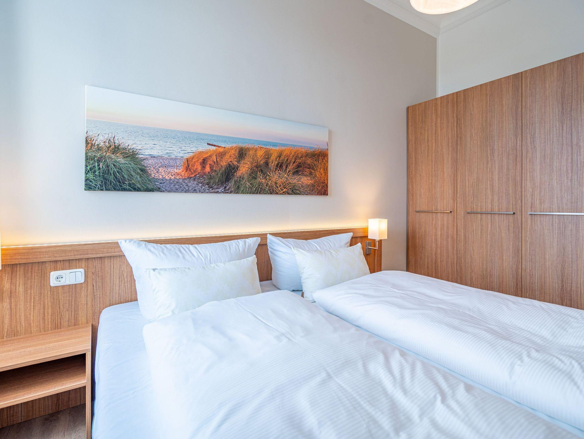 Die 2-Raum-Ferienwohnung Nr. C05 in der Villa Seedüwel bietet auf 41 qm Platz für zwei Personen und befindet sich im 1. Obergeschoss. Der offene Wohnbereich bietet einen Blick zur Promenade und Richtung Ostsee und ist mit einer Küchenzeile ausgestattet, die ein 2-Platten-Cerankochfeld, eine Mikrowelle und einen Kühlschrank mit Gefrierfach umfasst. Ein Essplatz für zwei Personen, eine gemütliche Sitzgruppe und ein Flat-TV sorgen für Komfort. Das Schlafzimmer verfügt über ein Doppelbett (1,80 m x 2,00 m) und einen Kleiderschrank. Auch von hier aus genießen Sie den Blick Richtung Promenade und Ostsee. Das Bad ist mit einer Dusche und einem Waschbecken ausgestattet, zudem gibt es ein separates WC. Ein Stellplatz in der Tiefgarage ( Einfahrthöhe 2,03m) des benachbarten Hauses „Strandterrasse“ ist für Sie reserviert. WLAN steht Ihnen kostenfrei zur Verfügung.