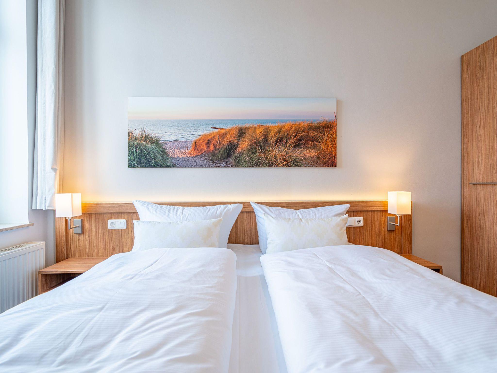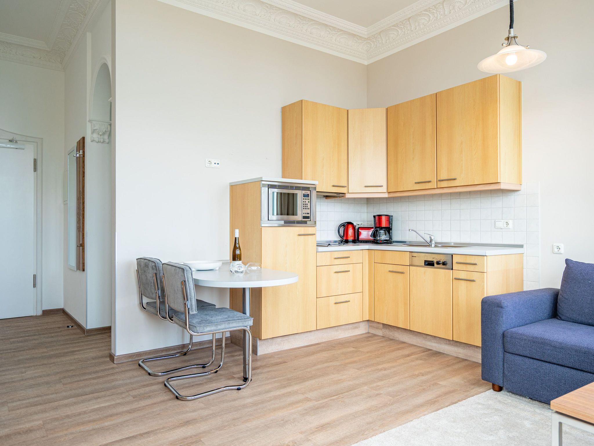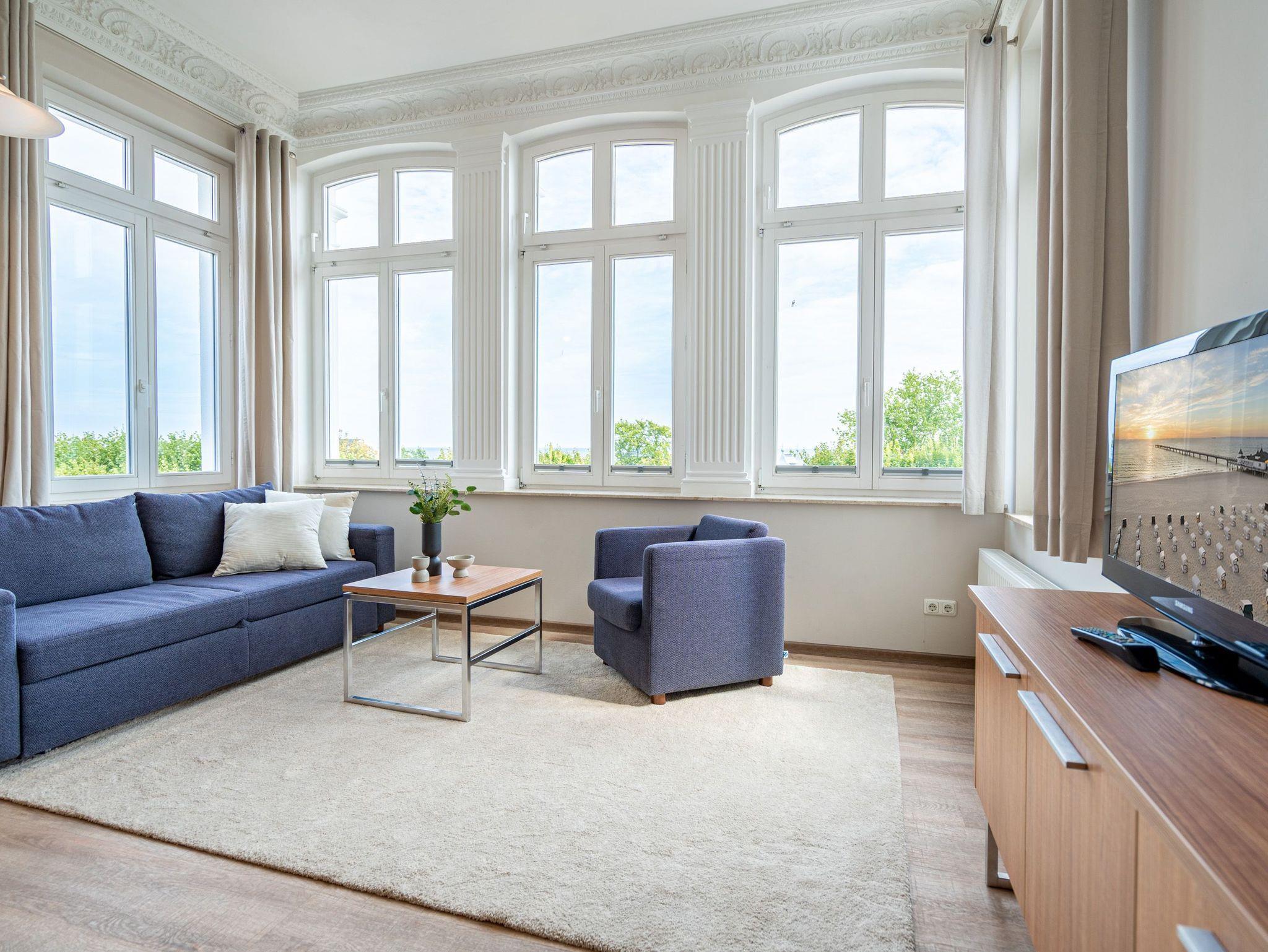 Die 2-Raum-Ferienwohnung Nr. C05 in der Villa Seedüwel bietet auf 41 qm Platz für zwei Personen und befindet sich im 1. Obergeschoss. Der offene Wohnbereich bietet einen Blick zur Promenade und Richtung Ostsee und ist mit einer Küchenzeile ausgestattet, die ein 2-Platten-Cerankochfeld, eine Mikrowelle und einen Kühlschrank mit Gefrierfach umfasst. Ein Essplatz für zwei Personen, eine gemütliche Sitzgruppe und ein Flat-TV sorgen für Komfort. Das Schlafzimmer verfügt über ein Doppelbett (1,80 m x 2,00 m) und einen Kleiderschrank. Auch von hier aus genießen Sie den Blick Richtung Promenade und Ostsee. Das Bad ist mit einer Dusche und einem Waschbecken ausgestattet, zudem gibt es ein separates WC. Ein Stellplatz in der Tiefgarage ( Einfahrthöhe 2,03m) des benachbarten Hauses „Strandterrasse“ ist für Sie reserviert. WLAN steht Ihnen kostenfrei zur Verfügung.