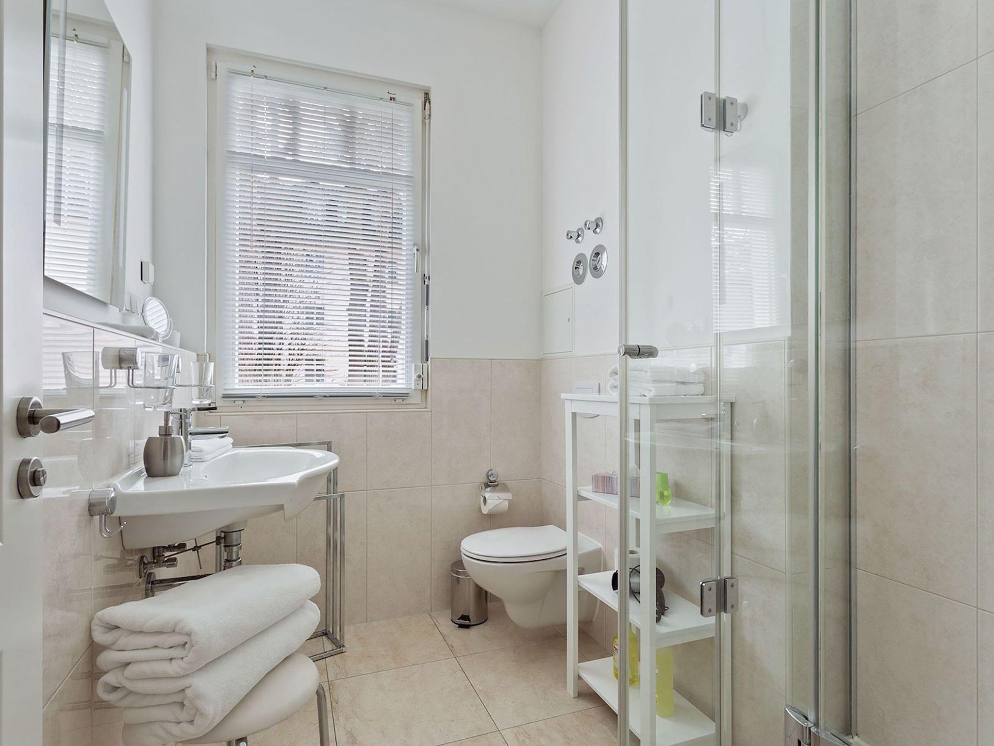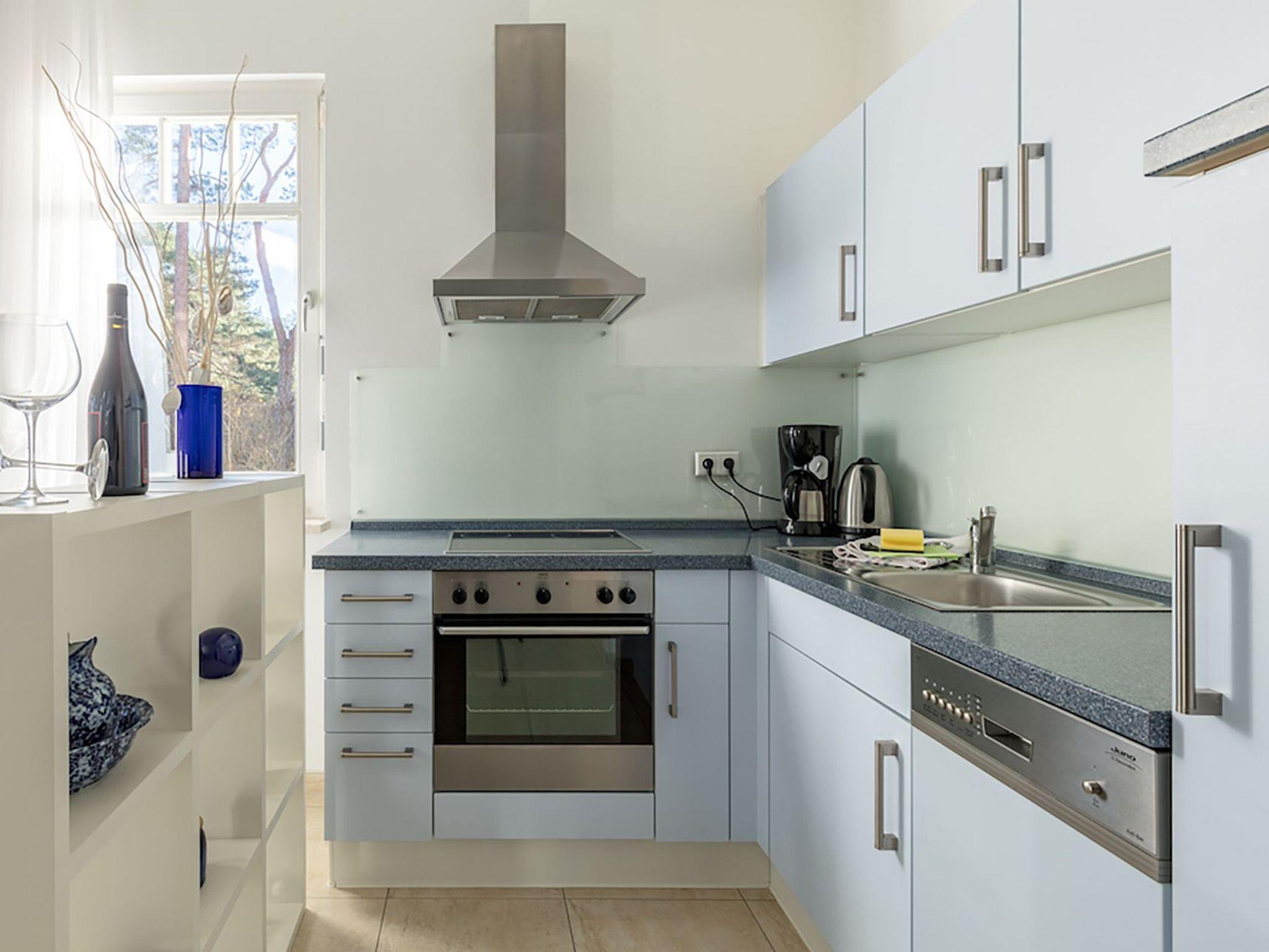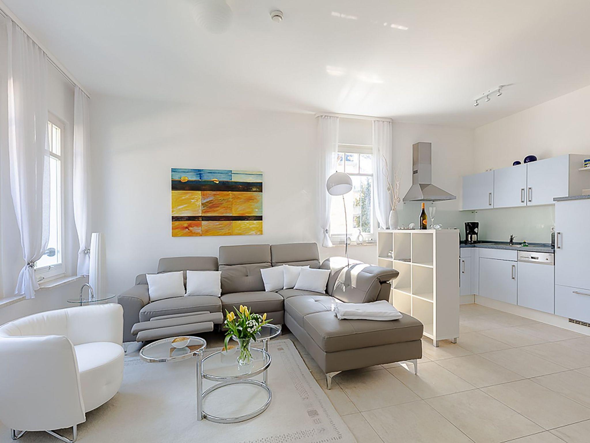 Das 60 m² große 2-Raum-Apartment Düne bietet Ihnen lichtdurchflutete Räume dank vieler Fenster und liegt im gemütlichen Hochparterre ? perfekt für 2 Erwachsene und 1 Kind bis 16 Jahre. Vom Wohnbereich genießen Sie durch die begrünte Düne einen Blick auf die Ostsee. Im Wohnraum erwarten Sie eine elegante sandgraue Ledercouch, stilvolle Essstühle, ein moderner UHD-LED-TV sowie eine offene, voll ausgestattete Küche. Das Schlafzimmer verwöhnt Sie mit einem komfortablen Boxspringbett (2,00 m x 1,80 m) und einem beleuchteten, 2 m breiten Kleiderschrank. Für Kinder bis 16 Jahre steht hier eine gemütliche Recamiere als zusätzliche Schlafgelegenheit bereit. Da sich unter dem Schlafzimmer der ebenerdige Wellnessbereich befindet, schlafen Sie angenehm erhöht ? wie im ersten Stock ? und blicken aus dem Fenster auf einen kleinen Park. Das Badezimmer verfügt über Dusche, Waschtisch, WC, Fenster und praktische Ablagen. Alle Fenster zur Ost- und Südseite sind mit außenliegenden, wärmereflektierenden Sonnenschutzrollos ausgestattet. Das schwellenfreie Apartment bietet durchgehend Fußbodenheizung, zwei gemütliche Außensitzplätze sowie einen PKW-Stellplatz direkt am Haus.