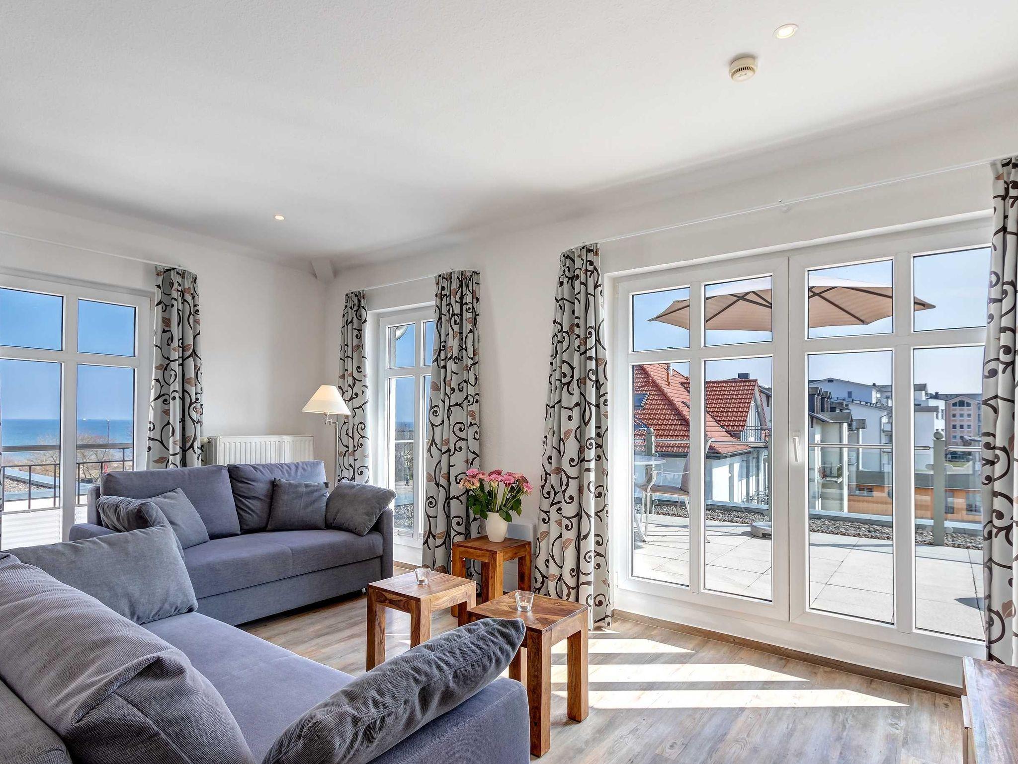 Schickes geräumiges 3-Zimmer-Appartement mit moderner hochwertiger Ausstattung. Zwei separate Schlafzimmer, Wohnzimmer mit Küchenbereich und Essplatz, Duschbad, 45 qm Dachterrasse über Eck nach Osten und Süden mit Sonne von morgens bis abends und herrlichem Seeblick. Die Wohnung verfügt über einen Tiefgaragen-Pkw-Stellplatz. In der Garage können auch Fahrräder und ähnliches untergestellt werden. Von der Villa Aquamarina sind es zum Ortszentrum und der Seebrücke ca. 3 Minuten zu Fuß. Zum Strand sind es 50 m. Die Wohnungen der Villa Aquamarina verfügen alle über passwortgeschütztes WLAN (gerätegebunden, Euro 1,50 pro Tag und pro Gerät).