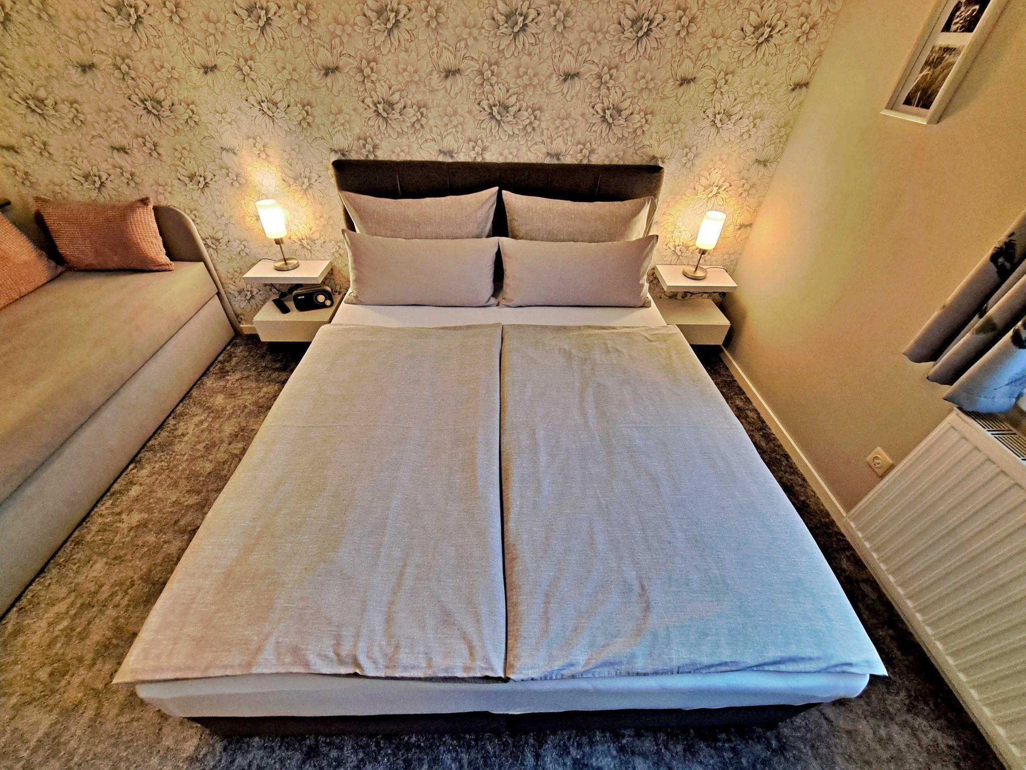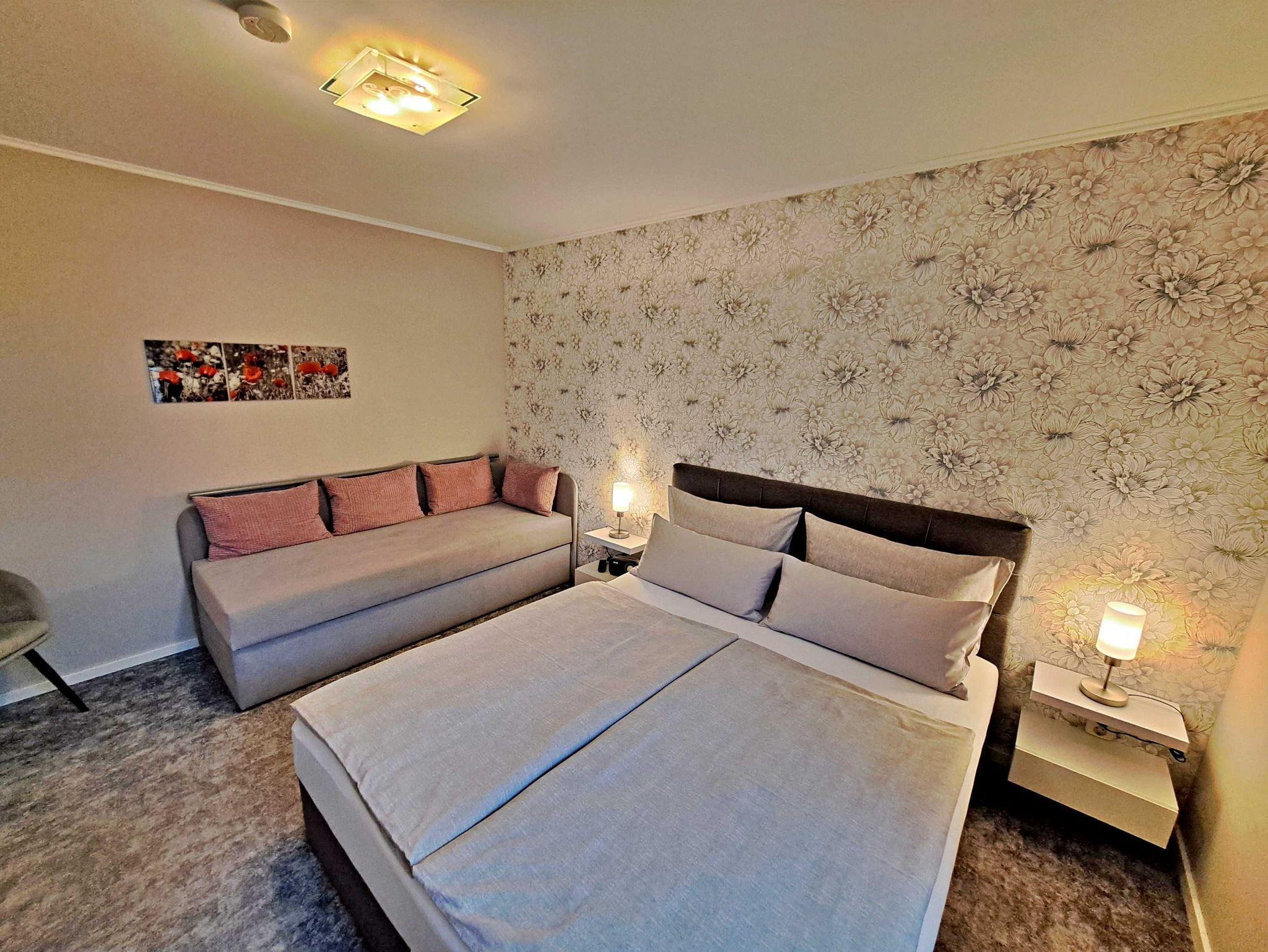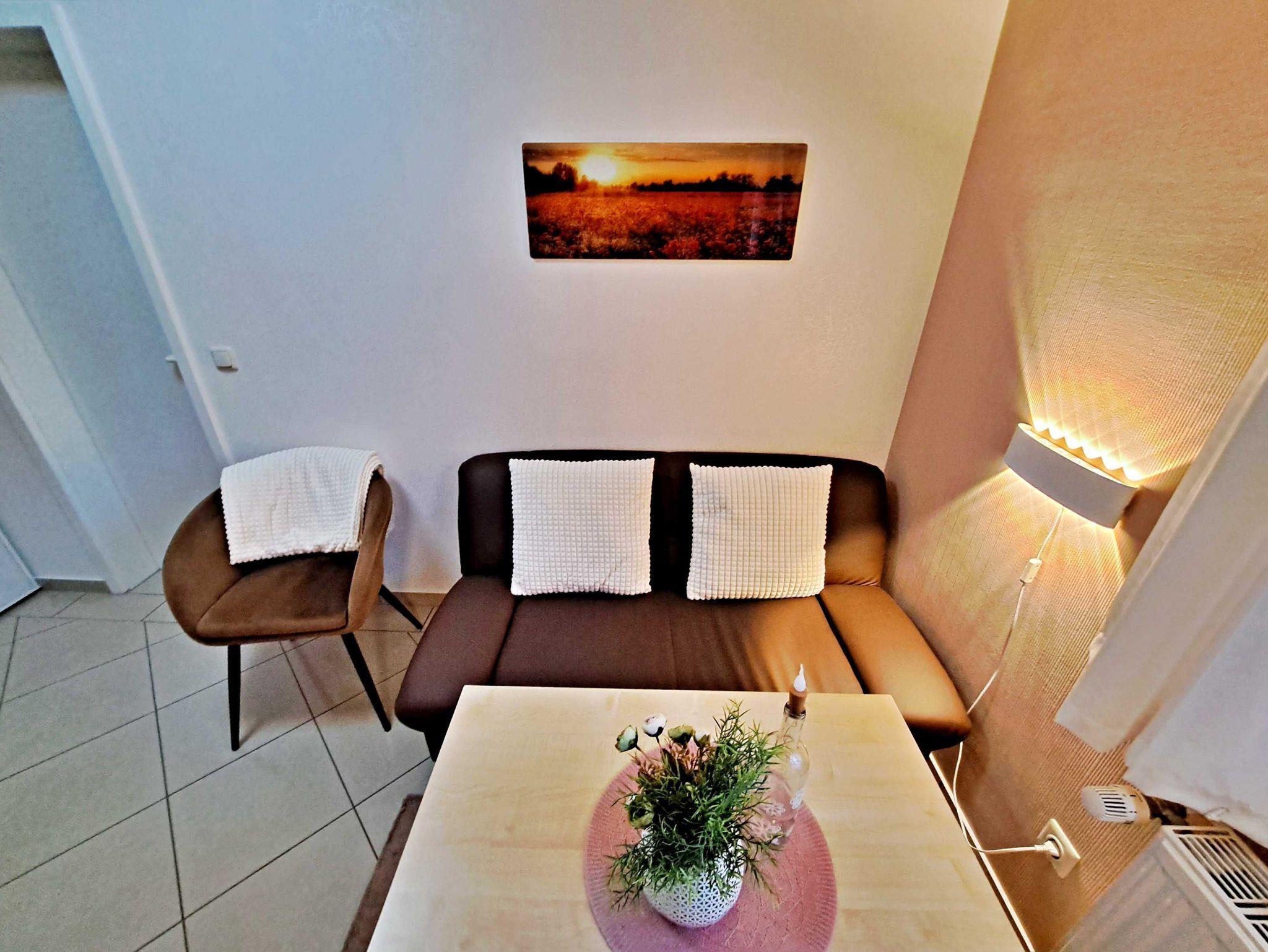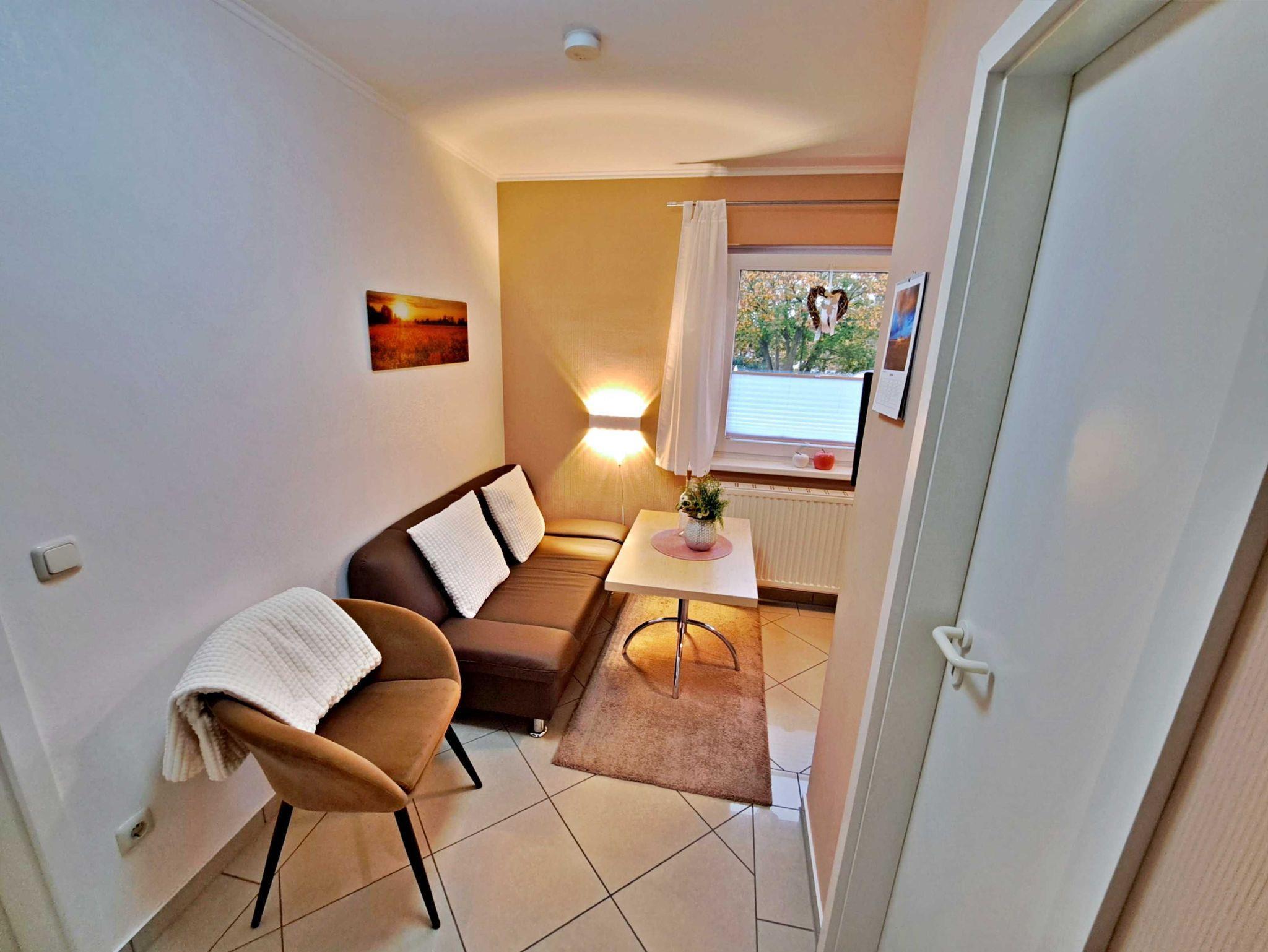 Diese ca. 30 qm große Nichtraucher-Ferienwohnung ist modern und komfortabel eingerichtet. Sie verfügt über einen Wohnbereich mit Couch, Essplatz, Flat-TV sowie einer angrenzenden Pantryküche mit 2-Platten-Herd, Mikrowelle, Kühlschrank mit Gefrierfach, Kaffeemaschine, Wasserkocher und Toaster. Das Schlafzimmer ist mit einem Doppelbett, einem Einzelbett sowie zusätzlichem Flat-TV ausgestattet. Das Badezimmer hat eine Dusche und WC. Eine möblierte Terrasse direkt an der Wohnung komplettiert die gemütliche Ausstattung der Wohnung. Hier können Sie das Frühstück genießen oder den Abend bei einem Glas Wein ausklingen lassen. W-LAN und ein Pkw-Stellplatz direkt am Haus stehen Ihnen kostenfrei zur Verfügung.