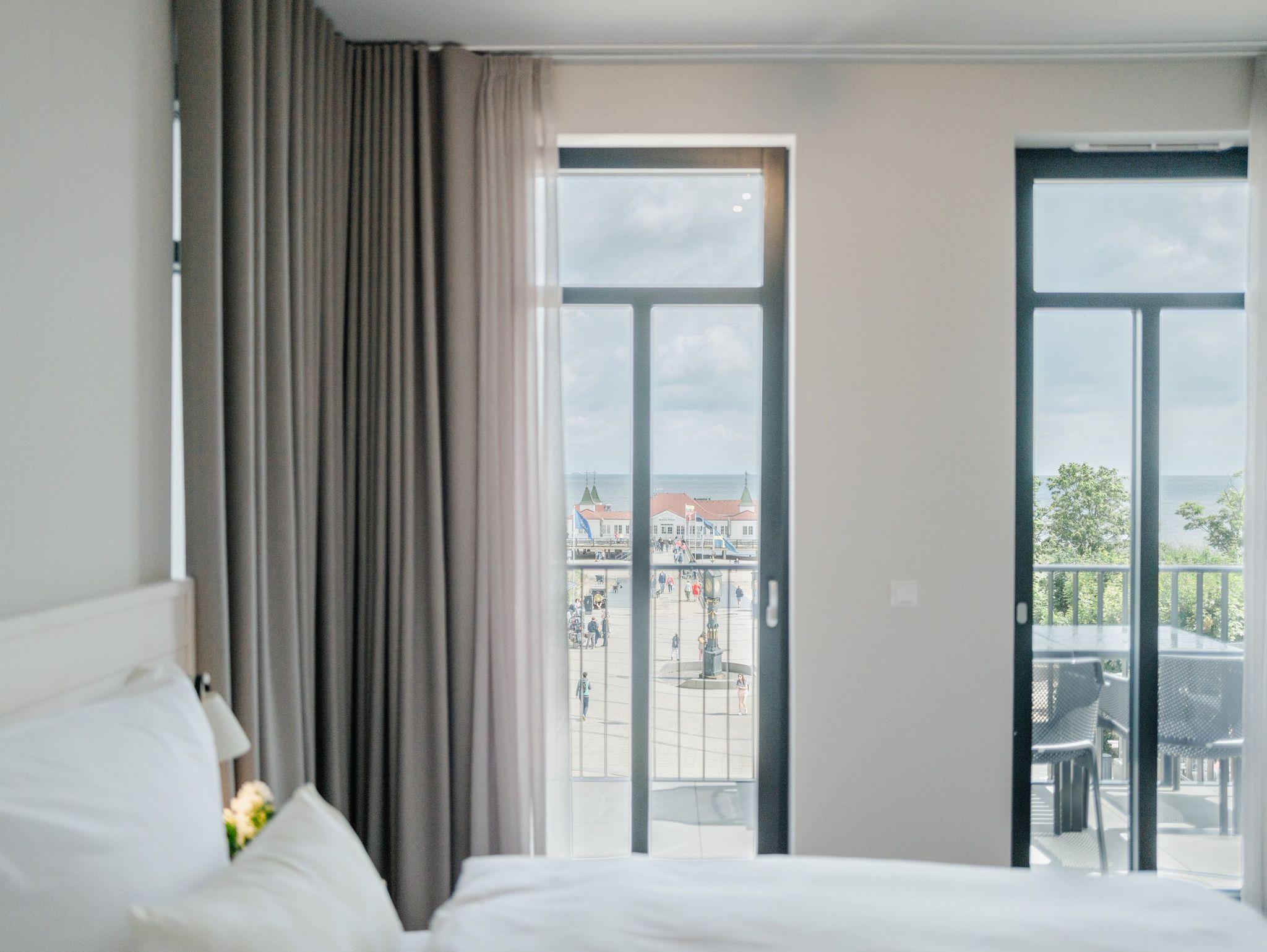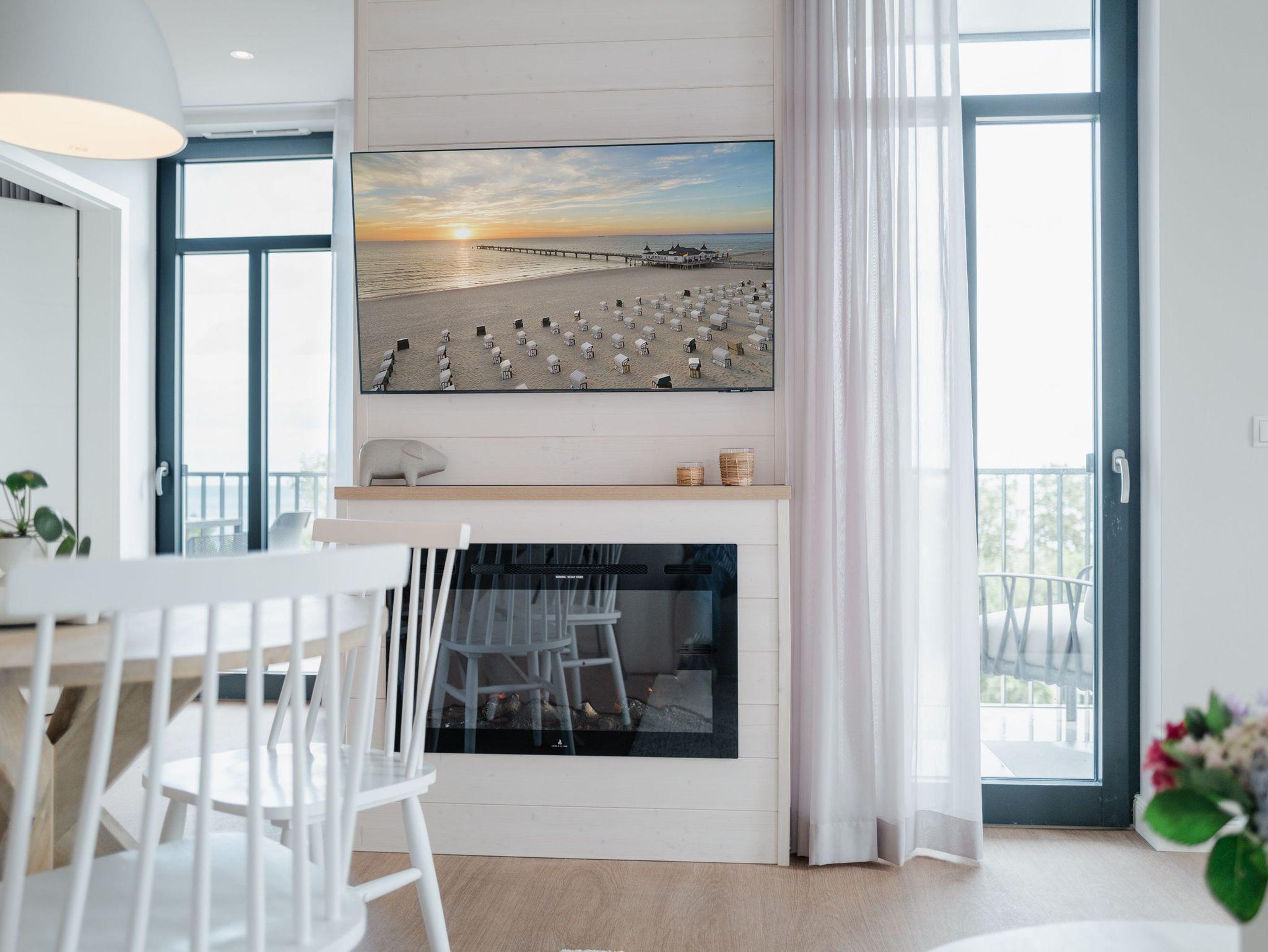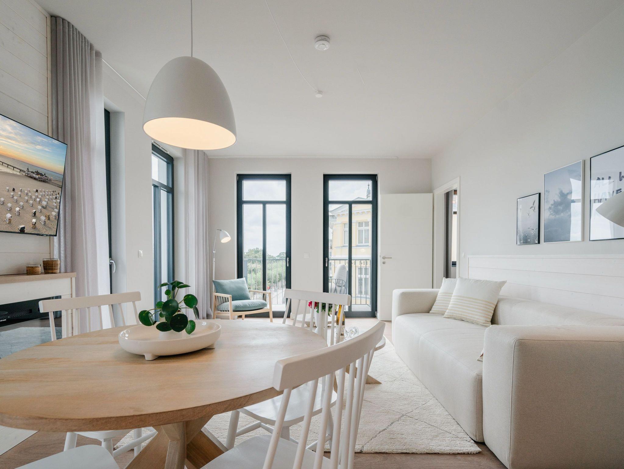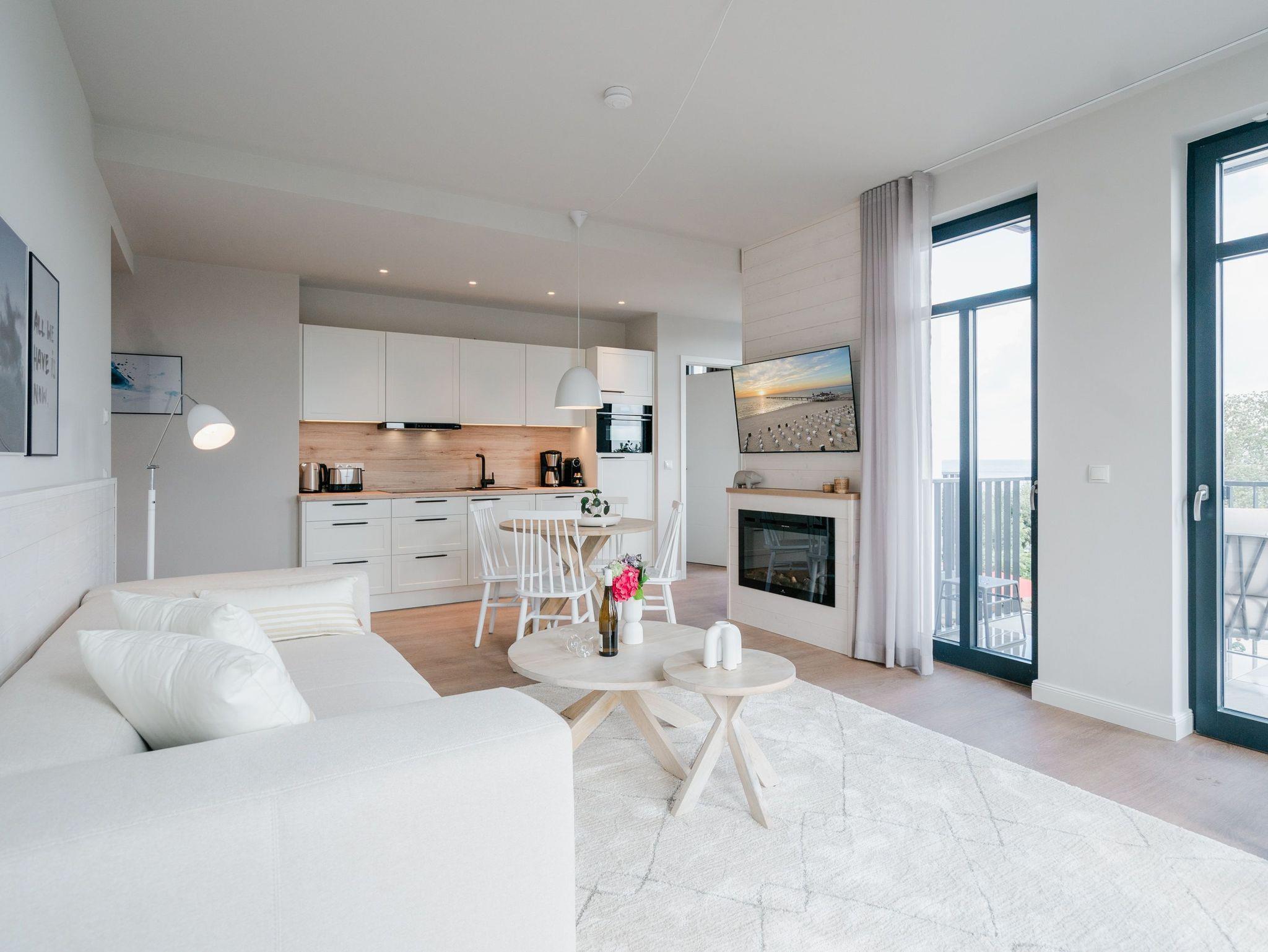 Was für eine Aussicht! Das wird sicher Ihr erster Satz sein, wenn Sie dieses exquisite 3-Raum-Appartement A2.4 im zweiten Obergeschoss betreten. Denn aus dem 72 Quadratmeter großen Feriendomizil für bis zu vier Personen haben Sie einen atemberaubenden Panoramablick auf die Seebrücke und die Ostsee. Atmen Sie die frische Seeluft tief in sich ein. Denn sie ist nicht nur gesund, sondern pustet stressgeplagte Köpfe wunderbar frei. Von gleich drei Balkonen aus können Sie auf das Meer hinaussehen und auch aus dem Wohnzimmer haben Sie die Ostsee immer im Blick. Licht und hell empfängt Sie der großzügige und offene Wohn-Essbereich. Angenehme und wohl temperierten Farbakzente und ein exklusives Designkonzept strahlen eine harmonisierende und entspannende Atmosphäre aus. Auf der bequemen und komfortablen Couch werden Ihre Mußestunden zu wahren Energiespendern. Ein Elektro-Kamin (ohne Wärmeabgabe) schafft sogar an heißen Sommertagen eine wundervolle Stimmung und sorgt an kuscheligen Abenden für Romantik. Unterhaltung bietet der 50-Zoll-Flachbildfernseher. Doch wer braucht den schon, wenn man aus jedem Fenster die Ostsee bestaunen kann. Die drei Balkone mit Nord-Ost- und Süd-Ost-Ausrichtung ermöglichen es Ihnen, das Meer zu jeder Tageszeit zu genießen. Ganz gleich, ob beim Frühstück oder einfach nur beim Sitzen und aufs Meer schauen. Für das Zubereiten der Mahlzeiten steht Ihnen eine mit hochwertigen Siemensgeräten ausgestattete Küchenzeile zur Verfügung. Dazu gehören ein Backofen mit Mikrowelle, eine Geschirrspülmaschine, ein 4-Zonen-Induktionsherd, zwei verschiedene Kaffeemaschinen und einem Kühlschrank mit Gefrierfach. Am Esstisch können Sie viele Genuss- und Gemeinschaftsmomente mit Meerblick genießen. Das Appartement hat zwei Schlafzimmer mit jeweils einem komfortablen Boxspringdoppelbett (1,80m x 2,00m), einem Kleiderschrank sowie einem zusätzlichen 43-Zoll-Flachbildfernseher. Von einem Schlafzimmer aus können Sie sogar auf den großen Hauptbalkon hinaustreten. Doch auch aus dem anderen Schlafzimmer können Sie schon beim Aufwachen aufs Wasser schauen. Jeder Schlafbereich verfügt über ein eigenes Bad mit Dusche, WC und Waschtisch. Zu der Wohnung gehört ein PKW-Stellplatz in der Tiefgarage. Lassen Sie sich von dieser exklusiven Ferienwohnung verzaubern und erleben Sie entspannte Tage direkt an der Ostsee.
