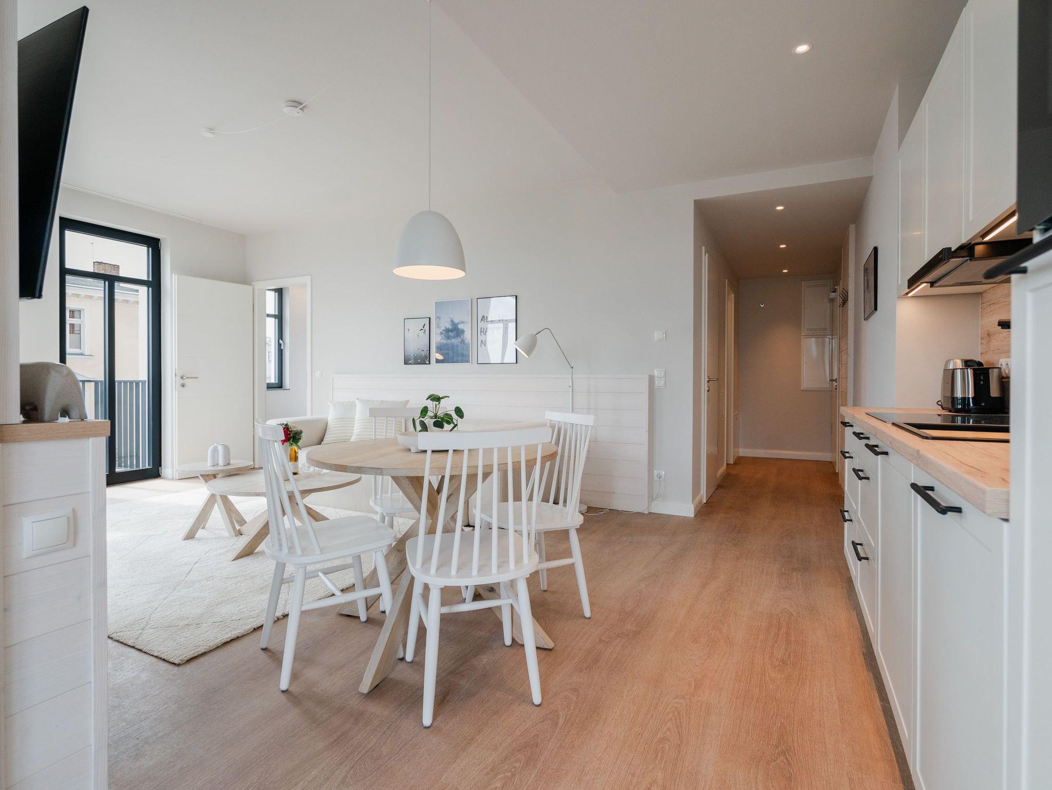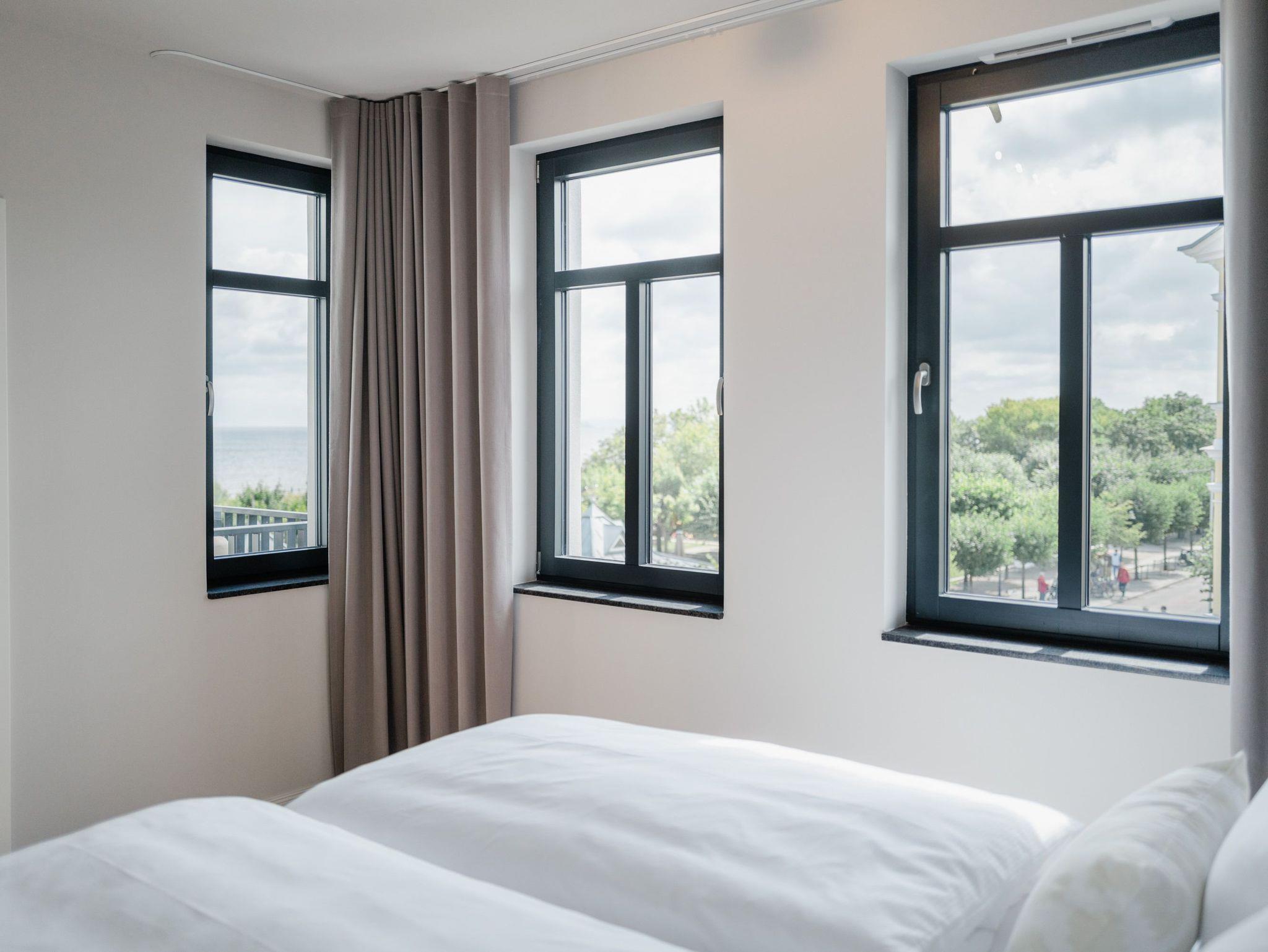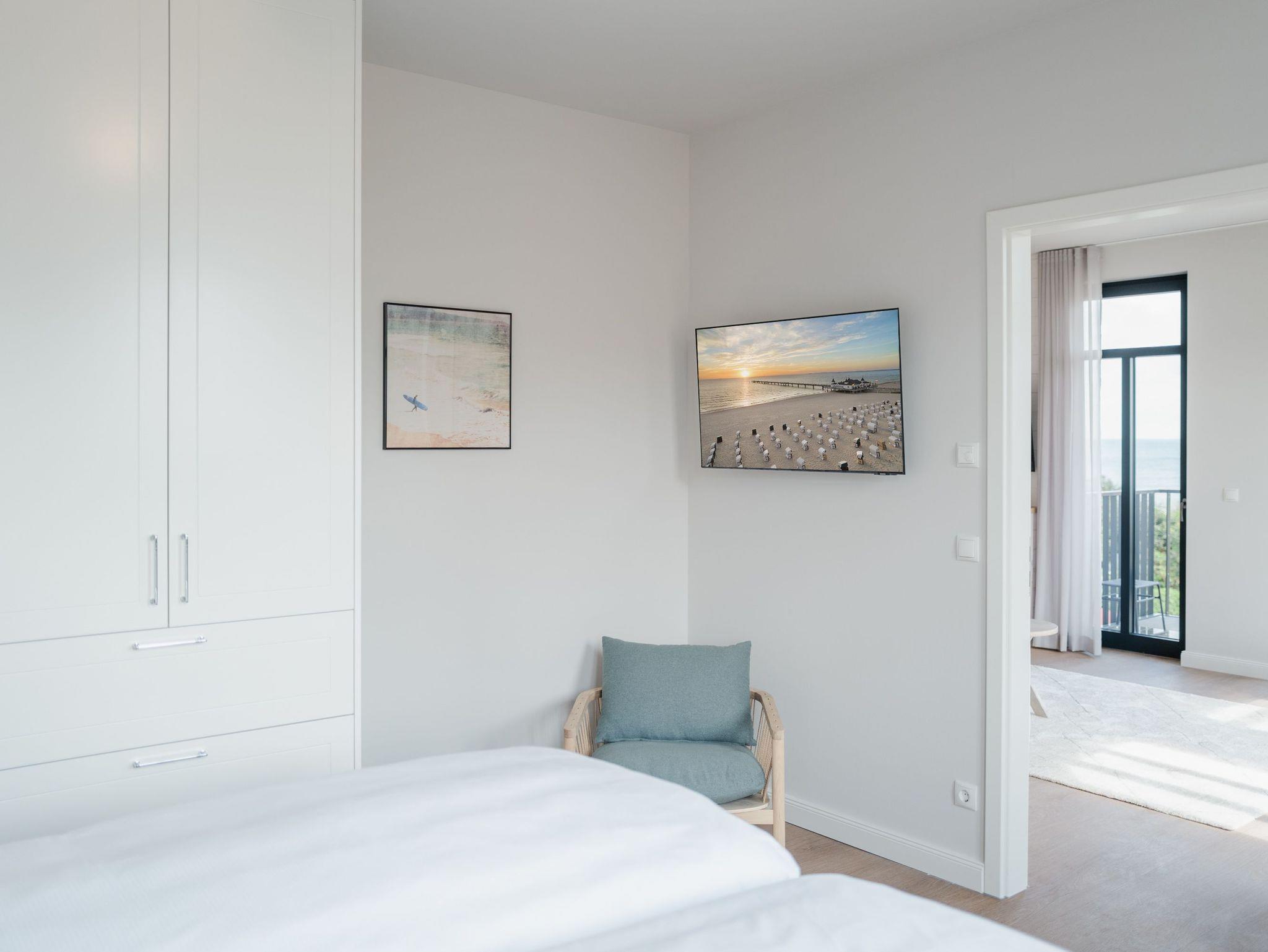 Was für eine Aussicht! Das wird sicher Ihr erster Satz sein, wenn Sie dieses exquisite 3-Raum-Appartement A2.4 im zweiten Obergeschoss betreten. Denn aus dem 72 Quadratmeter großen Feriendomizil für bis zu vier Personen haben Sie einen atemberaubenden Panoramablick auf die Seebrücke und die Ostsee. Atmen Sie die frische Seeluft tief in sich ein. Denn sie ist nicht nur gesund, sondern pustet stressgeplagte Köpfe wunderbar frei. Von gleich drei Balkonen aus können Sie auf das Meer hinaussehen und auch aus dem Wohnzimmer haben Sie die Ostsee immer im Blick. Licht und hell empfängt Sie der großzügige und offene Wohn-Essbereich. Angenehme und wohl temperierten Farbakzente und ein exklusives Designkonzept strahlen eine harmonisierende und entspannende Atmosphäre aus. Auf der bequemen und komfortablen Couch werden Ihre Mußestunden zu wahren Energiespendern. Ein Elektro-Kamin (ohne Wärmeabgabe) schafft sogar an heißen Sommertagen eine wundervolle Stimmung und sorgt an kuscheligen Abenden für Romantik. Unterhaltung bietet der 50-Zoll-Flachbildfernseher. Doch wer braucht den schon, wenn man aus jedem Fenster die Ostsee bestaunen kann. Die drei Balkone mit Nord-Ost- und Süd-Ost-Ausrichtung ermöglichen es Ihnen, das Meer zu jeder Tageszeit zu genießen. Ganz gleich, ob beim Frühstück oder einfach nur beim Sitzen und aufs Meer schauen. Für das Zubereiten der Mahlzeiten steht Ihnen eine mit hochwertigen Siemensgeräten ausgestattete Küchenzeile zur Verfügung. Dazu gehören ein Backofen mit Mikrowelle, eine Geschirrspülmaschine, ein 4-Zonen-Induktionsherd, zwei verschiedene Kaffeemaschinen und einem Kühlschrank mit Gefrierfach. Am Esstisch können Sie viele Genuss- und Gemeinschaftsmomente mit Meerblick genießen. Das Appartement hat zwei Schlafzimmer mit jeweils einem komfortablen Boxspringdoppelbett (1,80m x 2,00m), einem Kleiderschrank sowie einem zusätzlichen 43-Zoll-Flachbildfernseher. Von einem Schlafzimmer aus können Sie sogar auf den großen Hauptbalkon hinaustreten. Doch auch aus dem anderen Schlafzimmer können Sie schon beim Aufwachen aufs Wasser schauen. Jeder Schlafbereich verfügt über ein eigenes Bad mit Dusche, WC und Waschtisch. Zu der Wohnung gehört ein PKW-Stellplatz in der Tiefgarage. Lassen Sie sich von dieser exklusiven Ferienwohnung verzaubern und erleben Sie entspannte Tage direkt an der Ostsee.