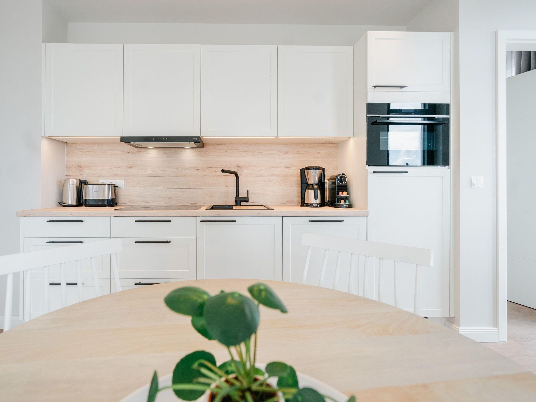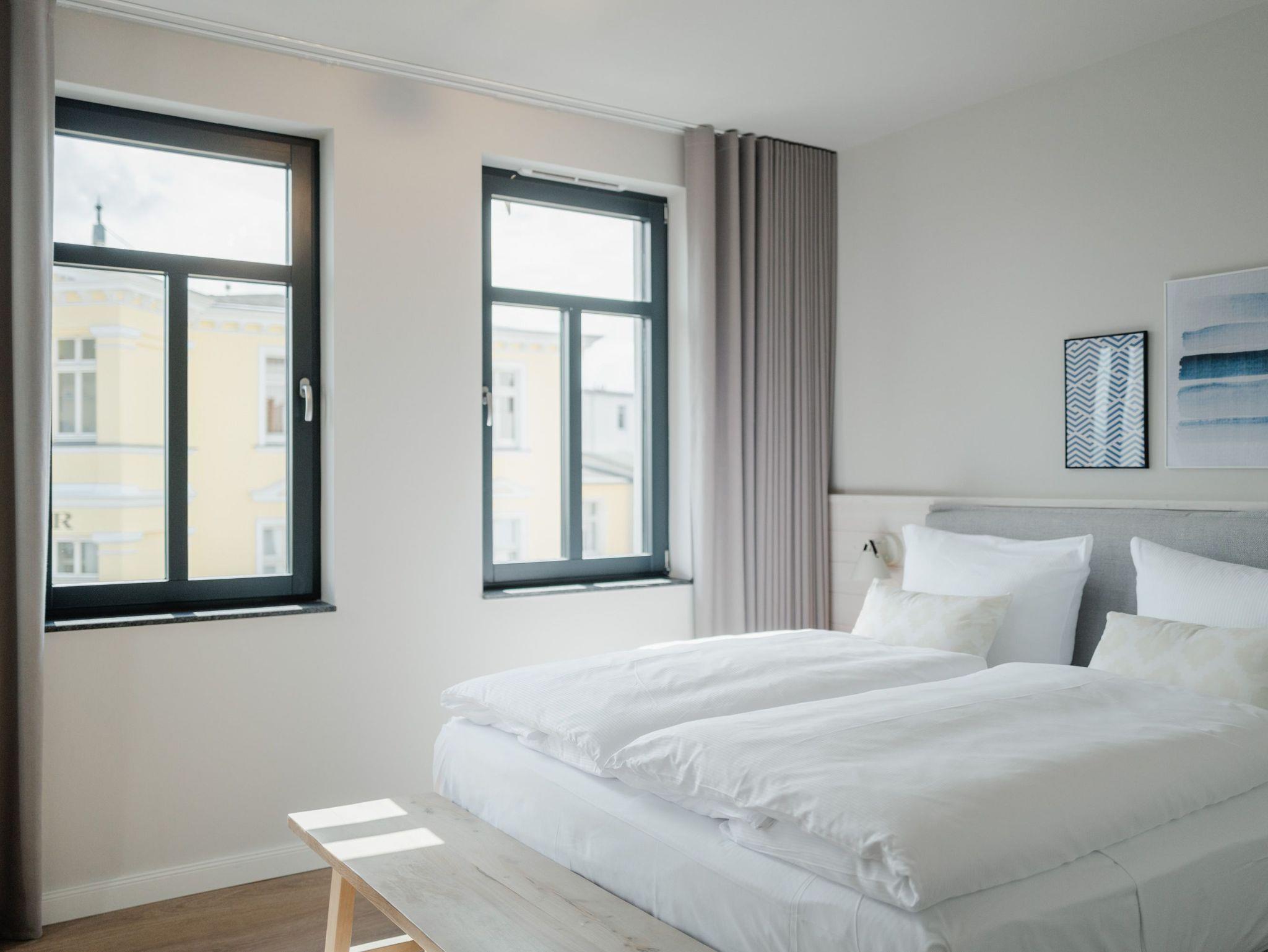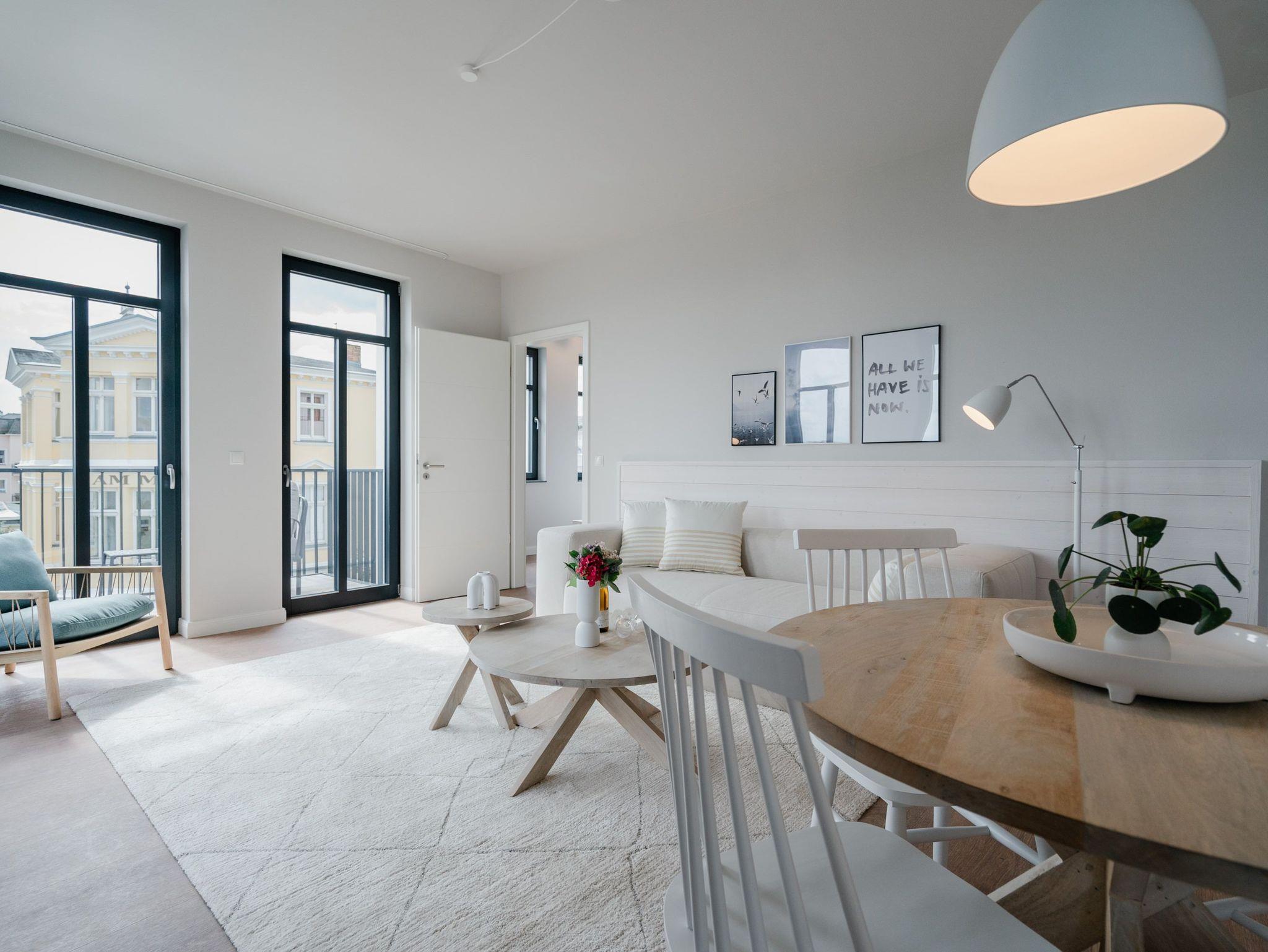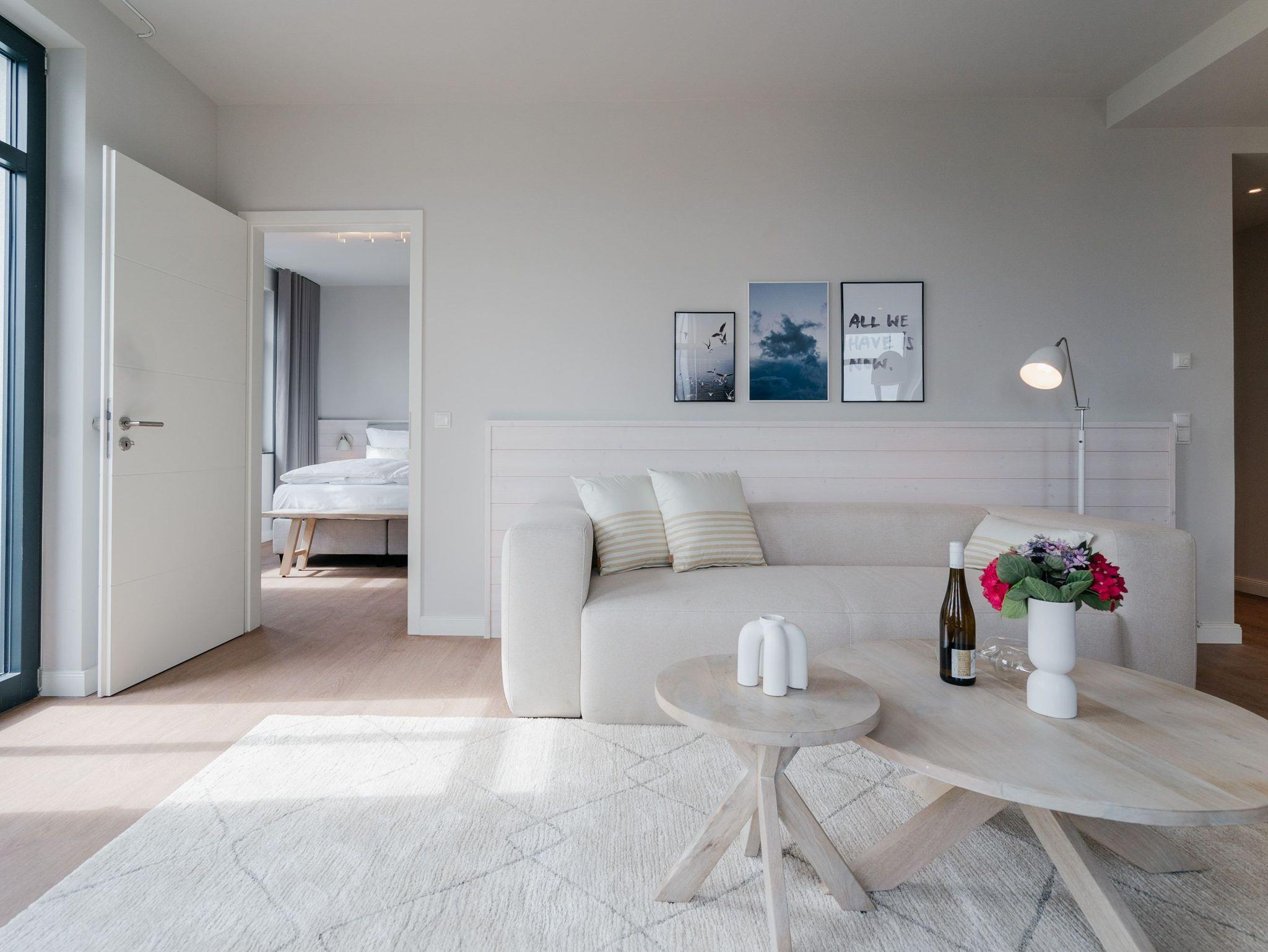 Was für eine Aussicht! Das wird sicher Ihr erster Satz sein, wenn Sie dieses exquisite 3-Raum-Appartement A2.4 im zweiten Obergeschoss betreten. Denn aus dem 72 Quadratmeter großen Feriendomizil für bis zu vier Personen haben Sie einen atemberaubenden Panoramablick auf die Seebrücke und die Ostsee. Atmen Sie die frische Seeluft tief in sich ein. Denn sie ist nicht nur gesund, sondern pustet stressgeplagte Köpfe wunderbar frei. Von gleich drei Balkonen aus können Sie auf das Meer hinaussehen und auch aus dem Wohnzimmer haben Sie die Ostsee immer im Blick. Licht und hell empfängt Sie der großzügige und offene Wohn-Essbereich. Angenehme und wohl temperierten Farbakzente und ein exklusives Designkonzept strahlen eine harmonisierende und entspannende Atmosphäre aus. Auf der bequemen und komfortablen Couch werden Ihre Mußestunden zu wahren Energiespendern. Ein Elektro-Kamin (ohne Wärmeabgabe) schafft sogar an heißen Sommertagen eine wundervolle Stimmung und sorgt an kuscheligen Abenden für Romantik. Unterhaltung bietet der 50-Zoll-Flachbildfernseher. Doch wer braucht den schon, wenn man aus jedem Fenster die Ostsee bestaunen kann. Die drei Balkone mit Nord-Ost- und Süd-Ost-Ausrichtung ermöglichen es Ihnen, das Meer zu jeder Tageszeit zu genießen. Ganz gleich, ob beim Frühstück oder einfach nur beim Sitzen und aufs Meer schauen. Für das Zubereiten der Mahlzeiten steht Ihnen eine mit hochwertigen Siemensgeräten ausgestattete Küchenzeile zur Verfügung. Dazu gehören ein Backofen mit Mikrowelle, eine Geschirrspülmaschine, ein 4-Zonen-Induktionsherd, zwei verschiedene Kaffeemaschinen und einem Kühlschrank mit Gefrierfach. Am Esstisch können Sie viele Genuss- und Gemeinschaftsmomente mit Meerblick genießen. Das Appartement hat zwei Schlafzimmer mit jeweils einem komfortablen Boxspringdoppelbett (1,80m x 2,00m), einem Kleiderschrank sowie einem zusätzlichen 43-Zoll-Flachbildfernseher. Von einem Schlafzimmer aus können Sie sogar auf den großen Hauptbalkon hinaustreten. Doch auch aus dem anderen Schlafzimmer können Sie schon beim Aufwachen aufs Wasser schauen. Jeder Schlafbereich verfügt über ein eigenes Bad mit Dusche, WC und Waschtisch. Zu der Wohnung gehört ein PKW-Stellplatz in der Tiefgarage. Lassen Sie sich von dieser exklusiven Ferienwohnung verzaubern und erleben Sie entspannte Tage direkt an der Ostsee.