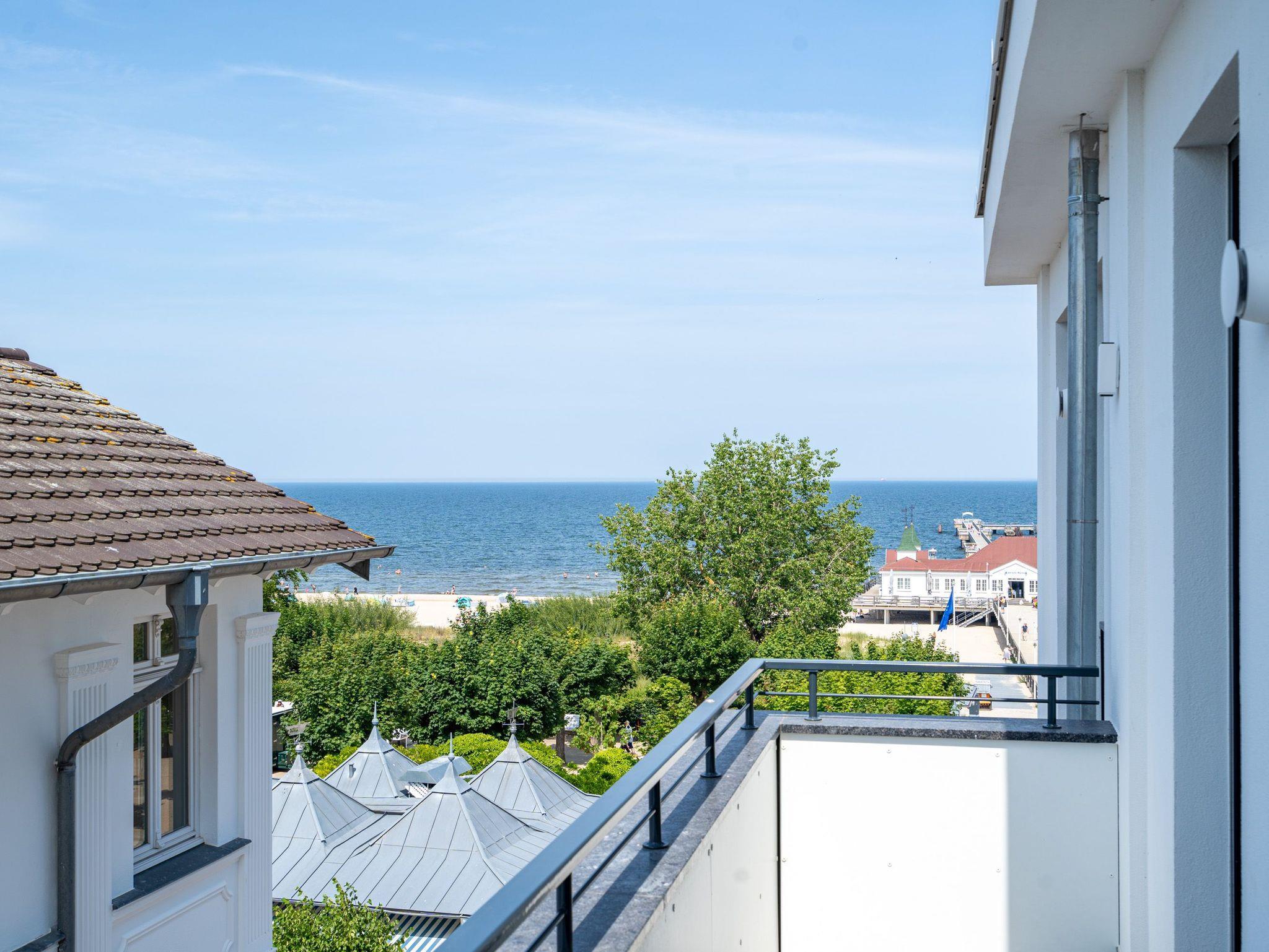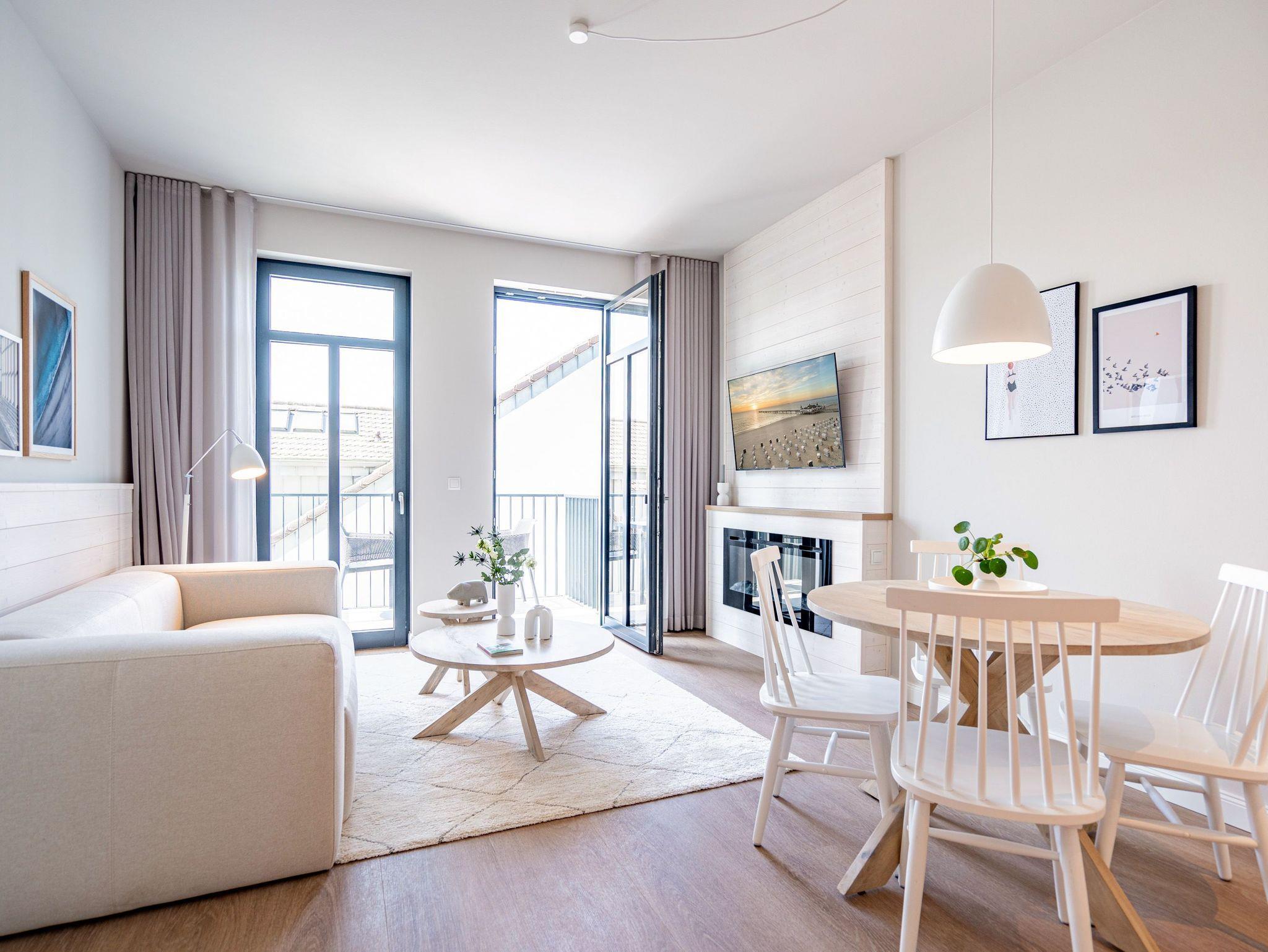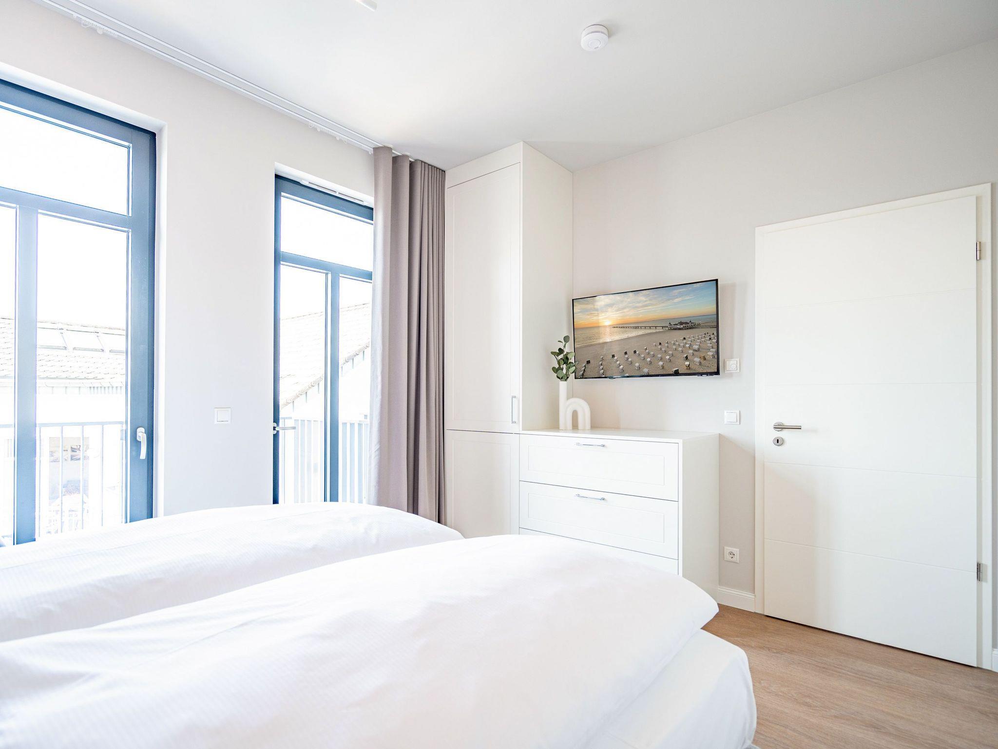 Wohnen wie auf Wolke sieben ? Das Strandterrasse-Appartement A 3.2 im Haus A im 3. Obergeschoss empfängt Sie mit viel Komfort und einer modernen und stylischen Einrichtung. Das 46 Quadratmeter große 2-Raum-Appartement ist Ihr ganz persönliches Wohlfühlreich mit Meerblick und vielen Annehmlichkeiten. Bis zu zwei Personen können es sich in diesem charmanten Domizil in dem geräumigen Wohn-Esszimmer und dem dazugehörigen Schlafzimmer so richtig gemütlich machen. Entspannen Sie auf der hyggeligen Couch vor dem Elektrokamin (ohne Wärmeabgabe). Ein 50-Zoll-Flachbildfernseher sorgt für Kinoatmosphäre. Die offene Küchenzeile ist mit allen nötigen Geräten hochwertig ausgestattet. Dazu gehören ein Induktionsherd, ein Backofen und zwei verschiedene Kaffeemaschinen. Kochen wird hier zu Ihrem Lieblingshobby. Ein schöner Essplatz lädt zu gemeinsamen Mahlzeiten ein. Doch das Highlight der Wohnung sind die beiden Nord-West-Balkone mit einem Tisch und zwei Stühlen und mit einer Sonnenliege, von denen aus Sie seitlich über die Seebrücke Ahlbeck und die dahinter liegende Ostsee schauen können. Genießen Sie die Aussicht und tanken Sie beim Blick über das grenzenlose Blau neue Energie. Weil frische Seeluft müde macht, verspricht das komfortable Boxspringdoppelbett (1,80m x 2,00m) herrliche Träume und einen erholsamen Schlaf. Das Schlafzimmer verfügt zudem über einen geräumigen Kleiderschrank, eine Kommode und einen weiteren 43-Zoll-Flachbildfernseher. Von hier aus haben Sie Zugang auf den zweiten Balkon. So können Sie direkt nach dem Aufwachen die Meeresluft tief einatmen, während Ihre Augen sich an der blauen Weite gar nicht satt sehen können. Zum Appartement gehört ein innenliegendes Bad mit einer Dusche, einem Waschtisch und einer Toilette. In der Tiefgarage ist für Ihr Auto ein PKW-Stellplatz reserviert. Verliebt? Dann kann es ja losgehen mit der Auszeit an der Ahlbecker Promenade. Erleben Sie unvergessliche Tage am Meer.
