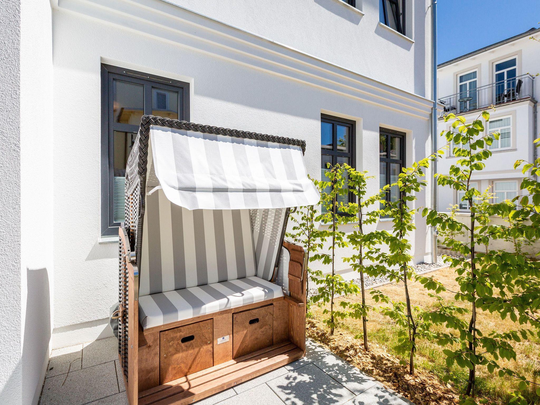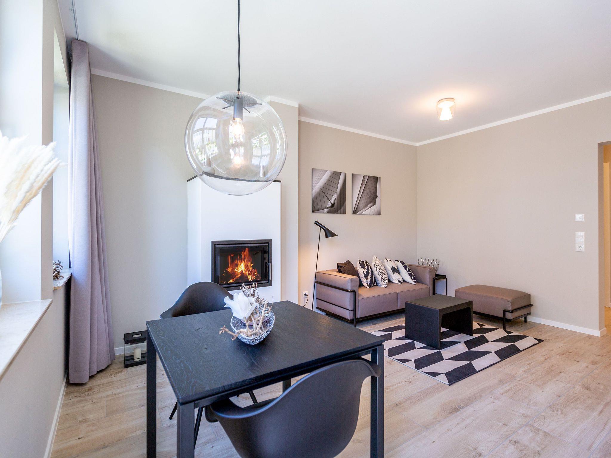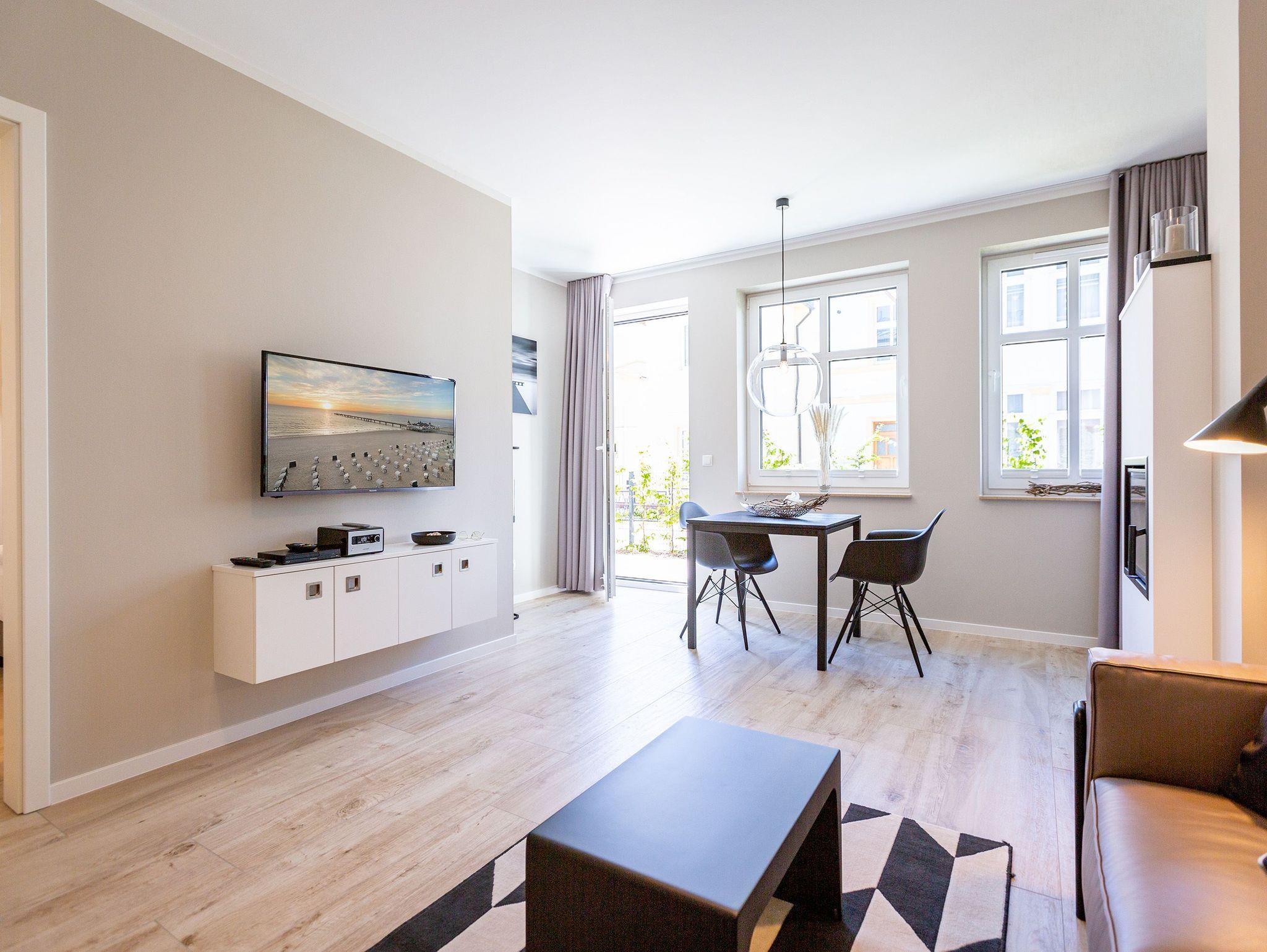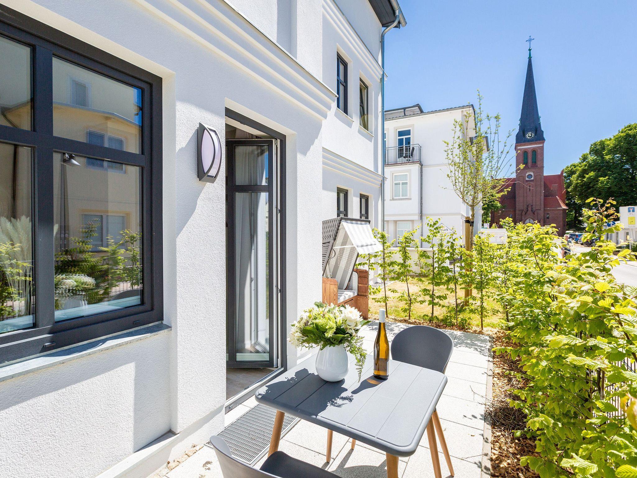 Mit Blick auf die Ahlbecker Kirche können Sie auf der Terrasse dieser wunderschönen Zwei-Zimmer-Wohnung herrlich in der Sonne entspannen. Zu den 9 Quadratmetern mit Strandkorb und Gartenmöbeln kommen in Ihrem kuscheligen Urlaubsdomizil im Inneren noch einmal 45 luftig helle Quadratmeter Wohnraum hinzu. Für bis zu zwei Personen und ein Kleinkind (im Kinderreisebett) ist hier, im Erdgeschoss des Quartiers Frohsinn, Platz. Ihren geliebten Vierbeiner dürfen Sie gerne mitbringen. Das Wohnzimmer besticht durch stylische Eleganz kombiniert mit viel Liebe zum Detail. Ausgesuchte Designmöbel wie die Cassina-Couch oder die Vitra-Stühle am Esstisch verleihen dem Appartement ein gehobenes und edles Flair. Hier heißt es: Ankommen und wohlfühlen. Ein Kamin sorgt für viel Gemütlichkeit. Jedes Zimmer ist mit einem Flat-TV ausgestattet. Der Fernseher im Wohnzimmer besitzt zudem einen Blue-Ray-Player. Das WLAN für das Entertainment ist kostenfrei nutzbar. Die ans Wohnzimmer angrenzende Küche ist mit allem Nötigen ausgestattet. Sie hat einen Induktionsherd, einen Geschirrspüler, eine Mikrowelle, einen Wasserkocher, Toaster und eine Senseo Kaffeemaschine. Töpfe, Pfannen und Geschirr befinden sich in den Schränken. Das gemütliche Schlafzimmer lädt zum Kuscheln im komfortablen Boxspringdoppelbett ein. Ein großer Einbaukleiderschrank bietet viel Stauraum. Das Bad mit Dusche und WC ist innenliegend. Bei Anreise liegen Handtücher bereit und auch das Bett ist bezogen. Es gibt einen Stellplatz in der Tiefgarage für das Appartement und im Keller befindet sich ein separater Fahrradraum.