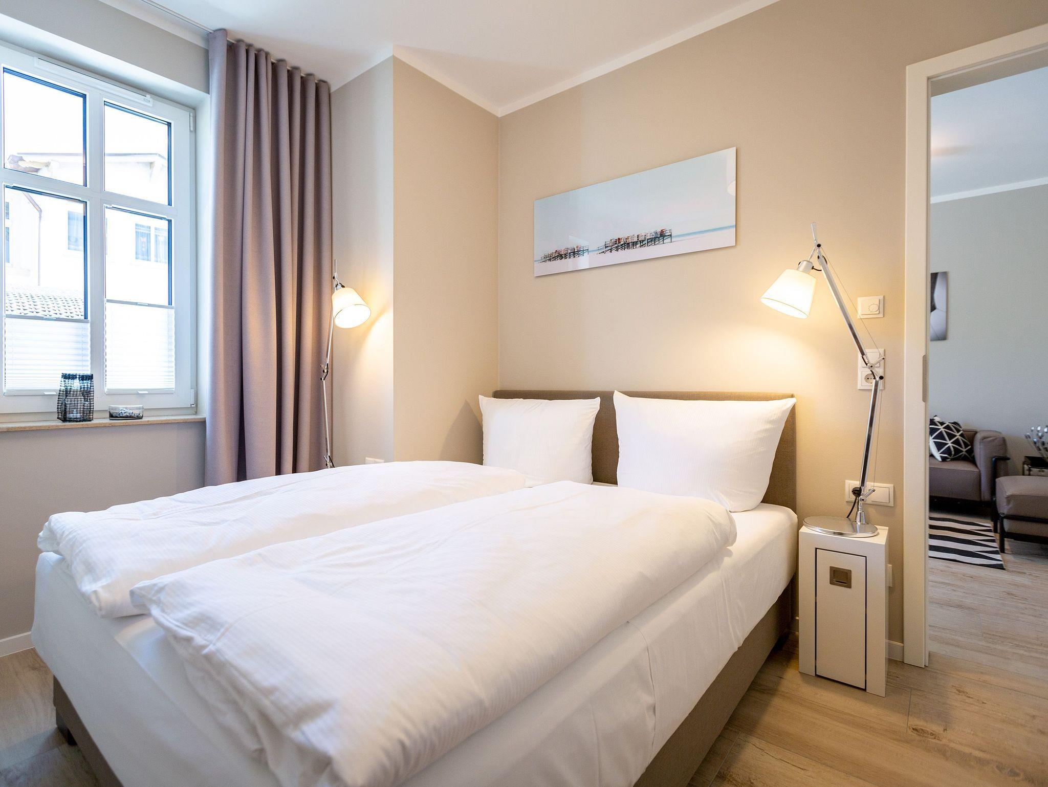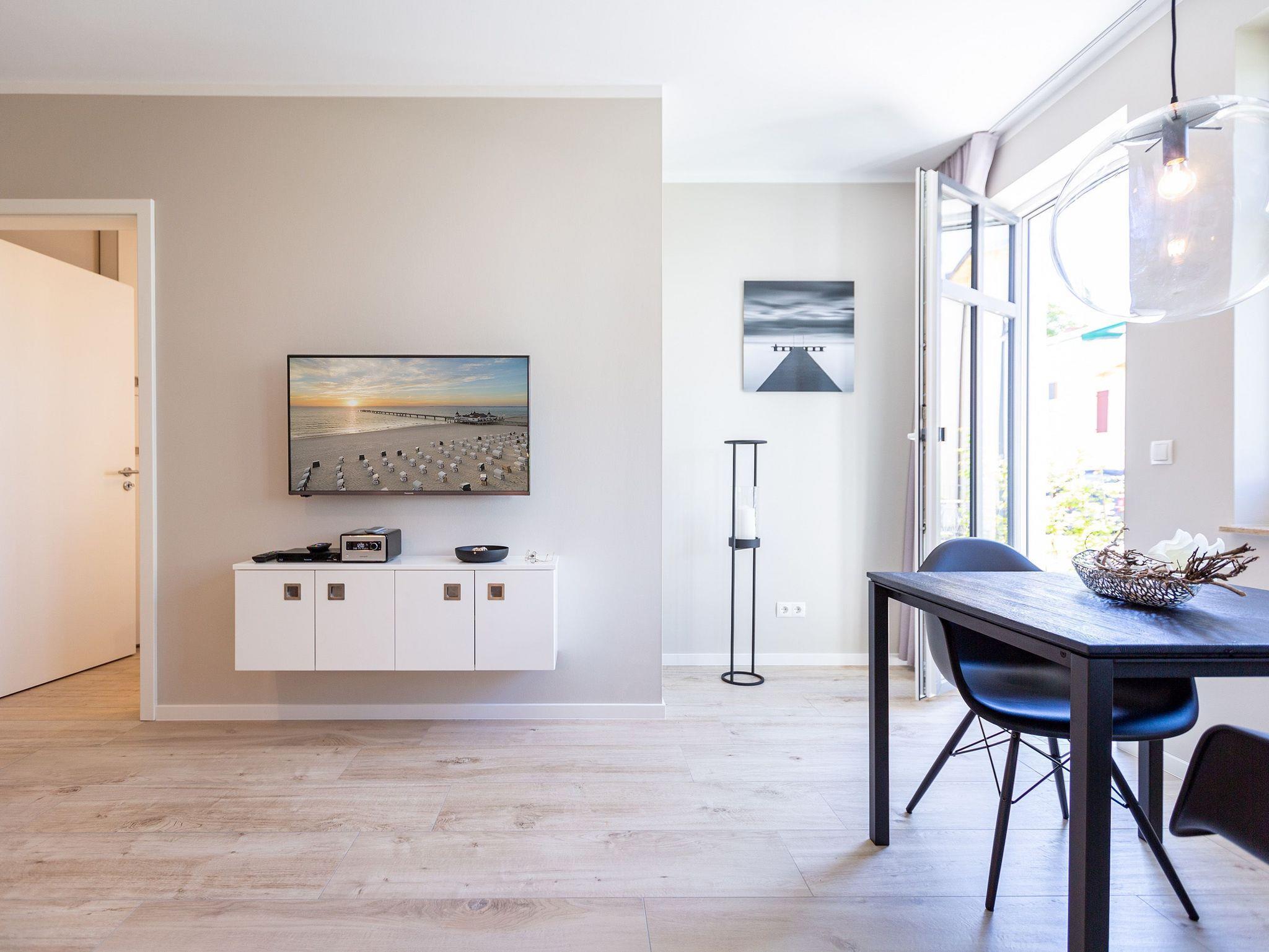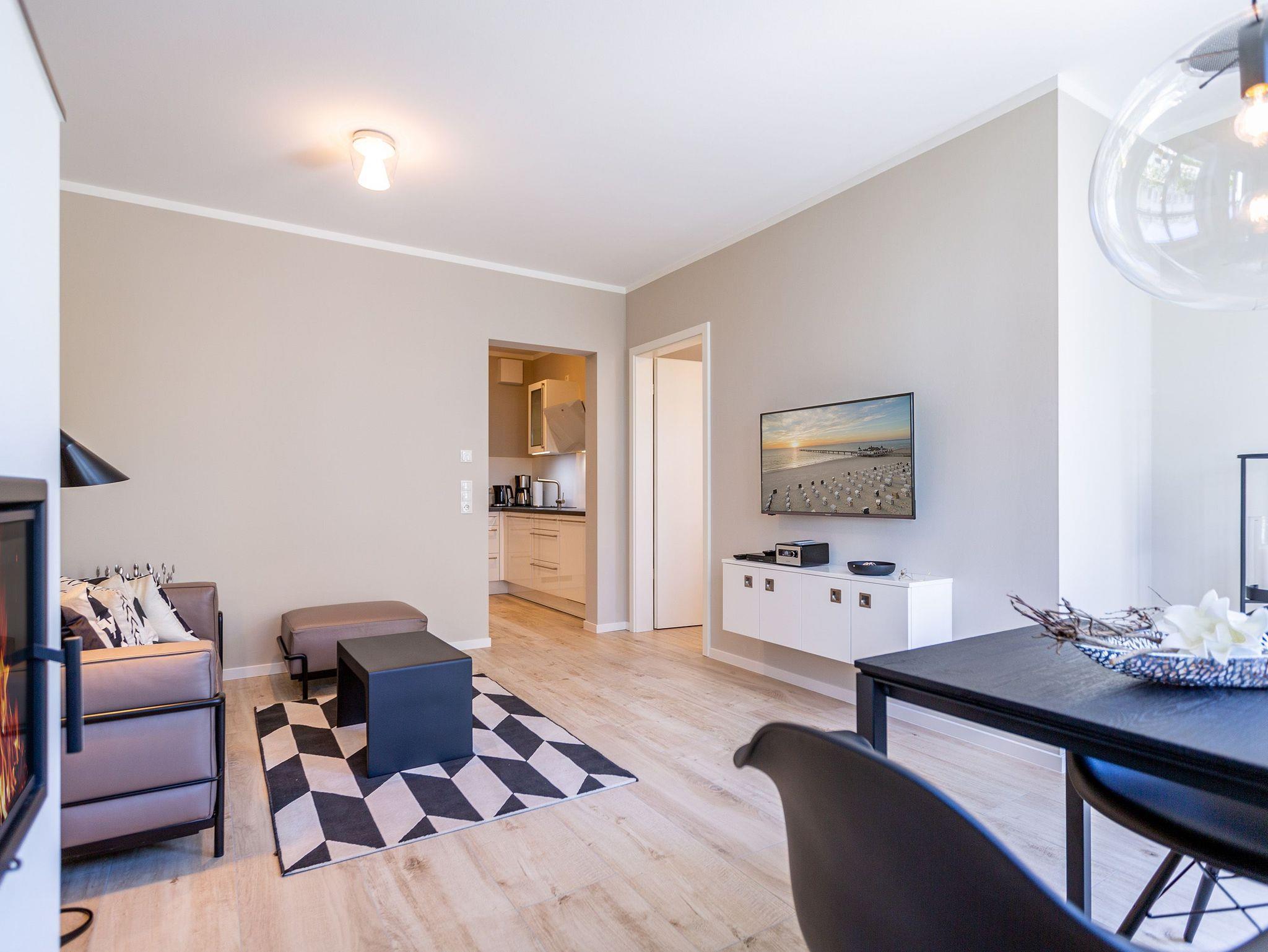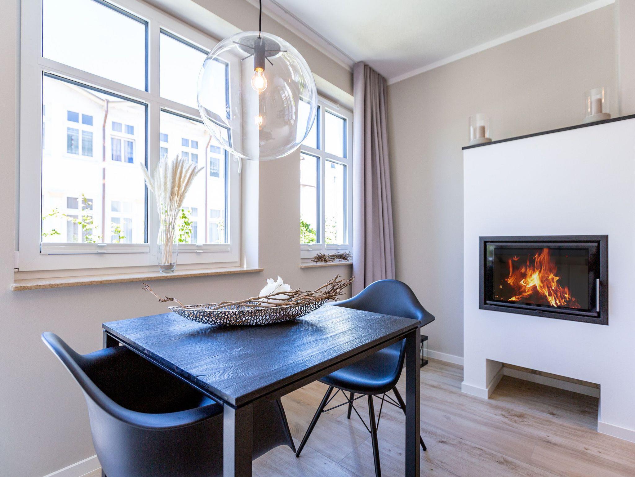 Mit Blick auf die Ahlbecker Kirche können Sie auf der Terrasse dieser wunderschönen Zwei-Zimmer-Wohnung herrlich in der Sonne entspannen. Zu den 9 Quadratmetern mit Strandkorb und Gartenmöbeln kommen in Ihrem kuscheligen Urlaubsdomizil im Inneren noch einmal 45 luftig helle Quadratmeter Wohnraum hinzu. Für bis zu zwei Personen und ein Kleinkind (im Kinderreisebett) ist hier, im Erdgeschoss des Quartiers Frohsinn, Platz. Ihren geliebten Vierbeiner dürfen Sie gerne mitbringen. Das Wohnzimmer besticht durch stylische Eleganz kombiniert mit viel Liebe zum Detail. Ausgesuchte Designmöbel wie die Cassina-Couch oder die Vitra-Stühle am Esstisch verleihen dem Appartement ein gehobenes und edles Flair. Hier heißt es: Ankommen und wohlfühlen. Ein Kamin sorgt für viel Gemütlichkeit. Jedes Zimmer ist mit einem Flat-TV ausgestattet. Der Fernseher im Wohnzimmer besitzt zudem einen Blue-Ray-Player. Das WLAN für das Entertainment ist kostenfrei nutzbar. Die ans Wohnzimmer angrenzende Küche ist mit allem Nötigen ausgestattet. Sie hat einen Induktionsherd, einen Geschirrspüler, eine Mikrowelle, einen Wasserkocher, Toaster und eine Senseo Kaffeemaschine. Töpfe, Pfannen und Geschirr befinden sich in den Schränken. Das gemütliche Schlafzimmer lädt zum Kuscheln im komfortablen Boxspringdoppelbett ein. Ein großer Einbaukleiderschrank bietet viel Stauraum. Das Bad mit Dusche und WC ist innenliegend. Bei Anreise liegen Handtücher bereit und auch das Bett ist bezogen. Es gibt einen Stellplatz in der Tiefgarage für das Appartement und im Keller befindet sich ein separater Fahrradraum.