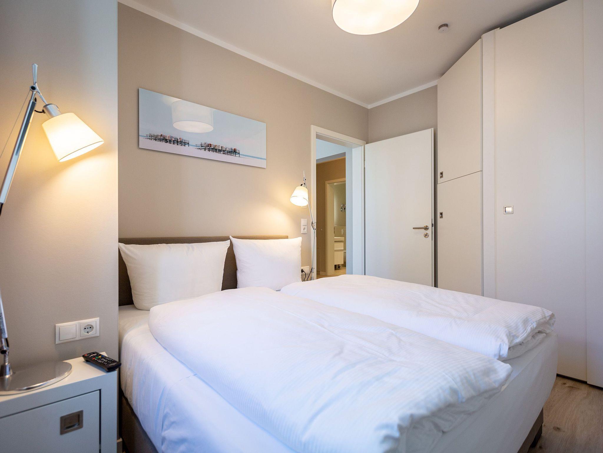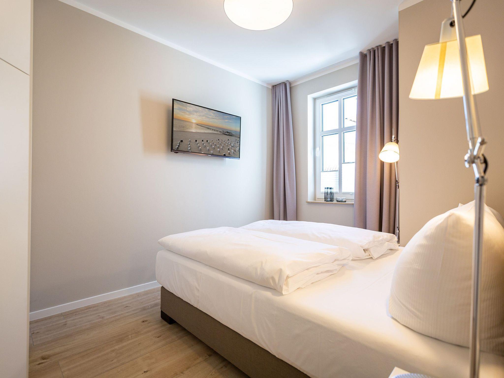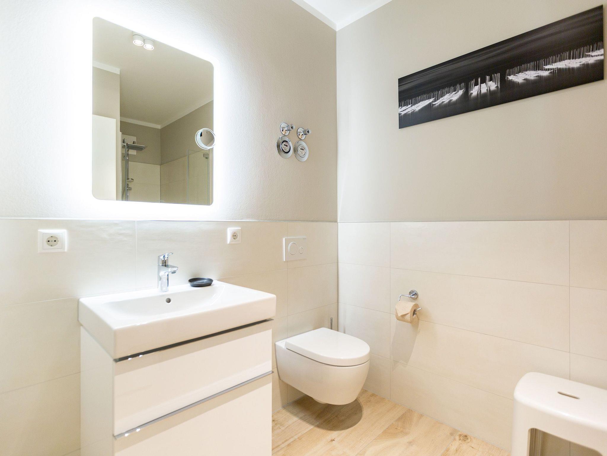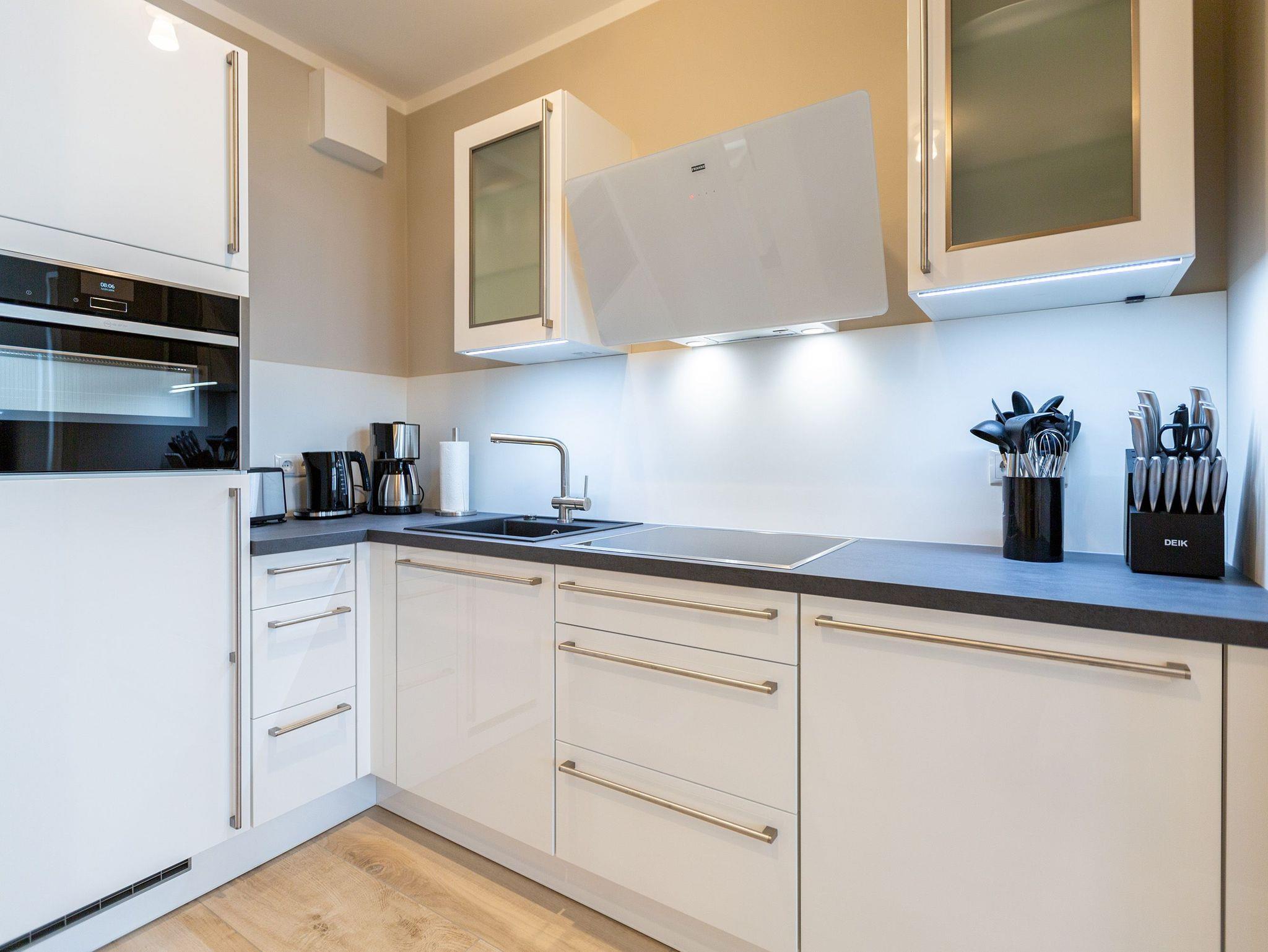 Mit Blick auf die Ahlbecker Kirche können Sie auf der Terrasse dieser wunderschönen Zwei-Zimmer-Wohnung herrlich in der Sonne entspannen. Zu den 9 Quadratmetern mit Strandkorb und Gartenmöbeln kommen in Ihrem kuscheligen Urlaubsdomizil im Inneren noch einmal 45 luftig helle Quadratmeter Wohnraum hinzu. Für bis zu zwei Personen und ein Kleinkind (im Kinderreisebett) ist hier, im Erdgeschoss des Quartiers Frohsinn, Platz. Ihren geliebten Vierbeiner dürfen Sie gerne mitbringen. Das Wohnzimmer besticht durch stylische Eleganz kombiniert mit viel Liebe zum Detail. Ausgesuchte Designmöbel wie die Cassina-Couch oder die Vitra-Stühle am Esstisch verleihen dem Appartement ein gehobenes und edles Flair. Hier heißt es: Ankommen und wohlfühlen. Ein Kamin sorgt für viel Gemütlichkeit. Jedes Zimmer ist mit einem Flat-TV ausgestattet. Der Fernseher im Wohnzimmer besitzt zudem einen Blue-Ray-Player. Das WLAN für das Entertainment ist kostenfrei nutzbar. Die ans Wohnzimmer angrenzende Küche ist mit allem Nötigen ausgestattet. Sie hat einen Induktionsherd, einen Geschirrspüler, eine Mikrowelle, einen Wasserkocher, Toaster und eine Senseo Kaffeemaschine. Töpfe, Pfannen und Geschirr befinden sich in den Schränken. Das gemütliche Schlafzimmer lädt zum Kuscheln im komfortablen Boxspringdoppelbett ein. Ein großer Einbaukleiderschrank bietet viel Stauraum. Das Bad mit Dusche und WC ist innenliegend. Bei Anreise liegen Handtücher bereit und auch das Bett ist bezogen. Es gibt einen Stellplatz in der Tiefgarage für das Appartement und im Keller befindet sich ein separater Fahrradraum.