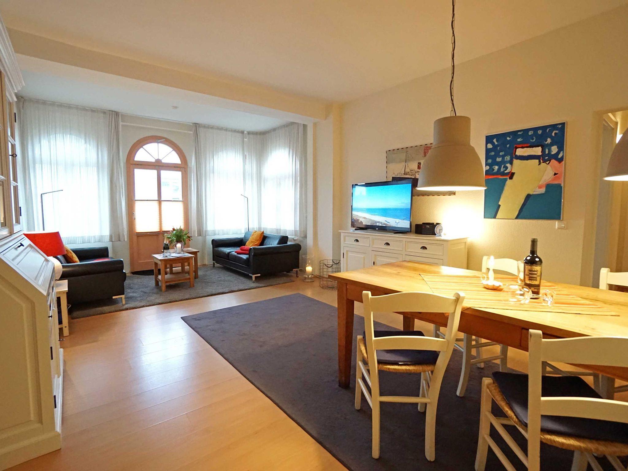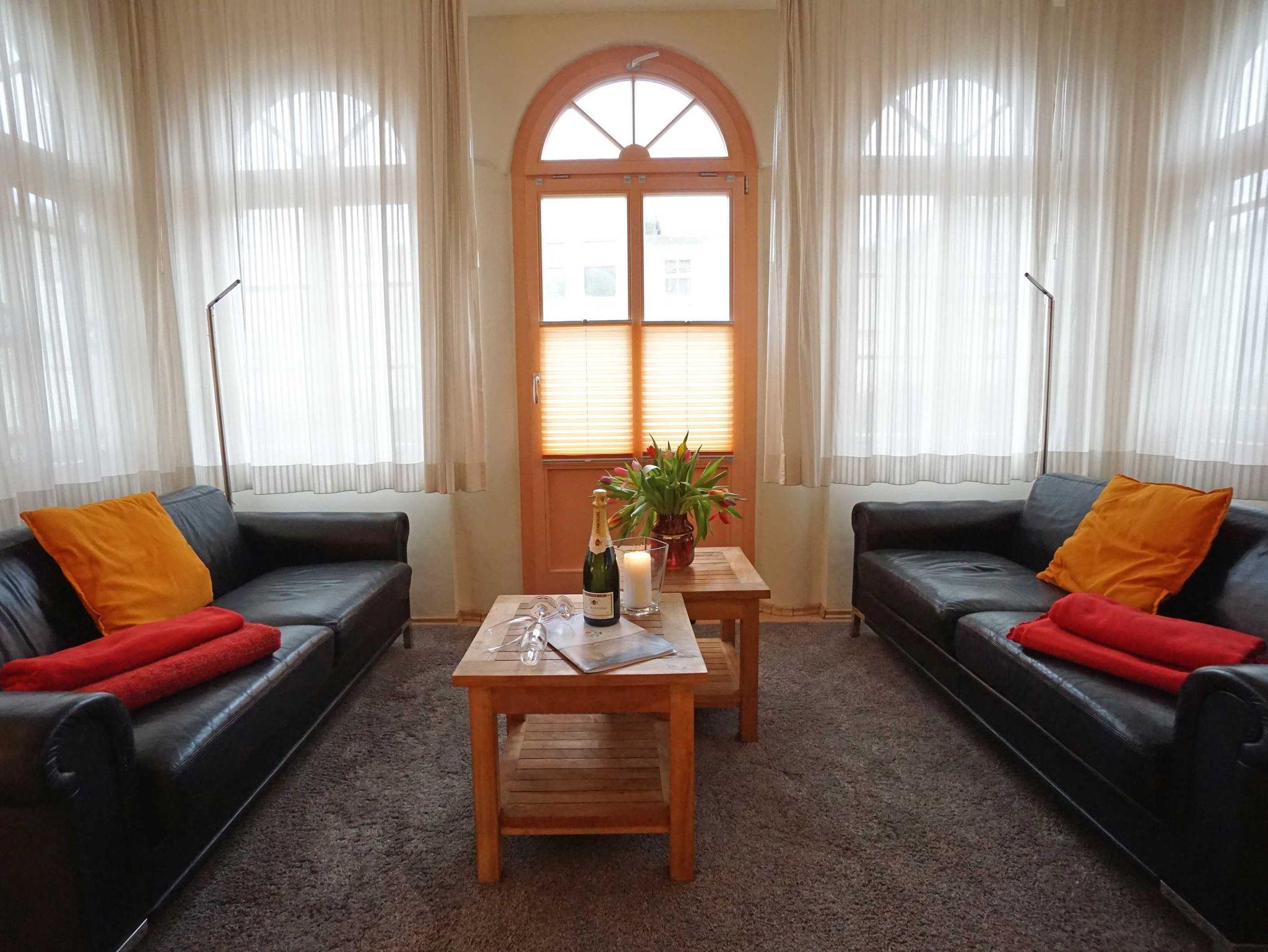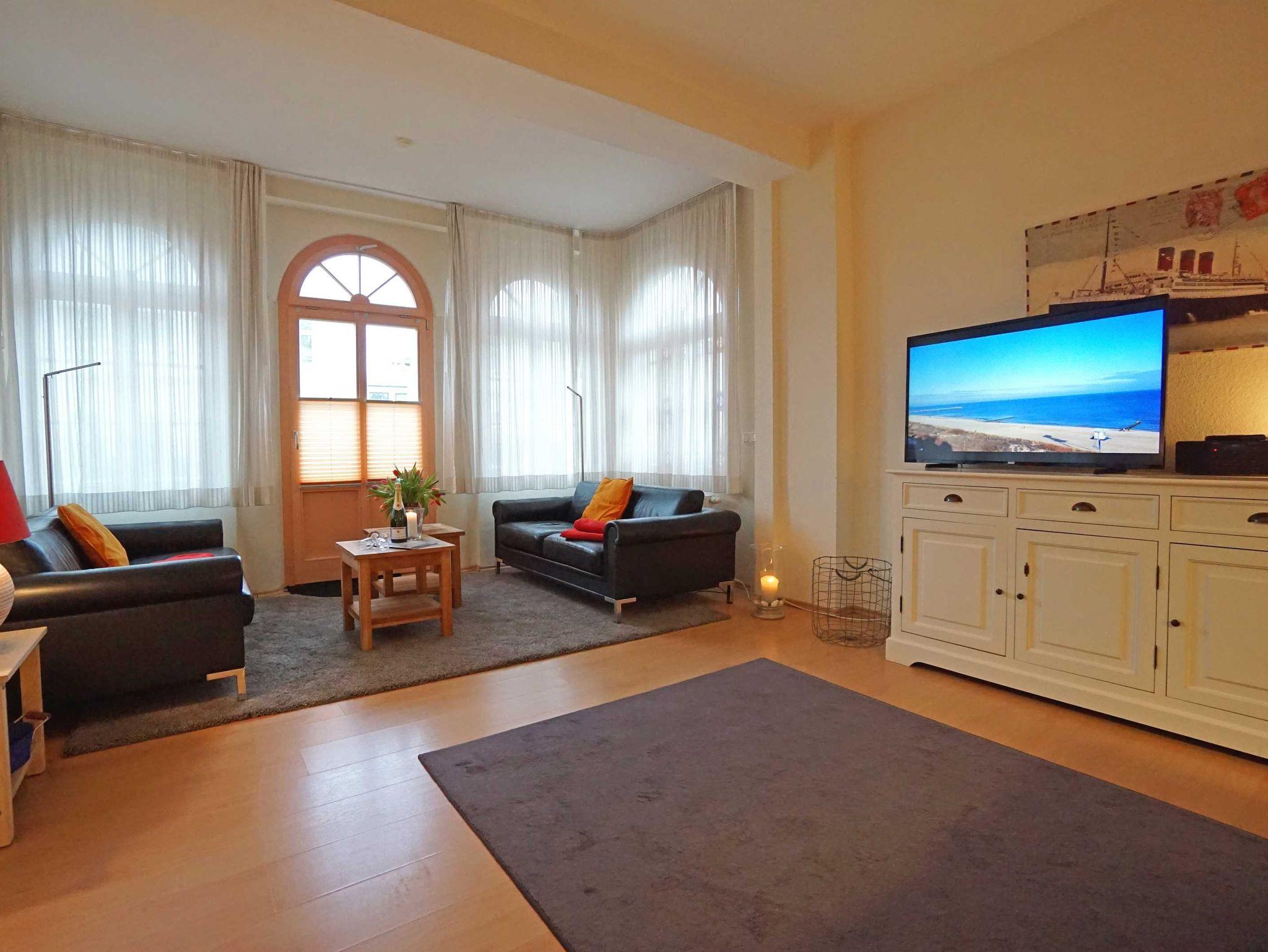 In unmittelbarer Nähe zur Ahlbecker Seebrücke, in zentraler Lage, befindet sich die restaurierte Bädervilla Bellevue. Die großzügige, modern eingerichtete 3-Zimmer Nichtraucherwohnung (59m²) mit zwei getrennten Schlafräumen (Doppelbetten/ 1,60m breit) sowie separater, voll ausgestatteter Küche und großzügigem Wohnzimmer (Couchgarnitur, Flachbildfernseher, großer Esstisch) liegt im Erdgeschoss und verfügt über eine geräumige, möblierte Terrasse. Die Wohnung ist für bis zu 4 Personen ausgerichtet.