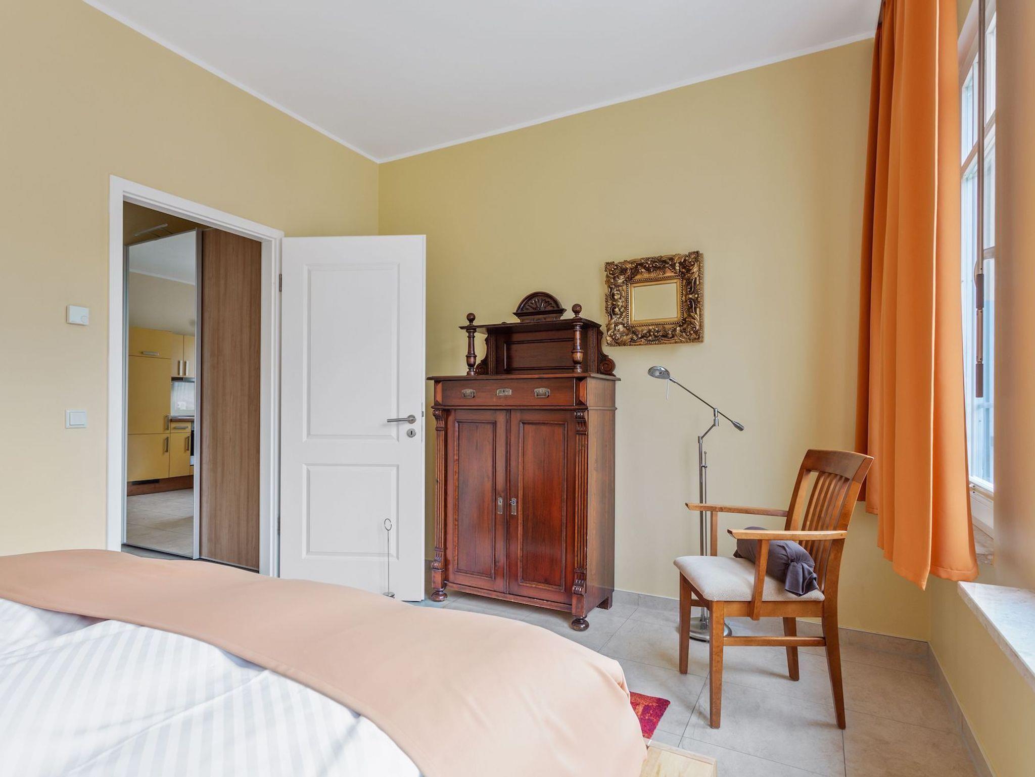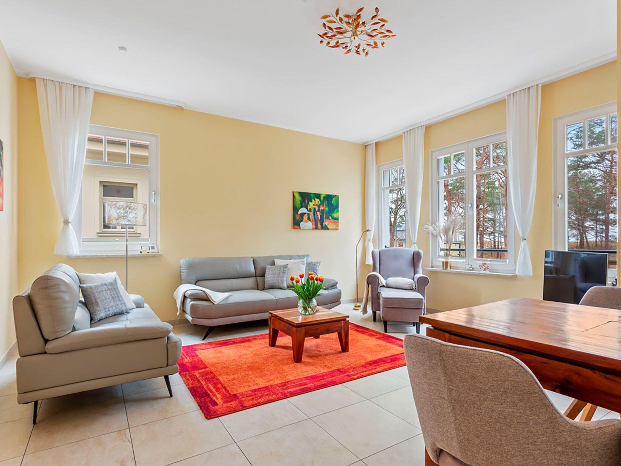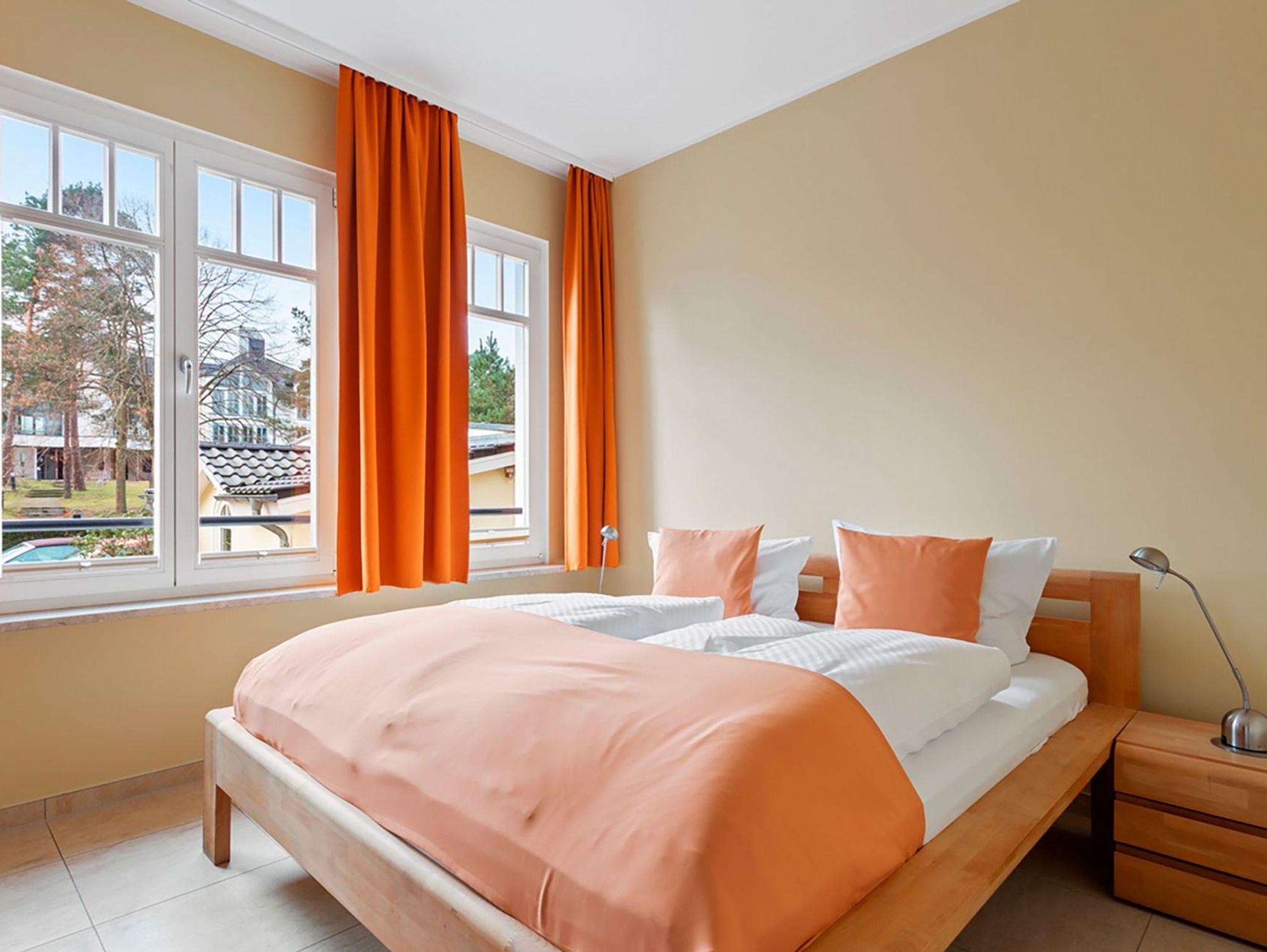 Das 58 m² große 2-Raum-Appartement ?Bernstein? liegt im gemütlichen Hochparterre und ist ideal für 2 Personen. Warme Farben, eine elegante Ledersitzgruppe, bequeme Essstühle, ein Lesesessel und ein moderner UHD-LED-TV sorgen für ein behagliches Ambiente. Direkt vor der Tür erwartet Sie Ihr eigener Außensitzplatz ? perfekt für entspannte Stunden an der frischen Ostseeluft. Schon beim Eintreten, mit einem Blick nach rechts, können Sie trotz der grünen Düne die Ostsee sehen. Das nach Süden ausgerichtete Schlafzimmer ist mit außenliegenden, wärmereflektierenden Sonnenschutzrollos ausgestattet. Da sich darunter der Wellnessbereich des Hauses befindet, schlafen Sie angenehm erhöht ? wie im ersten Stock. Das komfortable Doppelbett (2,00 m x 1,80 m) wird ergänzt durch ein stilvolles Gründerzeit-Vertigo und bietet zudem Platz für ein Kinderreisebett. Ein 2 m breiter Kleiderschrank befindet sich platzsparend in einer Nische im Flur, direkt gegenüber vom Badezimmer. Das Bad ist mit Dusche, Waschtisch, WC, großzügigem Fenster und praktischen Ablagen ausgestattet. Die separate Küche ist vollständig für 2?3 Personen eingerichtet und bietet alles, was Sie für Ihren Aufenthalt benötigen. Ein PKW-Stellplatz direkt am Haus rundet das Angebot ab.