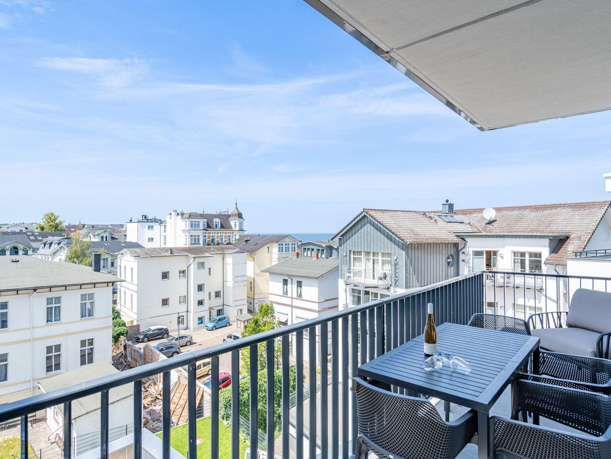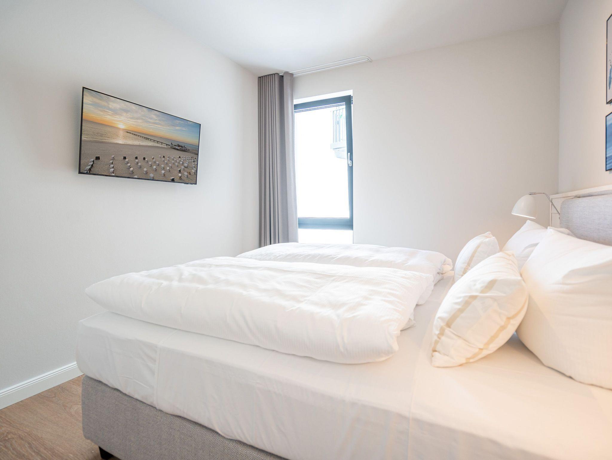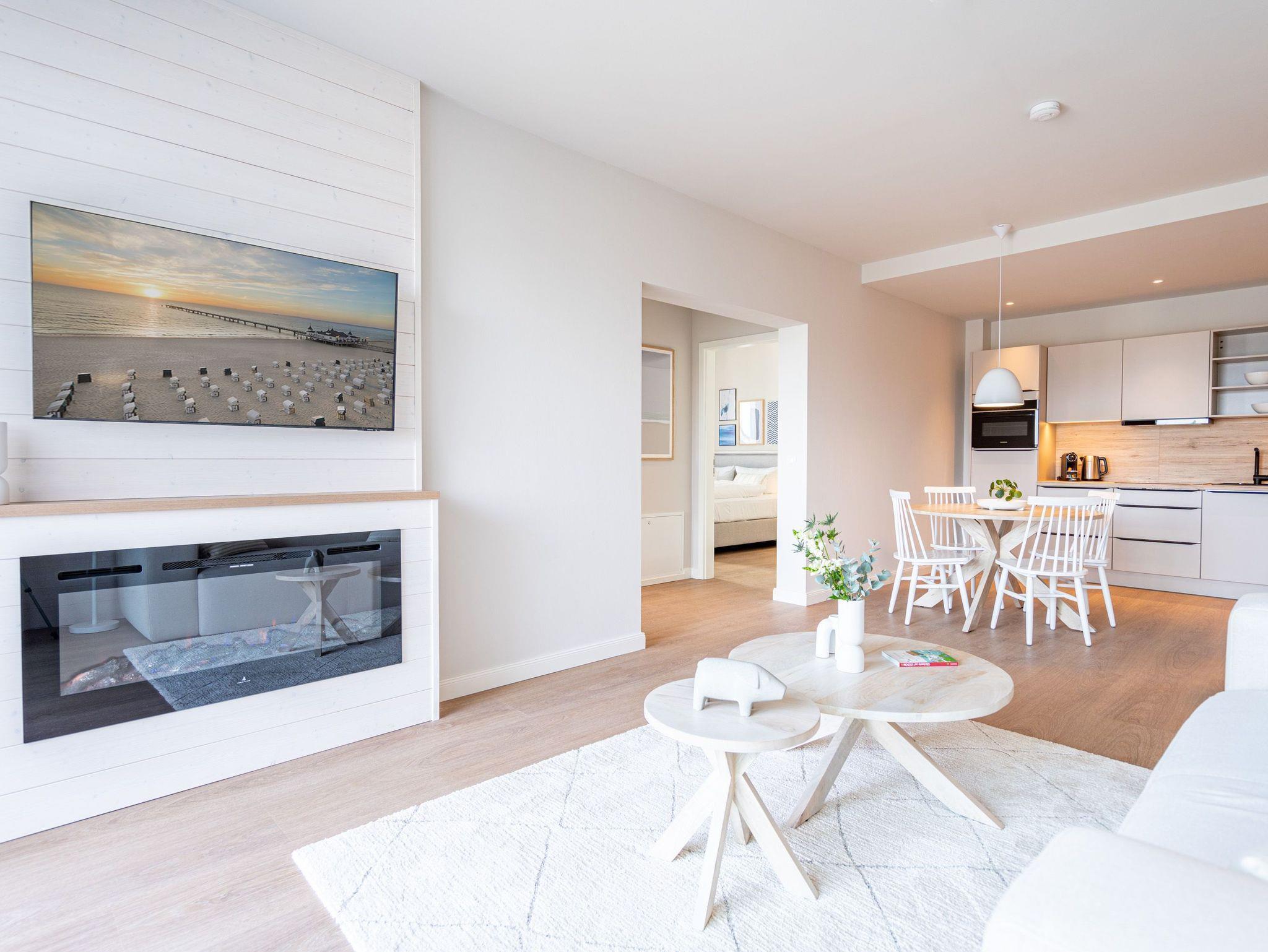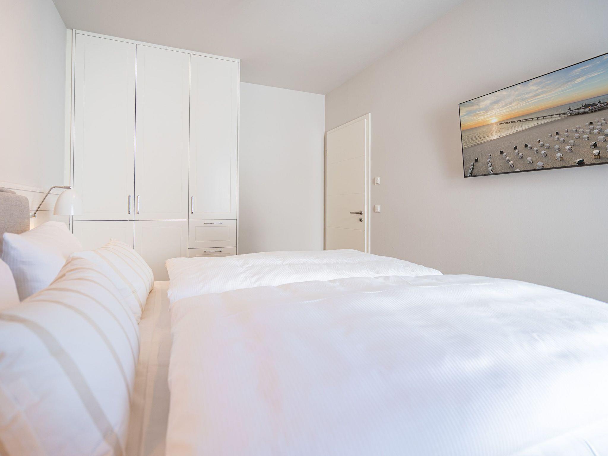 Über den Dächern von Ahlbeck mit Blick auf das beruhigende Blau der Ostsee ist das 3-Raum-Appartement B 3.1 (Haus B) im 3. Obergeschoss der Strandterrasse ein echter Urlaubstraum. In den 82 Quadratmetern finden 4 Personen ein Wohlfühlparadies der Extraklasse vor. Das geräumige Wohn-Esszimmer ist eine absolute Entspannungsarea mit viel Komfort und einer stylischen Einrichtung. Helle Farben erinnern an das Licht des Nordens und den feinen Sandstrand. Das gemütliche Sofa lädt zum Relaxen vor dem Elektrokamin (ohne Wärmeabgabe) oder dem großen Flat-TV (50 Zoll) ein. Ein schöner Esstisch mit 4 Stühlen ist ideal zum Genießen und Klönen geeignet. Die offene Küchenzeile ist modern und mit hochwertigen Elektrogeräten wie einem Backofen, einem 4-Platten-Induktionsherd und einer Nespresso-Kapselmaschine ausgestattet. Eine kleine Working-Station ist für das Notieren von Urlaubserlebnissen oder das Schreiben nostalgischer Postkarten bestens geeignet. Der Urlaubsspaß und das Wohlfühlen stehen bei allem in dieser Wohnung an erster Stelle. Vor allem auch, wenn es darum geht, in süße Urlaubsträume zu fallen. In den beiden Schlafzimmern, die die Wohnung zu bieten hat, stehen deshalb jeweils ein komfortables Boxspringdoppelbett (1,80m x 2,00m) für erholsame Stunden bereit. Beide Schlafzimmer sind zudem mit einem Kleiderschrank und ebenfalls einem Flat-TV (43 Zoll) ausgestattet. Das Appartement hat einen Nord-West-Balkon mit einem Tisch und 4 Stühlen, der einen herrlichen Blick über die alten Villendächer auf die Ostsee ermöglicht. Zugang haben Sie vom Wohnzimmer und von einem der beiden Schlafzimmer aus. Na, spielen Sie schon Schnick, Schnack, Schnuck um dieses? Zwei moderne Duschbäder mit Waschtisch und WC bieten Ihnen Komfort und Bequemlichkeit. Eines der Bäder verfügt sogar über eine Infrarotsauna. Eine kleine Wellnessoase, die für Entspannung und Entschleunigung sorgt. Zu der Wohnung gehört in der Tiefgarage ein Stellplatz, so dass Sie gar nicht erst auf lästige Parkplatzsuche gehen müssen. Kommen Sie einfach an und genießen Sie Ihre Auszeit direkt am Meer vom ersten Augenblick an.