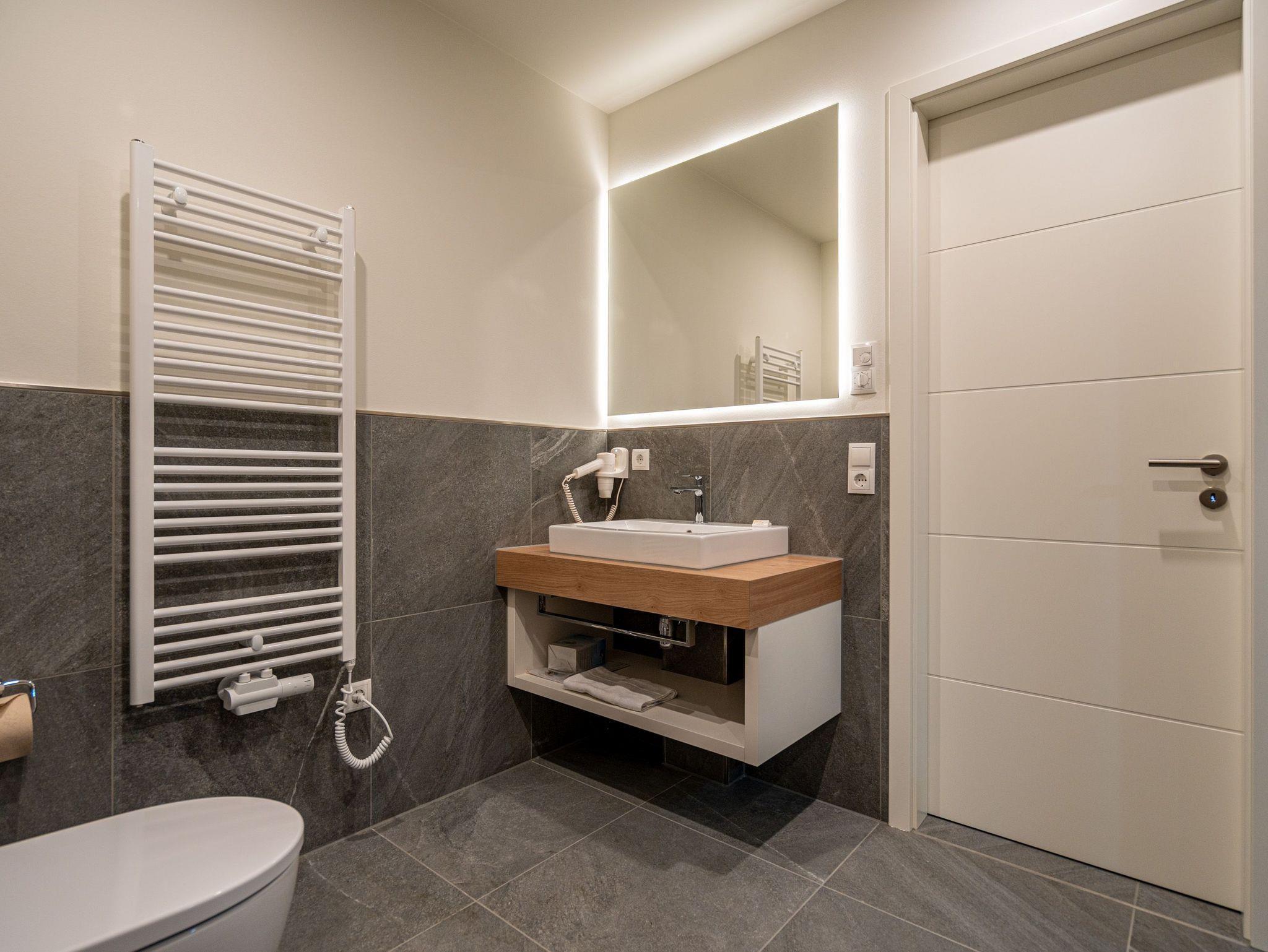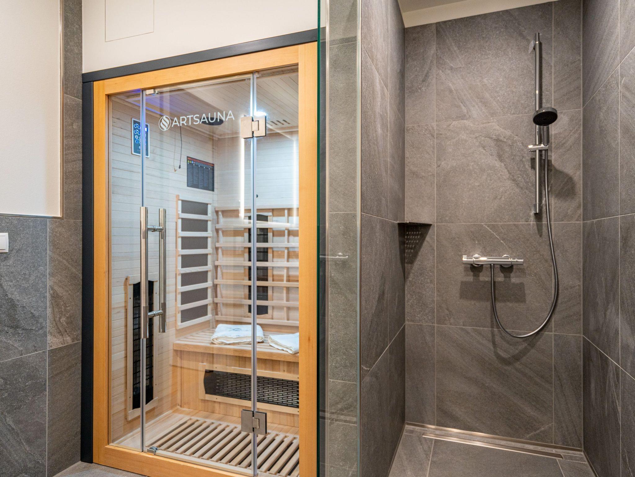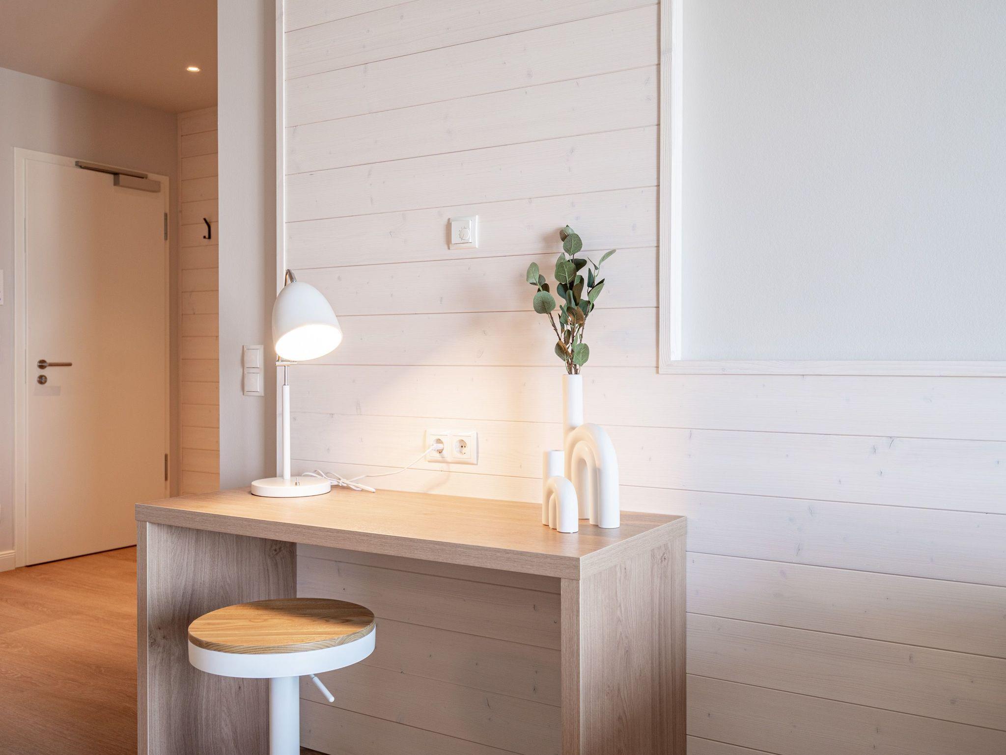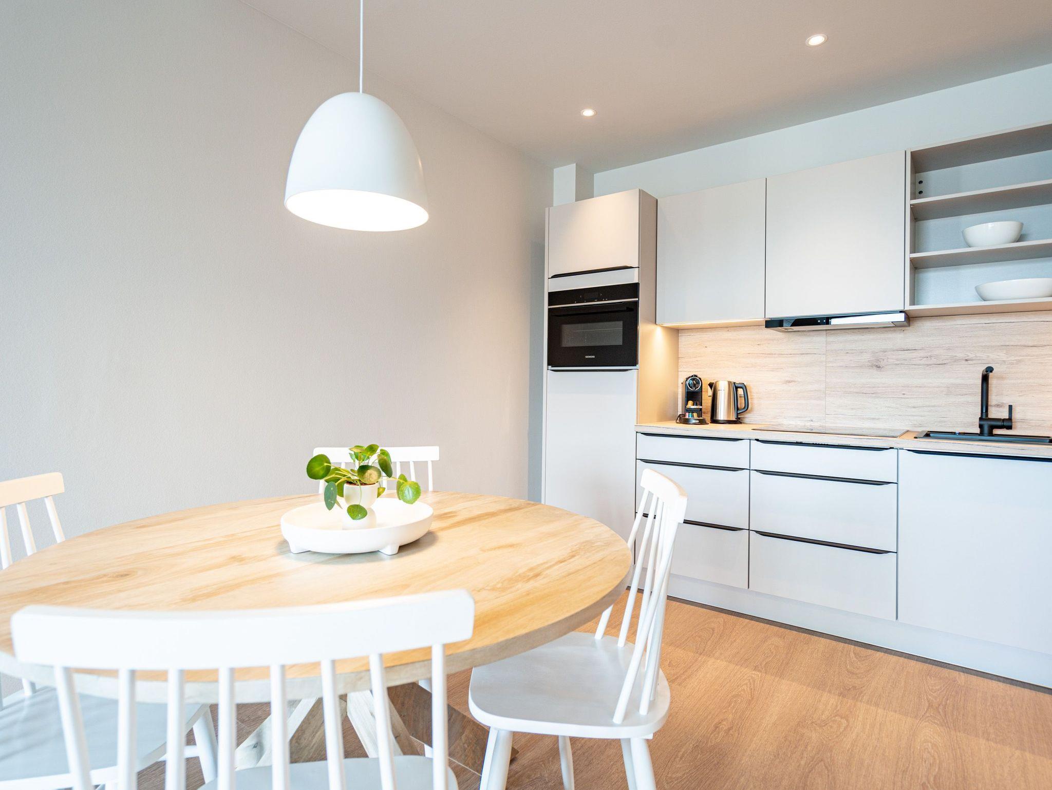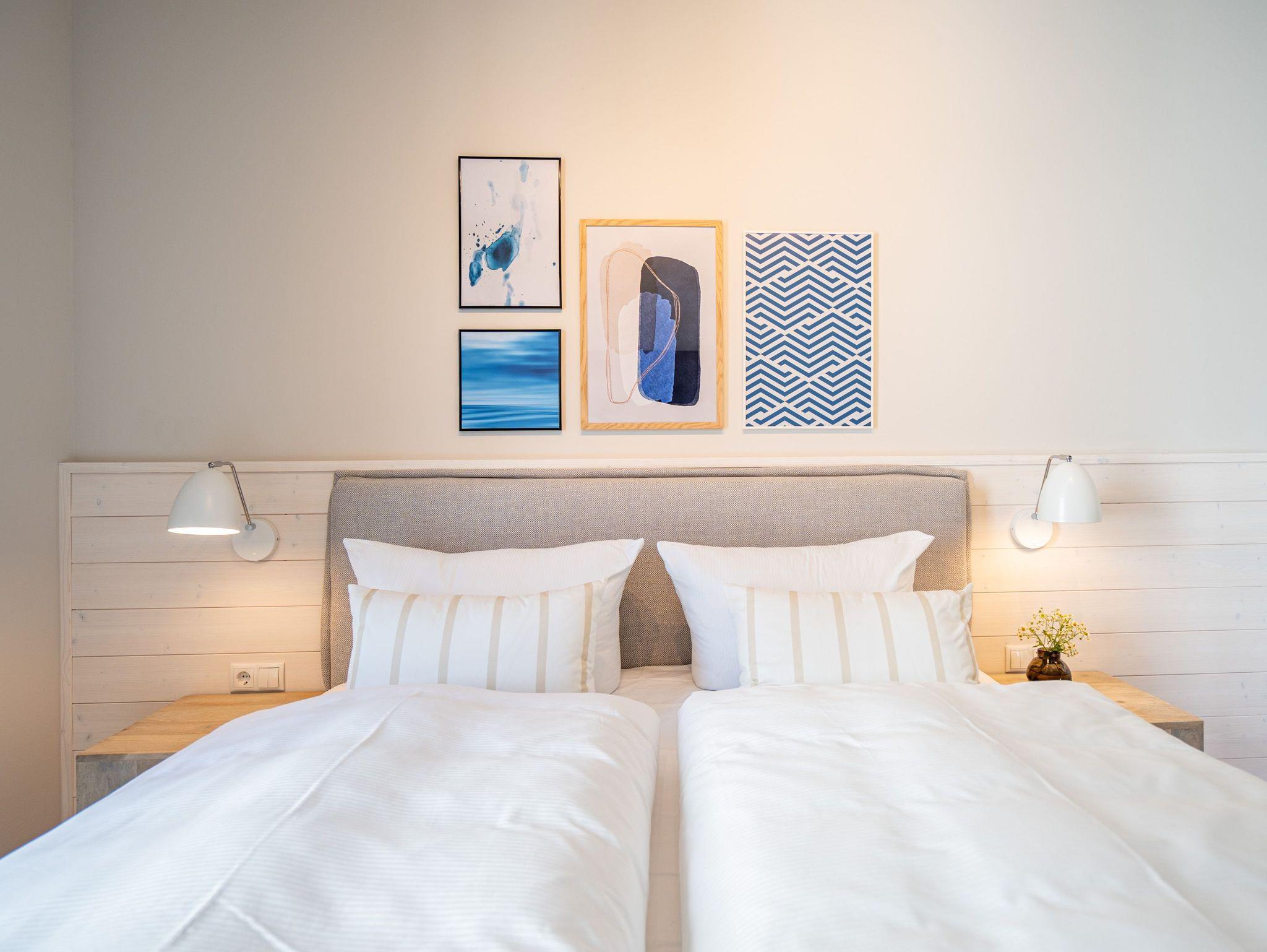 Über den Dächern von Ahlbeck mit Blick auf das beruhigende Blau der Ostsee ist das 3-Raum-Appartement B 3.1 (Haus B) im 3. Obergeschoss der Strandterrasse ein echter Urlaubstraum. In den 82 Quadratmetern finden 4 Personen ein Wohlfühlparadies der Extraklasse vor. Das geräumige Wohn-Esszimmer ist eine absolute Entspannungsarea mit viel Komfort und einer stylischen Einrichtung. Helle Farben erinnern an das Licht des Nordens und den feinen Sandstrand. Das gemütliche Sofa lädt zum Relaxen vor dem Elektrokamin (ohne Wärmeabgabe) oder dem großen Flat-TV (50 Zoll) ein. Ein schöner Esstisch mit 4 Stühlen ist ideal zum Genießen und Klönen geeignet. Die offene Küchenzeile ist modern und mit hochwertigen Elektrogeräten wie einem Backofen, einem 4-Platten-Induktionsherd und einer Nespresso-Kapselmaschine ausgestattet. Eine kleine Working-Station ist für das Notieren von Urlaubserlebnissen oder das Schreiben nostalgischer Postkarten bestens geeignet. Der Urlaubsspaß und das Wohlfühlen stehen bei allem in dieser Wohnung an erster Stelle. Vor allem auch, wenn es darum geht, in süße Urlaubsträume zu fallen. In den beiden Schlafzimmern, die die Wohnung zu bieten hat, stehen deshalb jeweils ein komfortables Boxspringdoppelbett (1,80m x 2,00m) für erholsame Stunden bereit. Beide Schlafzimmer sind zudem mit einem Kleiderschrank und ebenfalls einem Flat-TV (43 Zoll) ausgestattet. Das Appartement hat einen Nord-West-Balkon mit einem Tisch und 4 Stühlen, der einen herrlichen Blick über die alten Villendächer auf die Ostsee ermöglicht. Zugang haben Sie vom Wohnzimmer und von einem der beiden Schlafzimmer aus. Na, spielen Sie schon Schnick, Schnack, Schnuck um dieses? Zwei moderne Duschbäder mit Waschtisch und WC bieten Ihnen Komfort und Bequemlichkeit. Eines der Bäder verfügt sogar über eine Infrarotsauna. Eine kleine Wellnessoase, die für Entspannung und Entschleunigung sorgt. Zu der Wohnung gehört in der Tiefgarage ein Stellplatz, so dass Sie gar nicht erst auf lästige Parkplatzsuche gehen müssen. Kommen Sie einfach an und genießen Sie Ihre Auszeit direkt am Meer vom ersten Augenblick an.