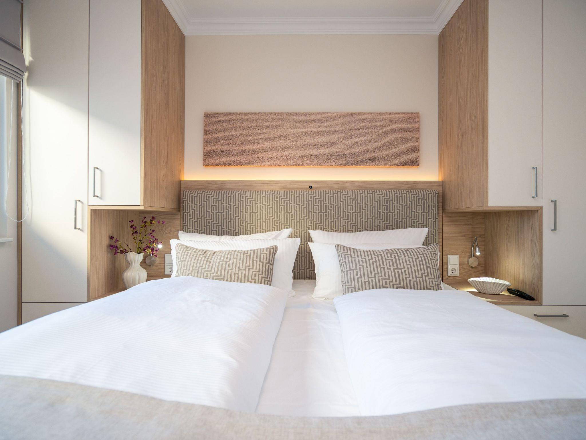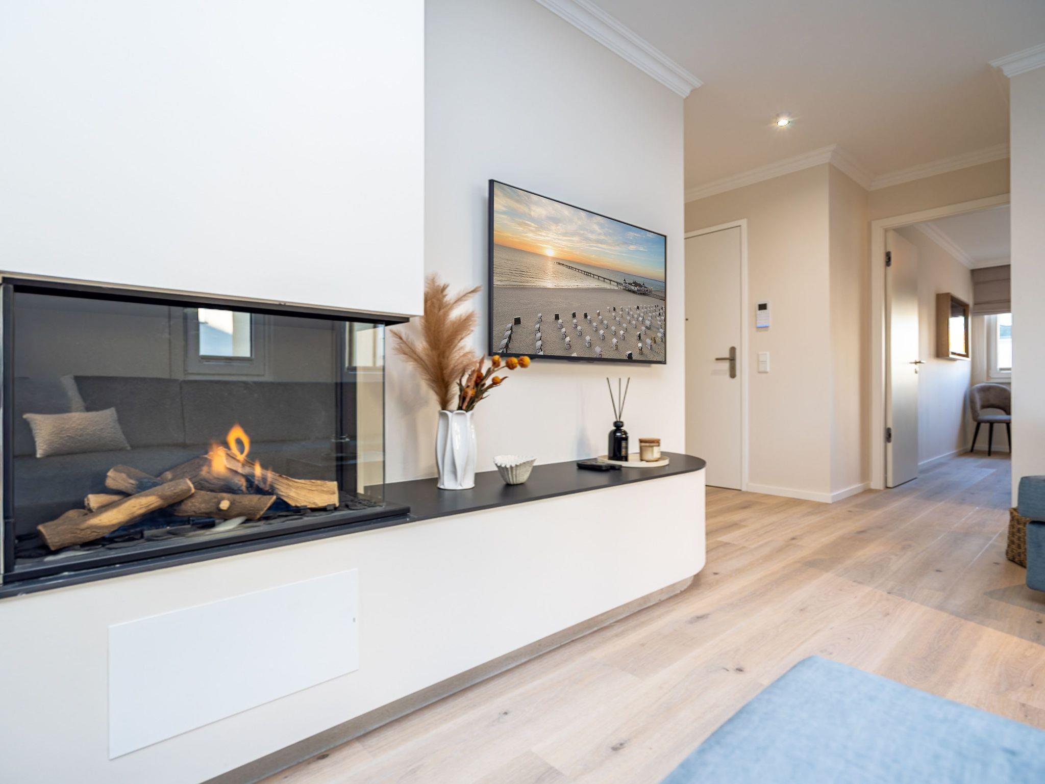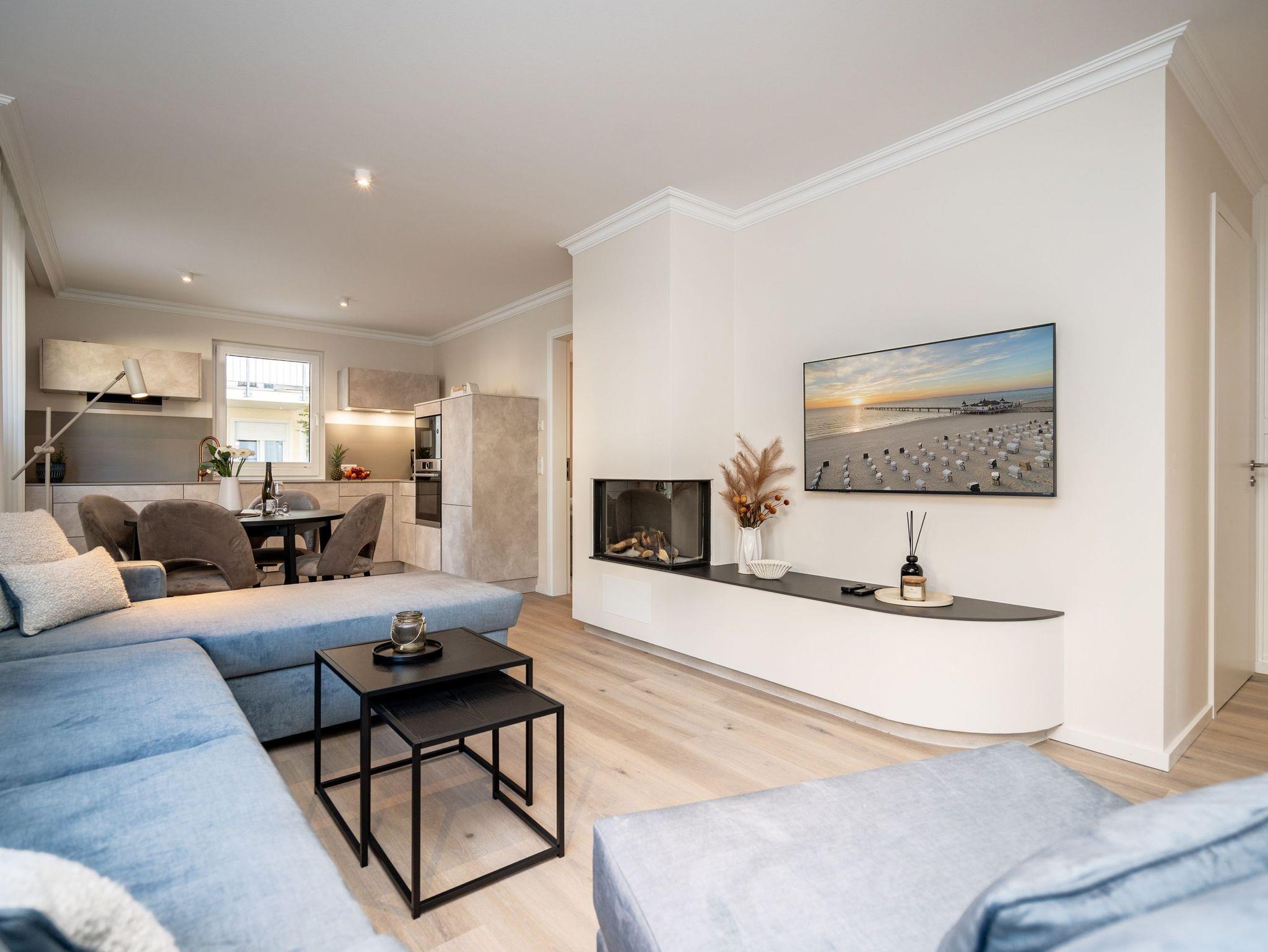 Die Wohnung bietet auf 67 Quadratmetern einen klar strukturierten Grundriss und eine angenehme Atmosphäre. Der Wohnbereich ist offen gestaltet, hell und aufgeräumt. Die Sitzgruppe, der Kamin mit Fernbedienung und der Fernseher schaffen einen Bereich, in dem man sich ohne viel Aufwand wohlfühlt. Die Küche ist vollständig ausgestattet und eignet sich auch für längere Aufenthalte. Backofen, Induktionsfeld, Mikrowelle, Spülmaschine und ein Kühlschrank mit Gefrierfach sind vorhanden. Der Essplatz schließt direkt an. Von hier aus geht es auf die große Terrasse nach Südost. Fünfzig Quadratmeter bieten genug Fläche für ein ruhiges Frühstück, ein Buch oder ein Glas Wein am Nachmittag. Gartenmöbel stehen bereit. Beide Schlafzimmer sind mit Boxspringbetten (1,80 m x 2,00 m) eingerichtet. Dazu gibt es jeweils einen Kleiderschrank und einen Fernseher. Die beiden Bäder sind modern gehalten und jeweils mit Dusche, Waschtisch und WC ausgestattet. In einem der Bäder befindet sich eine finnische Sauna für zwei Personen, die an kühleren Tagen eine echte Wohlfühloase ist. Ein Stellplatz in der Tiefgarage (Durchfahrthöhe 1,85m) gehört zur Wohnung. WLAN steht ohne Zusatzkosten zur Verfügung.