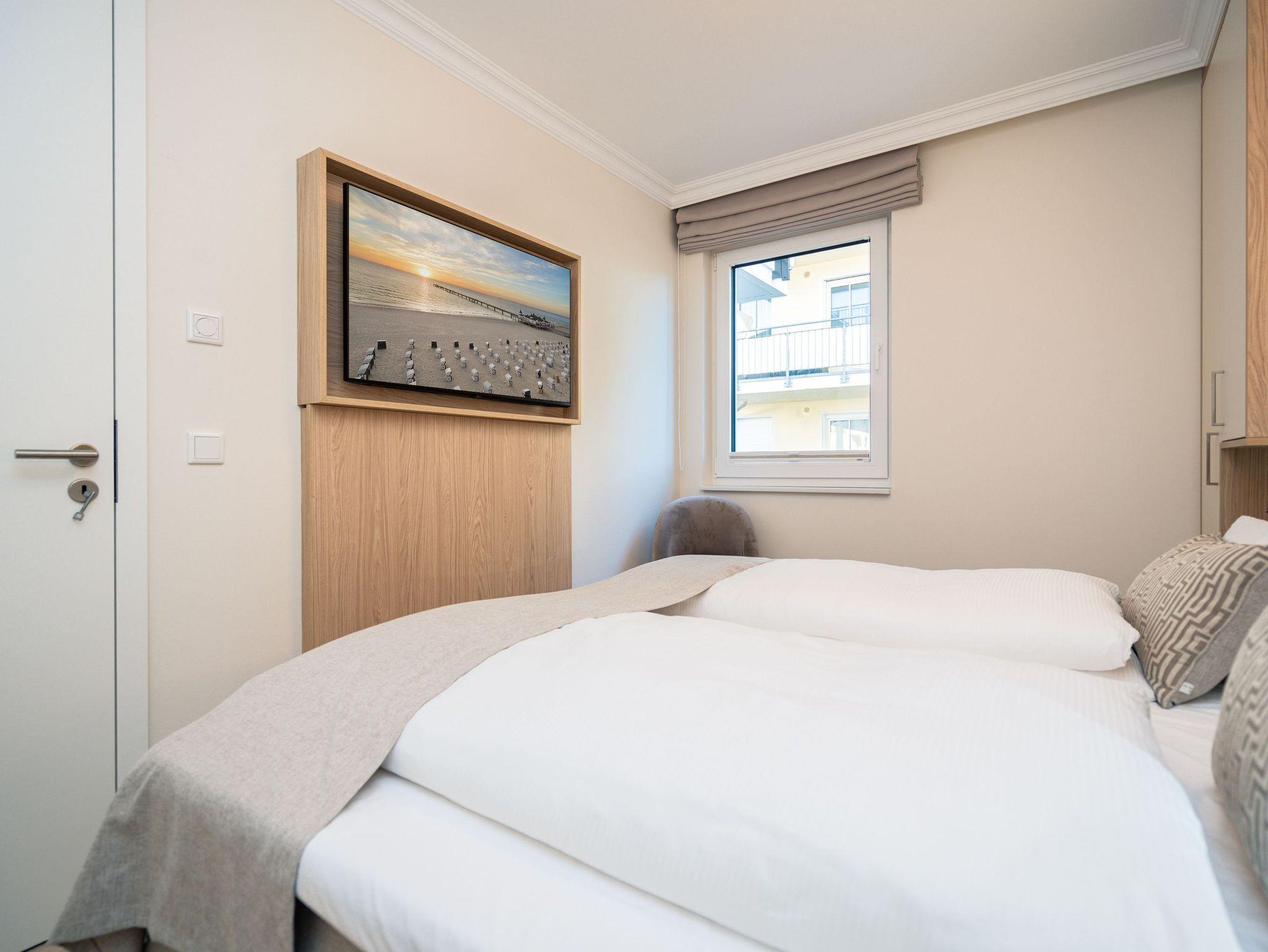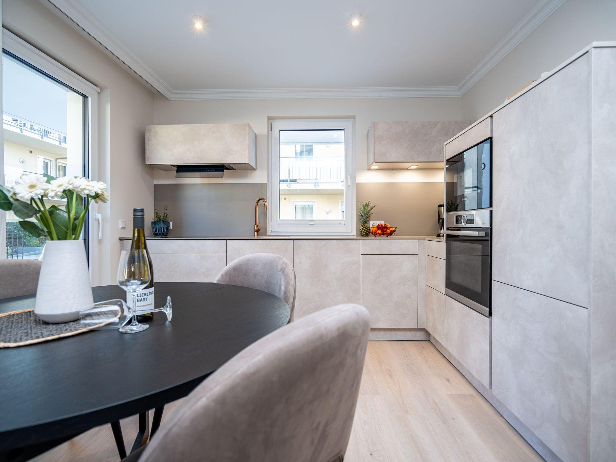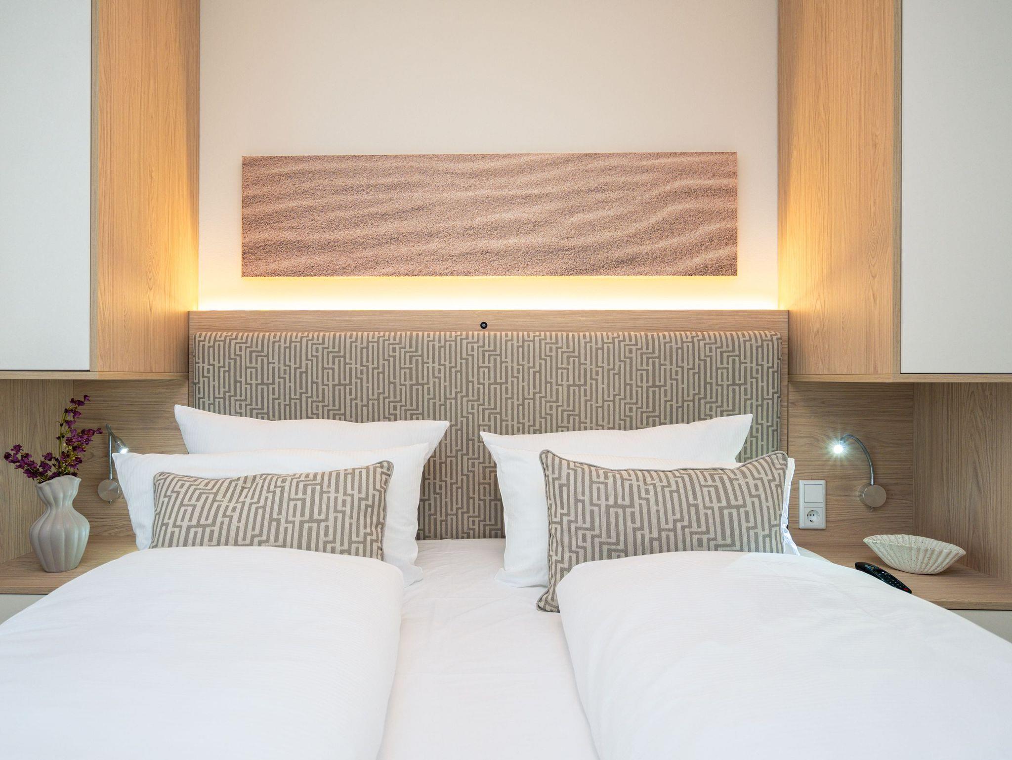 Die Wohnung bietet auf 67 Quadratmetern einen klar strukturierten Grundriss und eine angenehme Atmosphäre. Der Wohnbereich ist offen gestaltet, hell und aufgeräumt. Die Sitzgruppe, der Kamin mit Fernbedienung und der Fernseher schaffen einen Bereich, in dem man sich ohne viel Aufwand wohlfühlt. Die Küche ist vollständig ausgestattet und eignet sich auch für längere Aufenthalte. Backofen, Induktionsfeld, Mikrowelle, Spülmaschine und ein Kühlschrank mit Gefrierfach sind vorhanden. Der Essplatz schließt direkt an. Von hier aus geht es auf die große Terrasse nach Südost. Fünfzig Quadratmeter bieten genug Fläche für ein ruhiges Frühstück, ein Buch oder ein Glas Wein am Nachmittag. Gartenmöbel stehen bereit. Beide Schlafzimmer sind mit Boxspringbetten (1,80 m x 2,00 m) eingerichtet. Dazu gibt es jeweils einen Kleiderschrank und einen Fernseher. Die beiden Bäder sind modern gehalten und jeweils mit Dusche, Waschtisch und WC ausgestattet. In einem der Bäder befindet sich eine finnische Sauna für zwei Personen, die an kühleren Tagen eine echte Wohlfühloase ist. Ein Stellplatz in der Tiefgarage (Durchfahrthöhe 1,85m) gehört zur Wohnung. WLAN steht ohne Zusatzkosten zur Verfügung.