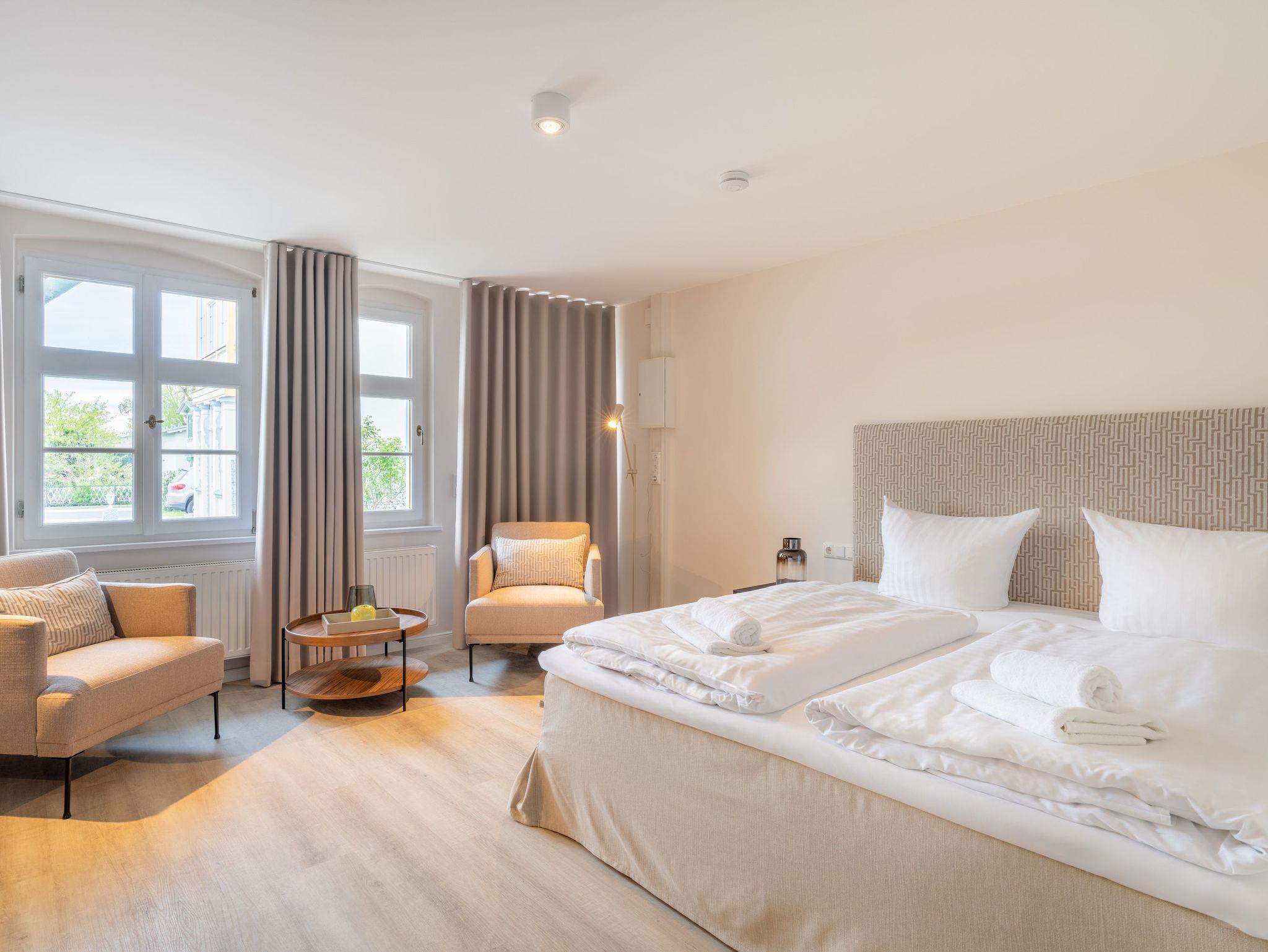 Die Einrichtung wurde liebevoll auf die stillvolle Bäderarchitektur der Villa Albus abgestimmt. Der kombinierte Wohn-, Ess-, Koch- und Schlafbereich verfügt ein komfortables Doppelbett und bietet einen erholsamen Schlaf. Die integrierte Küchenzeile lässt keine Wünsche offen und ist ausgestattet mit einem Herd, Backofen, Kühlschrank mit Tiefkühlfach, Geschirrspülmaschine, Mikrowelle, Kaffeemaschine, Toaster und Wasserkocher. Genießen Sie Ihre Lieblingsspeisen an dem vorhandenen Esstisch oder verbringen Sie einen gemütlichen Fernsehabend vor dem FlatTV. Das Bad ist mit einer Dusche, WC und einem Haartrockner ausgestattet.