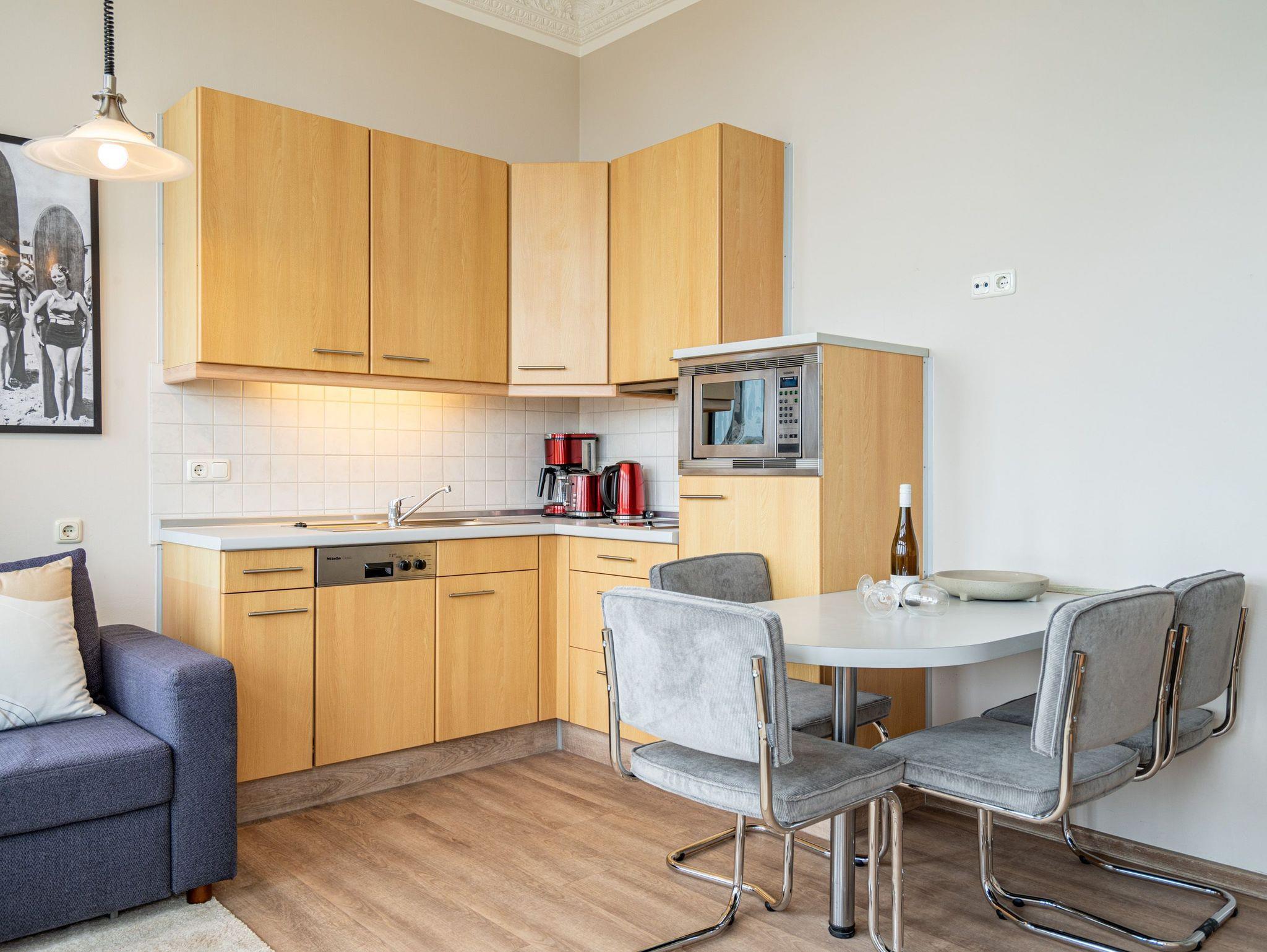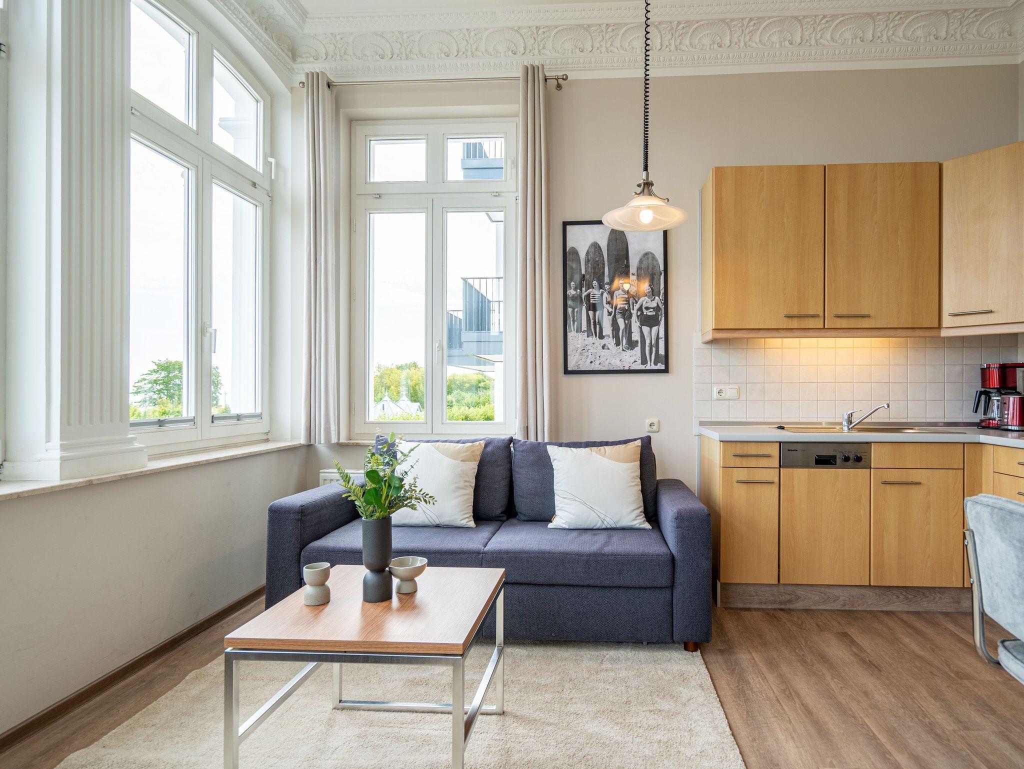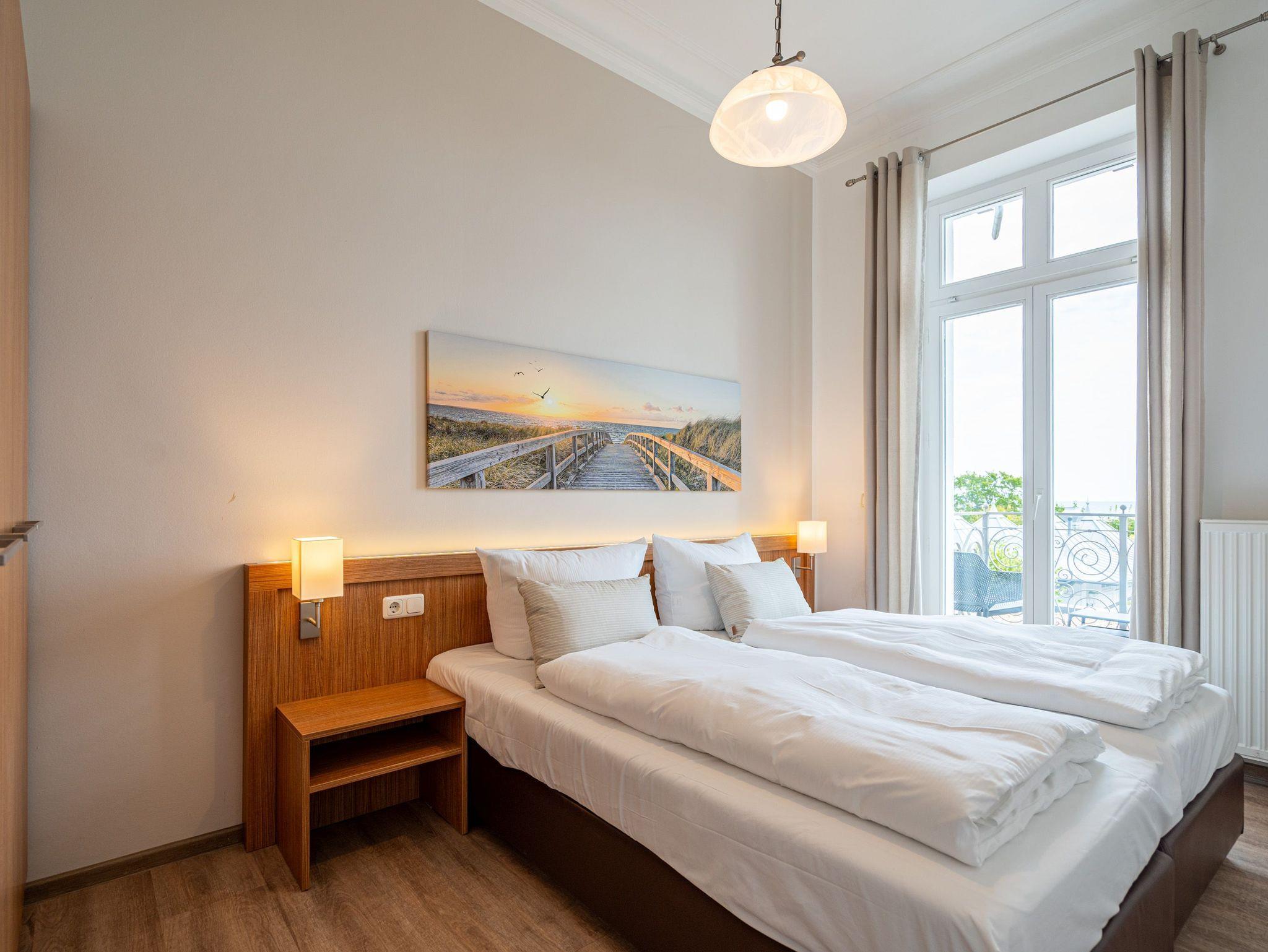 Die 3-Raum-Ferienwohnung Nr. C06 in der Villa Seedüwel bietet auf 52 qm ausreichend Platz für 2 bis 4 Personen und befindet sich im 1. Obergeschoss. Der offene Wohnbereich besticht durch einen herrlichen Blick auf die Seebrücke und die Ostsee. Er ist mit einer Küchenzeile ausgestattet, die ein 2-Platten-Cerankochfeld, eine Mikrowelle und einen Kühlschrank mit Gefrierfach umfasst. Ein Essplatz für vier Personen, eine gemütliche Sitzgruppe und ein Flat-TV sorgen für Komfort und Entspannung. Das erste Schlafzimmer verfügt über ein Doppelbett (1,80 m x 2,00 m) und einen Kleiderschrank. Von hier aus haben Sie Zugang zum kleinen Nord-Ost-Balkon, der Ihnen einen schönen Blick auf die Ostsee bietet. Das zweite Schlafzimmer ist mit einem Etagenbett (0,90 m x 2,00 m) eingerichtet. Das Bad ist mit einer Dusche und einem Waschbecken ausgestattet, und es gibt ein separates WC. Ein Stellplatz in der Tiefgarage ( Einfahrthöhe 2,03m) des benachbarten Hauses „Strandterrasse“ ist für Sie reserviert. WLAN steht Ihnen kostenfrei zur Verfügung.