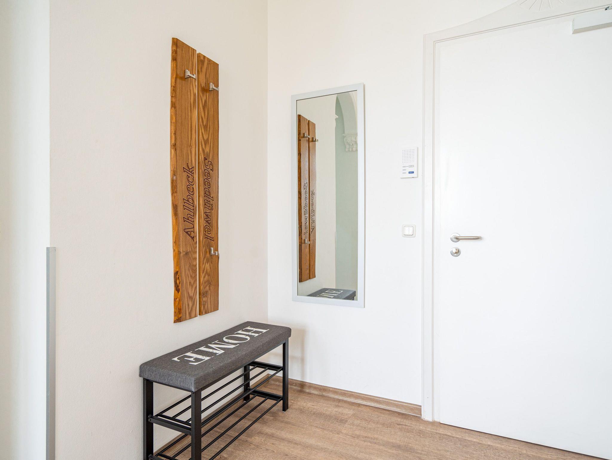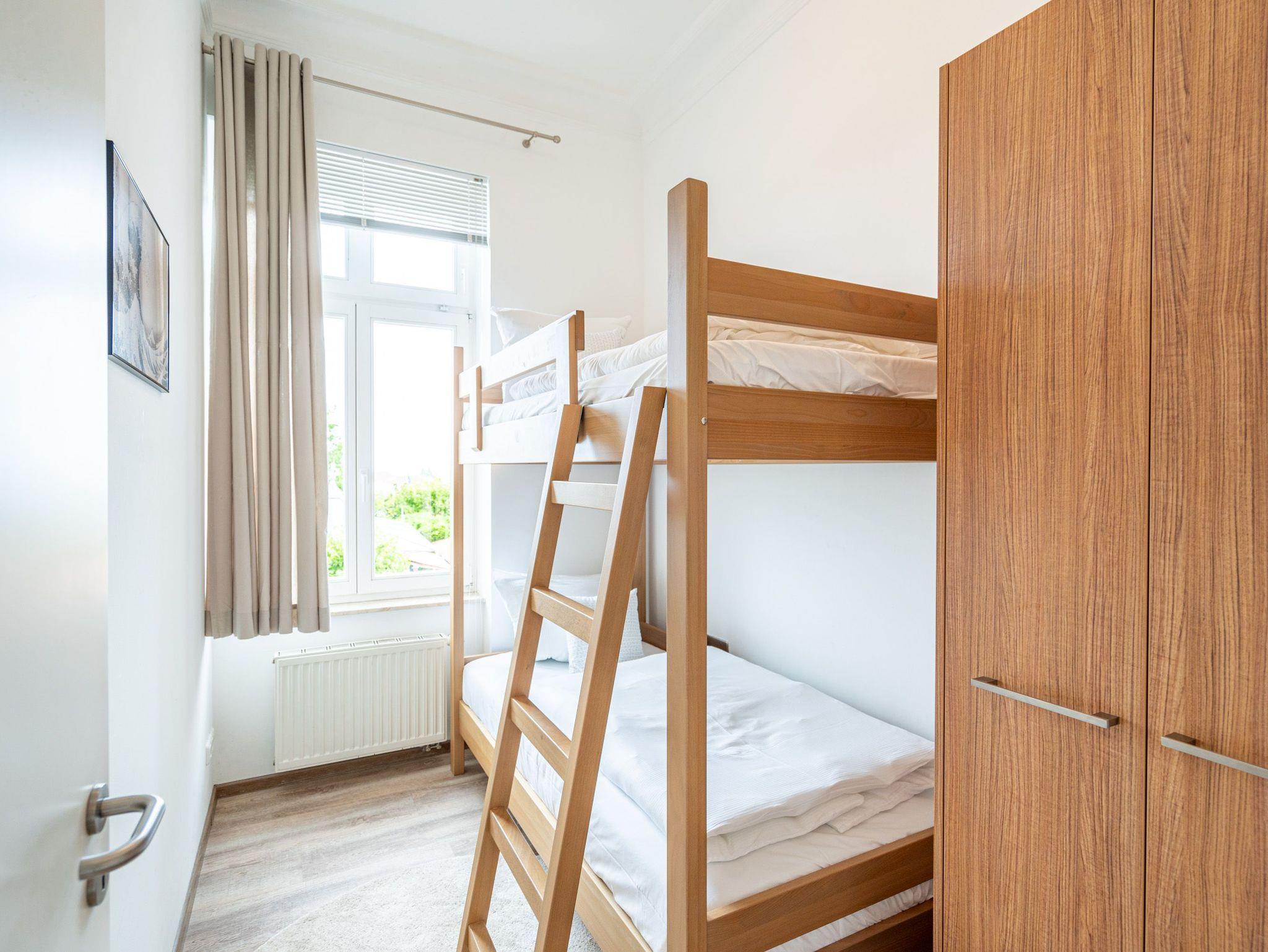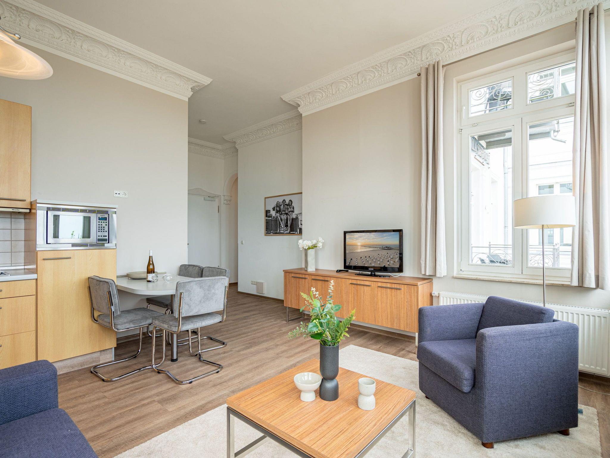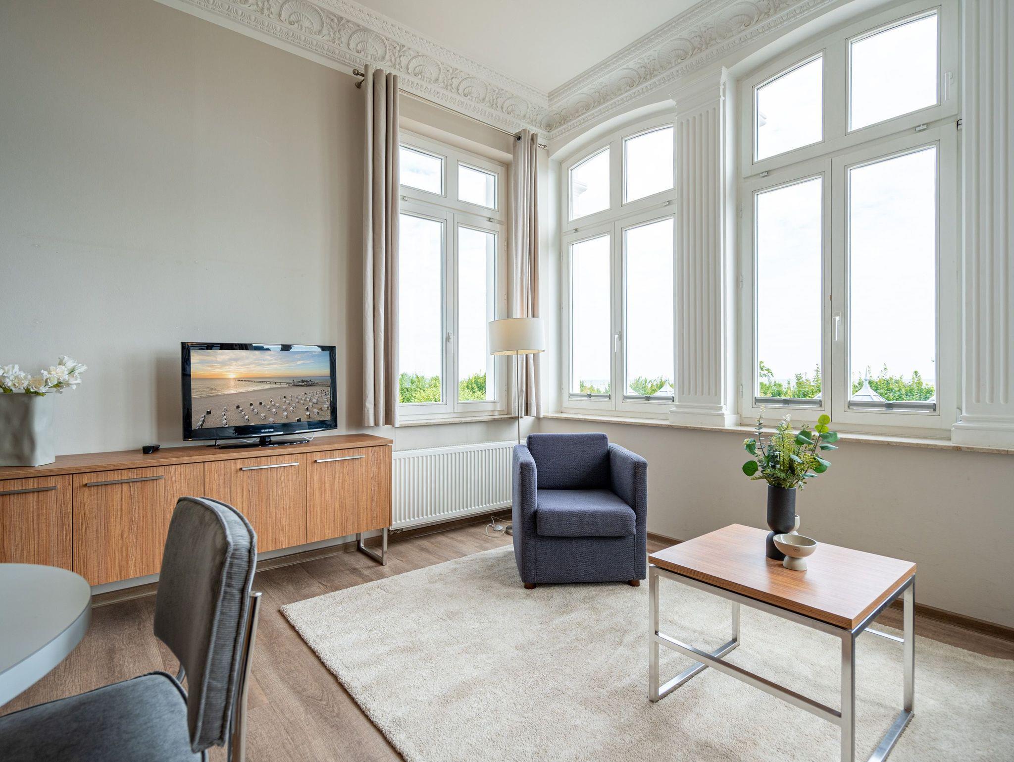 Die 3-Raum-Ferienwohnung Nr. C06 in der Villa Seedüwel bietet auf 52 qm ausreichend Platz für 2 bis 4 Personen und befindet sich im 1. Obergeschoss. Der offene Wohnbereich besticht durch einen herrlichen Blick auf die Seebrücke und die Ostsee. Er ist mit einer Küchenzeile ausgestattet, die ein 2-Platten-Cerankochfeld, eine Mikrowelle und einen Kühlschrank mit Gefrierfach umfasst. Ein Essplatz für vier Personen, eine gemütliche Sitzgruppe und ein Flat-TV sorgen für Komfort und Entspannung. Das erste Schlafzimmer verfügt über ein Doppelbett (1,80 m x 2,00 m) und einen Kleiderschrank. Von hier aus haben Sie Zugang zum kleinen Nord-Ost-Balkon, der Ihnen einen schönen Blick auf die Ostsee bietet. Das zweite Schlafzimmer ist mit einem Etagenbett (0,90 m x 2,00 m) eingerichtet. Das Bad ist mit einer Dusche und einem Waschbecken ausgestattet, und es gibt ein separates WC. Ein Stellplatz in der Tiefgarage ( Einfahrthöhe 2,03m) des benachbarten Hauses „Strandterrasse“ ist für Sie reserviert. WLAN steht Ihnen kostenfrei zur Verfügung.