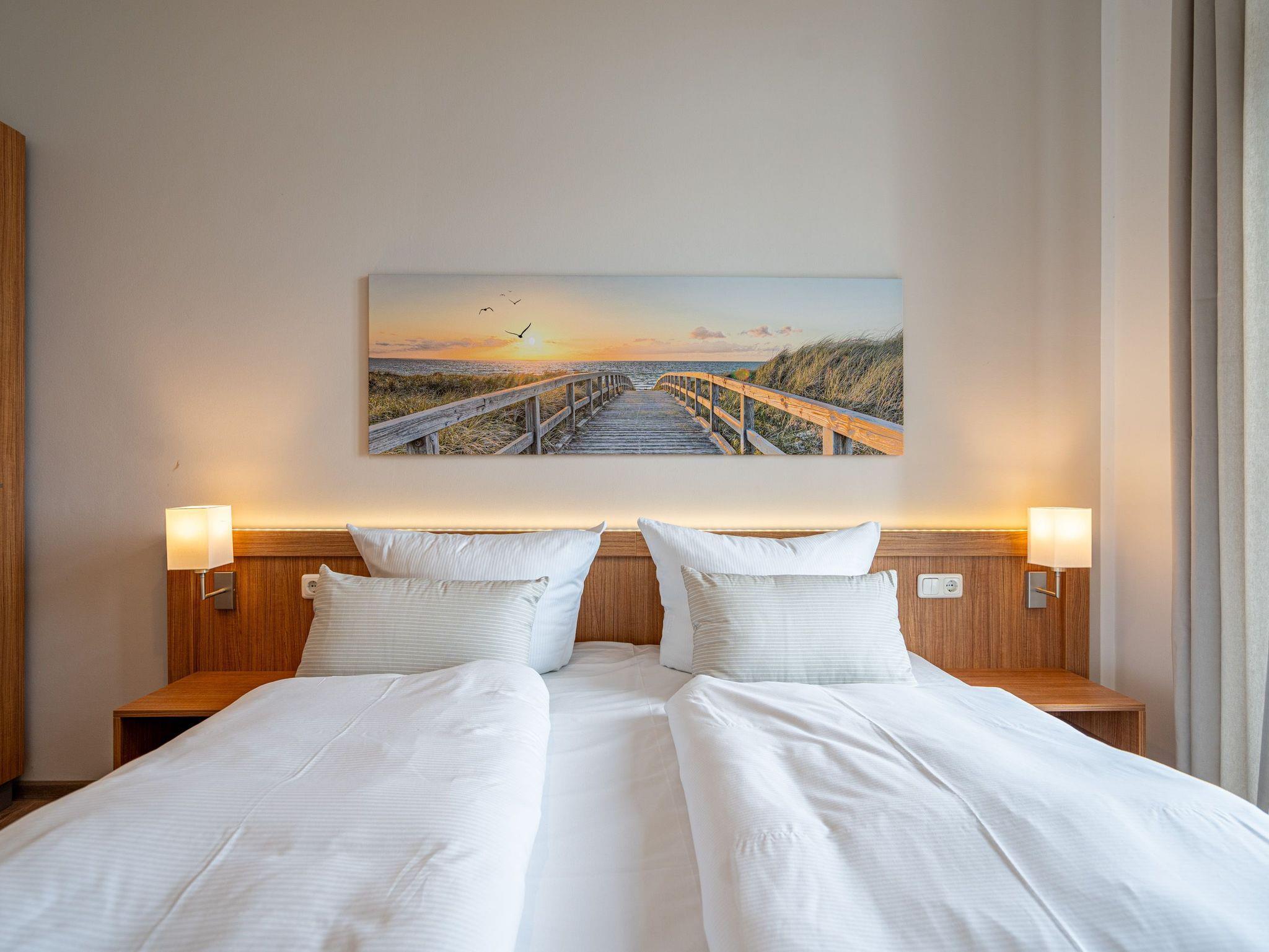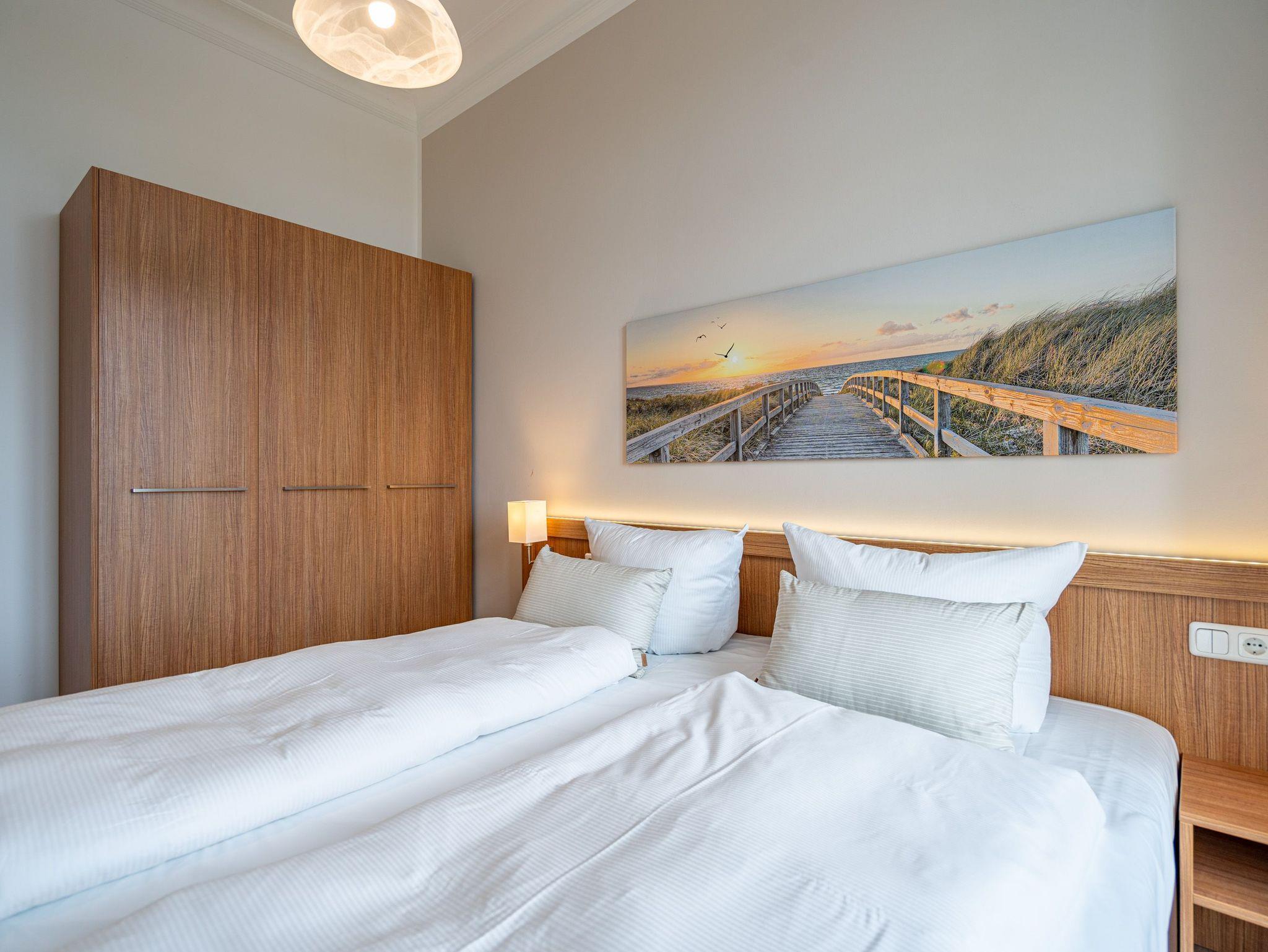 Die 3-Raum-Ferienwohnung Nr. C06 in der Villa Seedüwel bietet auf 52 qm ausreichend Platz für 2 bis 4 Personen und befindet sich im 1. Obergeschoss. Der offene Wohnbereich besticht durch einen herrlichen Blick auf die Seebrücke und die Ostsee. Er ist mit einer Küchenzeile ausgestattet, die ein 2-Platten-Cerankochfeld, eine Mikrowelle und einen Kühlschrank mit Gefrierfach umfasst. Ein Essplatz für vier Personen, eine gemütliche Sitzgruppe und ein Flat-TV sorgen für Komfort und Entspannung. Das erste Schlafzimmer verfügt über ein Doppelbett (1,80 m x 2,00 m) und einen Kleiderschrank. Von hier aus haben Sie Zugang zum kleinen Nord-Ost-Balkon, der Ihnen einen schönen Blick auf die Ostsee bietet. Das zweite Schlafzimmer ist mit einem Etagenbett (0,90 m x 2,00 m) eingerichtet. Das Bad ist mit einer Dusche und einem Waschbecken ausgestattet, und es gibt ein separates WC. Ein Stellplatz in der Tiefgarage ( Einfahrthöhe 2,03m) des benachbarten Hauses ?Strandterrasse? ist für Sie reserviert. WLAN steht Ihnen kostenfrei zur Verfügung.