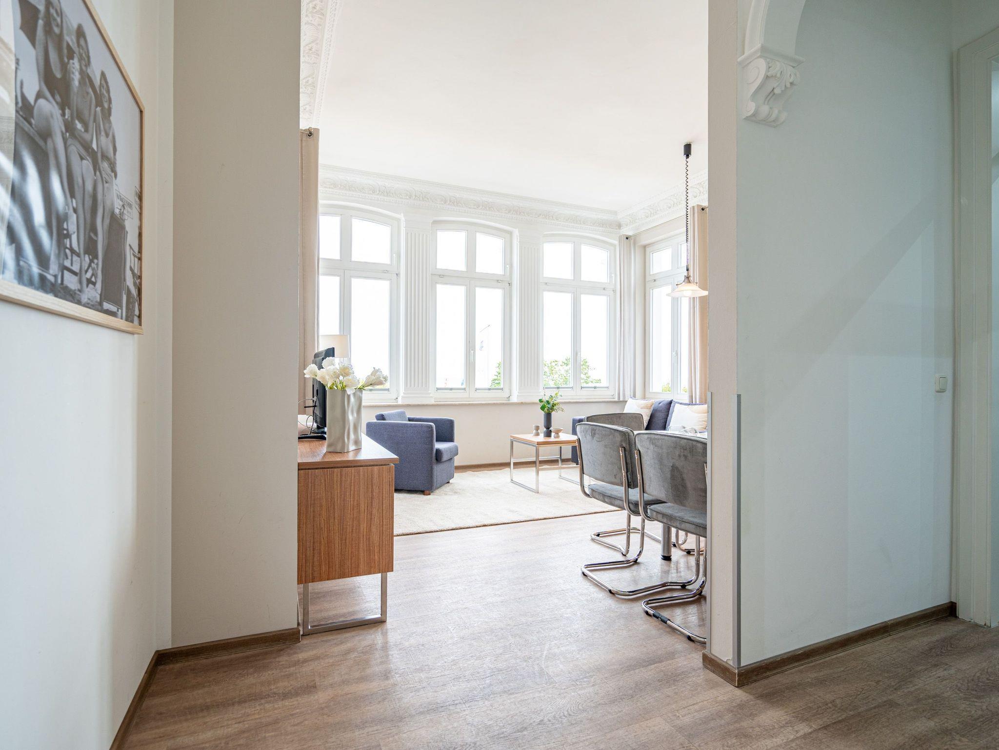 Die Villa Seedüwel - als Nachbarhaus der Strandterrasse, besticht durch ihre einmalige Lage direkt an der Ahlbecker Seebrücke, der belebten Promenade sowie der historischen Konzertmuschel, einem beliebten Treffpunkt für Kunst und Kultur. Dieses Objekt bietet insgesamt 13 Ferienwohnungen mit einem, zwei oder drei Räumen. Einige der Apartments bieten einen spektakulären Ausblick auf die historische Seebrücke und die Ostsee. Für Ihren PKW steht ein Stellplatz in der Tiefgarage des benachbarten Hauses Strandterrasse zur Verfügung (Zufahrt über Kurstraße), von der Sie direkten Zugang zur Villa haben. Ein Fahrstuhl im Haus ist über einige Stufen im Flur erreichbar. Die Villa ist komplett mit kostenfreiem WLAN ausgestattet. Zudem gibt es einen gemeinschaftlichen Fahrradkeller für die sichere Aufbewahrung Ihrer Fahrräder. Der feinsandige, weiße Strand und das Meer liegen nur wenige Schritte entfernt. Die attraktive Lage bietet Ihnen eine Vielzahl an Restaurants, Cafés und Einkaufsmöglichkeiten (unter anderem im Erdgeschoss des Hauses) sowie das charmante Ambiente von Ahlbeck.
