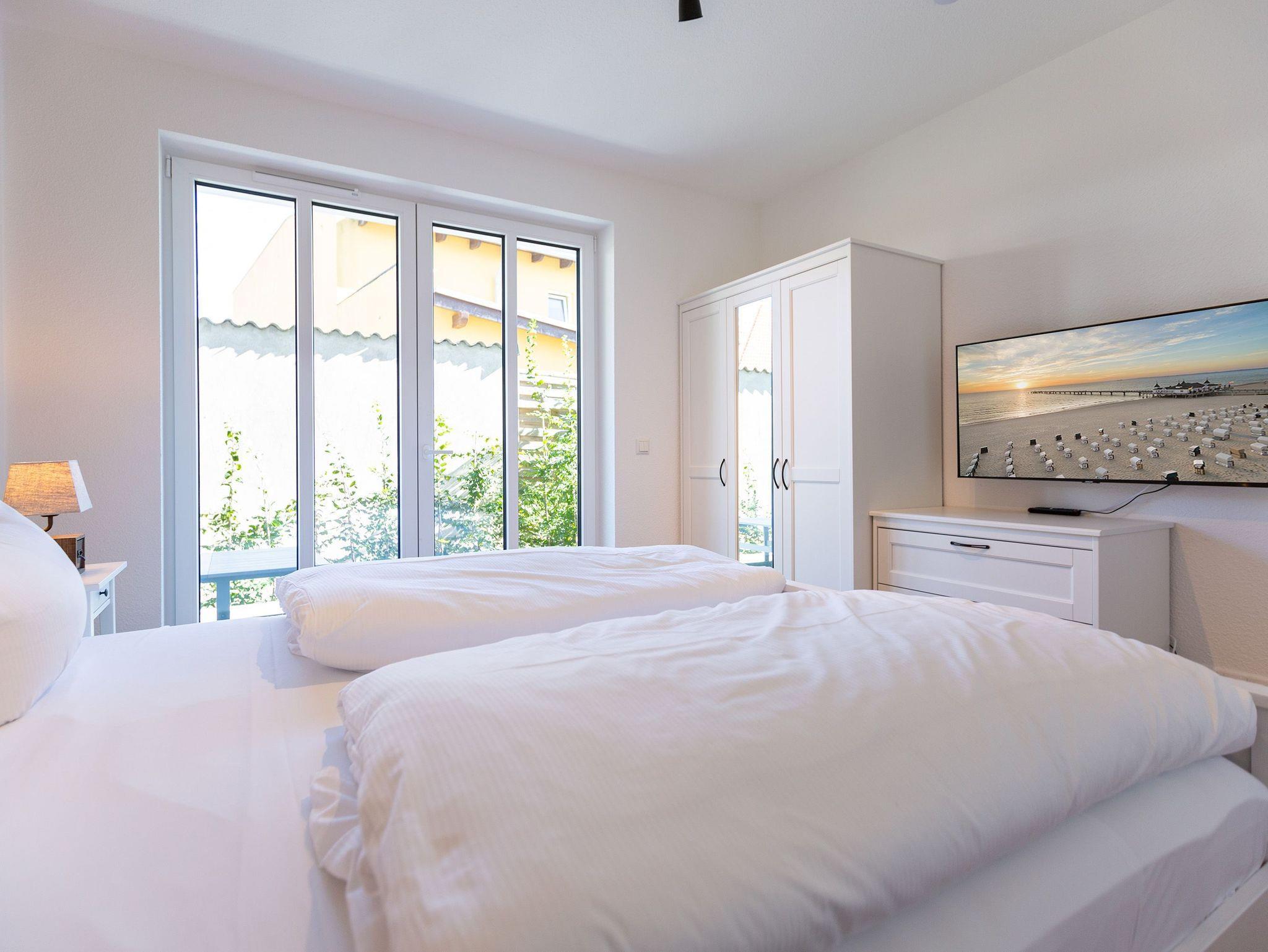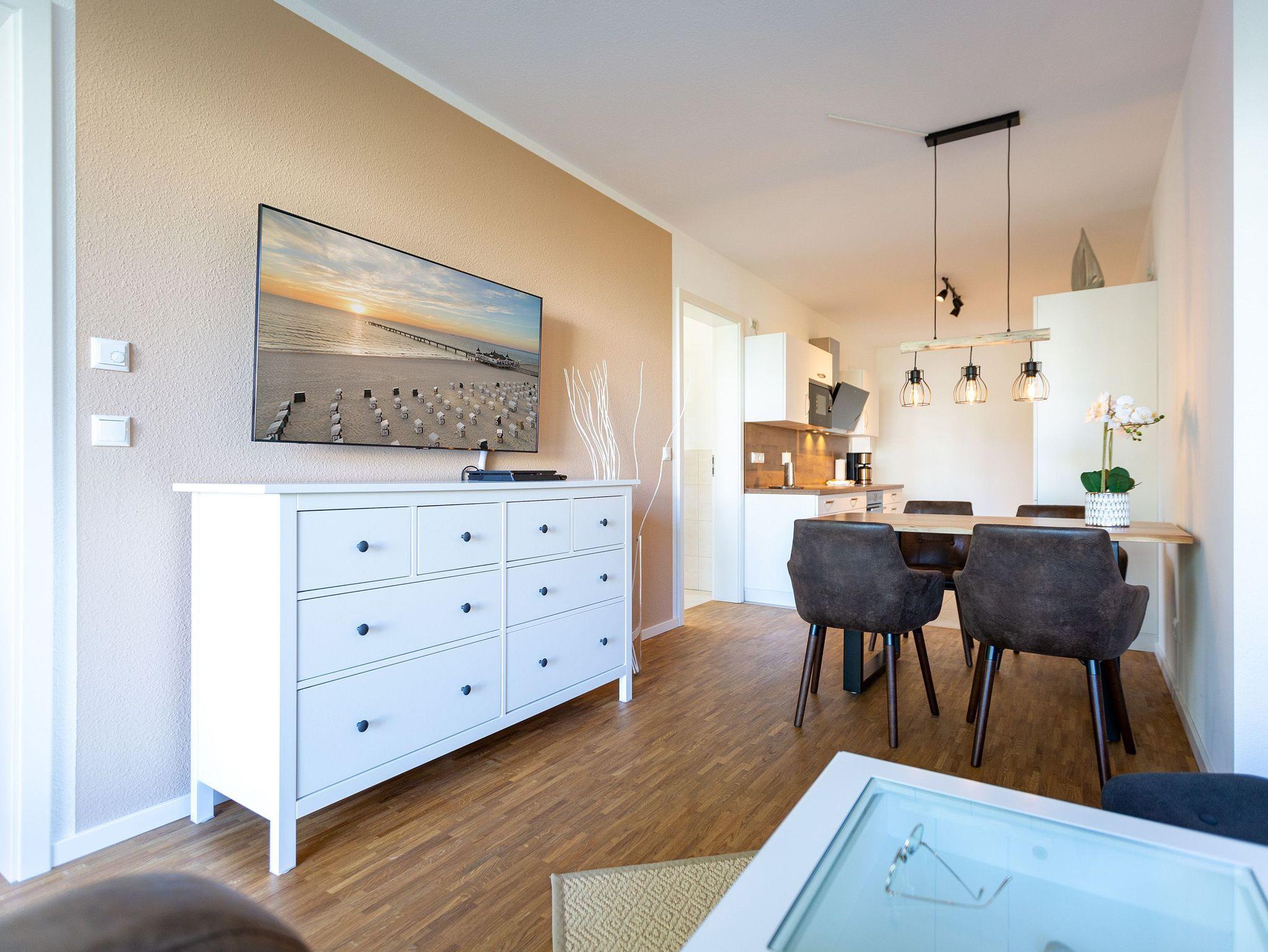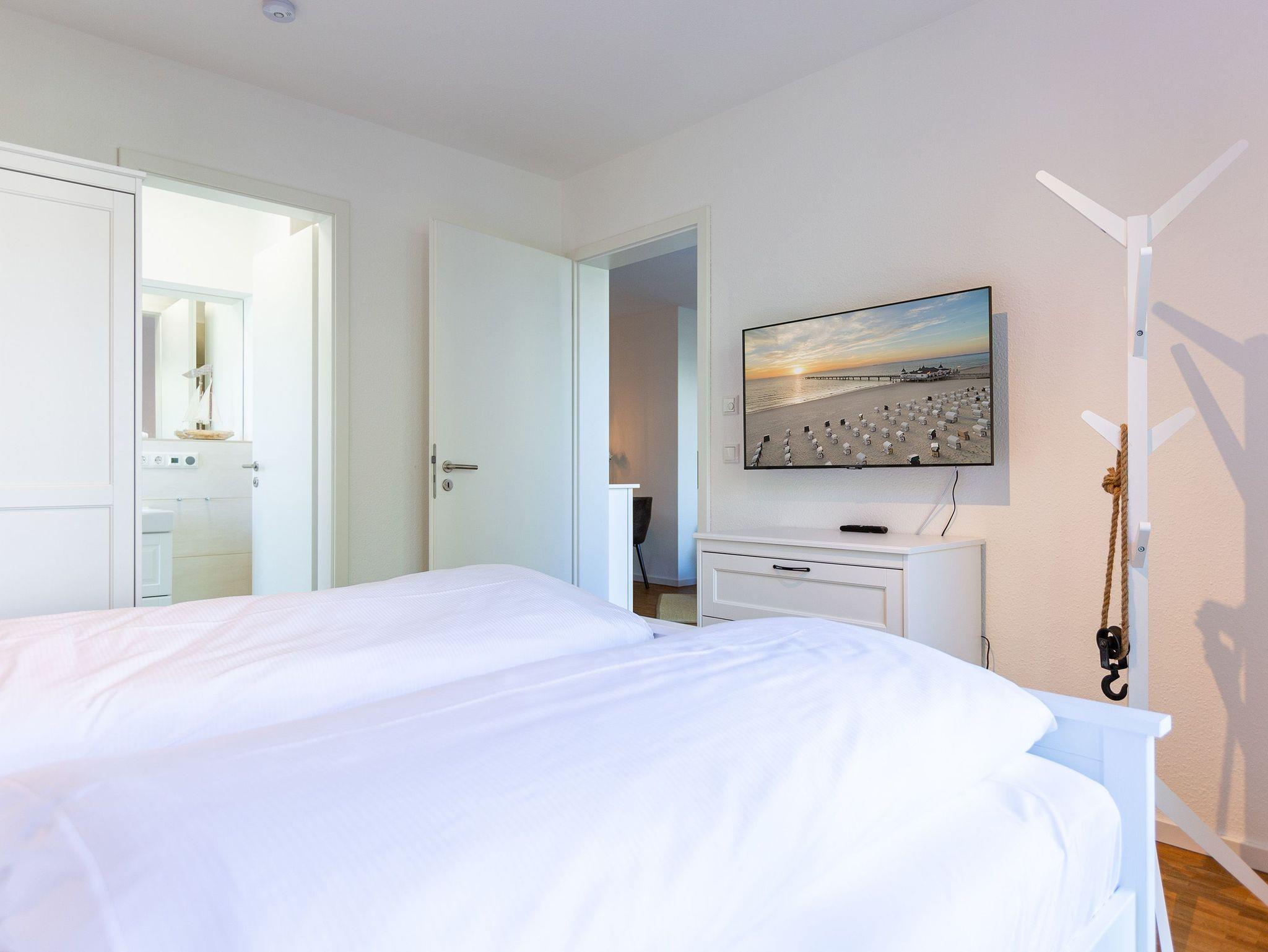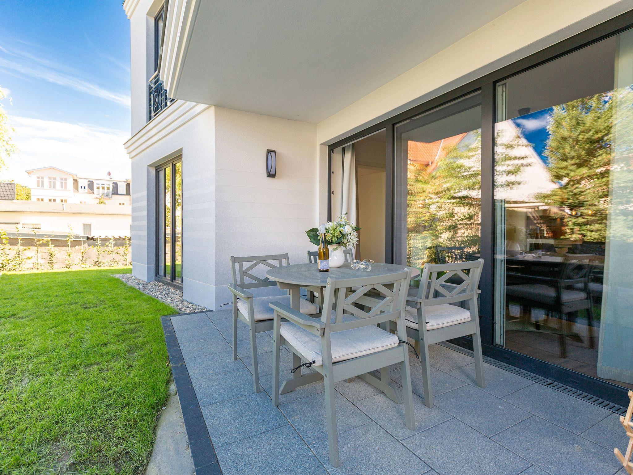 Für Ostseeluftfans bietet das 72 Quadratmeter große Ferienappartement Nummer 5 im Erdgeschoss gleich zwei Terrassen, auf denen Sie die frische Meeresbrise in vollen Atemzügen genießen können. Entspannen Sie in dem Drei-Zimmer-Traumdomizil mit bis zu vier Personen ausgiebig. Denn diese wunderschön eingerichtete Wohnung bietet alles, was man sich für einen Usedom-Urlaub nur erträumen kann. Ein großzügiges und helles Wohnzimmer lädt mit allem Wohnkomfort zum Relaxen ein. Der Sandton, der sich durch die gesamte Wohnung zieht, versetzt schon in den eigenen vier Wänden an den Strand. Eine Sitzgruppe nebst urgemütlichem Sessel ist eine ideale Faulenzzone. Der große Flat-TV an der Wand sorgt für Unterhaltung. Der Wohnbereich öffnet sich in eine moderne, mit Markengeräten vollausgestattete Küche. Ob Geschirrspüler, Mikrowelle, Herd oder Kaffeemaschine ? es ist alles aufs Feinste vorhanden. Auch erlesenes Geschirr. Am schönen, großen Echtholztisch lässt es sich wunderbar essen und plaudern. Hier sitzen Sie so gemütlich, dass der Abend lang werden kann. Überkommt Sie die Müdigkeit, wartet in den beiden Schlafzimmern je ein bequemes Doppelbett (1,80 m x 2,00 m) im schwedischen Landhaus-Stil darauf, Ihnen selig erholsame Träume zu schenken. Auch hier gibt es in jedem Zimmer einen Flat-TV. Geräumige Schränke bieten reichlich Platz für die Urlaubsgarderobe. Eines der beiden Schlafzimmer hat einen Zugang zur Nord-Ost-Terrasse (7 Quadratmeter). Die zweite, sonnenüberflutete Süd-Ost-Terrasse (7 Quadratmeter) ist vom Wohnzimmer aus zugänglich. Hier können Sie sogar in der Morgensonne frühstücken. Die Ferienwohnung verfügt über zwei Bäder. Beide sind mit einer Dusche, WC und Waschtisch ausgestattet. Freuen Sie sich zudem über eine kleine Wellness-Oase. Denn das Masterbad beherbergt eine finnische Sauna. Ideal also für kühle Abende oder trübe Tage. Handtücher liegen bei Ihrer Anreise bereit. Und auch die Betten sind bereits bezogen. Sollten Sie im Urlaub einmal waschen müssen, so ist dies mit der Waschmaschine möglich, die zur Wohnungsausstattung gehört. Das WLAN können Sie kostenfrei nutzen. In der Tiefgarage ist ein Stellplatz für Sie reserviert.