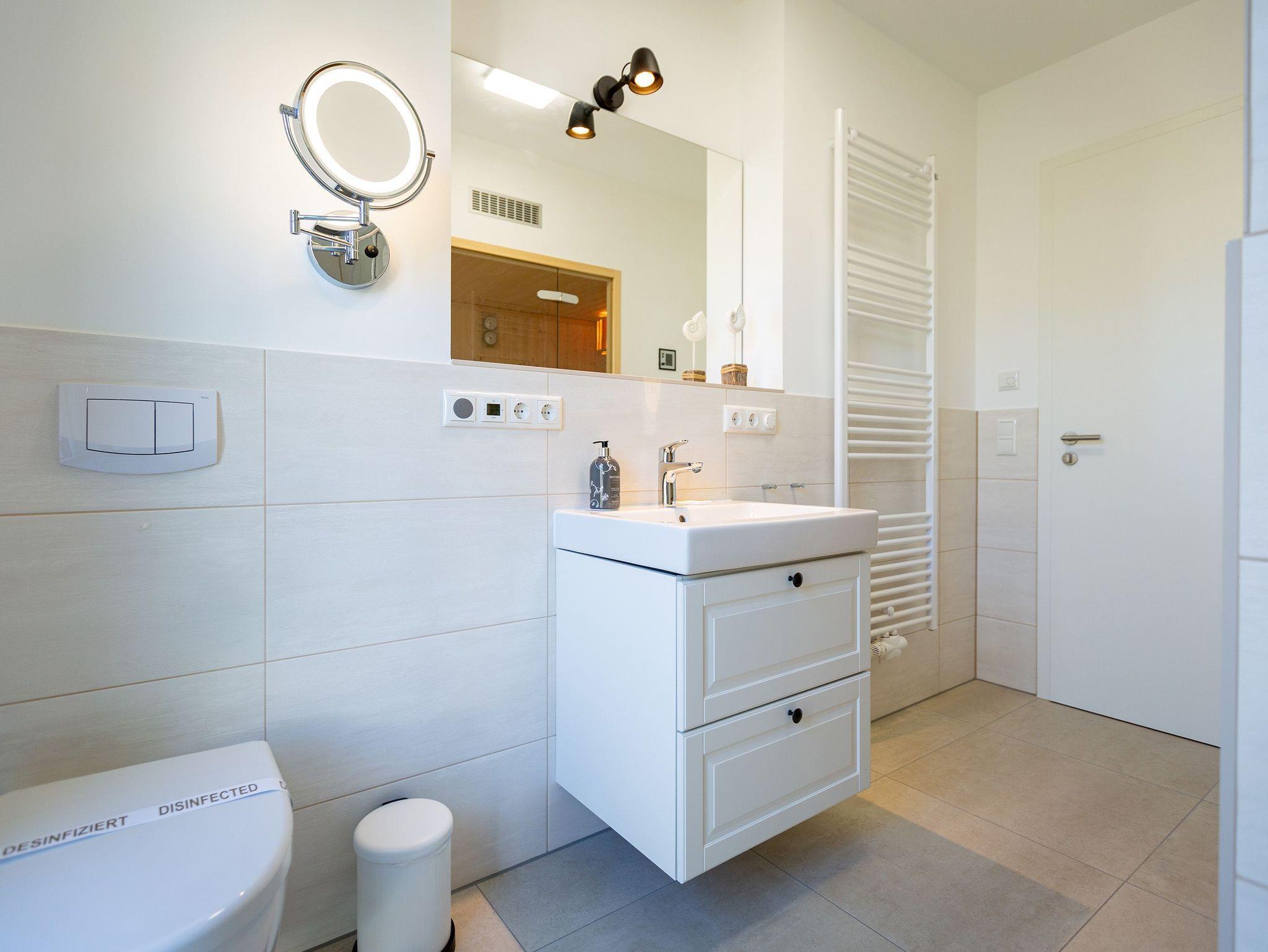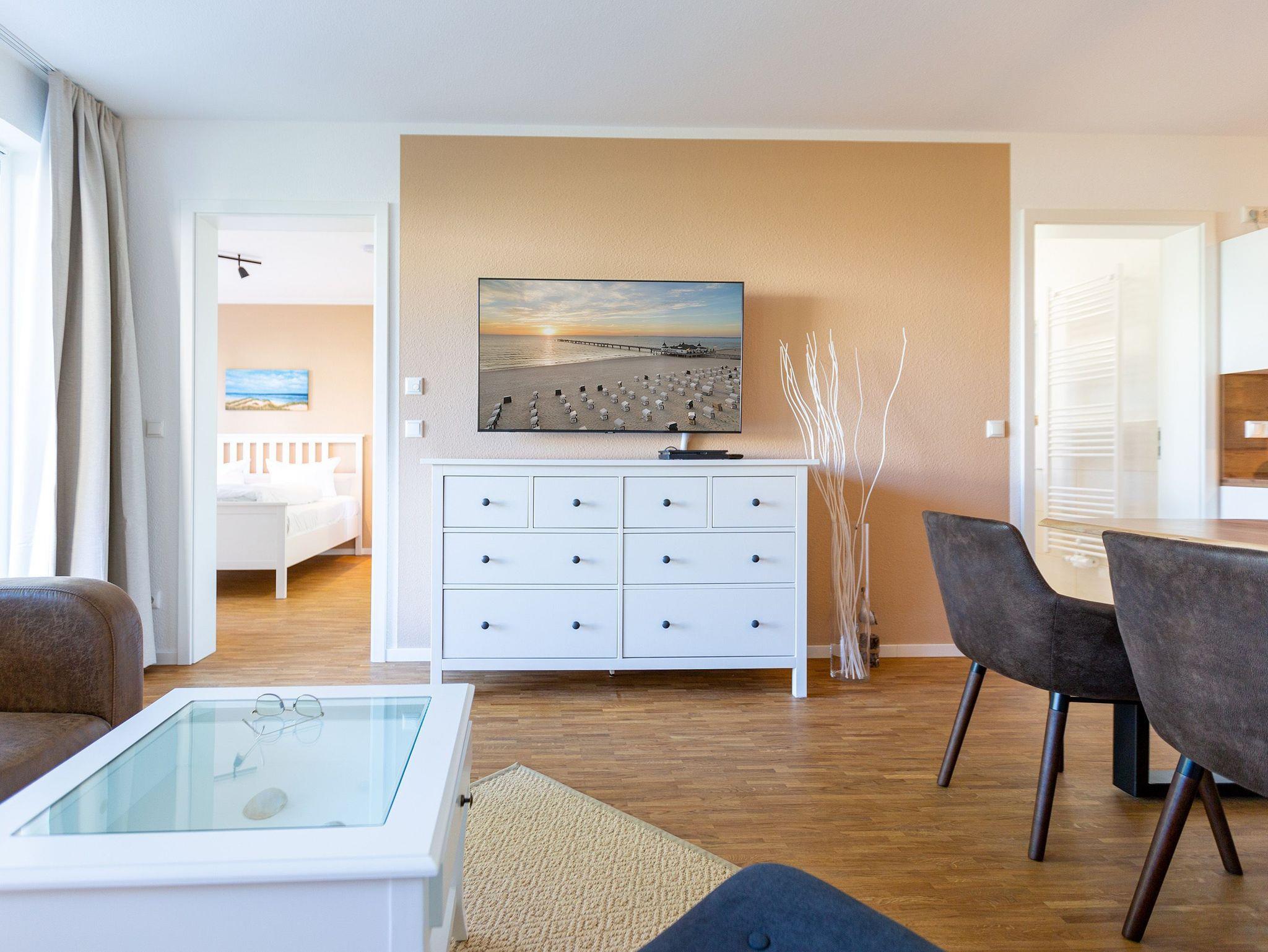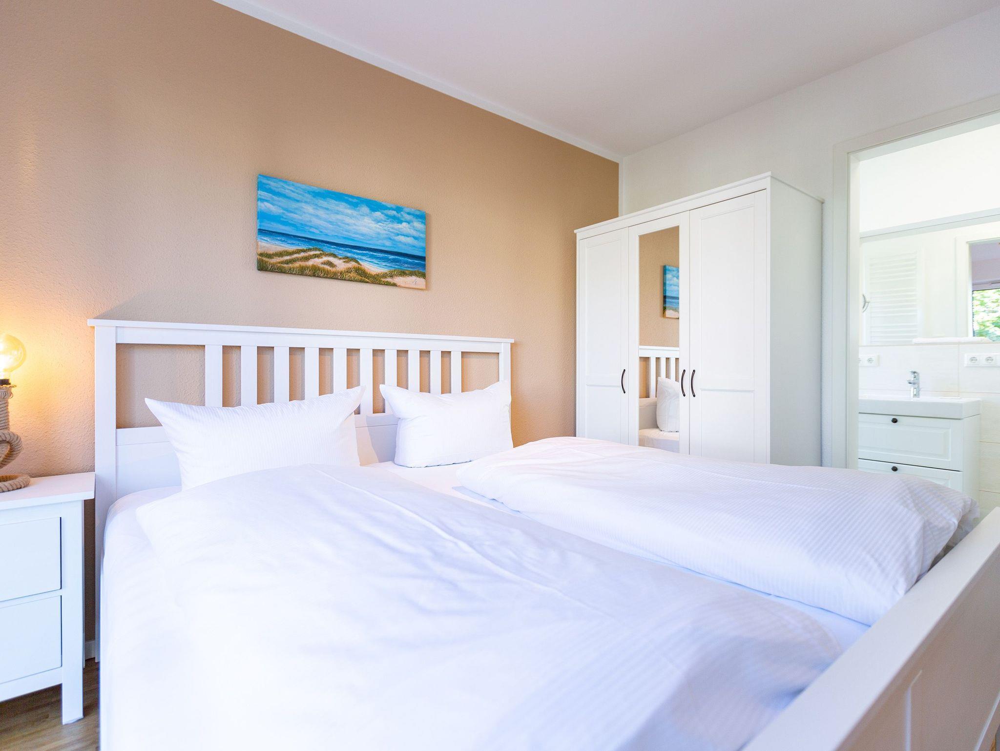 Für Ostseeluftfans bietet das 72 Quadratmeter große Ferienappartement Nummer 5 im Erdgeschoss gleich zwei Terrassen, auf denen Sie die frische Meeresbrise in vollen Atemzügen genießen können. Entspannen Sie in dem Drei-Zimmer-Traumdomizil mit bis zu vier Personen ausgiebig. Denn diese wunderschön eingerichtete Wohnung bietet alles, was man sich für einen Usedom-Urlaub nur erträumen kann. Ein großzügiges und helles Wohnzimmer lädt mit allem Wohnkomfort zum Relaxen ein. Der Sandton, der sich durch die gesamte Wohnung zieht, versetzt schon in den eigenen vier Wänden an den Strand. Eine Sitzgruppe nebst urgemütlichem Sessel ist eine ideale Faulenzzone. Der große Flat-TV an der Wand sorgt für Unterhaltung. Der Wohnbereich öffnet sich in eine moderne, mit Markengeräten vollausgestattete Küche. Ob Geschirrspüler, Mikrowelle, Herd oder Kaffeemaschine ? es ist alles aufs Feinste vorhanden. Auch erlesenes Geschirr. Am schönen, großen Echtholztisch lässt es sich wunderbar essen und plaudern. Hier sitzen Sie so gemütlich, dass der Abend lang werden kann. Überkommt Sie die Müdigkeit, wartet in den beiden Schlafzimmern je ein bequemes Doppelbett (1,80 m x 2,00 m) im schwedischen Landhaus-Stil darauf, Ihnen selig erholsame Träume zu schenken. Auch hier gibt es in jedem Zimmer einen Flat-TV. Geräumige Schränke bieten reichlich Platz für die Urlaubsgarderobe. Eines der beiden Schlafzimmer hat einen Zugang zur Nord-Ost-Terrasse (7 Quadratmeter). Die zweite, sonnenüberflutete Süd-Ost-Terrasse (7 Quadratmeter) ist vom Wohnzimmer aus zugänglich. Hier können Sie sogar in der Morgensonne frühstücken. Die Ferienwohnung verfügt über zwei Bäder. Beide sind mit einer Dusche, WC und Waschtisch ausgestattet. Freuen Sie sich zudem über eine kleine Wellness-Oase. Denn das Masterbad beherbergt eine finnische Sauna. Ideal also für kühle Abende oder trübe Tage. Handtücher liegen bei Ihrer Anreise bereit. Und auch die Betten sind bereits bezogen. Sollten Sie im Urlaub einmal waschen müssen, so ist dies mit der Waschmaschine möglich, die zur Wohnungsausstattung gehört. Das WLAN können Sie kostenfrei nutzen. In der Tiefgarage ist ein Stellplatz für Sie reserviert.