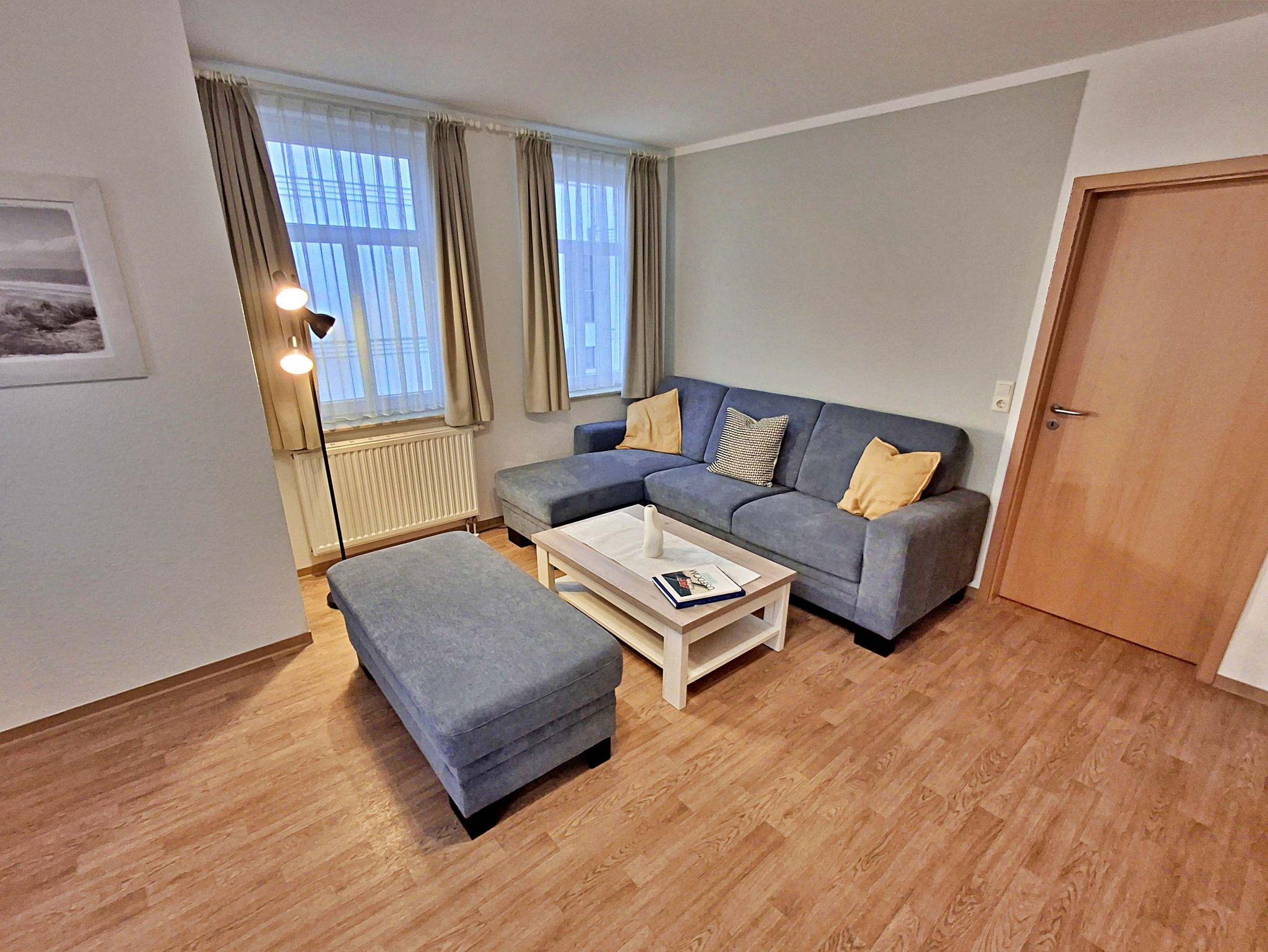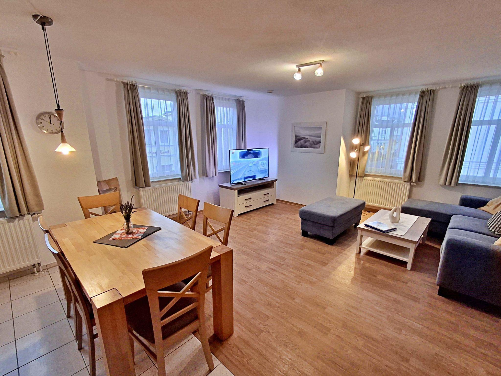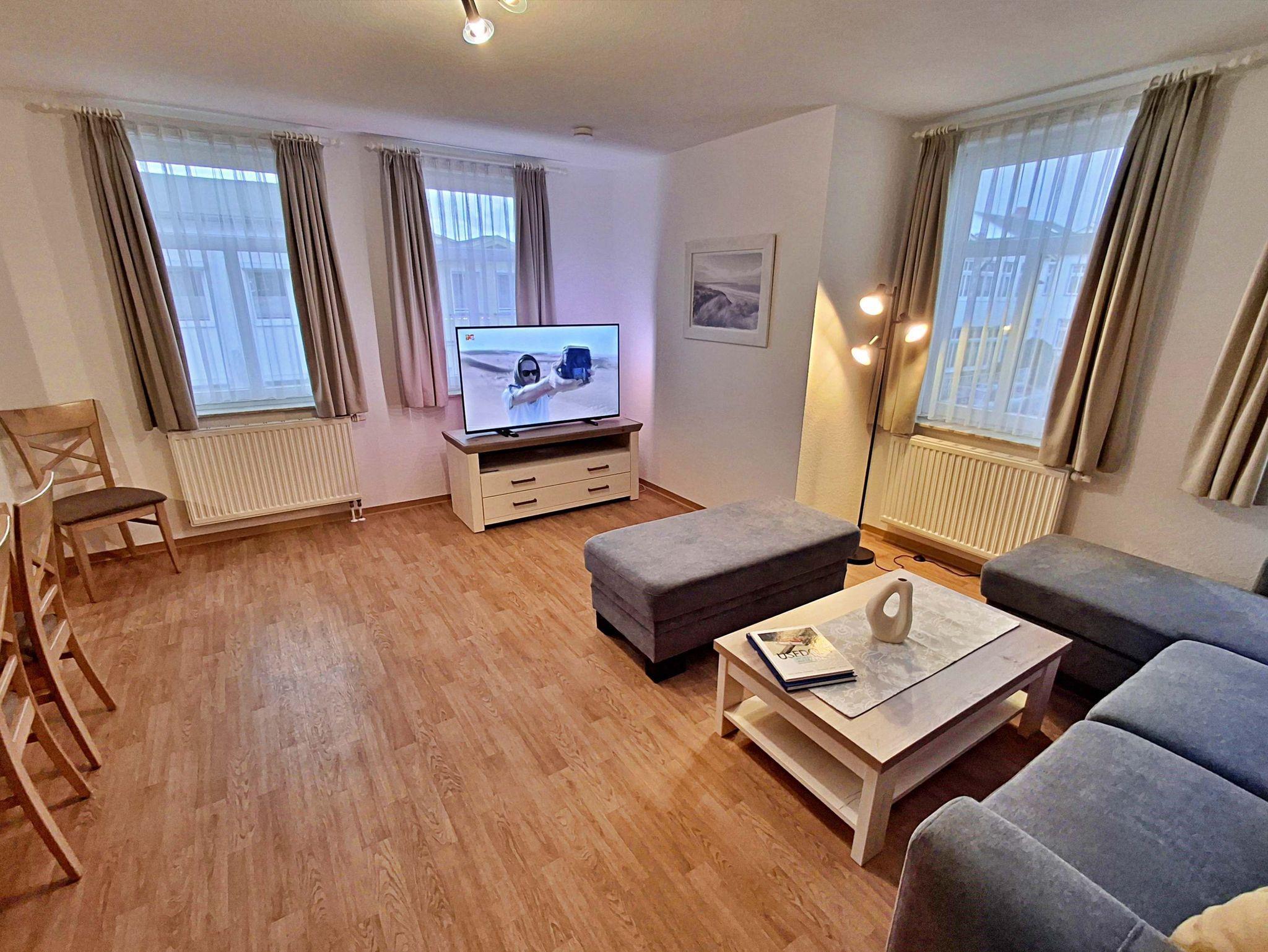 Die moderne 3-Zimmer-Wohnung Ückeritz für max. 3 Erwachsene und 1 Kind bis 16 Jahre befindet sich in der ersten Etage m Haus am Kurpark - nur wenige Schritte von der Promenade und dem Strand entfernt. Im Wohnbereich befinden sich neben der gemütlichen Couch auch ein Esstisch mit 6 Stühlen, der genügend Platz bietet. Die moderne Küchenzeile mit Ceranherd, Backofen, Geschirrspüler, Mikrowelle, Kaffeemaschine, Wasserkocher und Toaster lässt keine Wünsche offen. Für die Unterhaltung sorgen ein moderner Flachbild-TV und kostenfreies W-LAN. Das 1. Schlafzimmer verfügt über ein Doppelbett und das zweite Schlafzimmer über 2 Einzelbetten. Das Badezimmer hat Badewanne/WC.