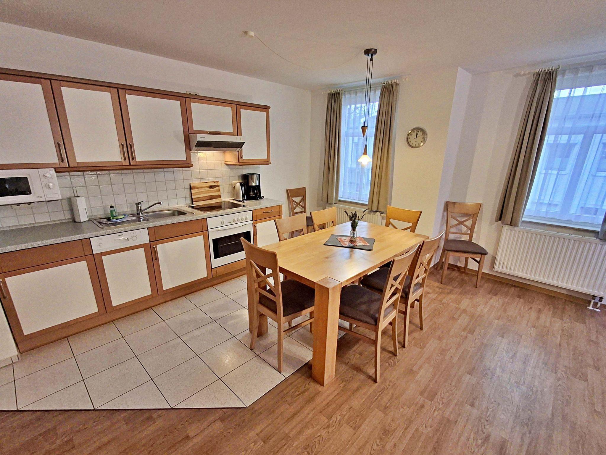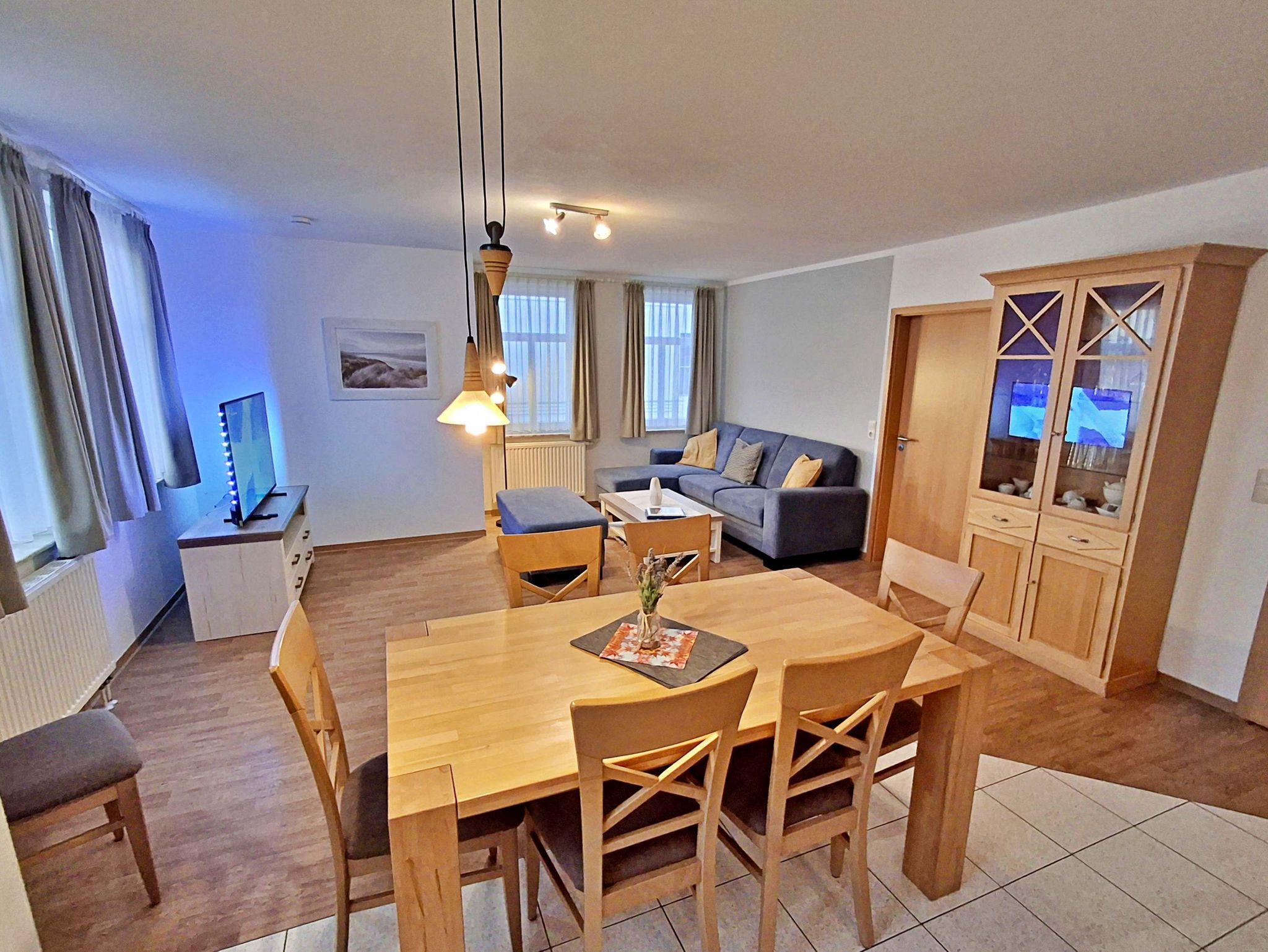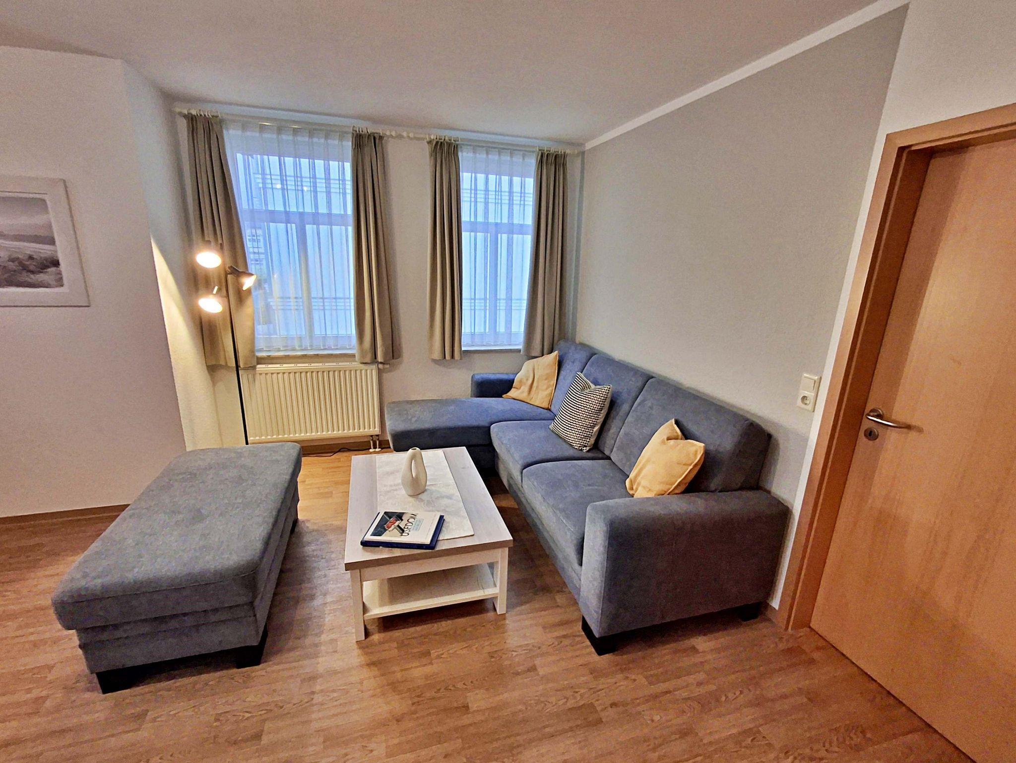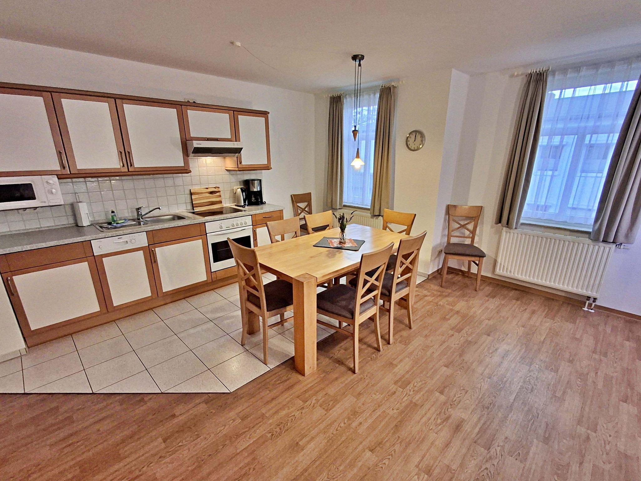 Die moderne 3-Zimmer-Wohnung Ückeritz für max. 3 Erwachsene und 1 Kind bis 16 Jahre befindet sich in der ersten Etage m Haus am Kurpark - nur wenige Schritte von der Promenade und dem Strand entfernt. Im Wohnbereich befinden sich neben der gemütlichen Couch auch ein Esstisch mit 6 Stühlen, der genügend Platz bietet. Die moderne Küchenzeile mit Ceranherd, Backofen, Geschirrspüler, Mikrowelle, Kaffeemaschine, Wasserkocher und Toaster lässt keine Wünsche offen. Für die Unterhaltung sorgen ein moderner Flachbild-TV und kostenfreies W-LAN. Das 1. Schlafzimmer verfügt über ein Doppelbett und das zweite Schlafzimmer über 2 Einzelbetten. Das Badezimmer hat Badewanne/WC.