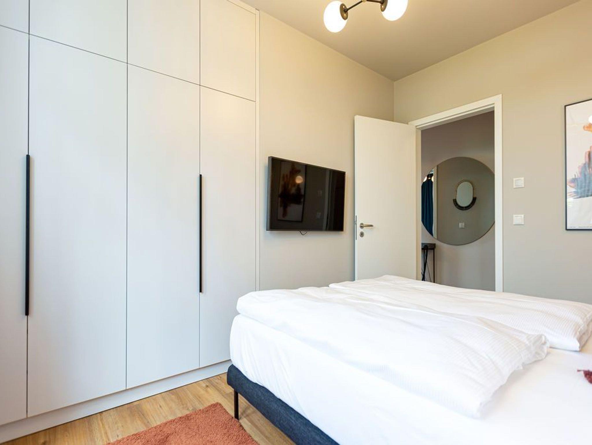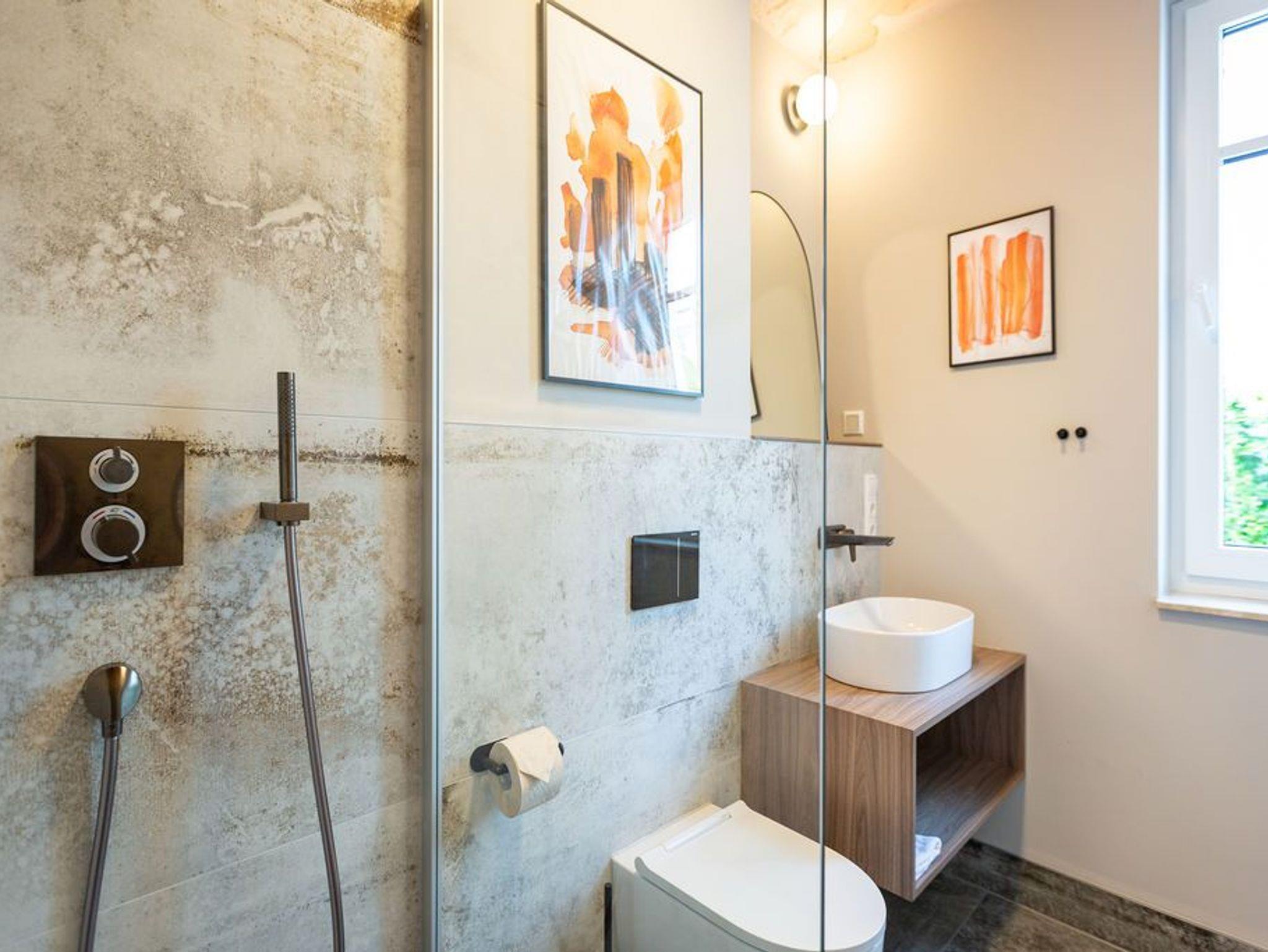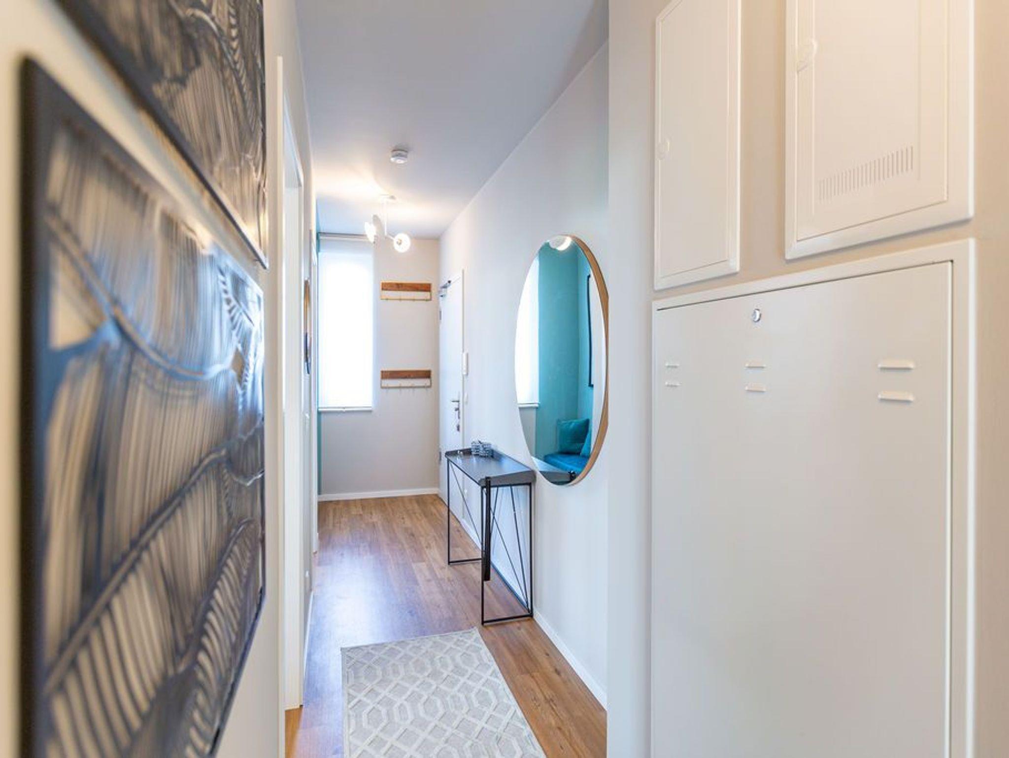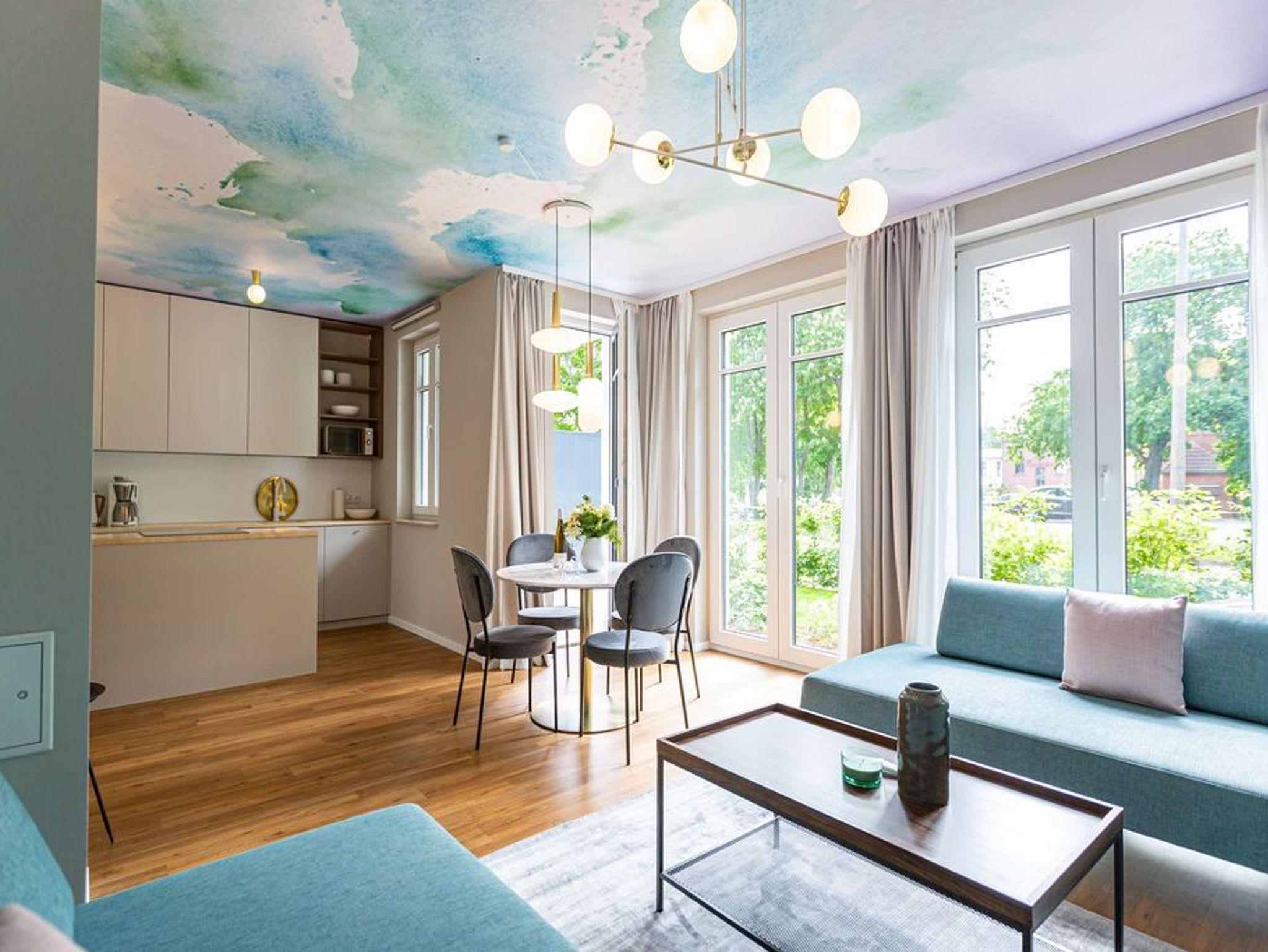 Ein Appartement, das mit seinen 75 Quadratmetern bis zu vier Personen viel Platz und das gewisse Etwas bietet. Tie Dye - Dank Designern wie Stella McCartney oder Cristiano Burani ist die alt-indonesische Färbemethode heute so angesagt wie nie. In diesem wunderschönen Urlaubsdomizil finden Sie genau das: Freiheit, Lebensgefühl und Maritime Farben. Wer es bunt in seinem Leben mag, der wird sich in dem Drei-Zimmer-Appartement im Erdgeschoss des neu gebauten Strandhauses wohl fühlen. Denn Batik-Elemente ziehen sich wie ein Rankengewächs durch jeden Raum. Es ist ein Gefühl, als schwebe man schon in den vier Wänden auf Zeit im Wasser der Ostsee. Draußen auf der Terrasse (5 Quadratmeter) können Sie das Meeresrauschen sicher schon vernehmen. Das große und helle Wohn-Ess-Zimmer ist mit viel Liebe eingerichtet. Zwei Sofas laden zum Relaxen ein. Ein Flat-TV sorgt auf Wunsch für Unterhaltung. Wollen Sie nicht auf der Terrasse essen, können Sie dies auf den gemütlichen Stühlen am Esstisch im Wohnzimmer tun. Alles, was Sie für die Zubereitung benötigen, finden Sie in der zum Wohnzimmer hin offenen Küche. Mikrowelle, Toaster, Herd, Spülmaschine und sogar eine Waschmaschine befinden sich dort. In den Schränken ist ein komplettes Geschirr-Set vorhanden. Das Appartement verfügt über zwei Schlafzimmer. Beide sind mit je einem Boxspringdoppelbett (1,60 m x 2,00 m), eigens angefertigten Schränken mit geräumigem Innenleben und einem Flat-TV ausgestattet. Die beiden Bäder haben modernsten Komfort. Eines der Bäder verfügt über eine Dusche, das andere hat eine Badewanne. Das WLAN im Haus ist kostenfrei nutzbar. In der Tiefgarage ist der Stellplatz Nummer 1 (relativ eng) für Sie reserviert. Bei Anreise sind die Betten bezogen und Handtücher liegen bereit..