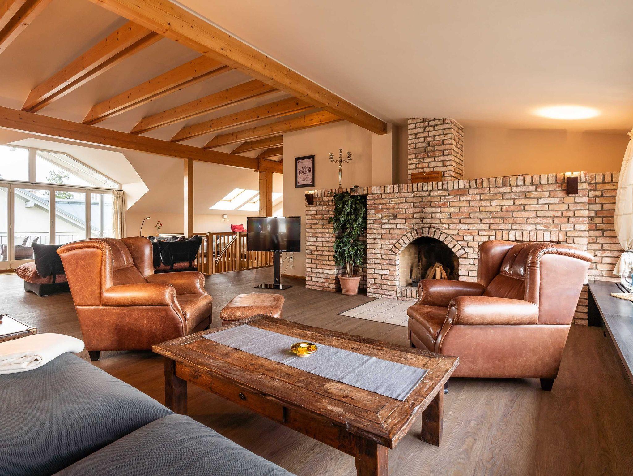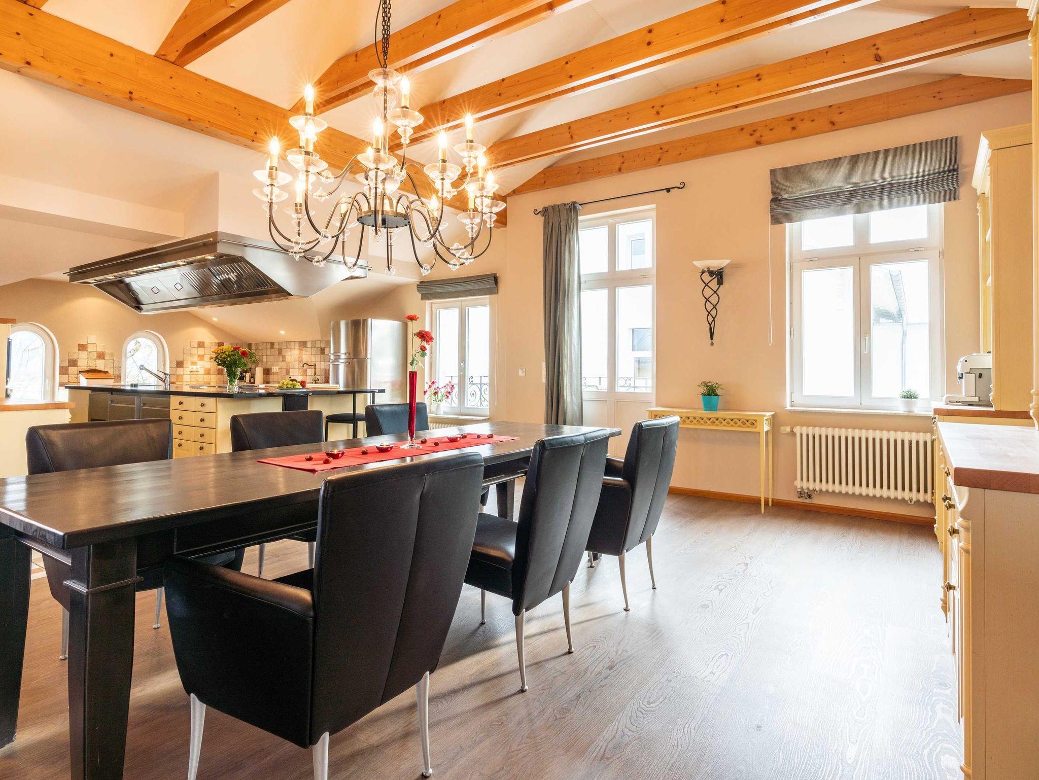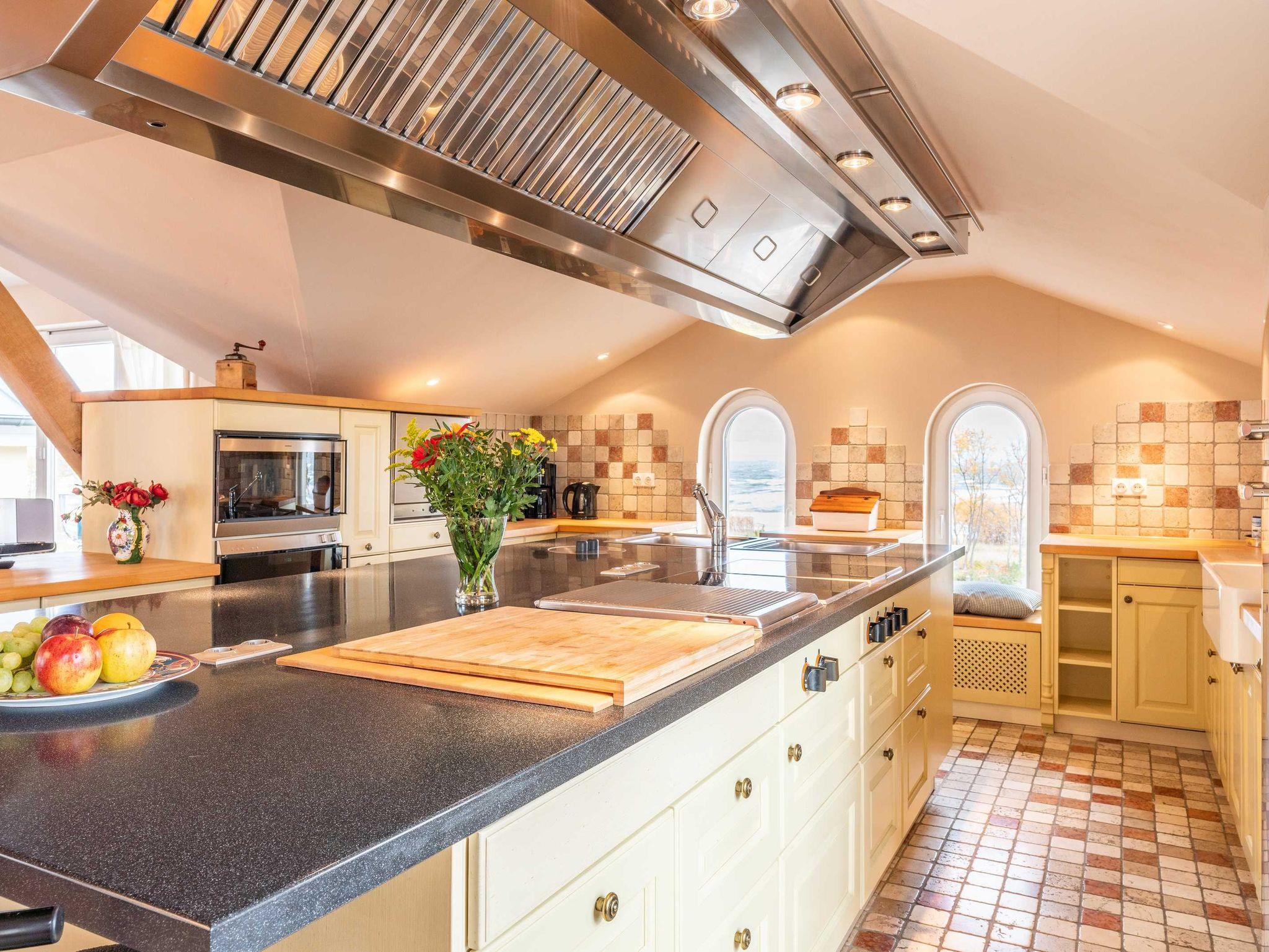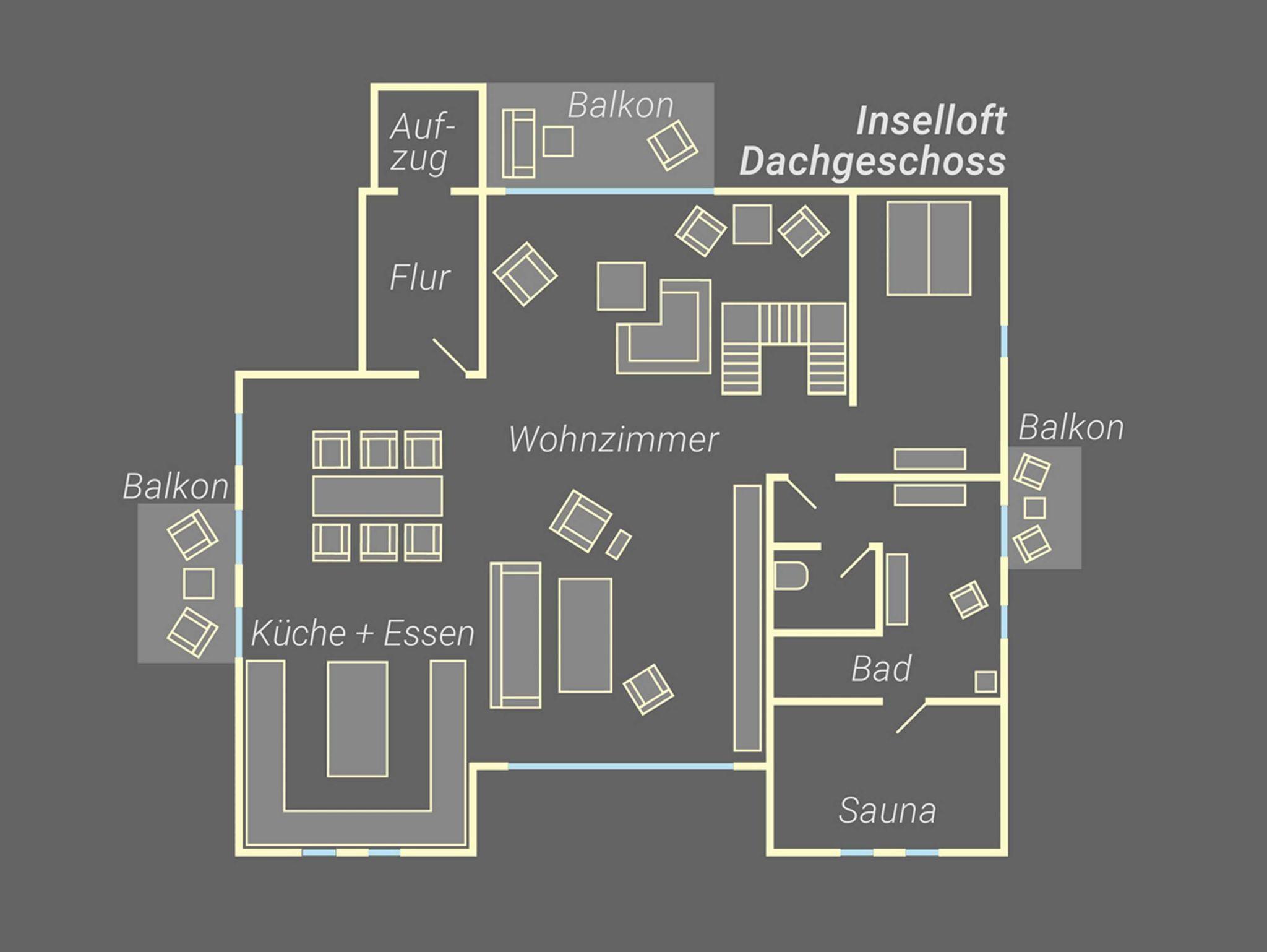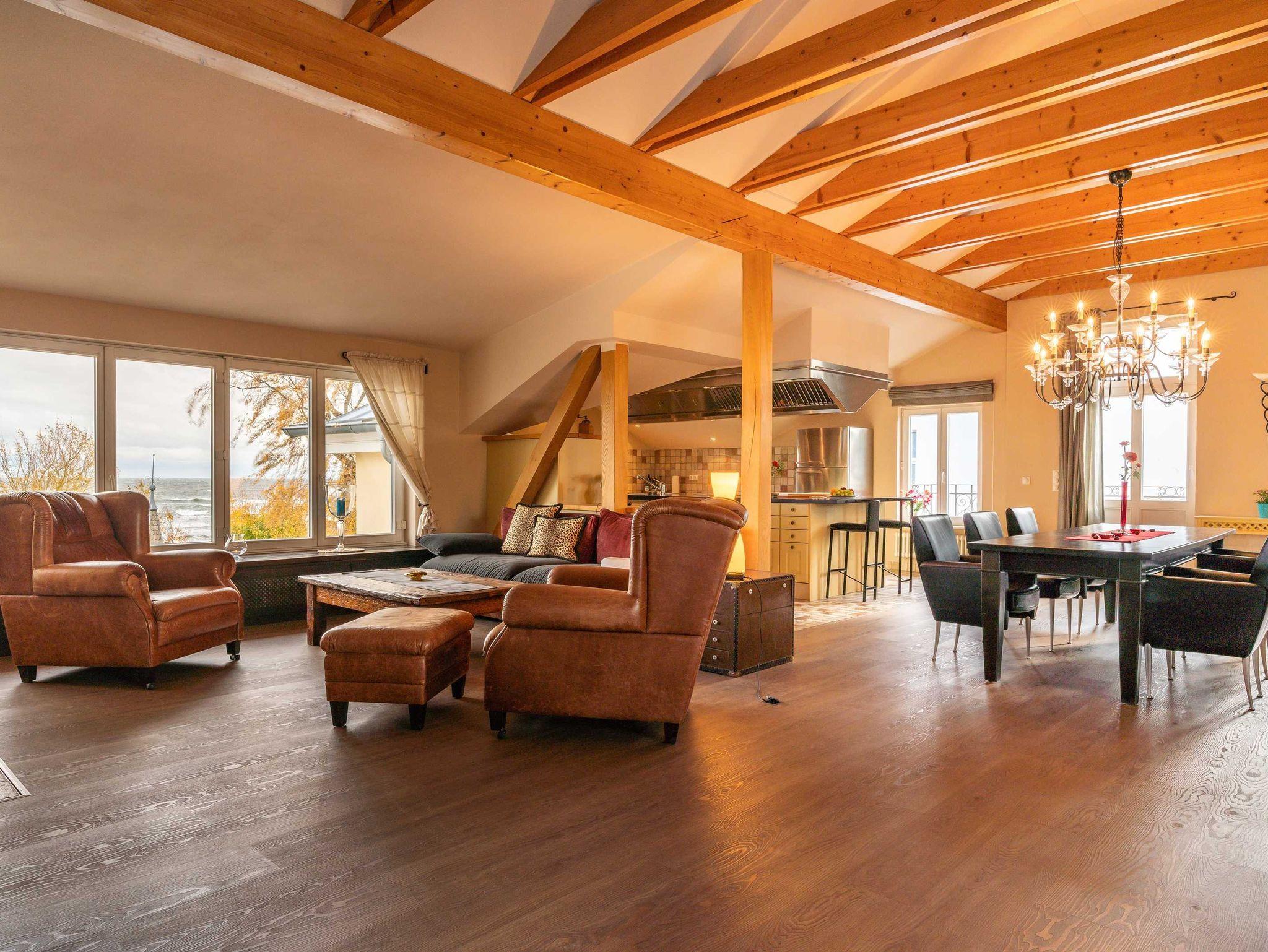 Das 220 qm Appartement Inselloft über zwei Etagen ist direkt mit dem Aufzug erreichbar. Die obere Etage ist rollstuhlgeeignet, hier befinden sich das großzügige Wohnzimmer mit einer großen Wohnlandschaft und Kamin sowie eine vier Meter breite Fensterfront mit Blick auf die Ostsee. Wenn das Wetter es zulässt können Sie die Fenster in der gesamten Breite öffnen. Den tollen Meerblick genißen Sie auch von der geräumige offene Küche, die selbst für einen Profi-Koch keine Wünsche offen lässt, sie ist mit Profigeräten von Gaggenau ausgestattet und einem großen Esstisch ausgestattet.
