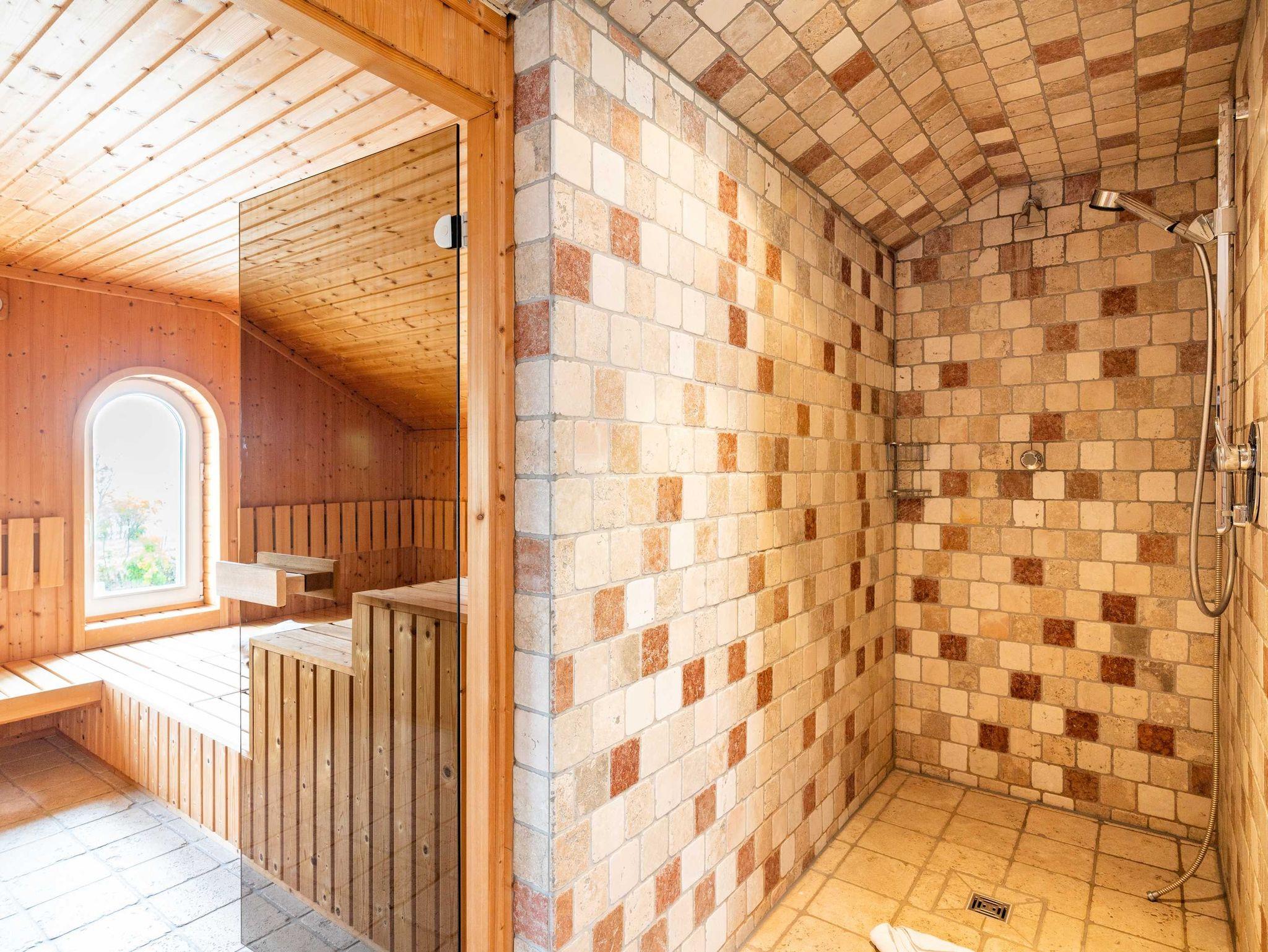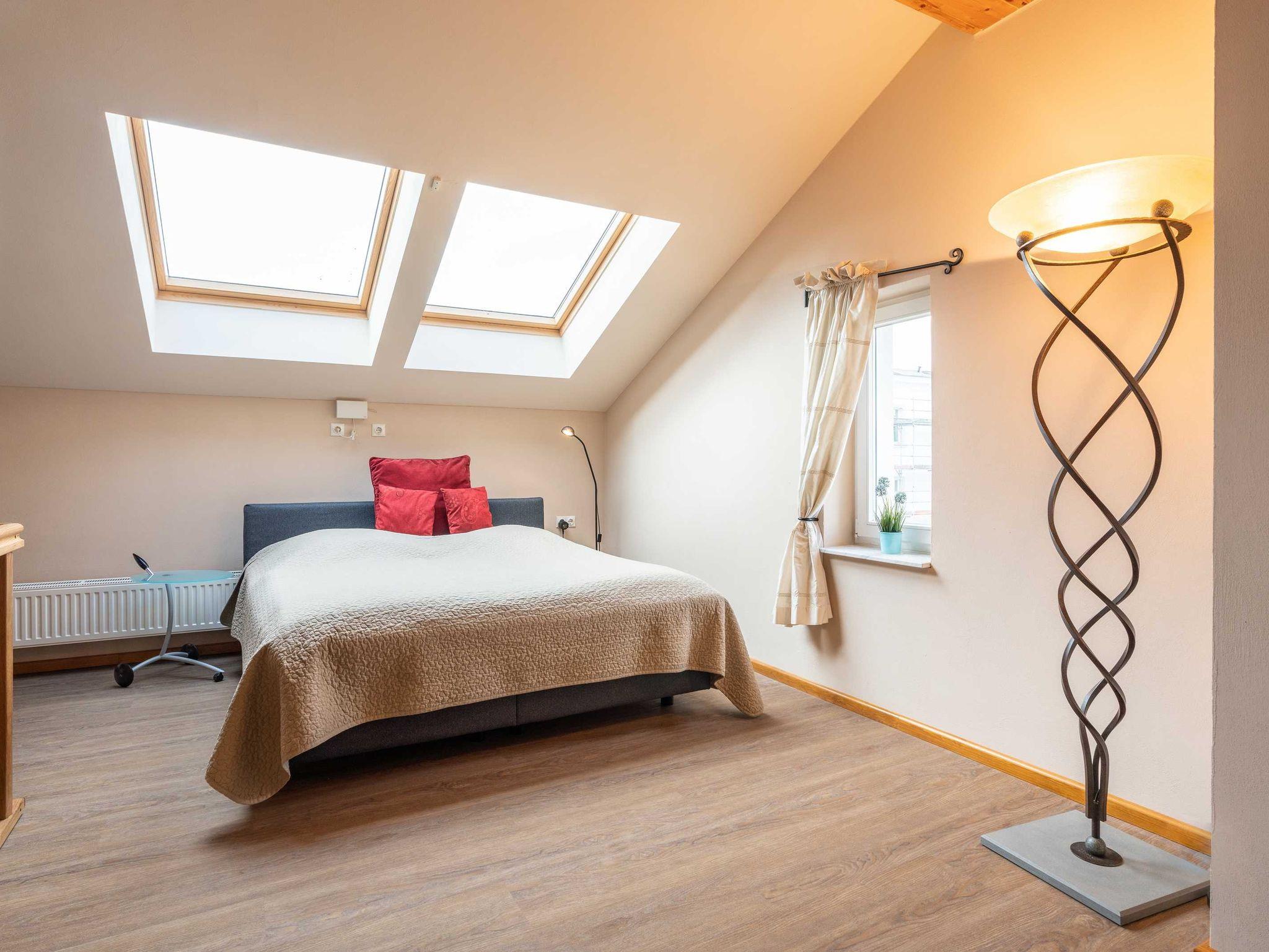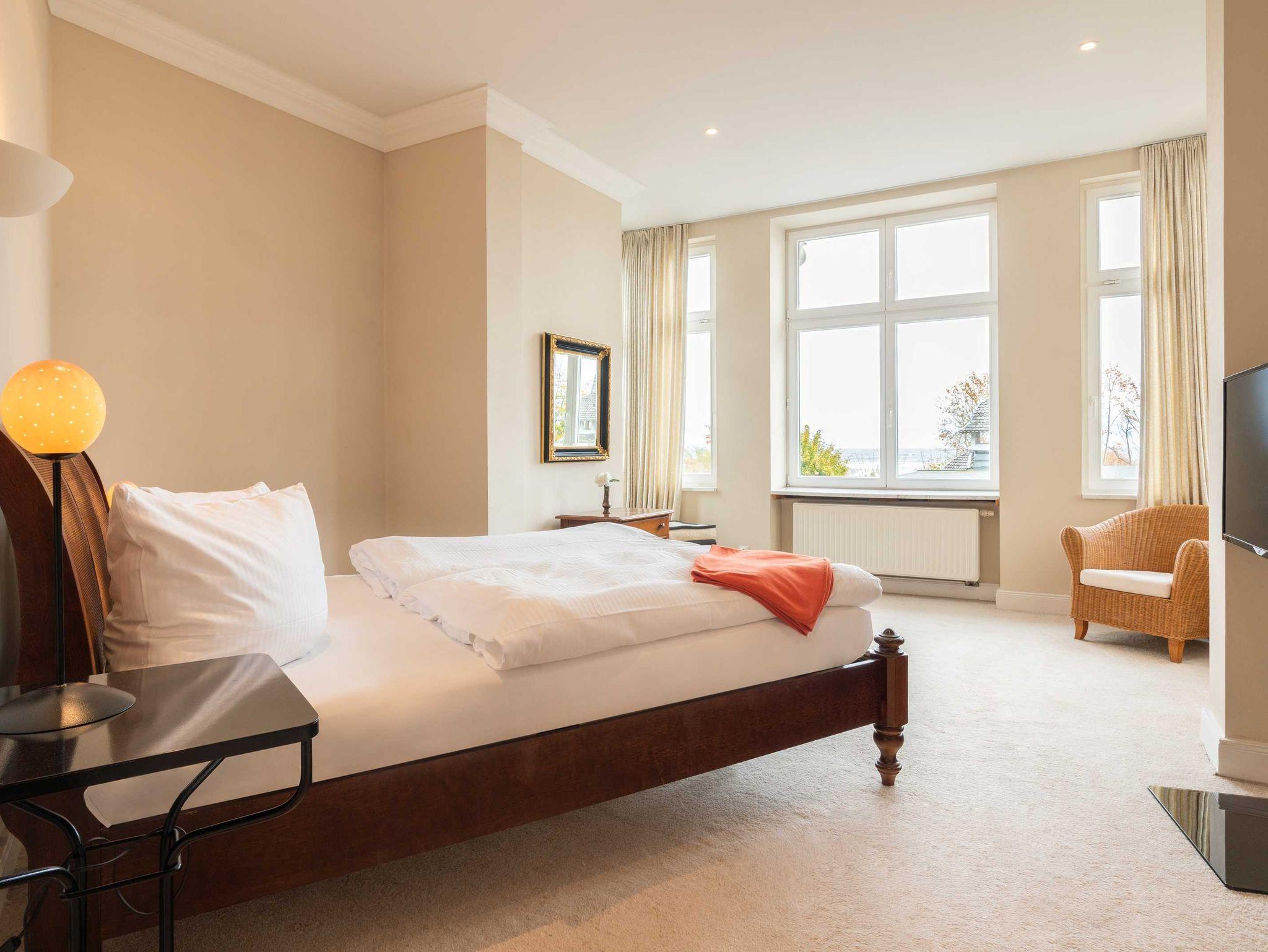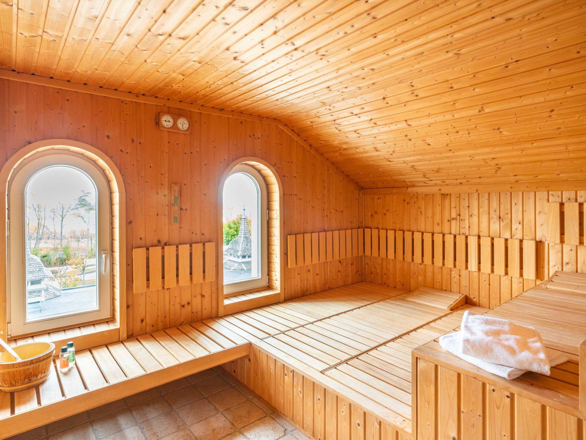 Ein gemütliches Doppelbett befindet sich als Schlafmöglichkeit auf dieser Etage in einem separaten Raum. Die Sauna mit Meerblick und Dusche/WC befindet sich ebenfalls in dieser Etage. Durch die drei Balkone und die Glasfront zur Meerseite kann man aus fast allen Räumlichkeiten den Blick zur Ostsee genießen.