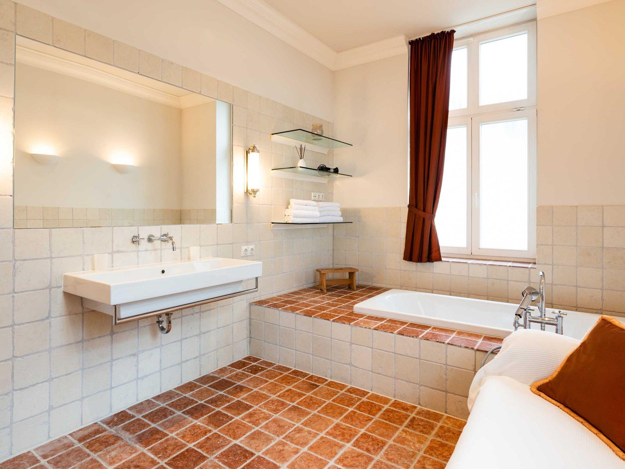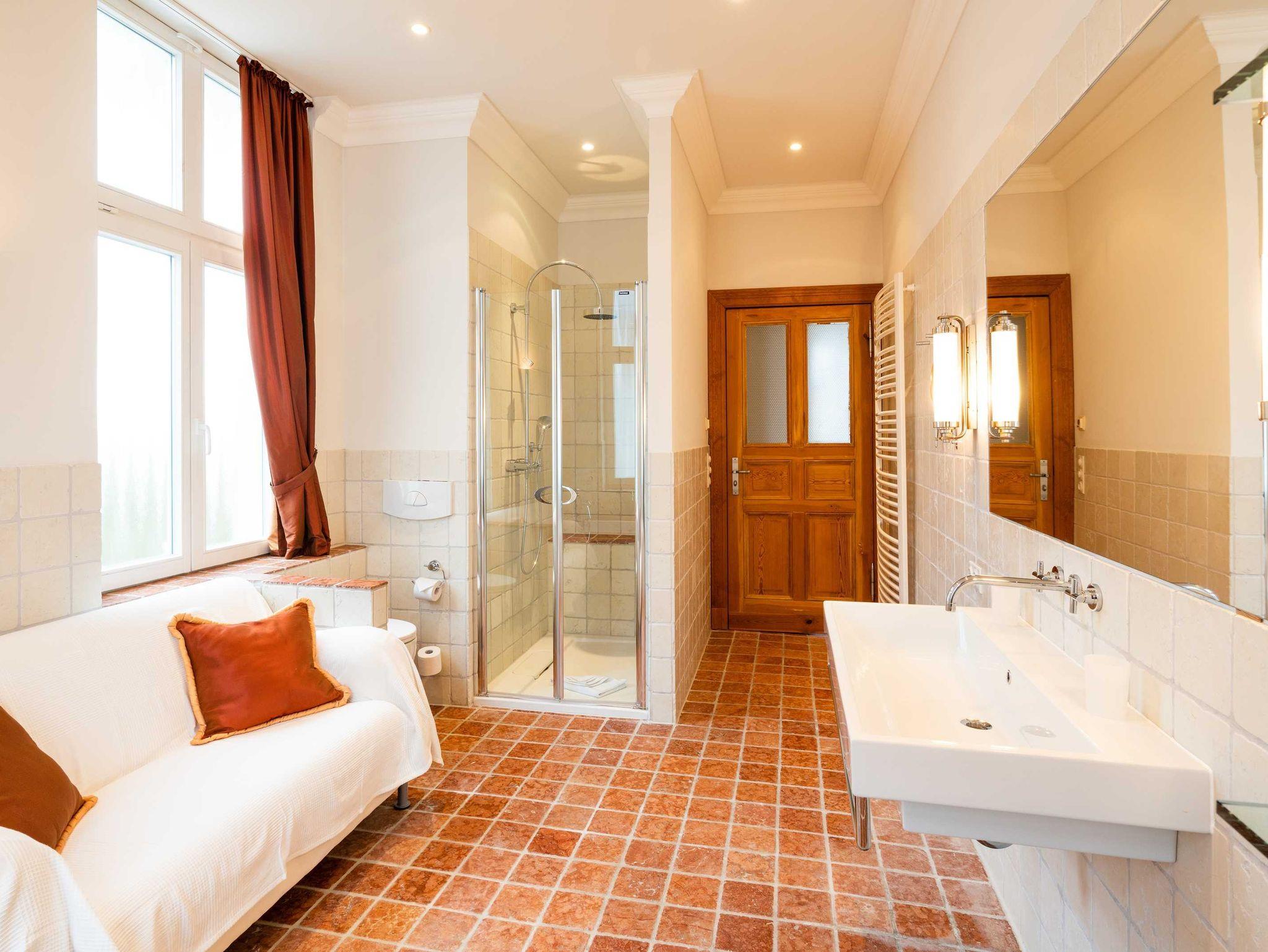 Im unteren Geschoss des Appartements befinden sich 2 weitere Schlafzimmer (mit jeweils einem Doppelbett) und das Bad (En-Suite-Bad) mit Wanne, eine große begehbare Dusche mit Deckenbrause und WC.