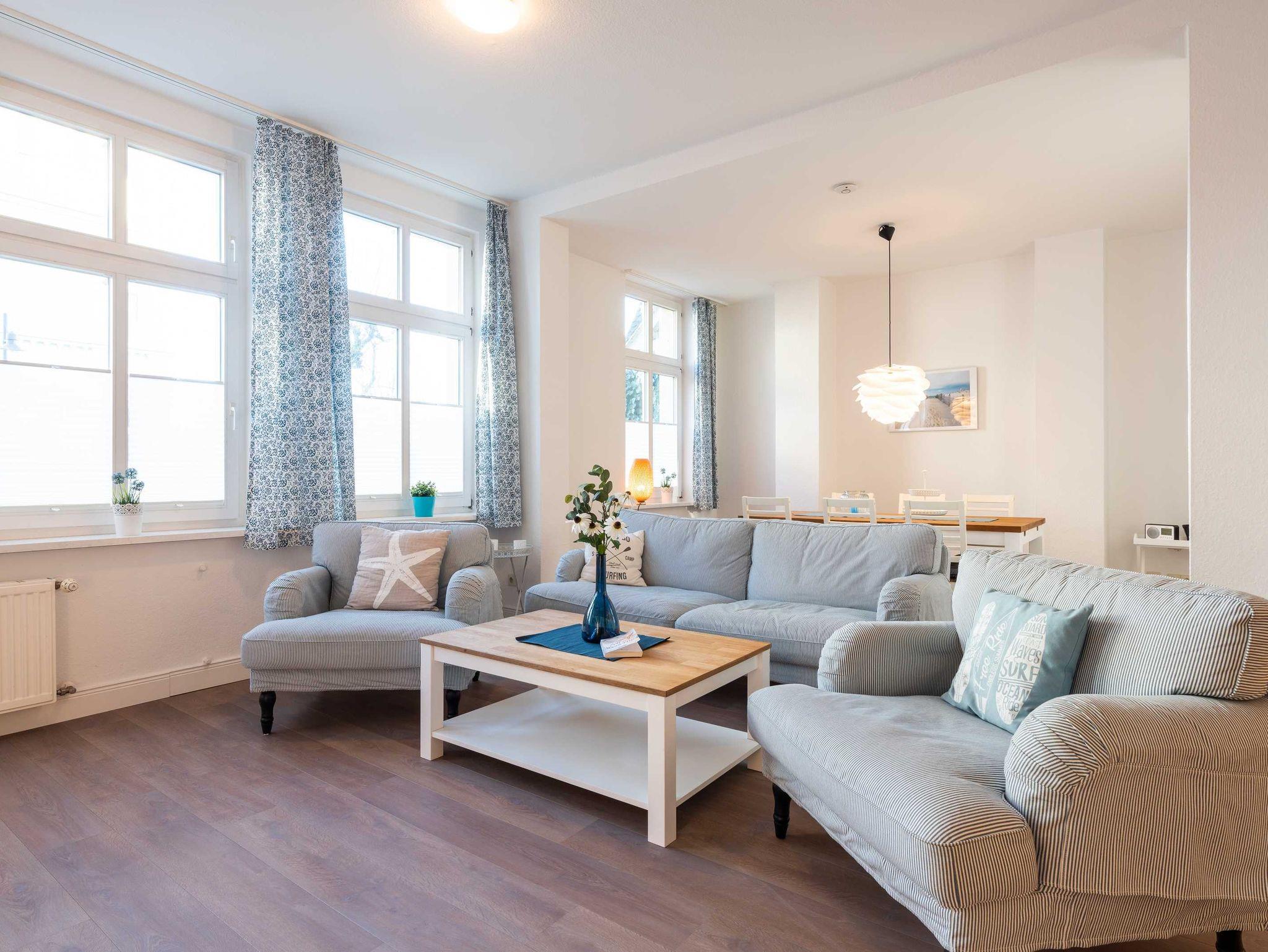 Das 85 qm große Appartement Seestern verfügt über geräumiges Wohnzimmer mitgemütlicher Wohnlandschaft und einen großen Essplatz. Die offene Küche ist komplett mit Spülmaschine, Mikrowelle, Herd und Backofen ausgestattet und lässt keine Wünsche offen, um eine tolle Mahlzeit zuzubereiten.