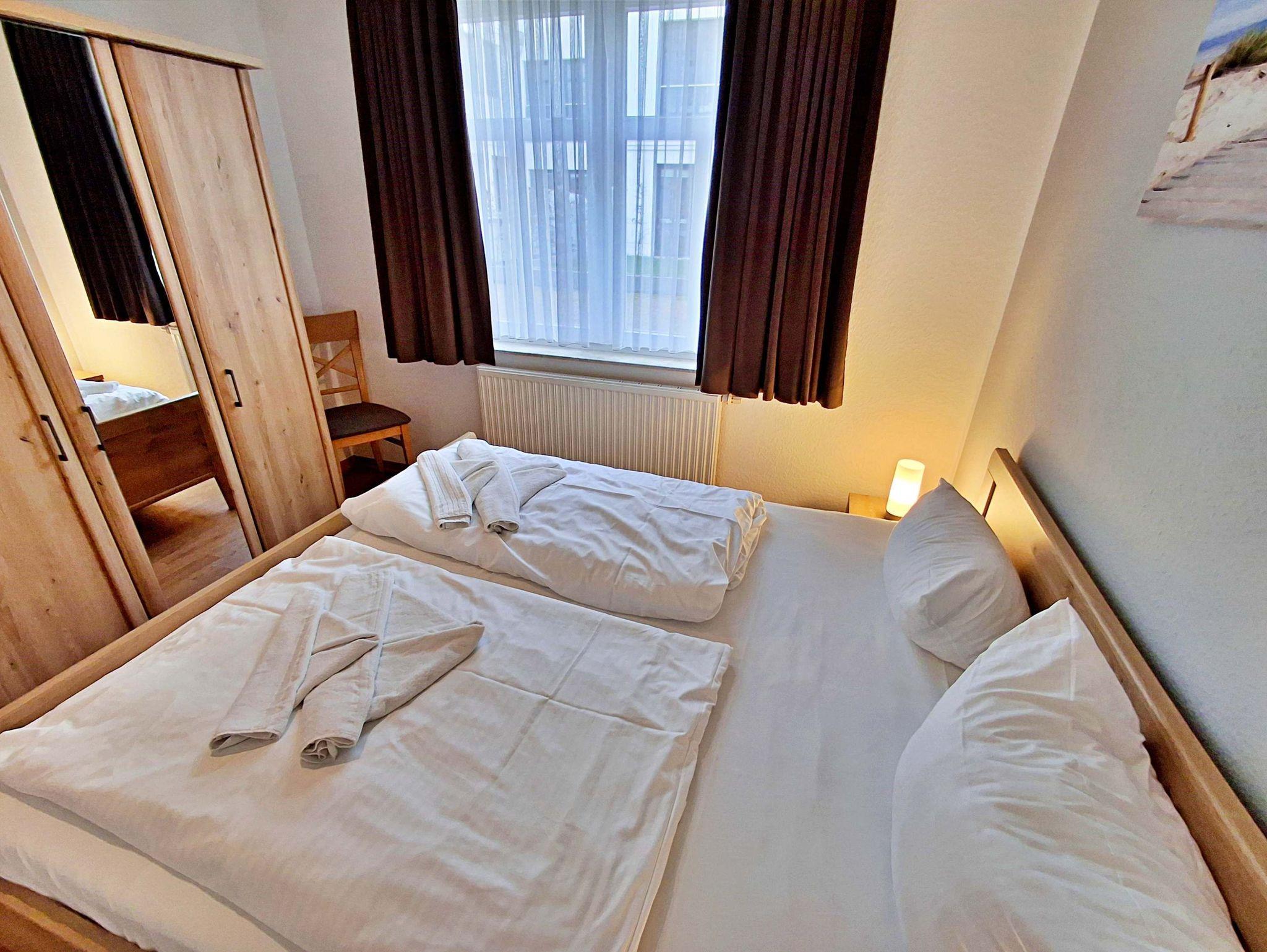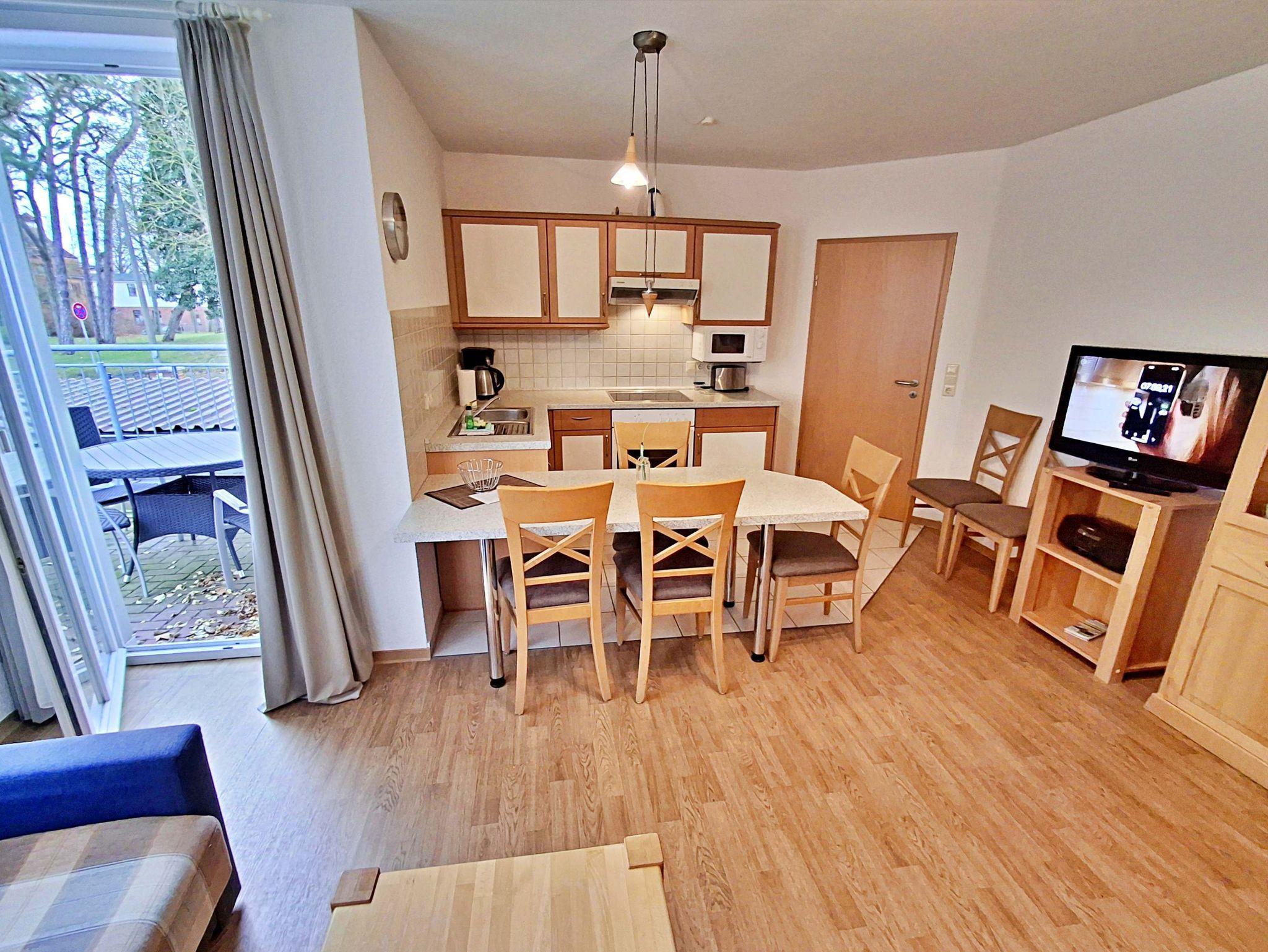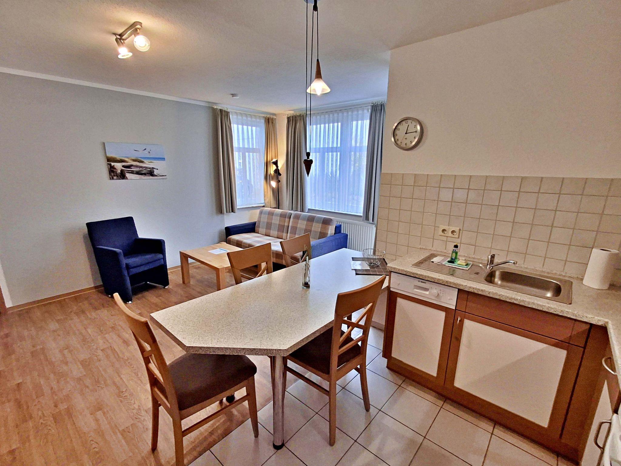 Die charmante 3-Zimmer-Wohnung Heringsdorf mit Terrasse für max. 4 Erwachsene und 1 Kleinkind bis 3 Jahre befindet im Haus am Kurpark - nur wenige Schritte von der Promenade und dem Strand entfernt. Im Wohnbereich befinden sich neben der gemütlichen Couch auch ein Sessel sowie ein Esstisch mit 4 Stühlen, der genügend Platz für 4 Personen bietet. Vom Wohnbereich aus gelangen Sie auf die Terrasse, welche sich zur Hofseite gelegen befindet. Hier können Sie bei schönem Wetter bereits morgens Ihren Kaffee genießen oder den Abend bei einem Glas Wein ausklingen lassen können. Die moderne Küchenzeile mit Ceranherd, Backofen, Geschirrspüler, Mikrowelle, Kaffeemaschine, Wasserkocher und Toaster lässt keine Wünsche offen. Für die Unterhaltung sorgen ein Flachbild-TV, Radio-CD-Player und kostenfreies W-LAN. Das 1. Schlafzimmer verfügt über ein Doppelbett und das zweite Schlafzimmer über 2 Einzelbetten. Das Badezimmer hat DU/WC.
