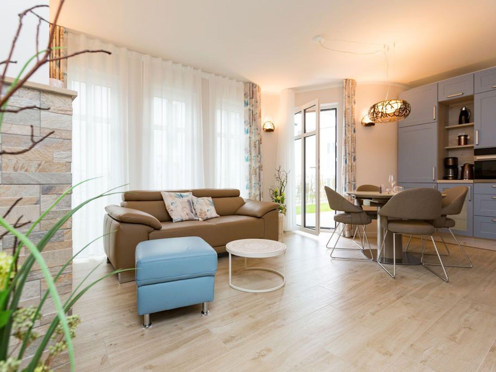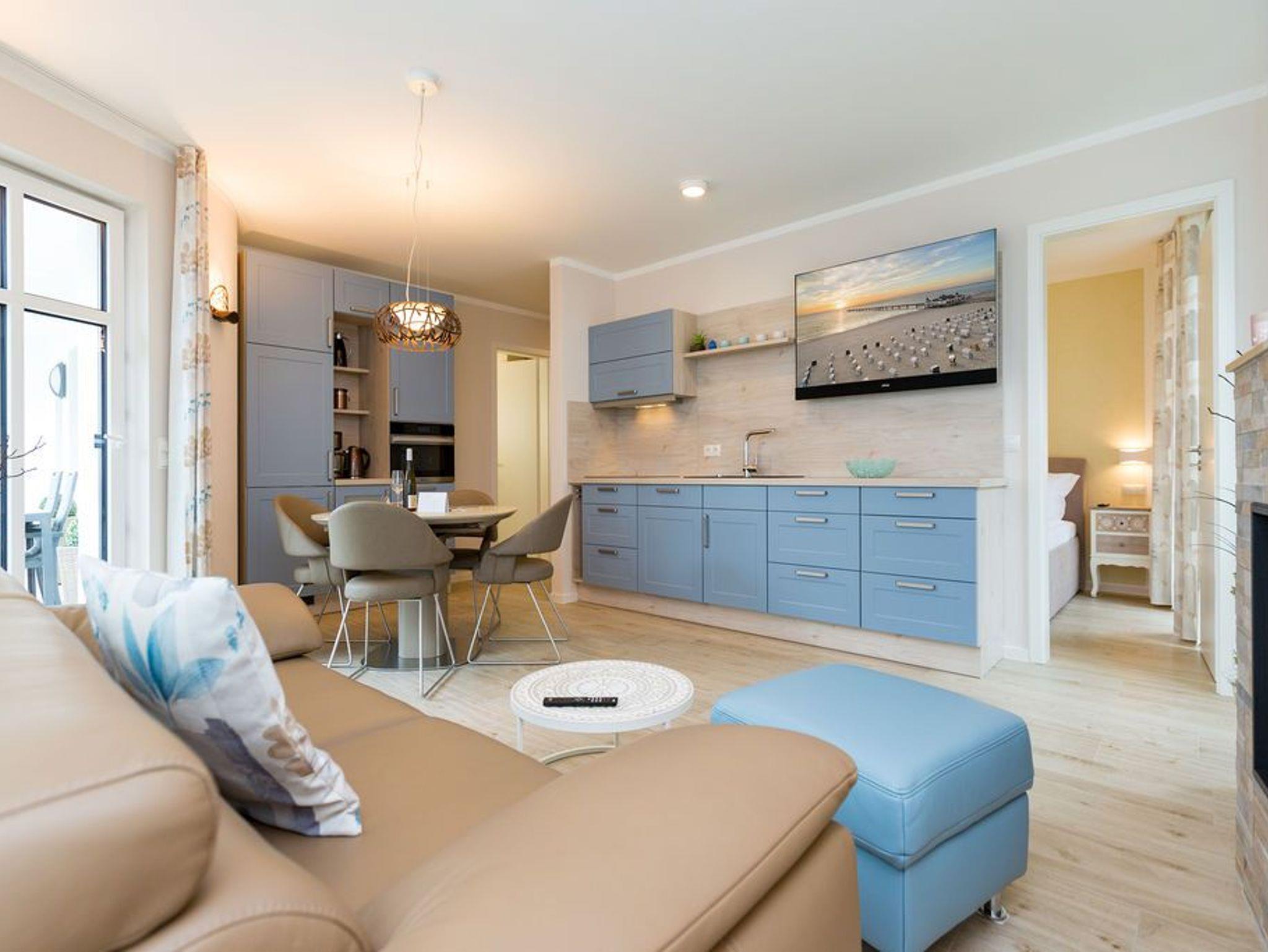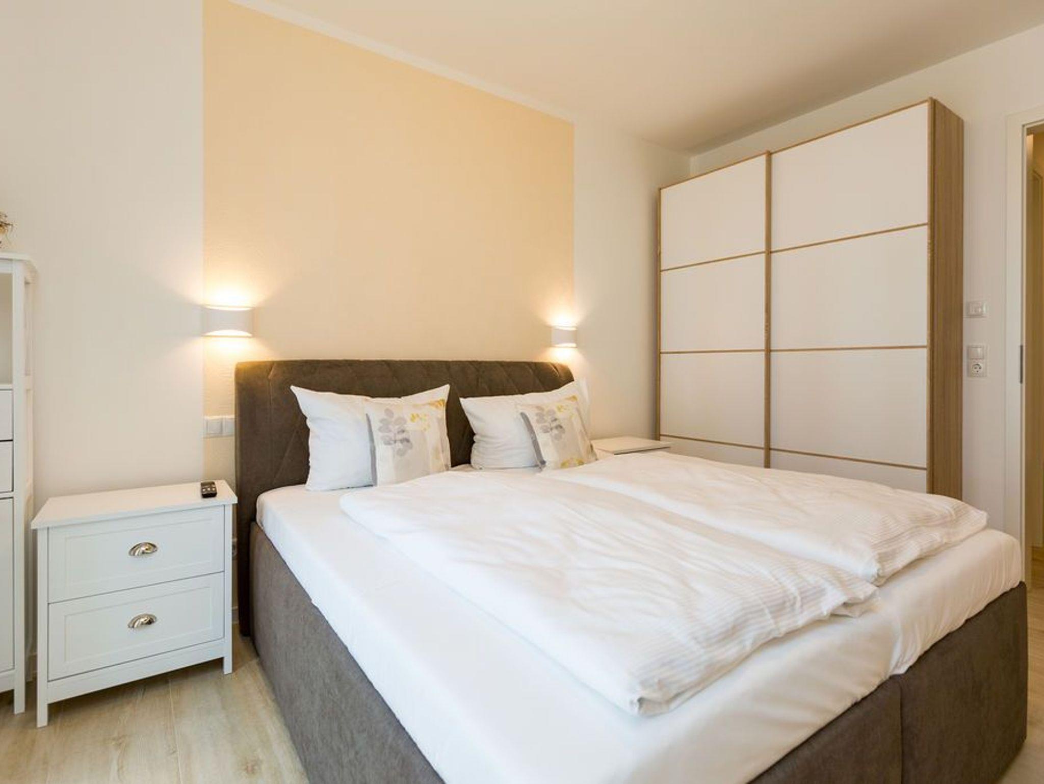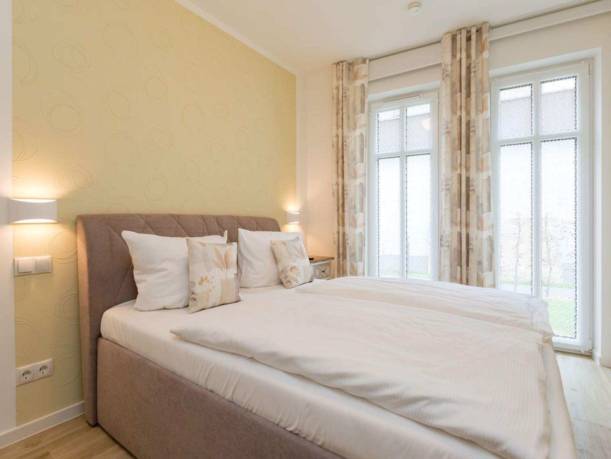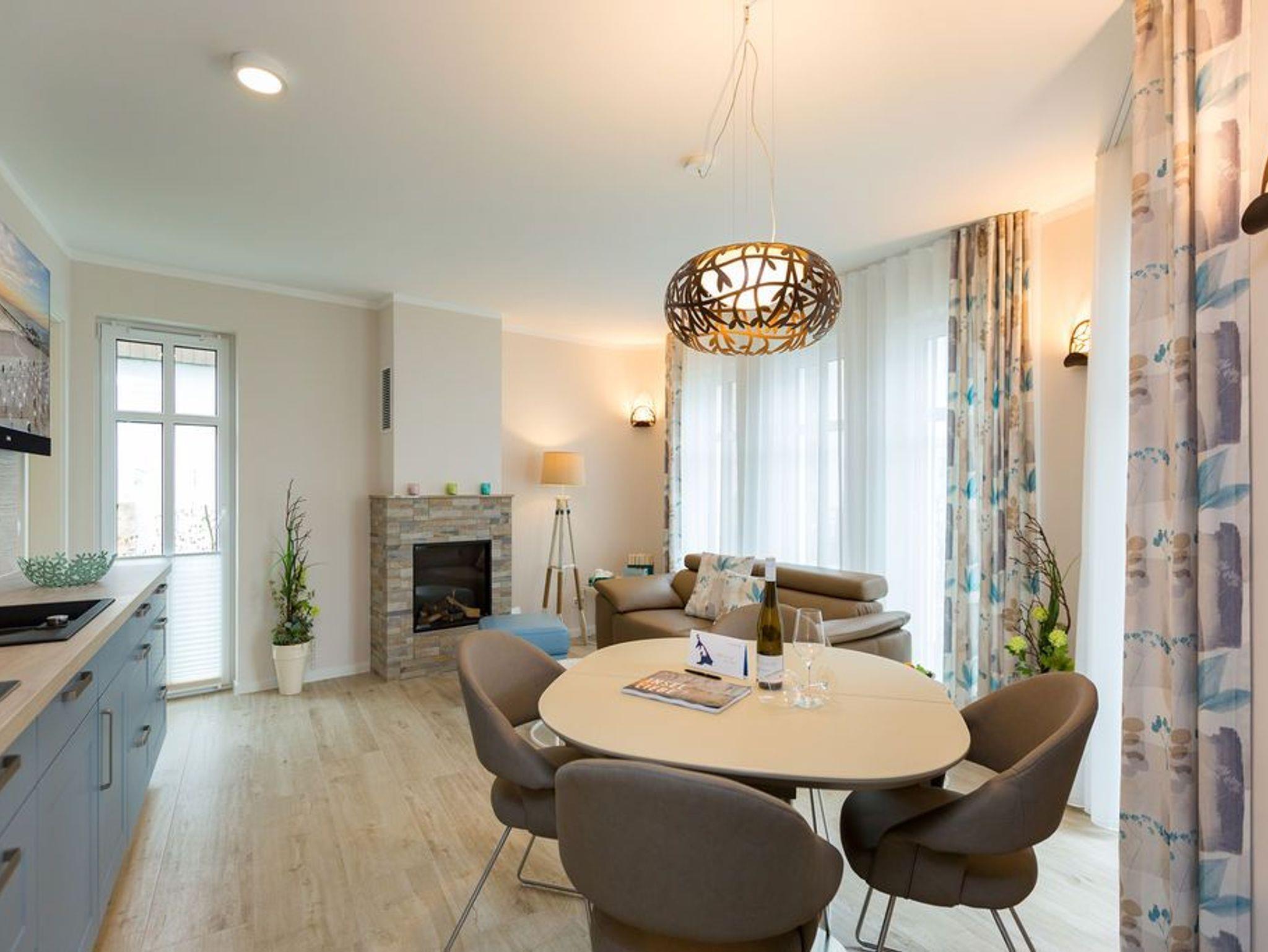 Stilvoll und elegant ist dieses 72 Quadratmeter große Drei-Raum-Appartement im Erdgeschoss eingerichtet. Bis zu vier Ostseeliebhabern und einem Kleinkind bis zwei Jahre (im Kinderreisebett) bietet es Platz für Entspannung und unvergessliche Urlaubsmomente. Die werden auf der großen West-Terrasse (23 Quadratmeter) schnell Realität. Hier ist der Stress des Alltags beim Sonnenbaden oder einem schönen Essen am Gartentisch schnell vergessen. Sollte das Wetter einmal weniger sonnig sein, wartet im Inneren viel Behaglichkeit. Ein Gas-Kamin sorgt im Wohnzimmer für eine kuschelige Atmosphäre. Die Einrichtung ist modern und zum Wohlfühlen bestens geeignet. Das großzügige und offene Wohn-Esszimmer ist der Mittelpunkt des Appartements. Ob gemütliches Chillen auf dem Ledersofa oder Schlemmen am stylischen Esstisch ? alles fühlt sich hier leicht und gut an. Ein großer Flat-TV gehört natürlich zur Ausstattung des Wohnzimmers dazu. Für alle, die Wert auf eine gute Küche legen, denen wird es in diesem Appartement an nichts mangeln. Denn die offene Küche ist mit allen notwendigen Geräten namhafter Hersteller ausgestattet ? vom Toaster bis zum Induktionsherd und dem Geschirrspüler. Schönes Geschirr, ist ebenfalls in den Schränken zu finden. Zwei ruhige und komfortable Schlafzimmer bringen nachts jede Menge Vergnügen. Je ein großes Boxspringdoppelbett (1,80 m x 2,00 m [&] 1,60 m x 2,00 m) sorgt für einen erholsamen Schlaf. Beide Schlafzimmer verfügen über einen Flat-TV und viel Ablagefläche für die Urlaubsgarderobe. Eines der Zimmer hat ein eigenes Bad mit Dusche, Waschtisch und WC. Ein zweites, großes Masterbad wartet zudem mit einer kleinen Finnischen Sauna auf. In einem Abstellraum steht eine Waschmaschine. Falls Sie auch im Urlaub schnell mal etwas reinigen wollen. Ansonsten heißt es in diesem Appartement: Ankommen und abschalten. Die Betten sind bezogen und Handtücher liegen bereit. In der Tiefgarage ist ein Parkplatz für Ihr Auto vorgesehen.