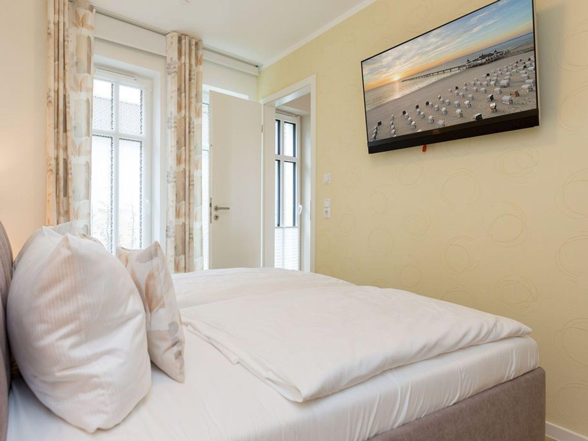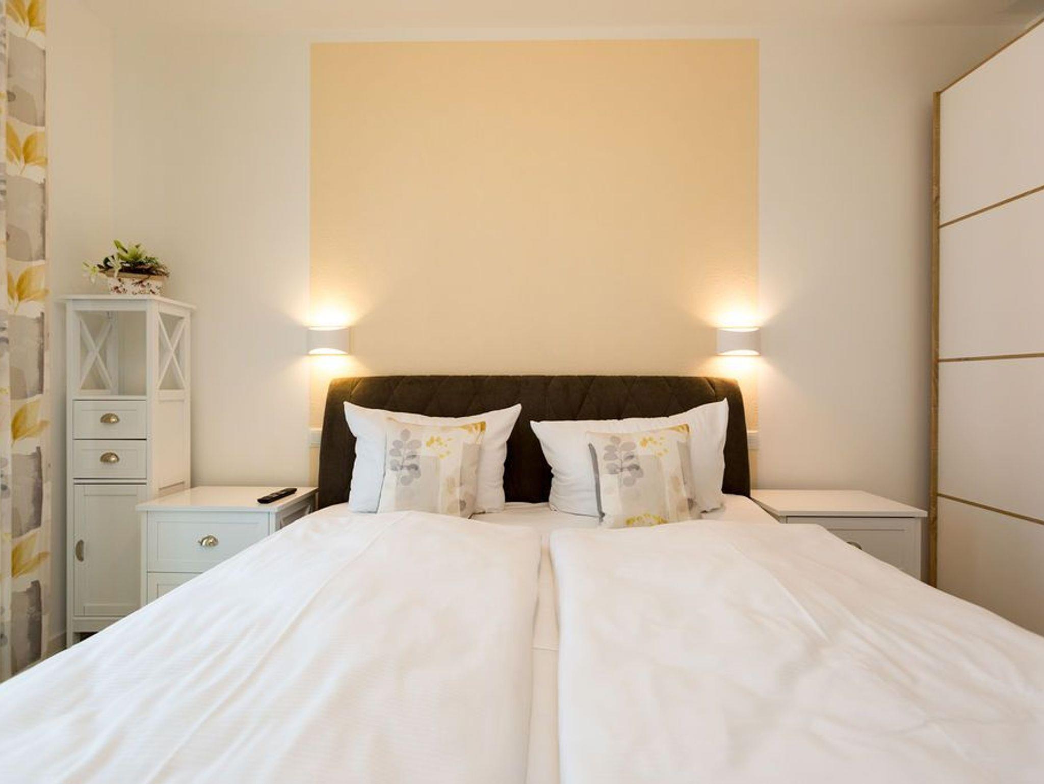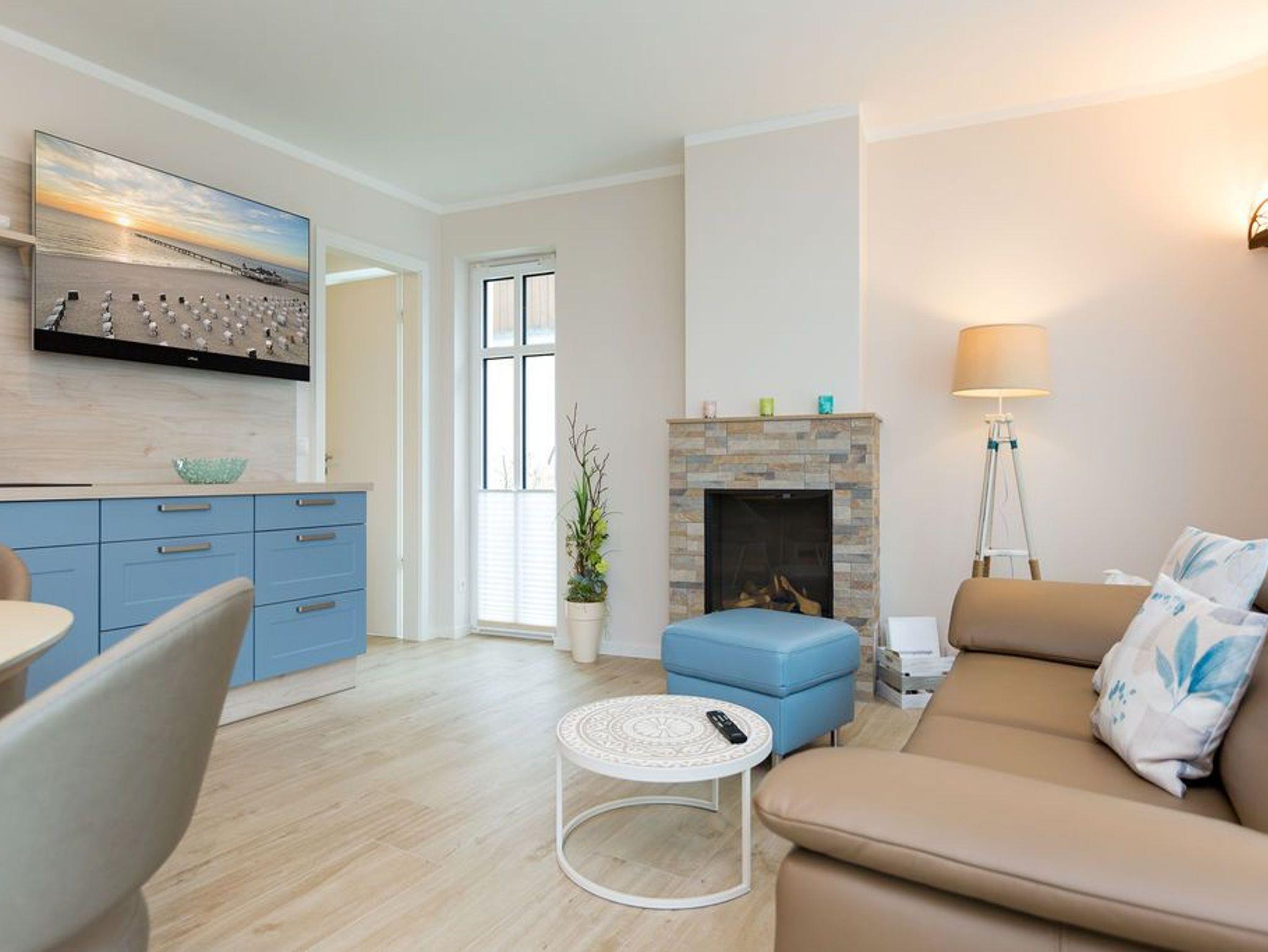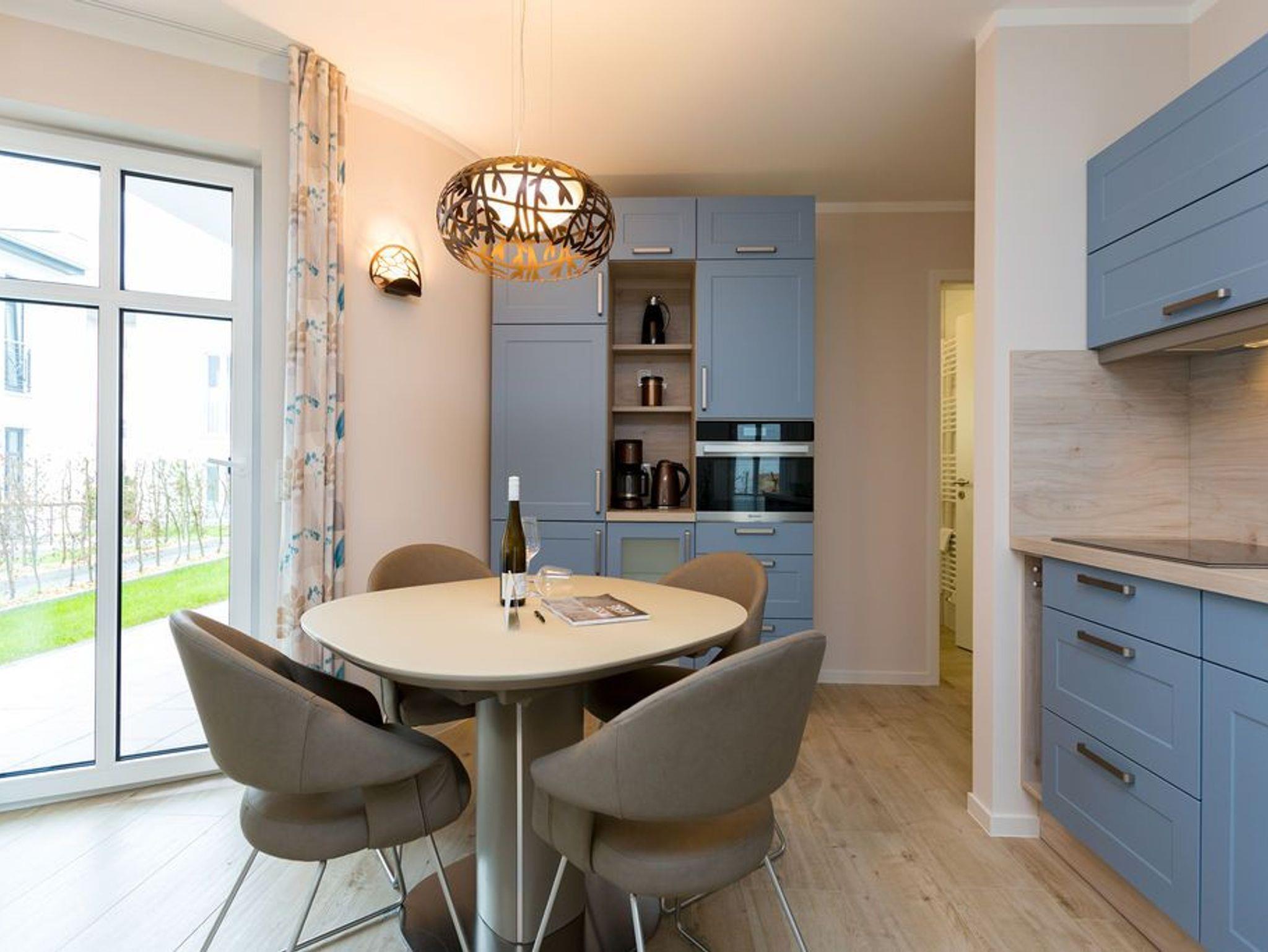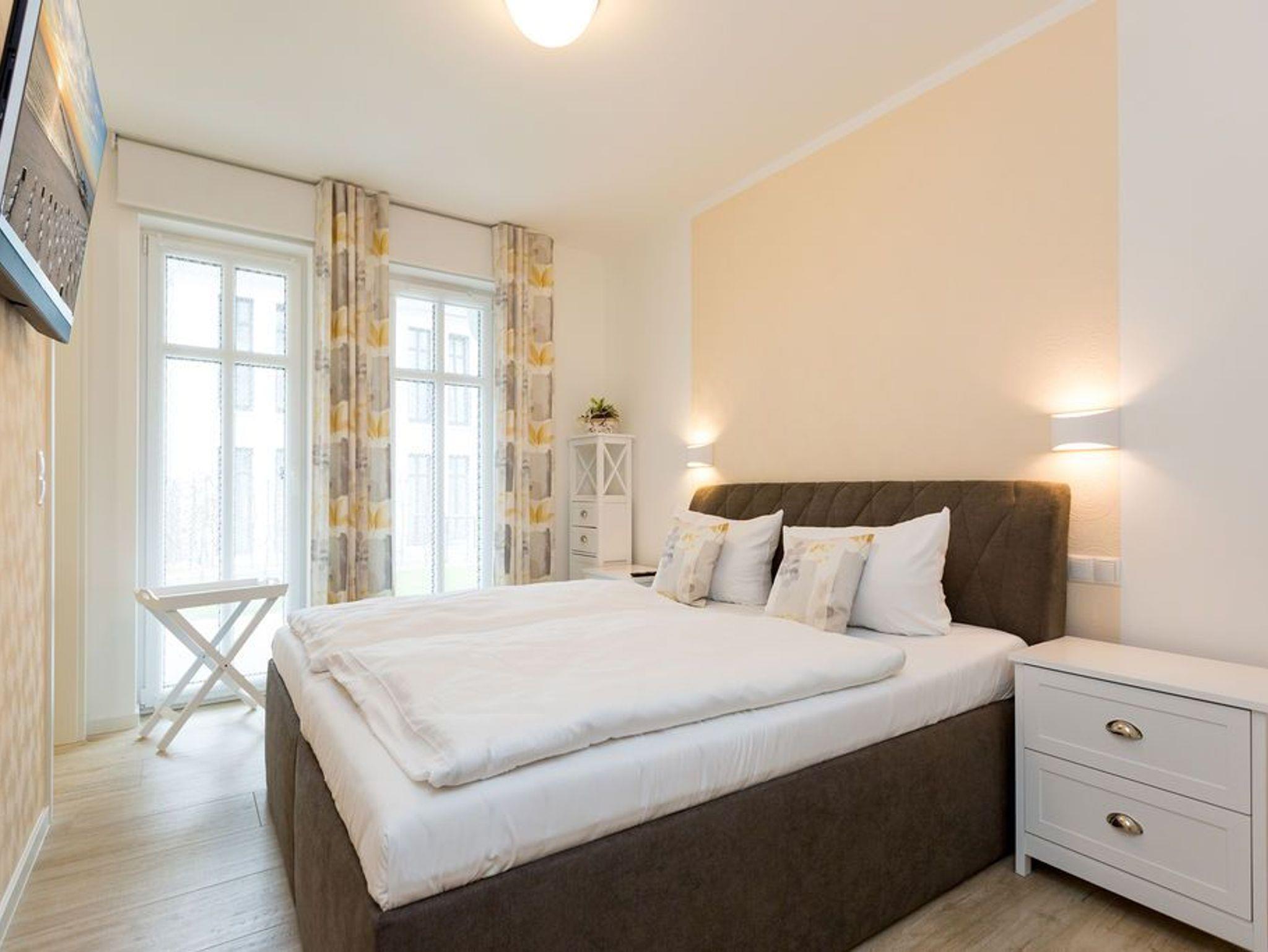 Stilvoll und elegant ist dieses 72 Quadratmeter große Drei-Raum-Appartement im Erdgeschoss eingerichtet. Bis zu vier Ostseeliebhabern und einem Kleinkind bis zwei Jahre (im Kinderreisebett) bietet es Platz für Entspannung und unvergessliche Urlaubsmomente. Die werden auf der großen West-Terrasse (23 Quadratmeter) schnell Realität. Hier ist der Stress des Alltags beim Sonnenbaden oder einem schönen Essen am Gartentisch schnell vergessen. Sollte das Wetter einmal weniger sonnig sein, wartet im Inneren viel Behaglichkeit. Ein Gas-Kamin sorgt im Wohnzimmer für eine kuschelige Atmosphäre. Die Einrichtung ist modern und zum Wohlfühlen bestens geeignet. Das großzügige und offene Wohn-Esszimmer ist der Mittelpunkt des Appartements. Ob gemütliches Chillen auf dem Ledersofa oder Schlemmen am stylischen Esstisch ? alles fühlt sich hier leicht und gut an. Ein großer Flat-TV gehört natürlich zur Ausstattung des Wohnzimmers dazu. Für alle, die Wert auf eine gute Küche legen, denen wird es in diesem Appartement an nichts mangeln. Denn die offene Küche ist mit allen notwendigen Geräten namhafter Hersteller ausgestattet ? vom Toaster bis zum Induktionsherd und dem Geschirrspüler. Schönes Geschirr, ist ebenfalls in den Schränken zu finden. Zwei ruhige und komfortable Schlafzimmer bringen nachts jede Menge Vergnügen. Je ein großes Boxspringdoppelbett (1,80 m x 2,00 m [&] 1,60 m x 2,00 m) sorgt für einen erholsamen Schlaf. Beide Schlafzimmer verfügen über einen Flat-TV und viel Ablagefläche für die Urlaubsgarderobe. Eines der Zimmer hat ein eigenes Bad mit Dusche, Waschtisch und WC. Ein zweites, großes Masterbad wartet zudem mit einer kleinen Finnischen Sauna auf. In einem Abstellraum steht eine Waschmaschine. Falls Sie auch im Urlaub schnell mal etwas reinigen wollen. Ansonsten heißt es in diesem Appartement: Ankommen und abschalten. Die Betten sind bezogen und Handtücher liegen bereit. In der Tiefgarage ist ein Parkplatz für Ihr Auto vorgesehen.