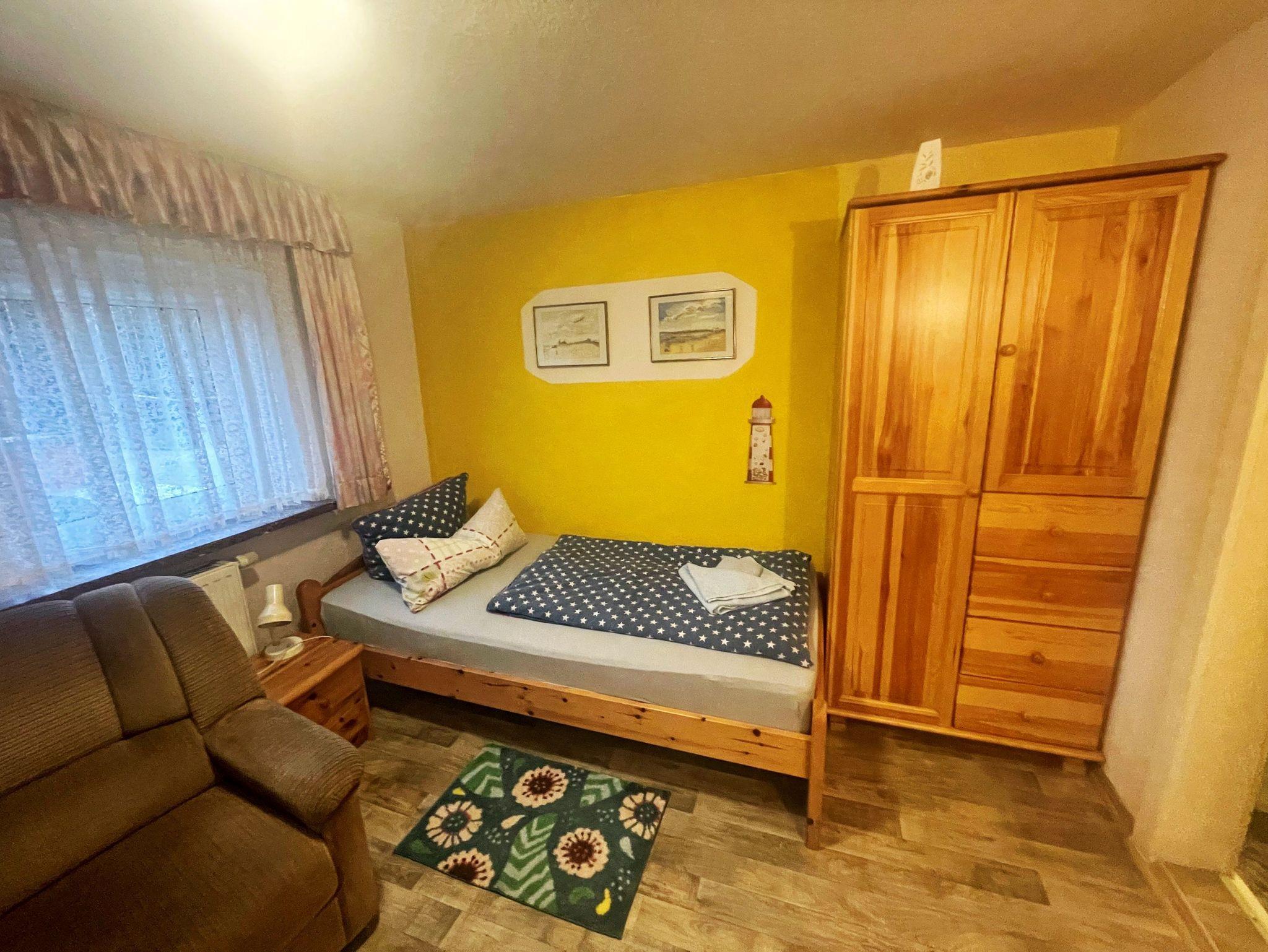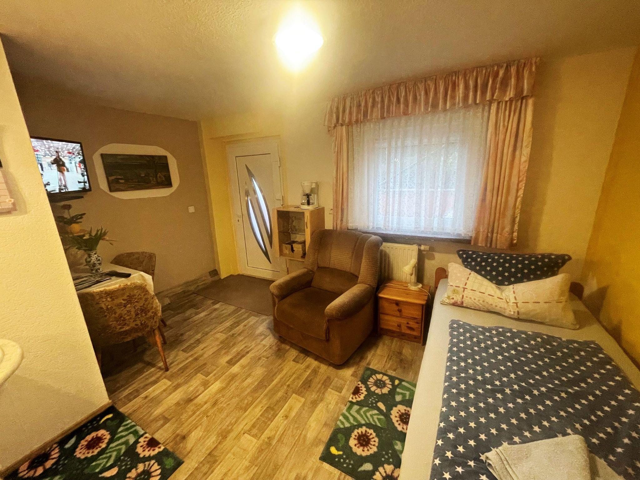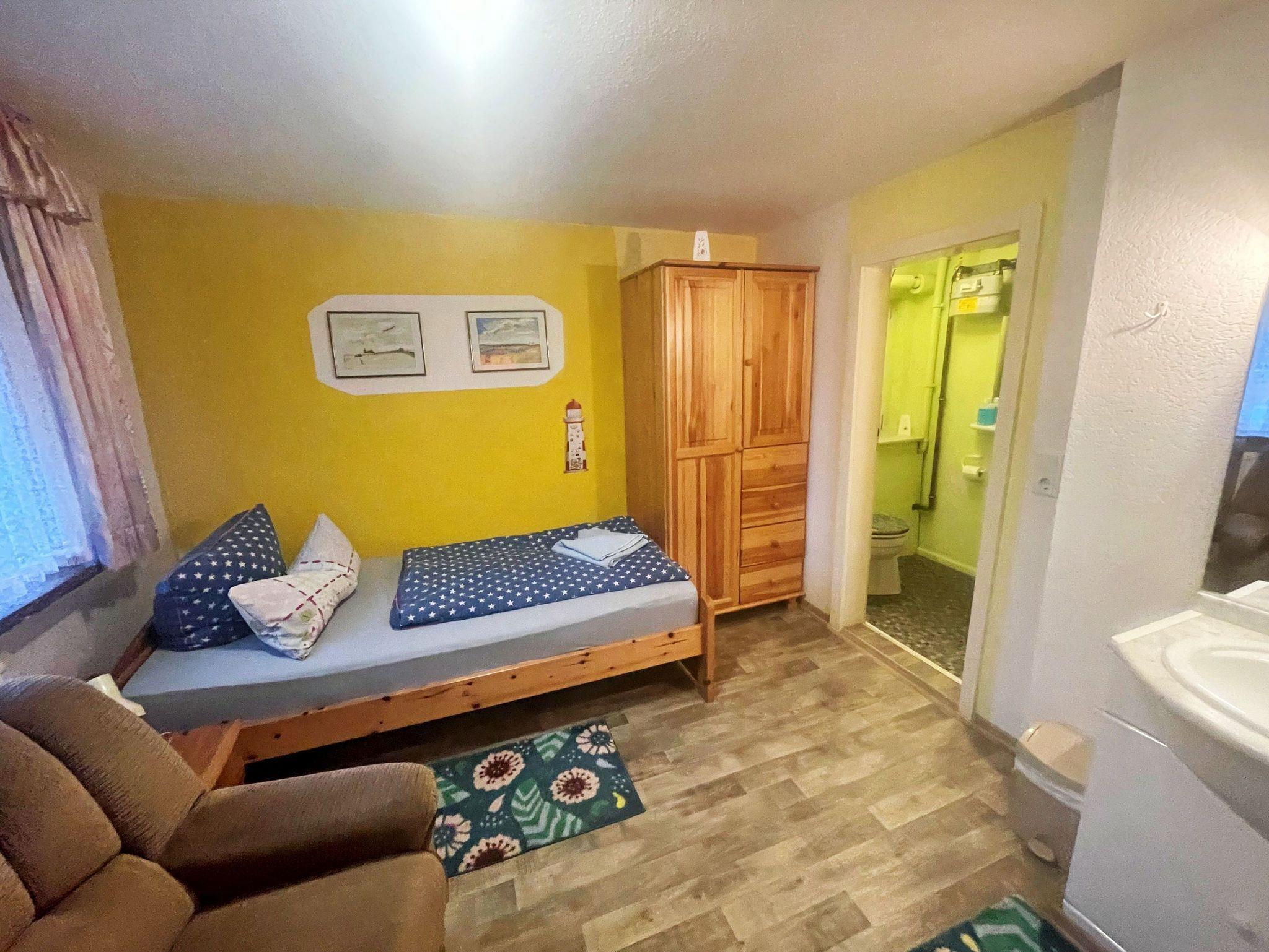 Das gemütlich eingerichtete Einzelzimmer befindet sich im Souterrain im Wohnhaus des Vermieters und verfügt über einen separaten Eingang. Das Zimmer ist mit einem Einzelbett, Sitzecke mit 2 Stühlen, Fernsehsessel und Flat-TV ausgestattet. Das Waschbecken befindet sich mit im Zimmer. Eine Kaffeemaschine befindet sich mit im Zimmer. Das Bad ist mit Dusche und WC. Eine kleine Gemeinschaftsküche befindet sich direkt neben dem Zimmer. Diese ist ausgestattet mit Kühlschrank u. Toaster sowie einer Pantryküche. Die Erstausstattung Bettwäsche und Handtücher, Endreinigung sowie der Parkplatz sind im Preis inklusive.