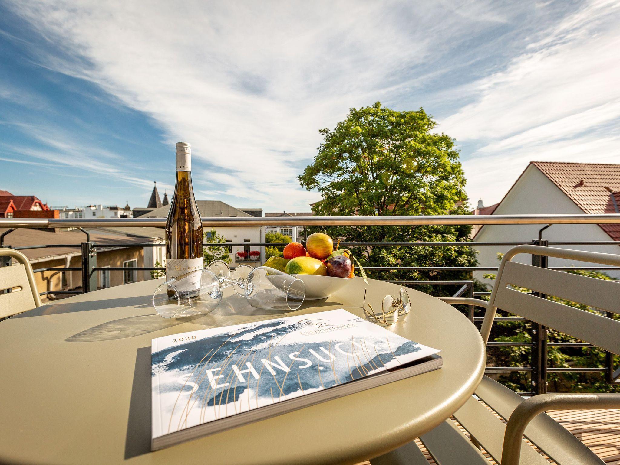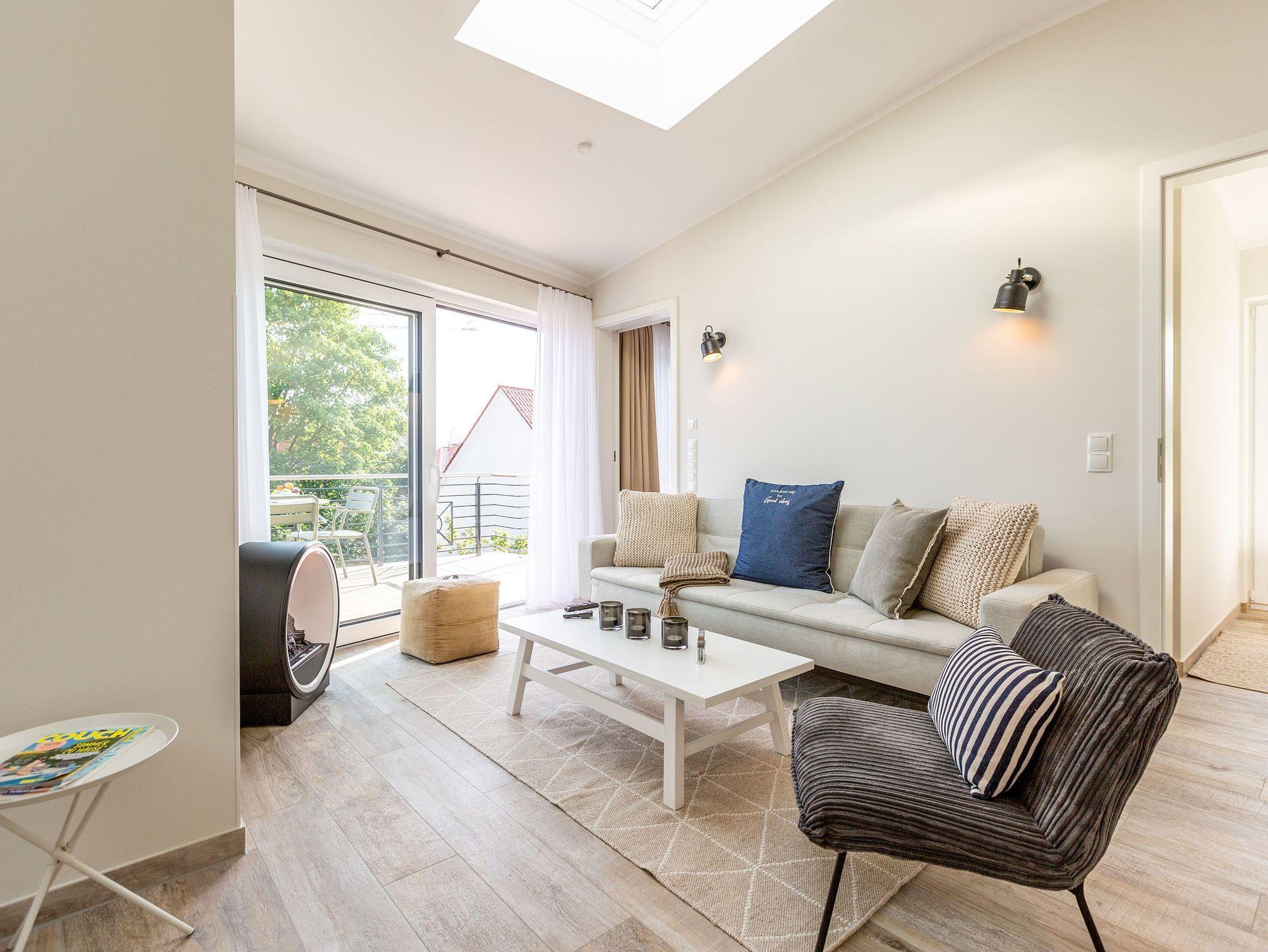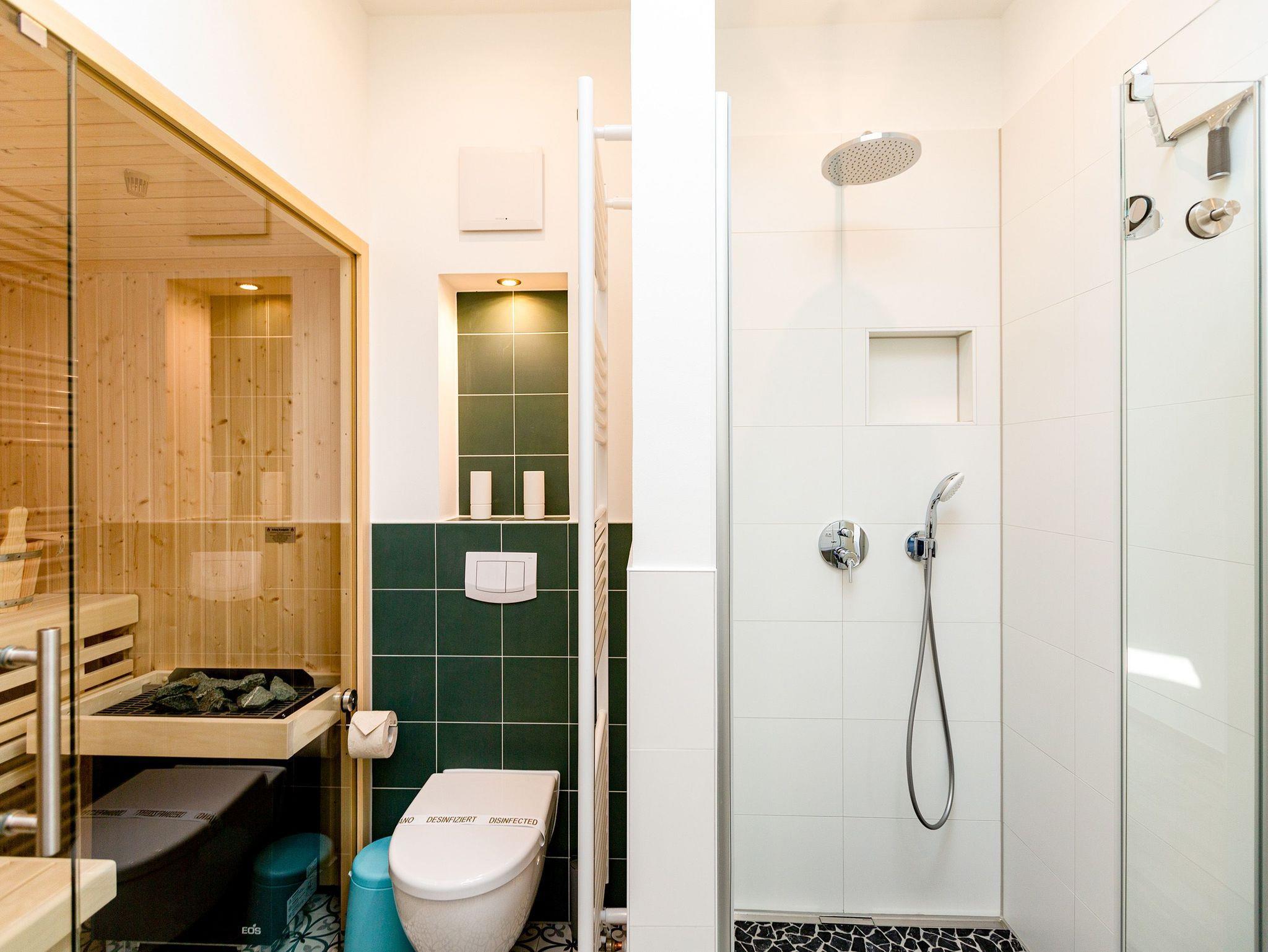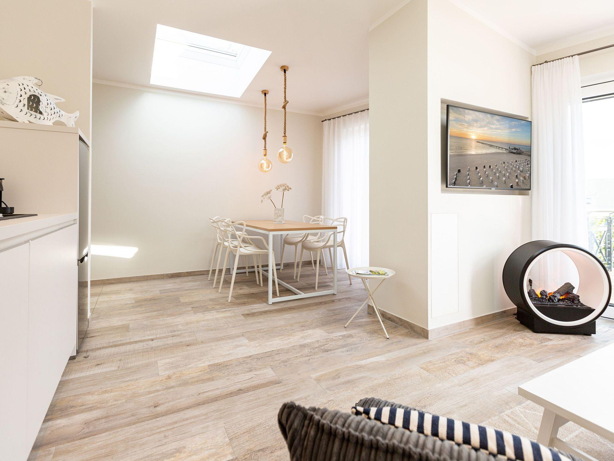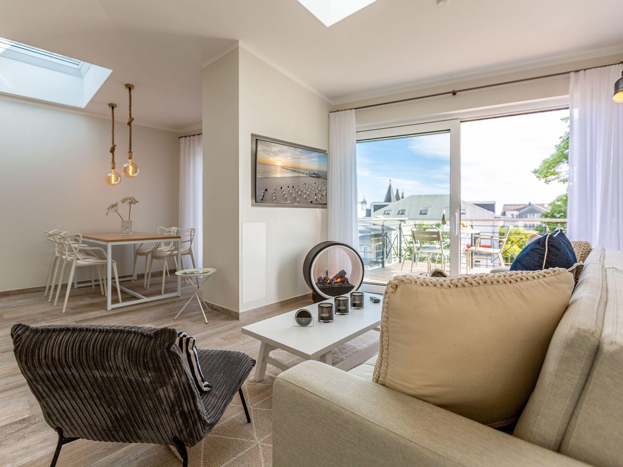 Ein wunderschönes Design-Appartement erwartet Sie im Dachgeschoss vom Quartier Sieben. Denn das 56 Quadratmeter große Feriendomizil ist besonders stilvoll und mit einem feinen Gespür für Möbel und Accessoires eingerichtet. Mit großer, umlaufender Außenterrasse (34 Quadratmeter) und einem geräumigen Innenbereich sorgt es für Wohlgefühl von der ersten Minute an. Bis zu drei Personen können hier in den drei Zimmern Urlaub machen. Ein elegant und stylisch eingerichtetes Wohnzimmer bietet viel Platz zum Entspannen und zur Unterhaltung. Ein Elektro-Kamin schenkt abends oder an ungemütlichen Tagen ein bisschen Romantik. Ein großer Flat-TV bietet Spaß und spannende Filme. Einfach aufs Sofa oder in den urigen Kord-Sessel fallen lassen und abschalten. In das Wohnzimmer integriert ist eine moderne und voll ausgestattete Küche und ein Essplatz mit gemütlichen Moises-Stühlen. Moderne Markengeräte wie ein Induktionsherd erleichtern das Kochen und Zubereiten der Speisen oder den Abwasch. Edles Ess- und Kochgeschirr finden Sie in den Küchenschränken. Das Master-Schlafzimmer verfügt über ein bequemes Doppelbett (1,80 m x 2,00 m). Ein großer Schrank und ein Flat-TV gehören ebenfalls zur Ausstattung. Im zweiten Schlafzimmer befindet sich ein Einzelbett (0,90 m x 2,00 m). Das Badezimmer wird durch ein Tageslichtfenster im Dach beleuchtet. Es verfügt über eine Dusche, einen Waschtisch, ein WC und einen Waschtrockner. Entspannen Sie in Ihrem ganz privaten kleinen Spa bei kuscheligen Temperaturen. Denn das Highlight des Badezimmers ist eine kleine finnische Sauna. Handtücher liegen übrigens für Sie bereit. Auch die Betten sind bei Anreise schon bezogen. In der Tiefgarage gibt es einen Pkw-Stellplatz für Sie. Das WLAN-Netz ist kostenfrei nutzbar. Ein abschließbarer, wohnungseigener Fahrradkeller steht Ihnen ebenfalls zur Verfügung. Hier haben Sie die Möglichkeit, Ihr E-Bike aufzuladen.