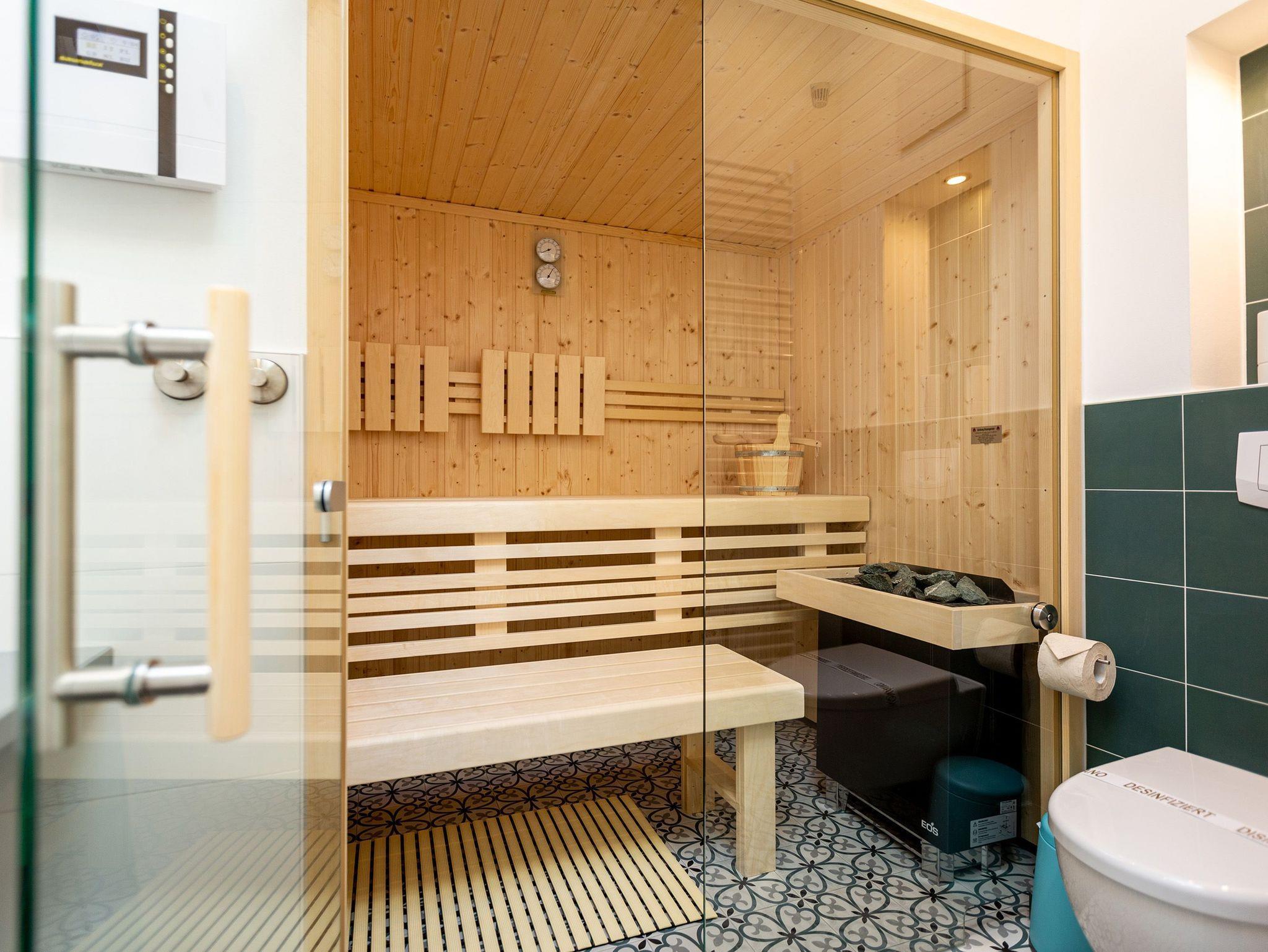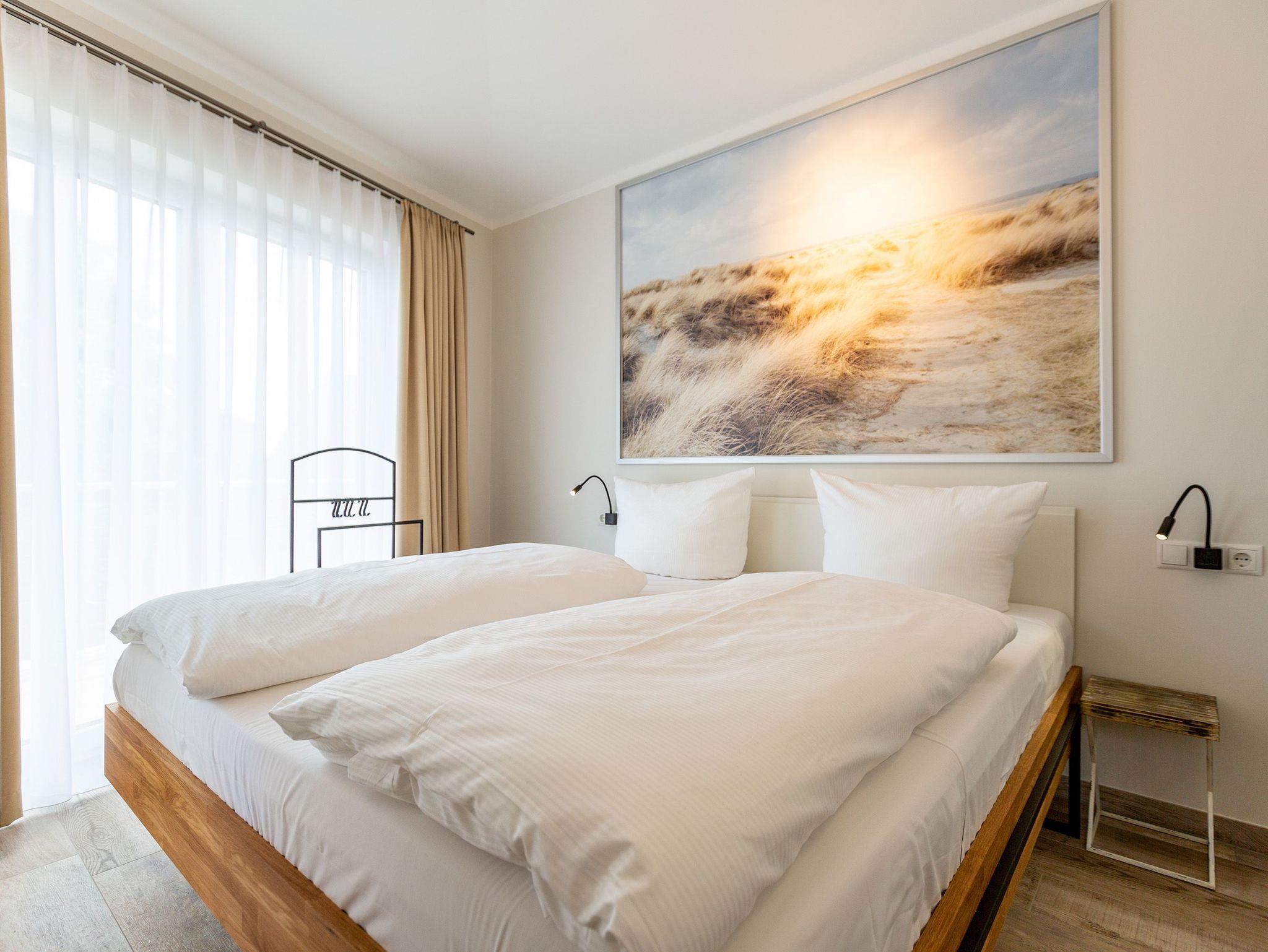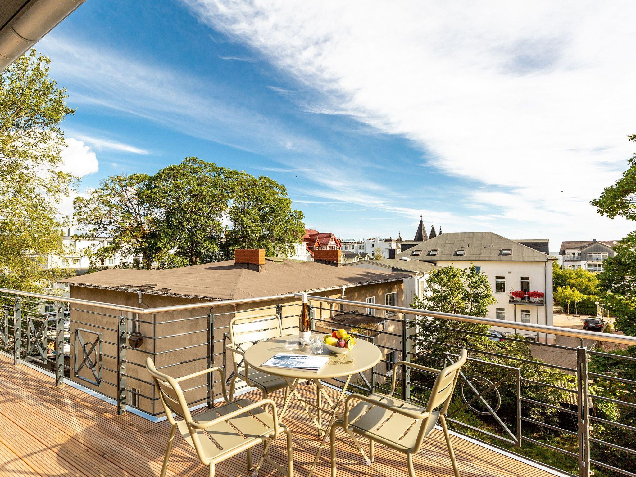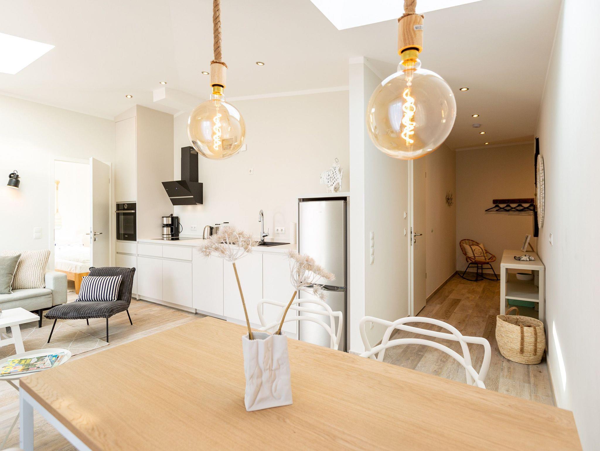 Ein wunderschönes Design-Appartement erwartet Sie im Dachgeschoss vom Quartier Sieben. Denn das 56 Quadratmeter große Feriendomizil ist besonders stilvoll und mit einem feinen Gespür für Möbel und Accessoires eingerichtet. Mit großer, umlaufender Außenterrasse (34 Quadratmeter) und einem geräumigen Innenbereich sorgt es für Wohlgefühl von der ersten Minute an. Bis zu drei Personen können hier in den drei Zimmern Urlaub machen. Ein elegant und stylisch eingerichtetes Wohnzimmer bietet viel Platz zum Entspannen und zur Unterhaltung. Ein Elektro-Kamin schenkt abends oder an ungemütlichen Tagen ein bisschen Romantik. Ein großer Flat-TV bietet Spaß und spannende Filme. Einfach aufs Sofa oder in den urigen Kord-Sessel fallen lassen und abschalten. In das Wohnzimmer integriert ist eine moderne und voll ausgestattete Küche und ein Essplatz mit gemütlichen Moises-Stühlen. Moderne Markengeräte wie ein Induktionsherd erleichtern das Kochen und Zubereiten der Speisen oder den Abwasch. Edles Ess- und Kochgeschirr finden Sie in den Küchenschränken. Das Master-Schlafzimmer verfügt über ein bequemes Doppelbett (1,80 m x 2,00 m). Ein großer Schrank und ein Flat-TV gehören ebenfalls zur Ausstattung. Im zweiten Schlafzimmer befindet sich ein Einzelbett (0,90 m x 2,00 m). Das Badezimmer wird durch ein Tageslichtfenster im Dach beleuchtet. Es verfügt über eine Dusche, einen Waschtisch, ein WC und einen Waschtrockner. Entspannen Sie in Ihrem ganz privaten kleinen Spa bei kuscheligen Temperaturen. Denn das Highlight des Badezimmers ist eine kleine finnische Sauna. Handtücher liegen übrigens für Sie bereit. Auch die Betten sind bei Anreise schon bezogen. In der Tiefgarage gibt es einen Pkw-Stellplatz für Sie. Das WLAN-Netz ist kostenfrei nutzbar. Ein abschließbarer, wohnungseigener Fahrradkeller steht Ihnen ebenfalls zur Verfügung. Hier haben Sie die Möglichkeit, Ihr E-Bike aufzuladen.