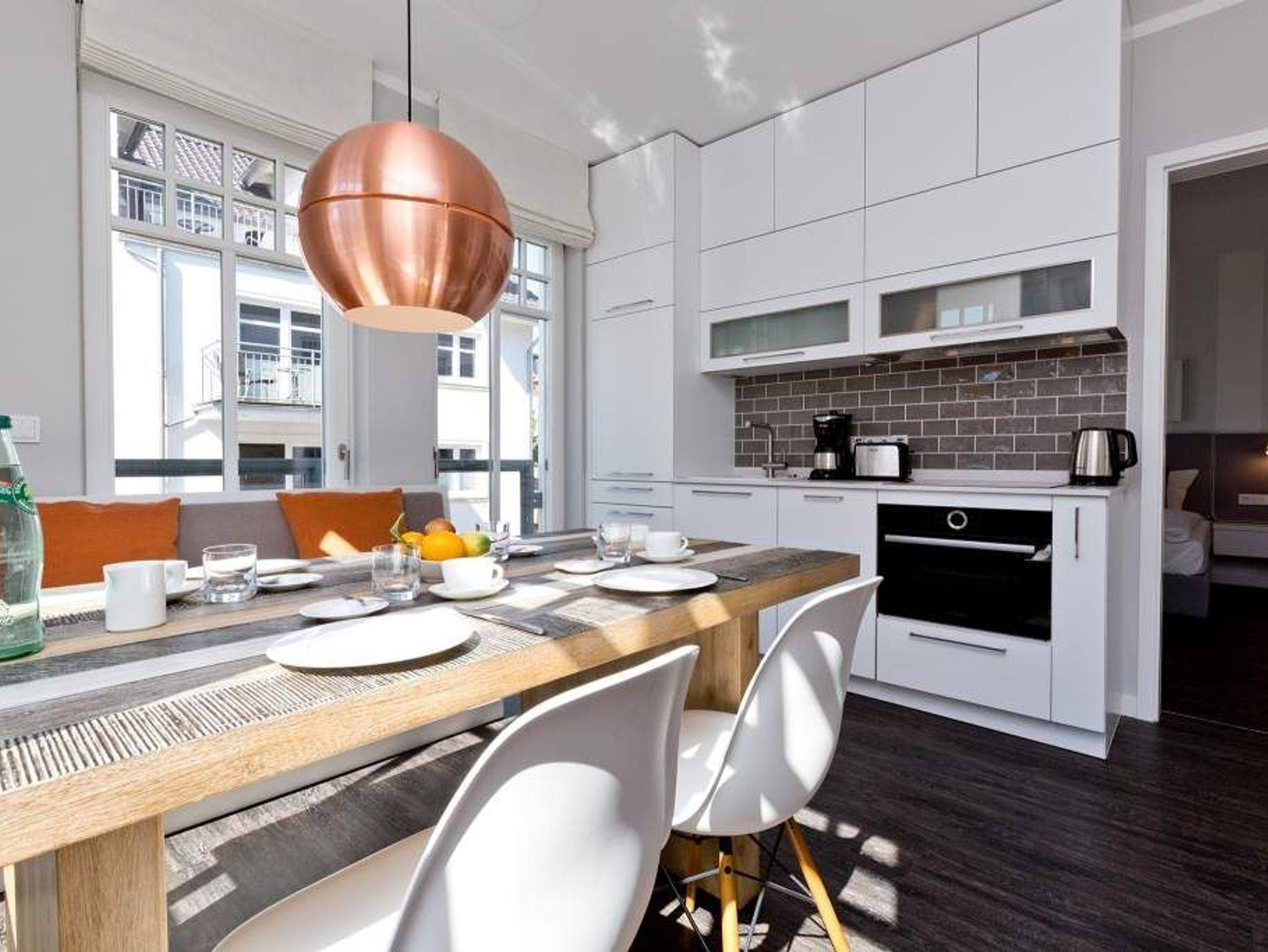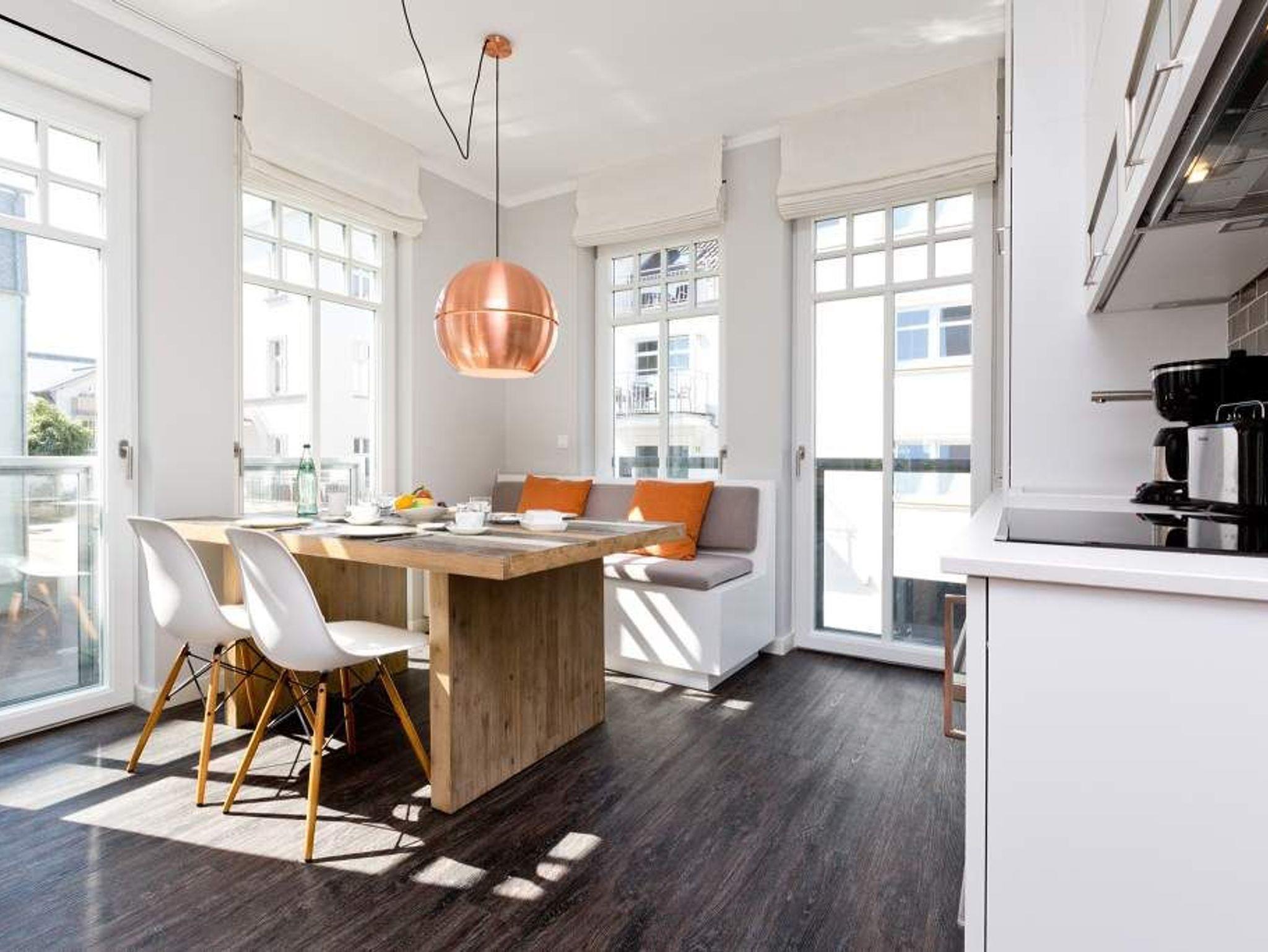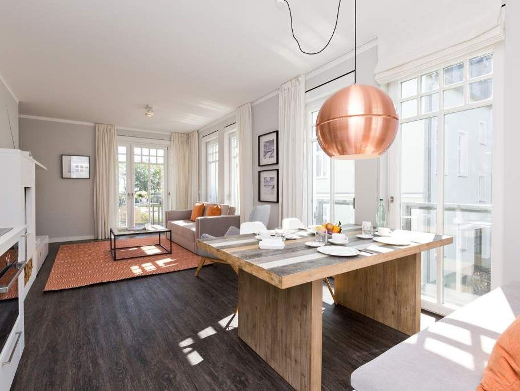 Absolut stylisch ist diese wunderschön eingerichtete Ferienwohnung für 4 Personen im ersten Obergeschoss der Villa Westend. Das 3-Raum-Appartement bietet auf 85 Quadratmetern Urlaubsfeeling der Extraklasse. Der hochwertige Vinylboden in Holzoptik ist besonders geräuscharm und allergikerfreundlich. Schlichte Eleganz durchzieht die Wohnung vom Couchtisch über den gemütlichen Sessel und die Retro-Schalenstühlen des Essbereiches bis hin zu den Lampen. Viel Holz, Licht, das durch große, bodentiefe Fenster hereinfällt und klare Formen ? sie sind das Markenzeichen skandinavischer Möbeldesigner. Der Elektro-Kamin ist ein echtes Highlight. Harmonisch fügt sich die offene Küche, ganz in Weiß gehalten, in die Gesamteinrichtung ein. Die Wohnung hat zwei Balkone, von denen einer seitlich den Blick auf die Ostsee freigibt. Jedes der beiden Schlafzimmer ist anders gestaltet ? jedes auf seine Art mit grafischen Design-Mustertapeten, harmonischen Farben und hochwertigen Boxspringdoppelbetten geschmackvoll und komfortabel eingerichtet. Im Masterbad ist eine finnische Sauna eingebaut. Die Duschen in den Bädern sind so geräumig, dass Sie sie gut zu Zweit genießen können. Für Ihren uneingeschränkten Komfort sind die Betten bezogen und Handtücher liegen bereit. Es steht Ihnen der Stellplatz 37 in der Tiefgarage zur Verfügung.