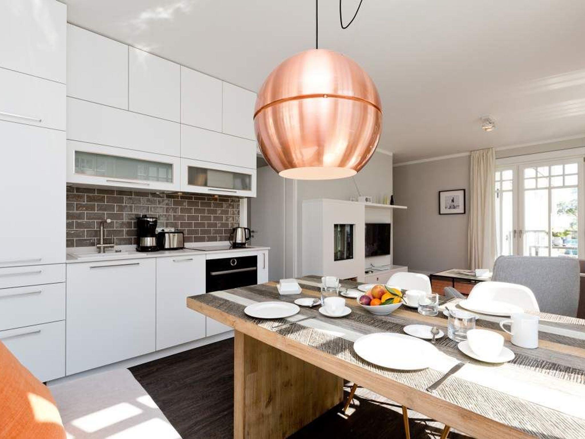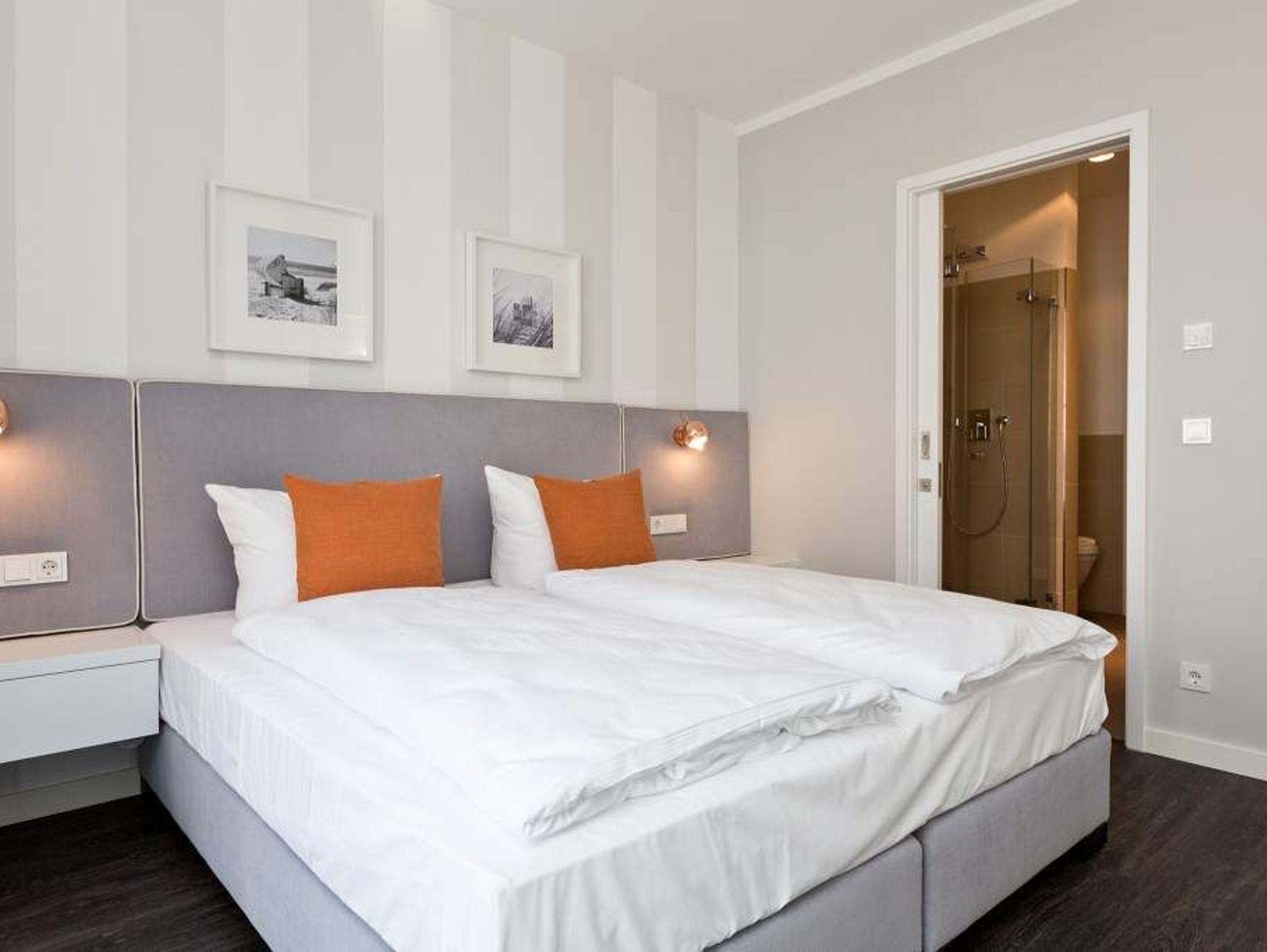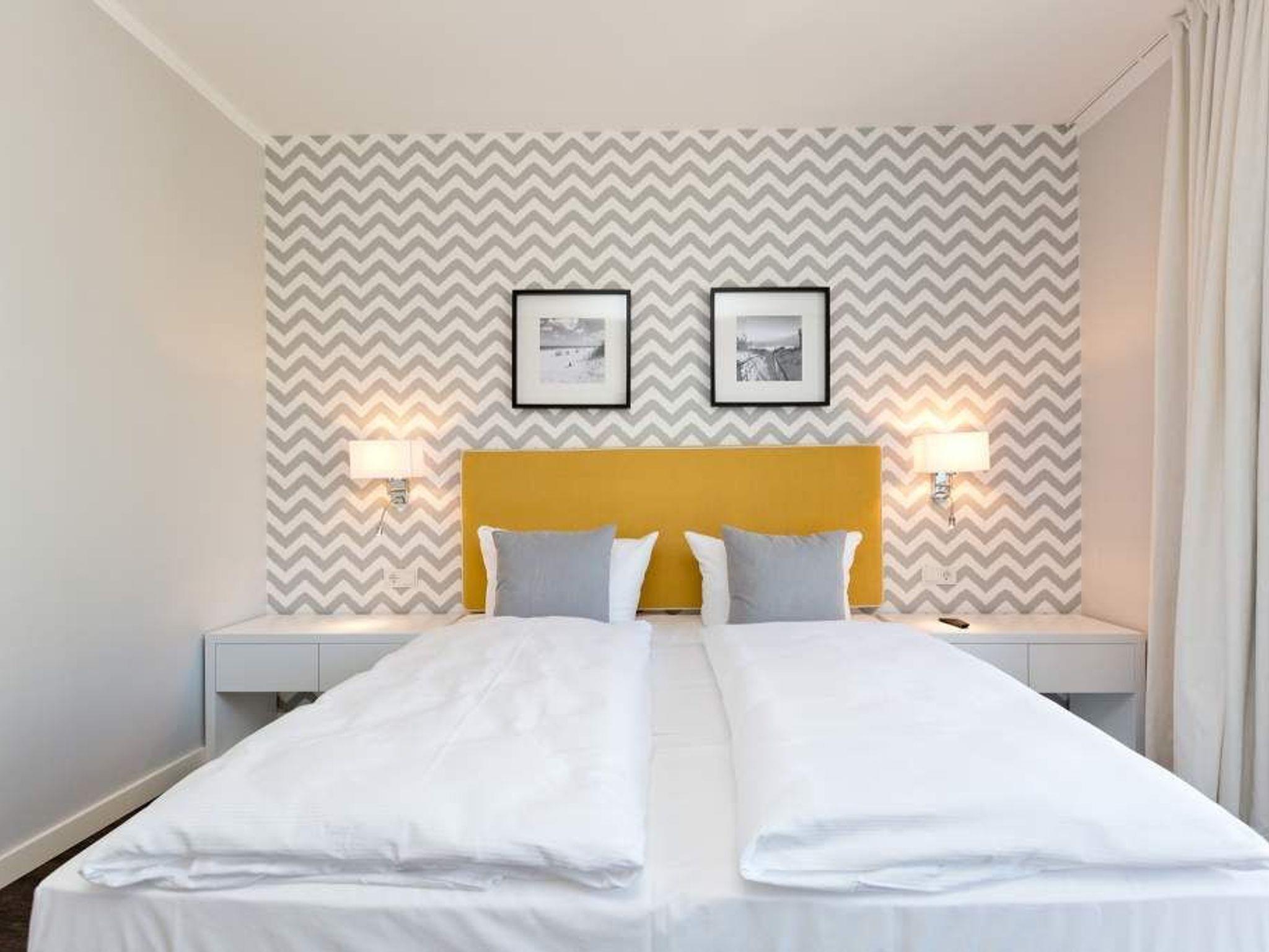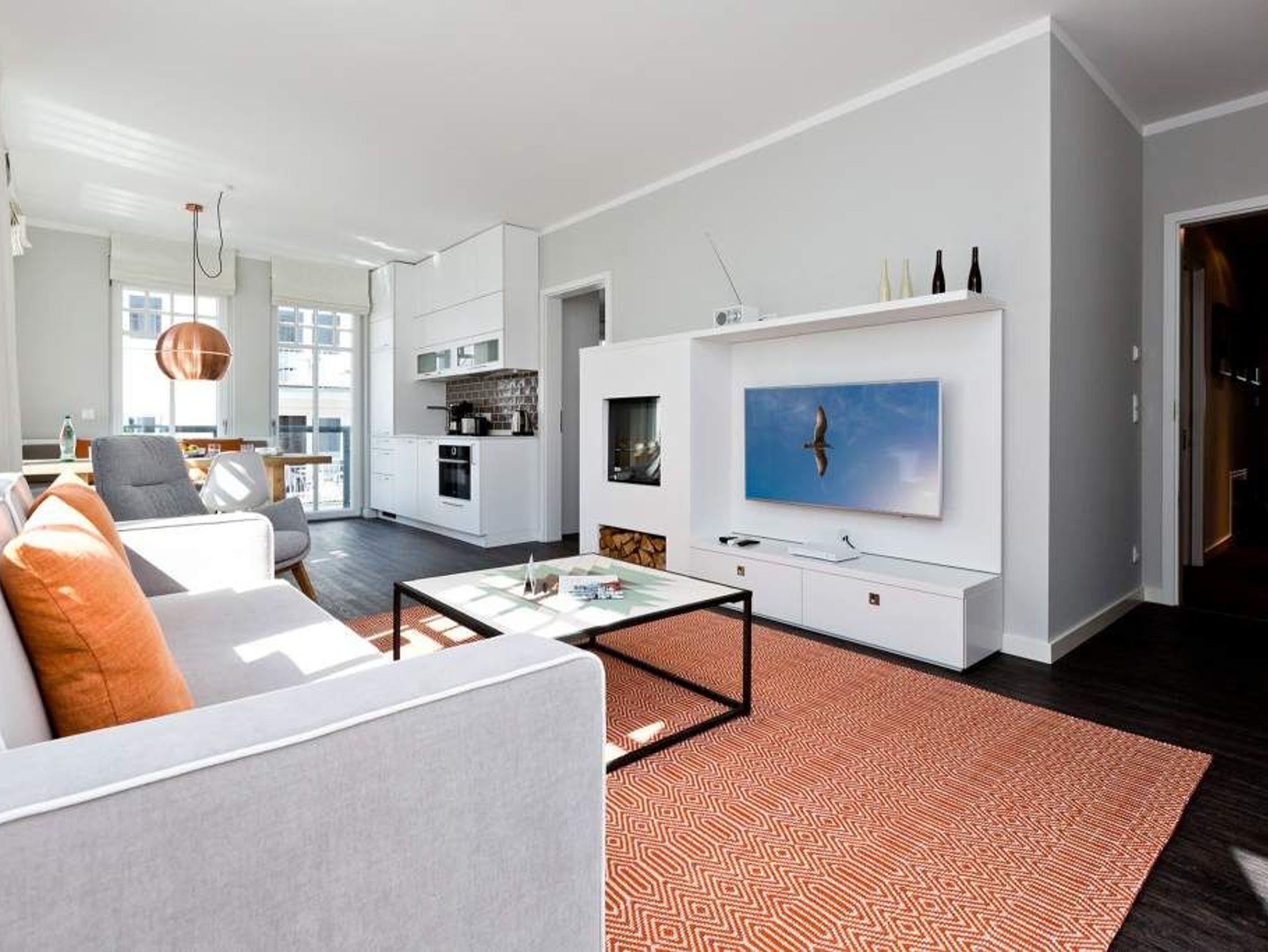 Absolut stylisch ist diese wunderschön eingerichtete Ferienwohnung für 4 Personen im ersten Obergeschoss der Villa Westend. Das 3-Raum-Appartement bietet auf 85 Quadratmetern Urlaubsfeeling der Extraklasse. Der hochwertige Vinylboden in Holzoptik ist besonders geräuscharm und allergikerfreundlich. Schlichte Eleganz durchzieht die Wohnung vom Couchtisch über den gemütlichen Sessel und die Retro-Schalenstühlen des Essbereiches bis hin zu den Lampen. Viel Holz, Licht, das durch große, bodentiefe Fenster hereinfällt und klare Formen ? sie sind das Markenzeichen skandinavischer Möbeldesigner. Der Elektro-Kamin ist ein echtes Highlight. Harmonisch fügt sich die offene Küche, ganz in Weiß gehalten, in die Gesamteinrichtung ein. Die Wohnung hat zwei Balkone, von denen einer seitlich den Blick auf die Ostsee freigibt. Jedes der beiden Schlafzimmer ist anders gestaltet ? jedes auf seine Art mit grafischen Design-Mustertapeten, harmonischen Farben und hochwertigen Boxspringdoppelbetten geschmackvoll und komfortabel eingerichtet. Im Masterbad ist eine finnische Sauna eingebaut. Die Duschen in den Bädern sind so geräumig, dass Sie sie gut zu Zweit genießen können. Für Ihren uneingeschränkten Komfort sind die Betten bezogen und Handtücher liegen bereit. Es steht Ihnen der Stellplatz 37 in der Tiefgarage zur Verfügung.