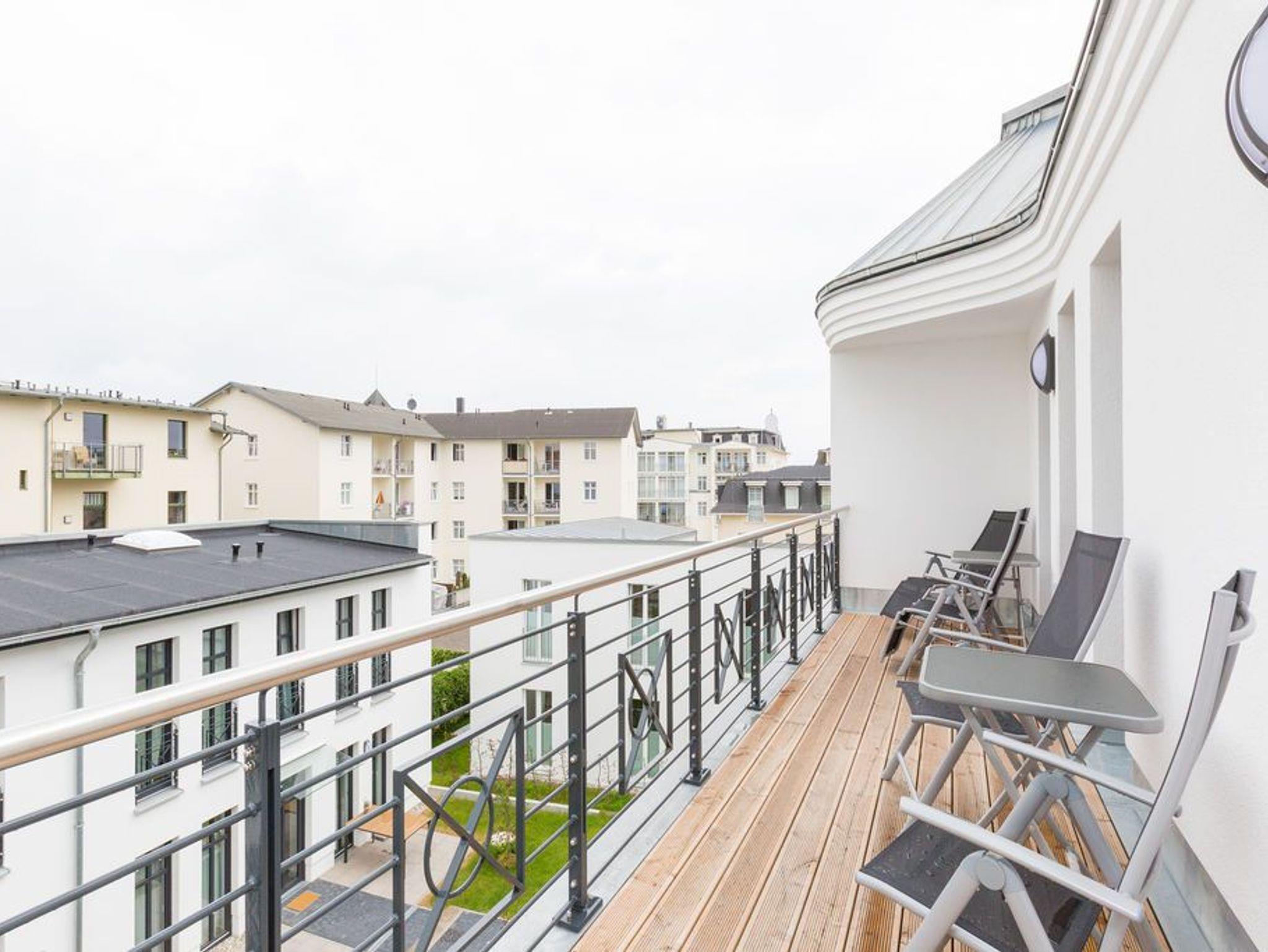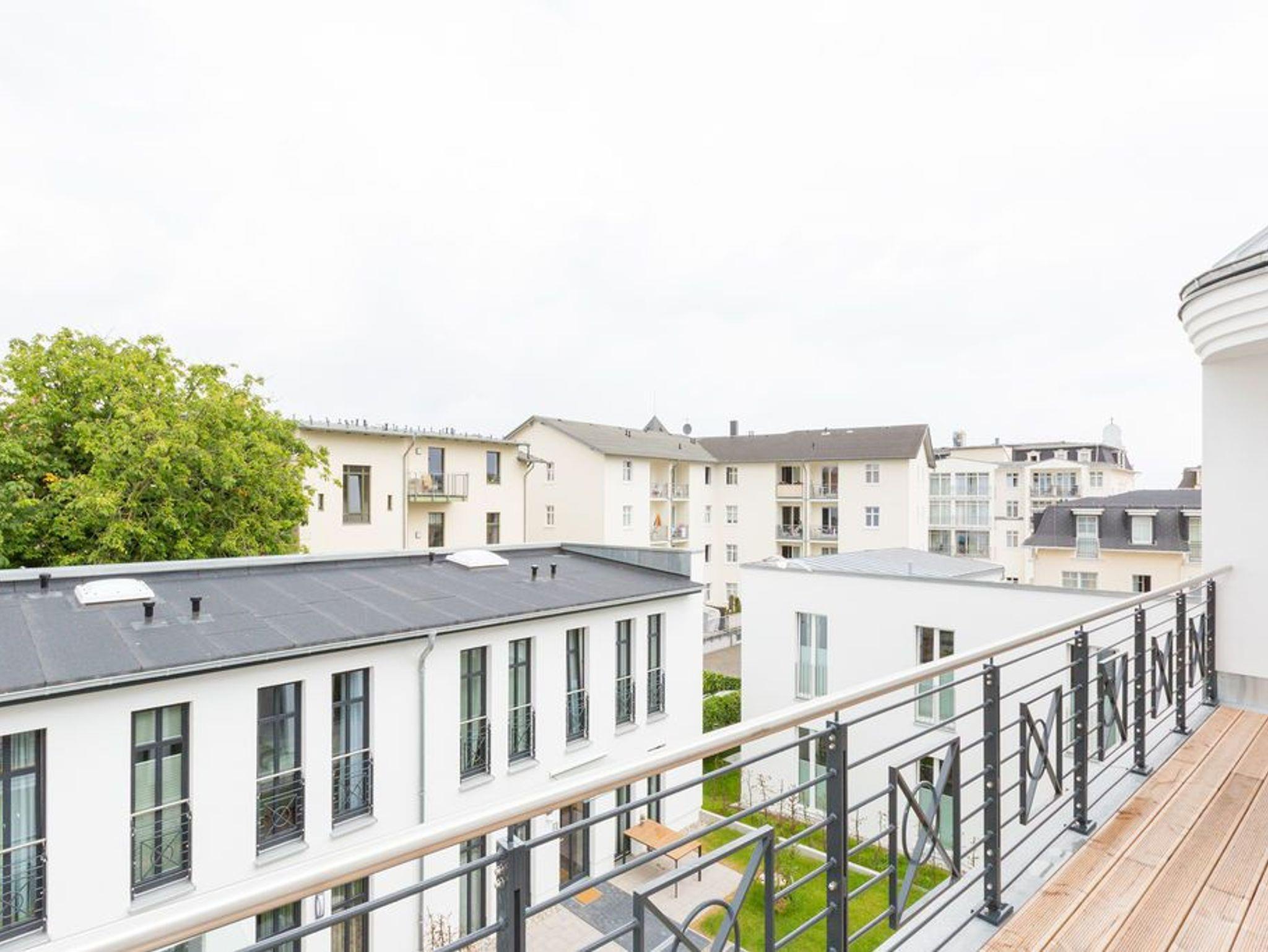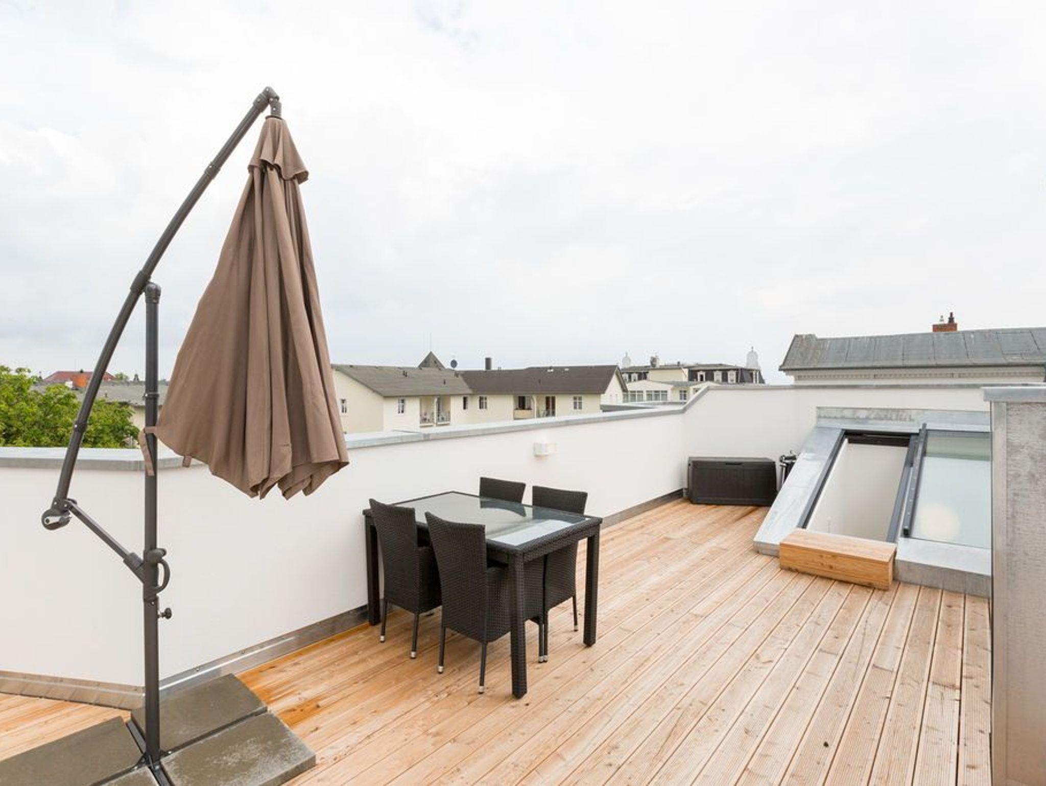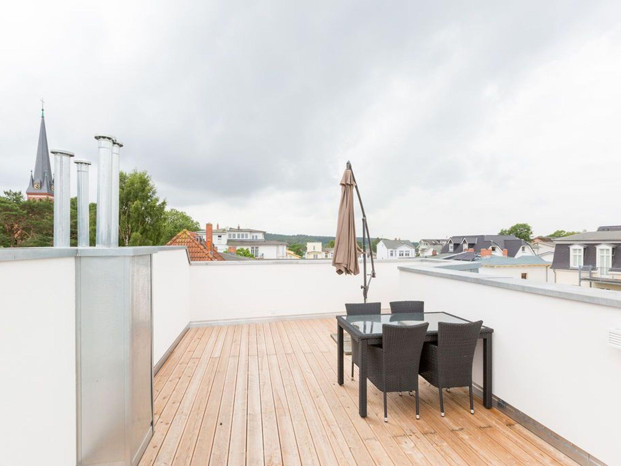 Über den Dächern des Seebades Ahlbeck in der Sonne liegen und den Ostseeurlaub genießen, das ist auf der 35 Quadratmeter großen Dachterrasse dieses wunderschönen Drei-Zimmer-Appartements im 2. Obergeschoss jederzeit möglich. Das Urlaubsgefühl stellt auf den 75 Quadratmetern ganz schnell ein. Bis zu vier Personen können in den drei Zimmern zusammen entspannen. Die Sonnenterrasse ist hier nur eines von vielen Wohn-Highlights, die Ihre Zeit auf der Insel Usedom zu einer unvergesslich schönen Auszeit machen werden. Im geräumigen und modern eingerichteten Wohnzimmer erwartet Sie durch die erlesenen Wohn-Accessoires viel Behaglichkeit. Eine große Sofalandschaft lädt zum Fallenlassen ein. Sie haben die Wahl: Entweder romantisches Flammenspiel im Gas-Kamin oder ein spannender Film auf dem großen Flat-TV. Der WLAN-Anschluss ist kostenfrei. Altes Holz neu konzipiert: Die Tische sind in dieser Wohnung etwas ganz Besonderes. Der Echtholz-Esstisch lädt zudem zu ausgiebigen Mahlzeiten ein. Ein schönes Plätzchen zum Plaudern und Essen. Zubereiten können Sie die Mahlzeiten gleich direkt in der offenen Wohnküche. Sie ist mit hochwertigen Markengeräten vollausgestattet. Auch Geschirr ist dort zu finden. In die Küchenzeile ist eine Waschmaschine integriert. Das Appartement verfügt über zwei Schlafzimmer. In beiden Zimmern schenkt Ihnen ein bequemes Boxspringdoppelbett (2 mal 1,80 m x 2,00 m) einen erholsamen Schlaf. Ein großer Kleiderschrank und ein Flat-TV gehören ebenfalls zur Ausstattung eines jeden Zimmers. Ein Schlafzimmer hat Zugang sowohl zu einem zweiten, kleinen Süd-Balkon als auch zum Masterbad mit Dusche, Waschtisch, WC und einer Finnischen Sauna. Hier können Sie an kühlen Tagen wunderbar Abschalten und Entspannen. Für ein unbeschwertes Urlaubsvergnügen liegen die Handtücher für Sie schon bereit und die Betten sind bezogen. Die schöne und möblierte Dachterrasse erreichen Sie über eine Wendeltreppe. In der Tiefgarage ist für Ihre Wohnung der Stellplatz 8 vorgesehen. Genießen Sie das schöne Ambiente dieses Feriendomizils, aus dem Sie garantiert nur ungern wieder abreisen.