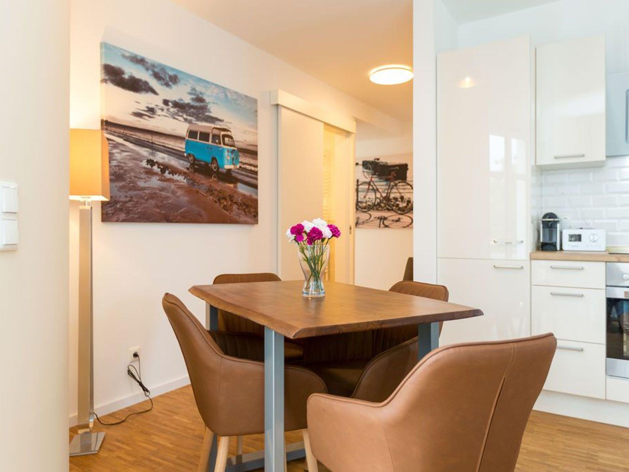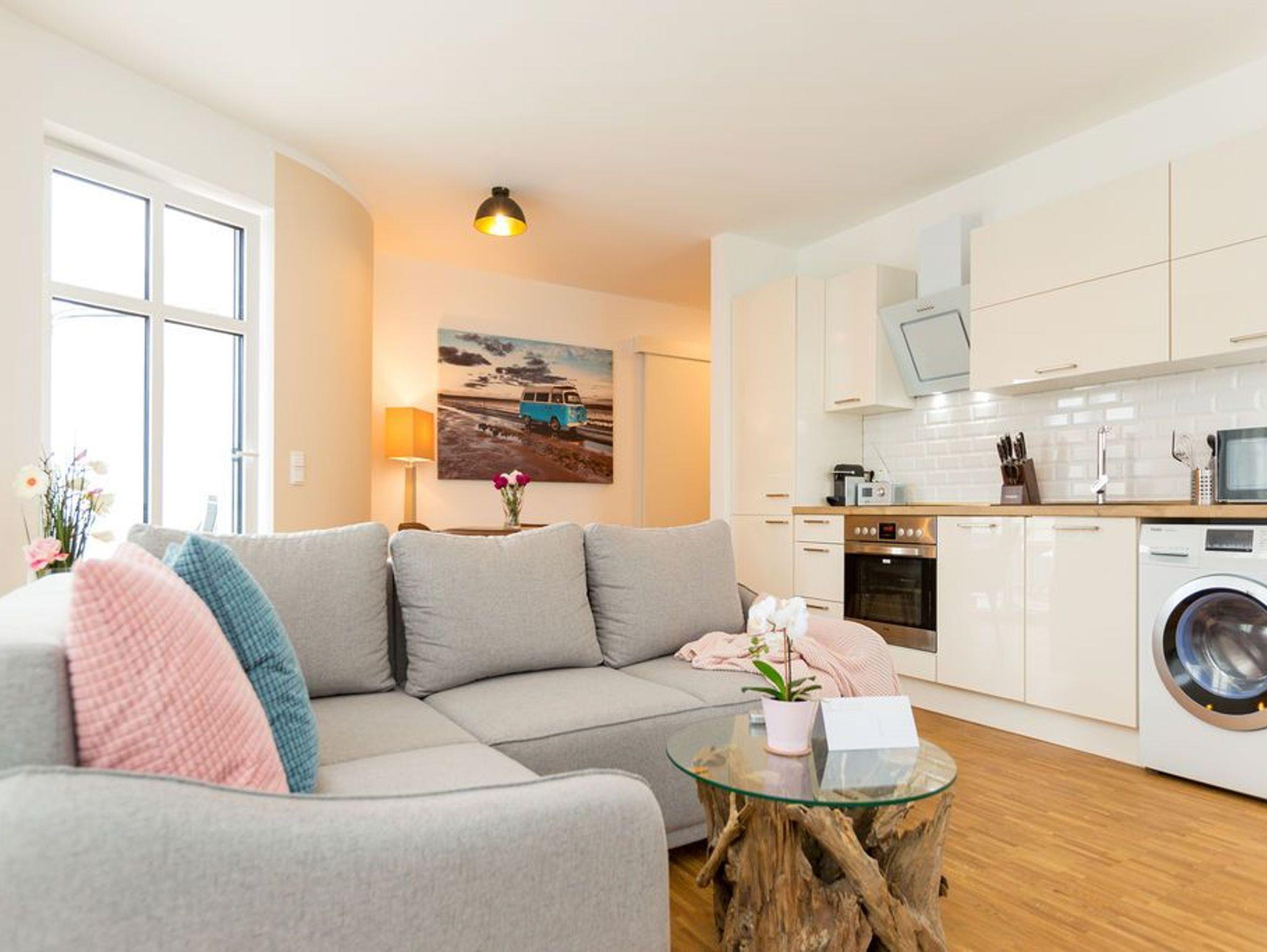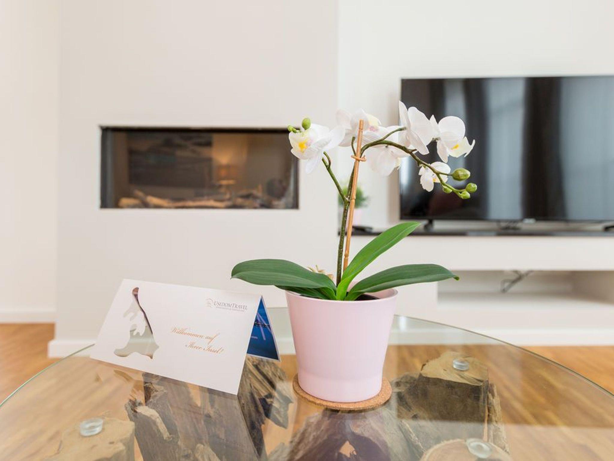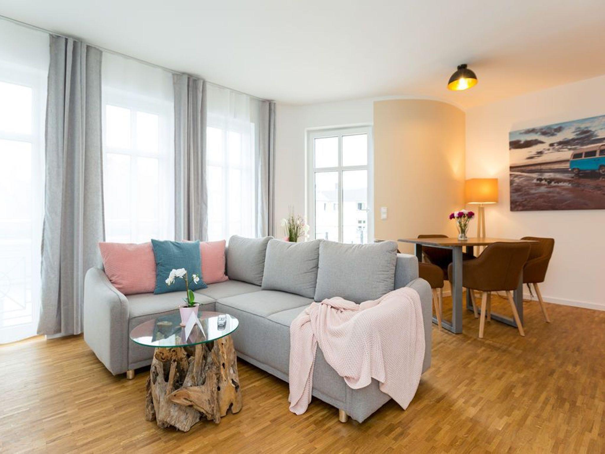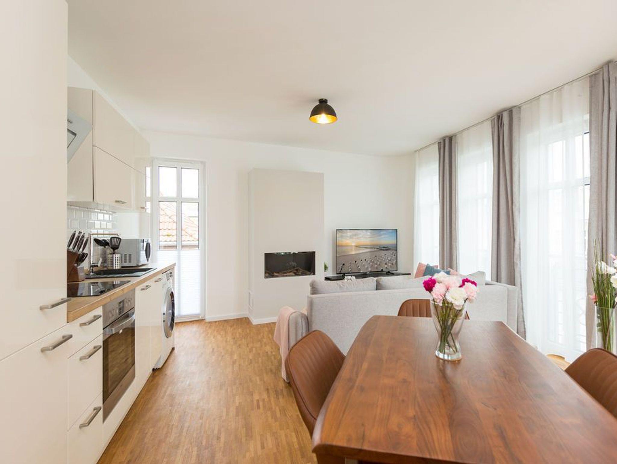Über den Dächern des Seebades Ahlbeck in der Sonne liegen und den Ostseeurlaub genießen, das ist auf der 35 Quadratmeter großen Dachterrasse dieses wunderschönen Drei-Zimmer-Appartements im 2. Obergeschoss jederzeit möglich. Das Urlaubsgefühl stellt auf den 75 Quadratmetern ganz schnell ein. Bis zu vier Personen können in den drei Zimmern zusammen entspannen. Die Sonnenterrasse ist hier nur eines von vielen Wohn-Highlights, die Ihre Zeit auf der Insel Usedom zu einer unvergesslich schönen Auszeit machen werden. Im geräumigen und modern eingerichteten Wohnzimmer erwartet Sie durch die erlesenen Wohn-Accessoires viel Behaglichkeit. Eine große Sofalandschaft lädt zum Fallenlassen ein. Sie haben die Wahl: Entweder romantisches Flammenspiel im Gas-Kamin oder ein spannender Film auf dem großen Flat-TV. Der WLAN-Anschluss ist kostenfrei. Altes Holz neu konzipiert: Die Tische sind in dieser Wohnung etwas ganz Besonderes. Der Echtholz-Esstisch lädt zudem zu ausgiebigen Mahlzeiten ein. Ein schönes Plätzchen zum Plaudern und Essen. Zubereiten können Sie die Mahlzeiten gleich direkt in der offenen Wohnküche. Sie ist mit hochwertigen Markengeräten vollausgestattet. Auch Geschirr ist dort zu finden. In die Küchenzeile ist eine Waschmaschine integriert. Das Appartement verfügt über zwei Schlafzimmer. In beiden Zimmern schenkt Ihnen ein bequemes Boxspringdoppelbett (2 mal 1,80 m x 2,00 m) einen erholsamen Schlaf. Ein großer Kleiderschrank und ein Flat-TV gehören ebenfalls zur Ausstattung eines jeden Zimmers. Ein Schlafzimmer hat Zugang sowohl zu einem zweiten, kleinen Süd-Balkon als auch zum Masterbad mit Dusche, Waschtisch, WC und einer Finnischen Sauna. Hier können Sie an kühlen Tagen wunderbar Abschalten und Entspannen. Für ein unbeschwertes Urlaubsvergnügen liegen die Handtücher für Sie schon bereit und die Betten sind bezogen. Die schöne und möblierte Dachterrasse erreichen Sie über eine Wendeltreppe. In der Tiefgarage ist für Ihre Wohnung der Stellplatz 8 vorgesehen. Genießen Sie das schöne Ambiente dieses Feriendomizils, aus dem Sie garantiert nur ungern wieder abreisen.